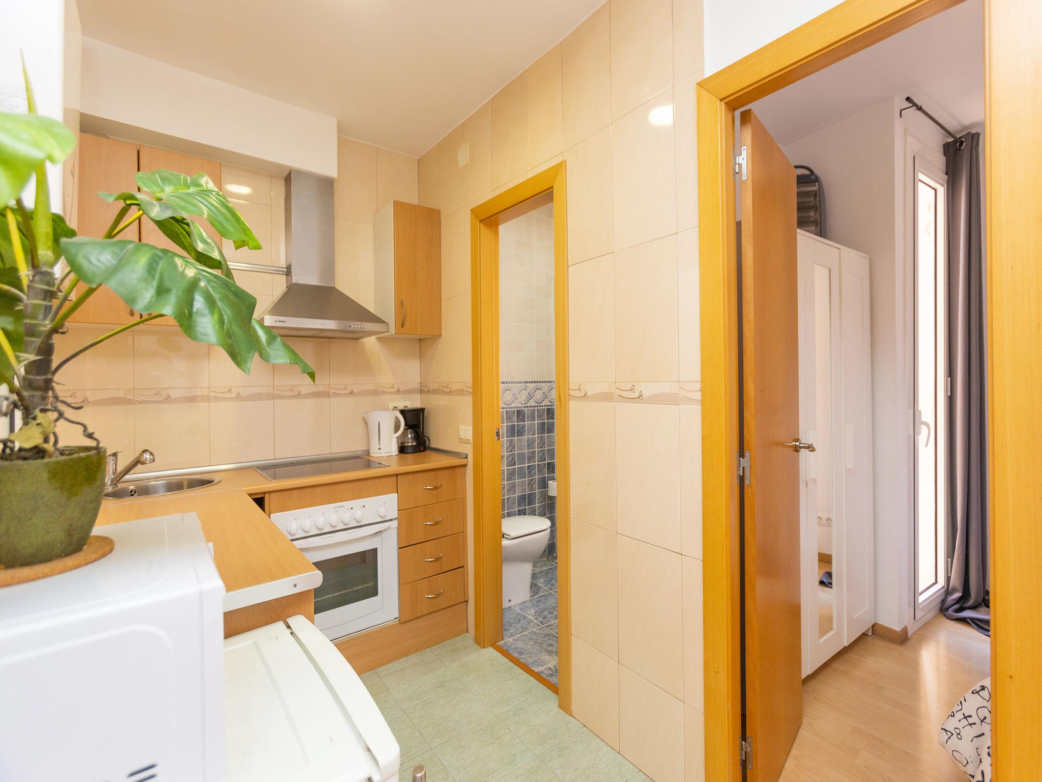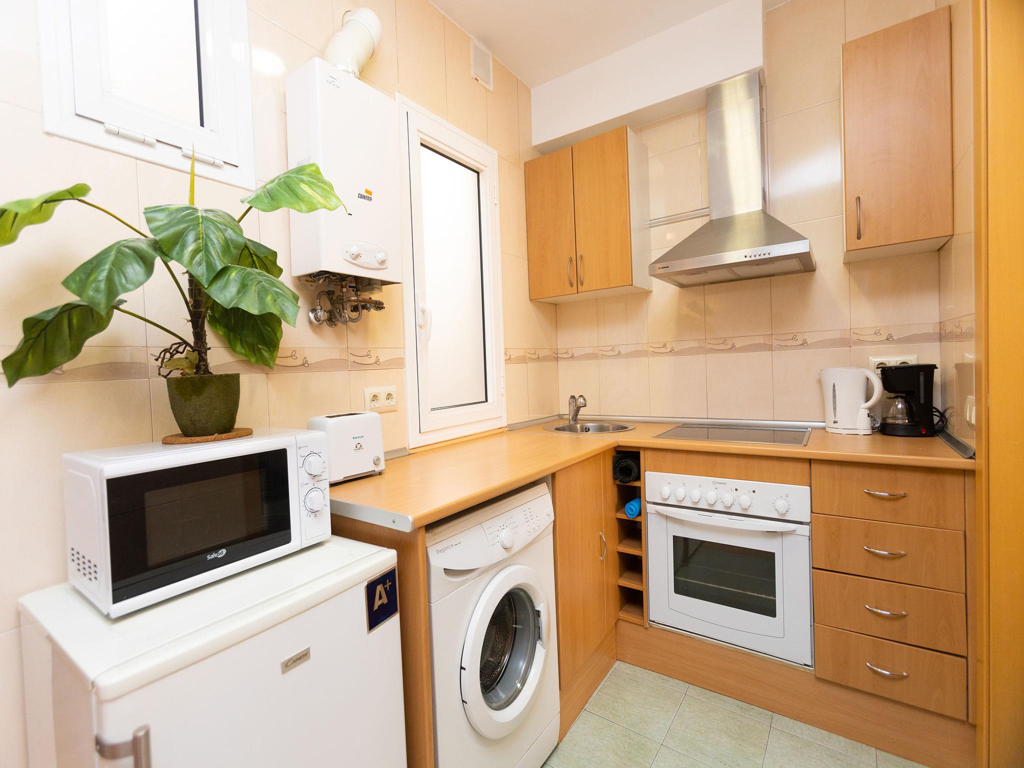 2-room apartment 39 m2 on 5th floor. Bright, cosy furnishings: living/dining room with digital TV, flat screen, air conditioning and forced-air heating. 1 room with 2 beds (90 cm). Open kitchen (oven, microwave, electric coffee machine). Shower/WC. Facilities: washing machine, iron, baby cot for up to 2 year olds (extra), hair dryer. Internet (WiFi, free). Suitable for families. HUTB005218 // Reg. Nr.: ESFCTU000008073000424925000000000000000000HUTB0052181