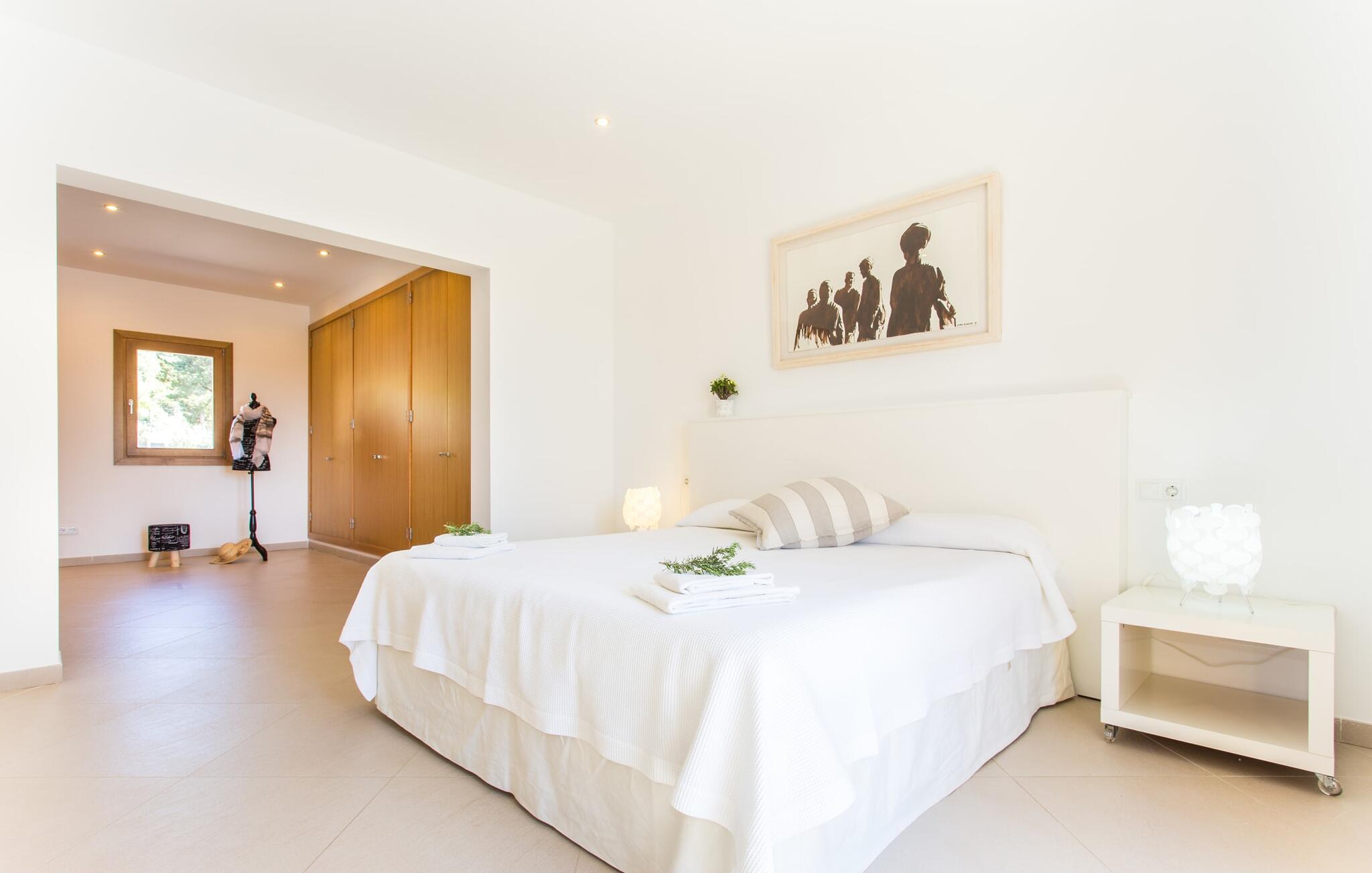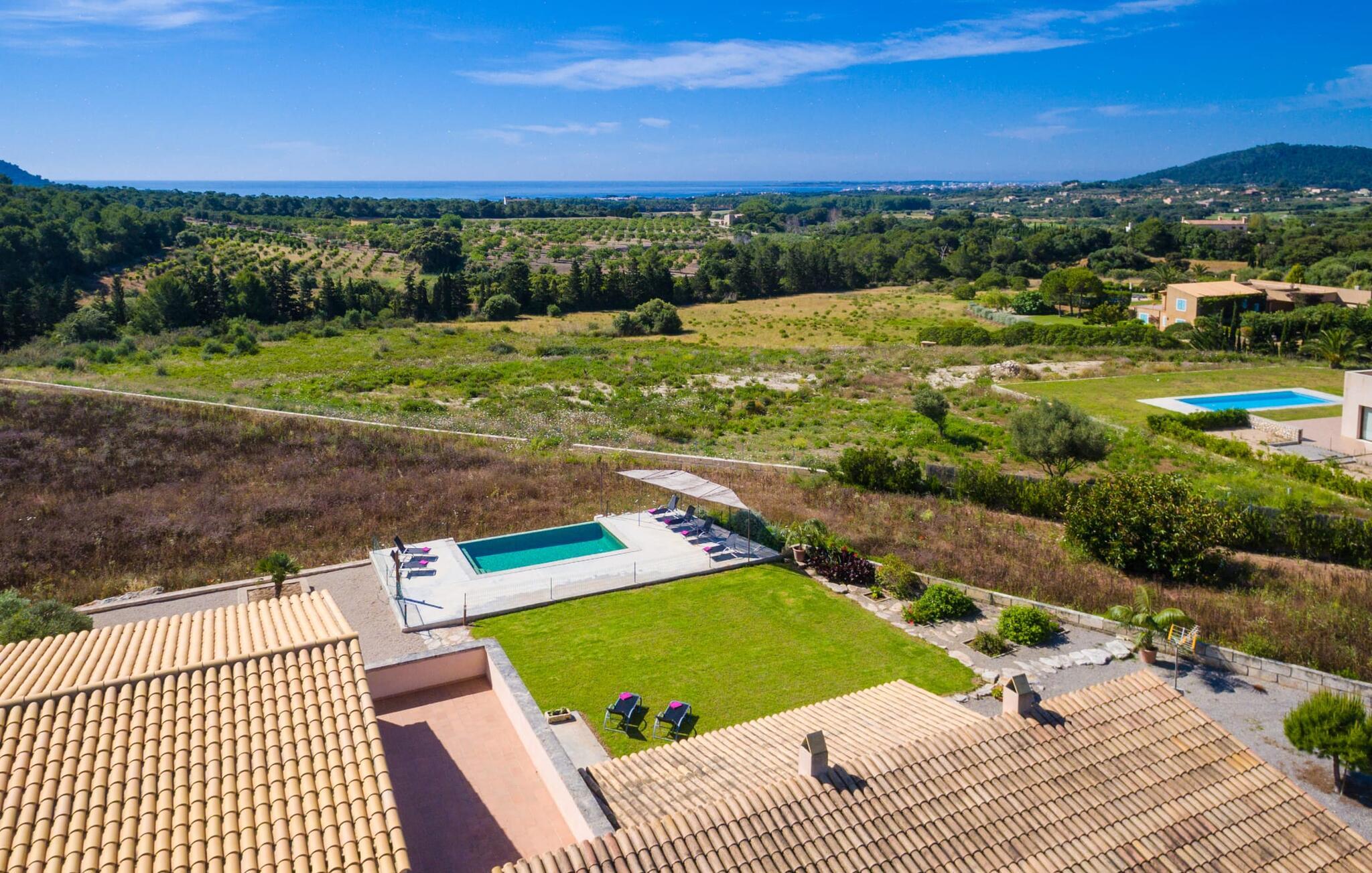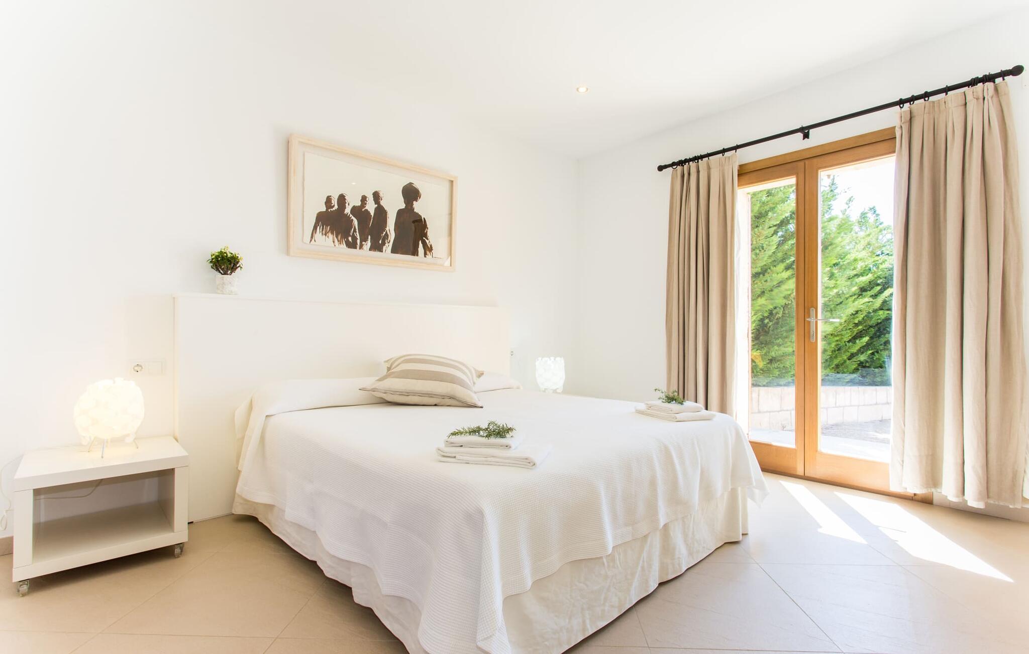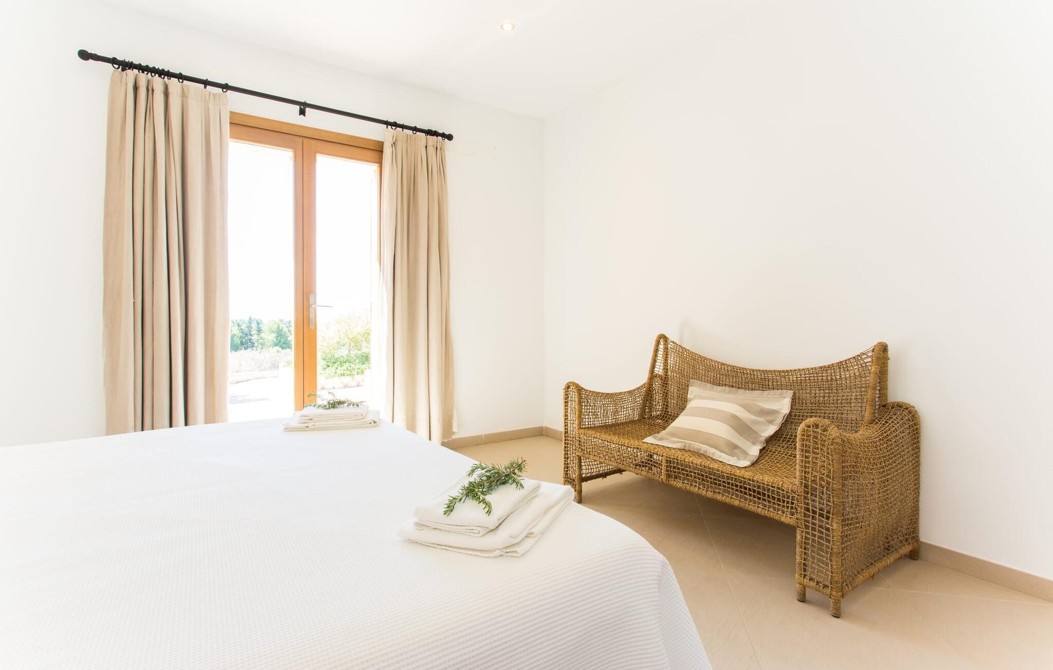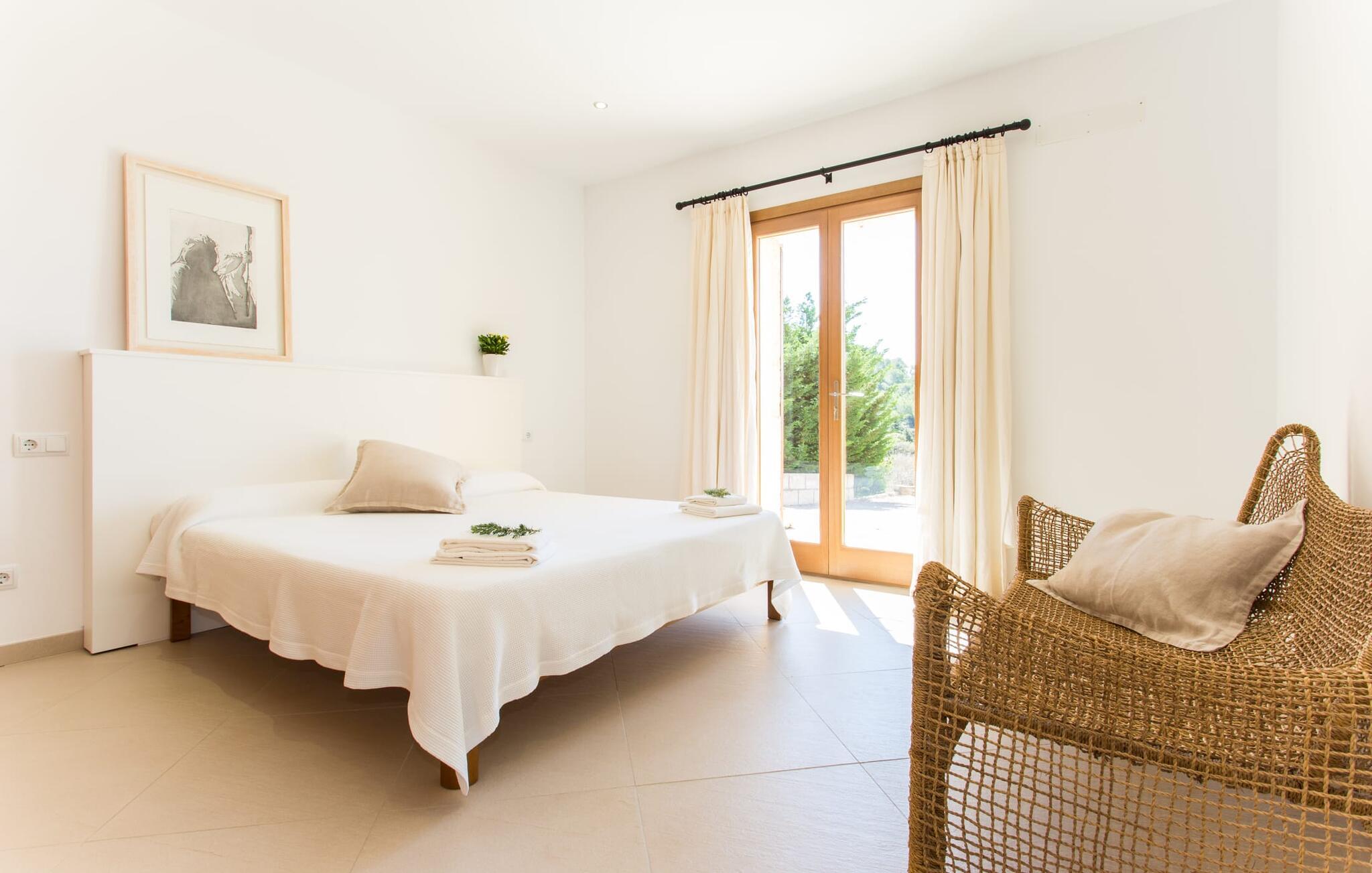 Efter en forfriskende svømmetur i jeres private mini-hav, kan I tage en siesta på den omsluttende terrasse, på en af liggestolene under en markise eller, hvis I føler, at I ikke har fået nok sol endnu, tage en pause til frokost og slap af på græsplænen og lad den varme sol blidt kærtegne jeres hud. Rejser I med børn? Ingen grund til bekymring – poolen er børnesikker. Udearealet er smukt anlagt med aflange grusarealer og fire øer med omhyggeligt beplantet grønt. Den restaurerede facade på den 100 år gamle villa er et sandt blikfang med sine brune skodder og ligger over en overdækket terrasse med et stort bord, hvor I kan nyde ferielækkerier tilberedt efter jeres smag på grillen. Indenfor vil I hurtigt mærke, at jeres sommerhus - selvom det har en lang historie - er fyldt med moderne elementer og udstråler en sublim lysstyrke. Alt her vidner om ejernes udsøgte stil, som har skabt et meget lyst og indbydende interiør med stor sans for detaljer og også takket være de store vinduespartier. I kan nemt tilberede mere kunstfærdige retter i det perfekt udstyrede køkken og servere dem i samme rum ved det hvide træbord, som også kan bruges til at spille brætspil eller til socialt samvær. En skydedør i lyst træ åbner udsigten ind til den moderne stue, hvor I kan vælge mellem gyngestole og to komfortable sofaer. Når I sidder her, kan I nyde den knitrende, stilfulde pejs, der skaber en hjemlig, varm atmosfære, eller se en af klassikerne fra jeres must-see-filmliste. Når alt kommer til alt, er ferie den perfekte mulighed for endelig at gøre alle de ting, I aldrig finder tid til. I stueetagen er der et soveværelse, et badeværelse og et andet soveværelse med badeværelse, som kun er tilgængeligt fra dette værelse. Upåfaldende kunstværker fordelt i hele huset bryder rummet op med et generøst, minimalistisk, klart præg. Trappen i gangen fører op til øverste etage, hvor I bliver mødt af endnu en stue med sofaer. Hvid er den fremherskende farve i kombination med andre jordnære naturtoner. Der er også en balkon på første sal med udsigt til havet i det fjerne, der glitrer i tusinde nuancer af blåt. Selvom I forlader villaen for at udforske omgivelserne, vil I finde mange naturlige toner. Villaen ligger lige på en gade, som I nogle gange kan høre. Fordelen er dog, at I er meget godt forbundet, og jeres daglige indkøb kan gøres i landsbyen Son Servera, kun 7 km væk, som er ideel til en gåtur med sine stejle gader. På vejen dertil kommer I forbi Pula golfbane, hvor I kan arbejde på jeres handicap. Eller I kan tage til den livlige kystby Cala Millor, kun 7 km fra jeres villa. Her kan I besøge det lokale marked om søndagen, hvor I kan købe frisk fisk fanget af fiskerne om morgenen. I kan selvfølgelig også gå i havet, for takket være det fine, hvide sand og den fremragende vandkvalitet er indsejlingen skånsom og meget skånsom. Costa de los Pinos med dets turkise vand og idylliske bugter, der får enhver ferierejsendes hjerte til at banke hurtigere, kan nås på kun 8 minutter. For at afslutte jeres dag kan I nyde den uforglemmelige aftenstemning i byen Artà, omkring 7,6 km væk, med dens mange snoede gader. Villaen "Bell Jardi" kombinerer århundreders tradition med uforlignelig modernitet og vidner om alsidigheden i denne særlige region på Mallorca. Her står Son Servera med sine stejle gader i skærende kontrast til den smukke, blide natur, der omgiver den. Hvis I er en hav- og naturelsker, vil overfloden af smukke kystbyer og strande som Cala Millor, Cala Bona, Costa dels Pins og Cala Agulla få jer til at føle, at I er i paradis - og gæt hvad: det er I faktisk! Artà, middelalderbyen med magisk charme, ligger kun 10 minutters kørsel væk.