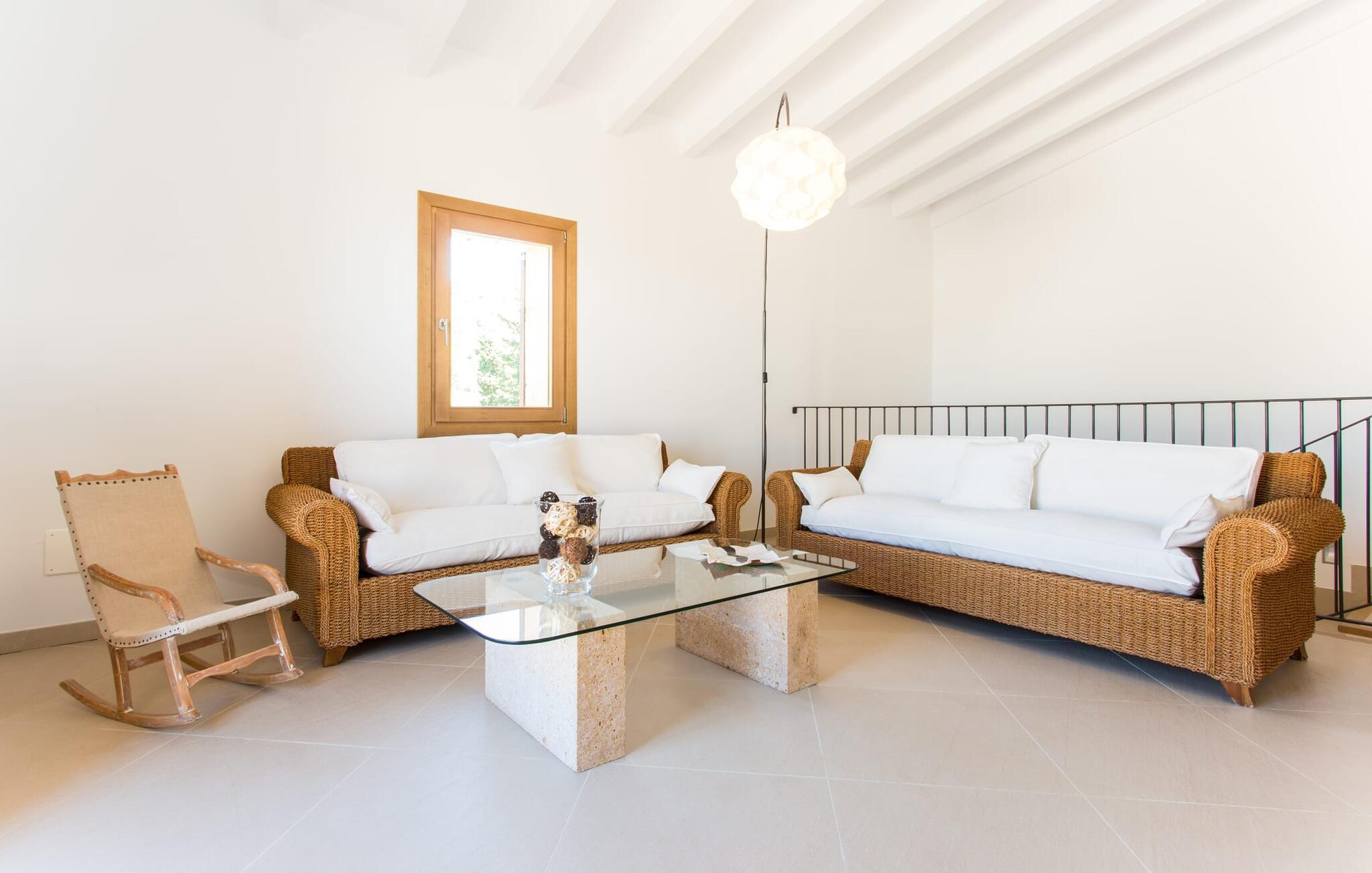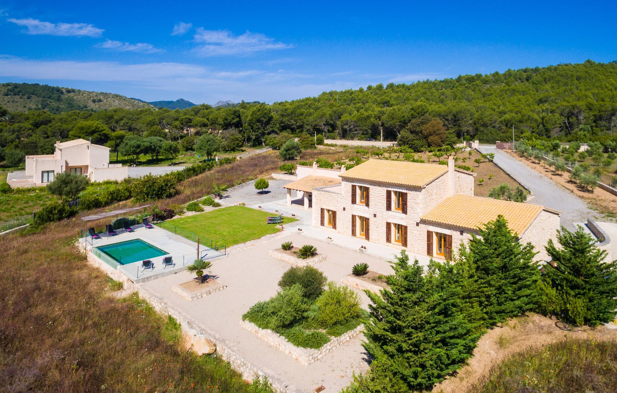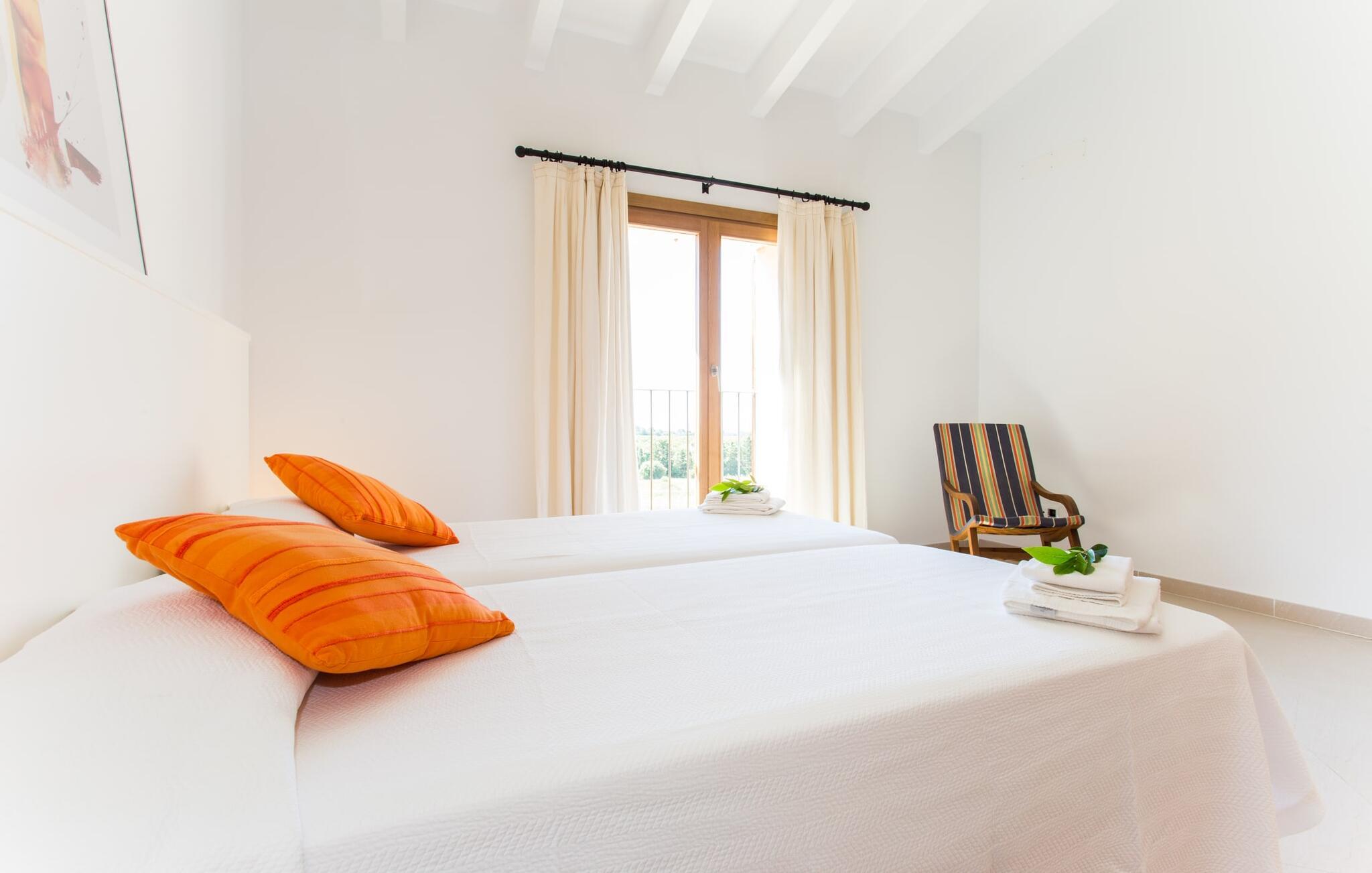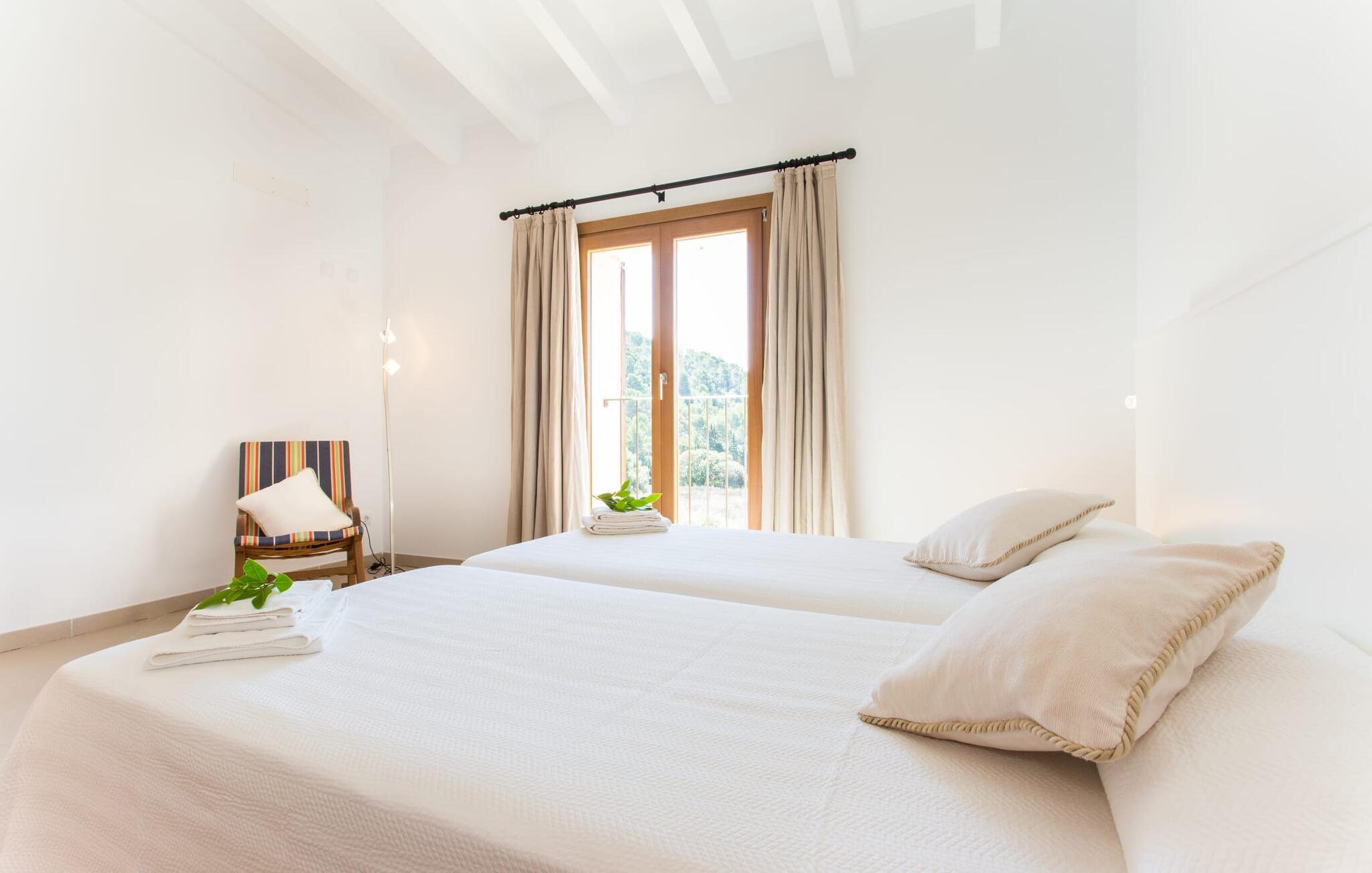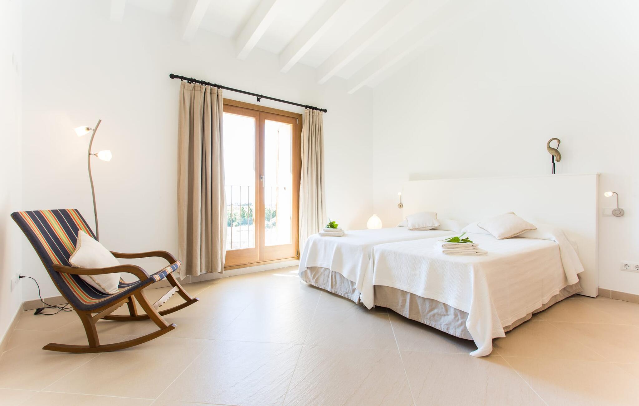 Efter en forfriskende svømmetur i jeres private mini-hav, kan I tage en siesta på den omsluttende terrasse, på en af liggestolene under en markise eller, hvis I føler, at I ikke har fået nok sol endnu, tage en pause til frokost og slap af på græsplænen og lad den varme sol blidt kærtegne jeres hud. Rejser I med børn? Ingen grund til bekymring – poolen er børnesikker. Udearealet er smukt anlagt med aflange grusarealer og fire øer med omhyggeligt beplantet grønt. Den restaurerede facade på den 100 år gamle villa er et sandt blikfang med sine brune skodder og ligger over en overdækket terrasse med et stort bord, hvor I kan nyde ferielækkerier tilberedt efter jeres smag på grillen. Indenfor vil I hurtigt mærke, at jeres sommerhus - selvom det har en lang historie - er fyldt med moderne elementer og udstråler en sublim lysstyrke. Alt her vidner om ejernes udsøgte stil, som har skabt et meget lyst og indbydende interiør med stor sans for detaljer og også takket være de store vinduespartier. I kan nemt tilberede mere kunstfærdige retter i det perfekt udstyrede køkken og servere dem i samme rum ved det hvide træbord, som også kan bruges til at spille brætspil eller til socialt samvær. En skydedør i lyst træ åbner udsigten ind til den moderne stue, hvor I kan vælge mellem gyngestole og to komfortable sofaer. Når I sidder her, kan I nyde den knitrende, stilfulde pejs, der skaber en hjemlig, varm atmosfære, eller se en af klassikerne fra jeres must-see-filmliste. Når alt kommer til alt, er ferie den perfekte mulighed for endelig at gøre alle de ting, I aldrig finder tid til. I stueetagen er der et soveværelse, et badeværelse og et andet soveværelse med badeværelse, som kun er tilgængeligt fra dette værelse. Upåfaldende kunstværker fordelt i hele huset bryder rummet op med et generøst, minimalistisk, klart præg. Trappen i gangen fører op til øverste etage, hvor I bliver mødt af endnu en stue med sofaer. Hvid er den fremherskende farve i kombination med andre jordnære naturtoner. Der er også en balkon på første sal med udsigt til havet i det fjerne, der glitrer i tusinde nuancer af blåt. Selvom I forlader villaen for at udforske omgivelserne, vil I finde mange naturlige toner. Villaen ligger lige på en gade, som I nogle gange kan høre. Fordelen er dog, at I er meget godt forbundet, og jeres daglige indkøb kan gøres i landsbyen Son Servera, kun 7 km væk, som er ideel til en gåtur med sine stejle gader. På vejen dertil kommer I forbi Pula golfbane, hvor I kan arbejde på jeres handicap. Eller I kan tage til den livlige kystby Cala Millor, kun 7 km fra jeres villa. Her kan I besøge det lokale marked om søndagen, hvor I kan købe frisk fisk fanget af fiskerne om morgenen. I kan selvfølgelig også gå i havet, for takket være det fine, hvide sand og den fremragende vandkvalitet er indsejlingen skånsom og meget skånsom. Costa de los Pinos med dets turkise vand og idylliske bugter, der får enhver ferierejsendes hjerte til at banke hurtigere, kan nås på kun 8 minutter. For at afslutte jeres dag kan I nyde den uforglemmelige aftenstemning i byen Artà, omkring 7,6 km væk, med dens mange snoede gader. Villaen "Bell Jardi" kombinerer århundreders tradition med uforlignelig modernitet og vidner om alsidigheden i denne særlige region på Mallorca. Her står Son Servera med sine stejle gader i skærende kontrast til den smukke, blide natur, der omgiver den. Hvis I er en hav- og naturelsker, vil overfloden af smukke kystbyer og strande som Cala Millor, Cala Bona, Costa dels Pins og Cala Agulla få jer til at føle, at I er i paradis - og gæt hvad: det er I faktisk! Artà, middelalderbyen med magisk charme, ligger kun 10 minutters kørsel væk.