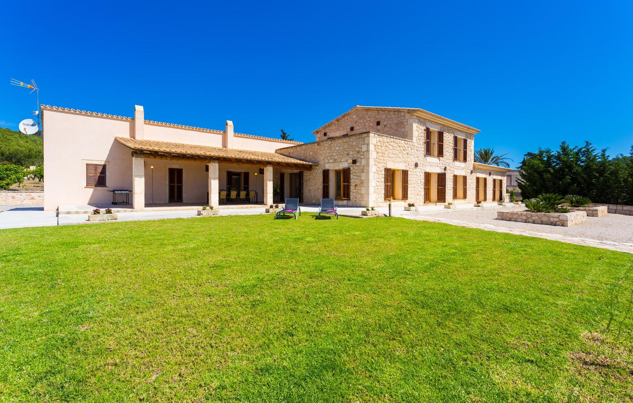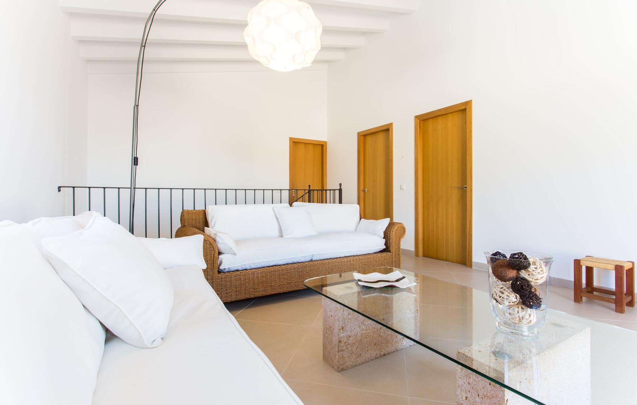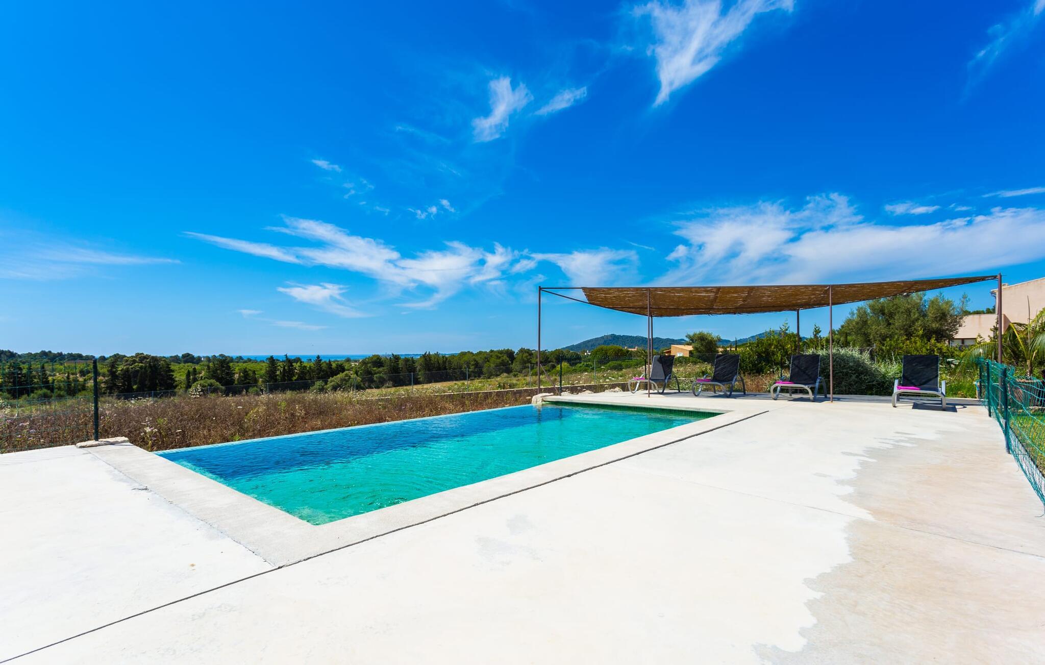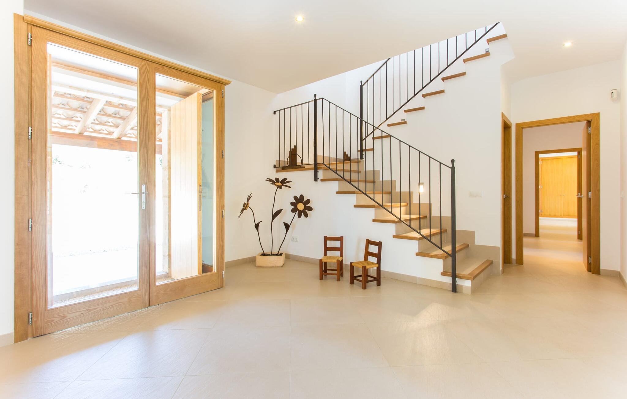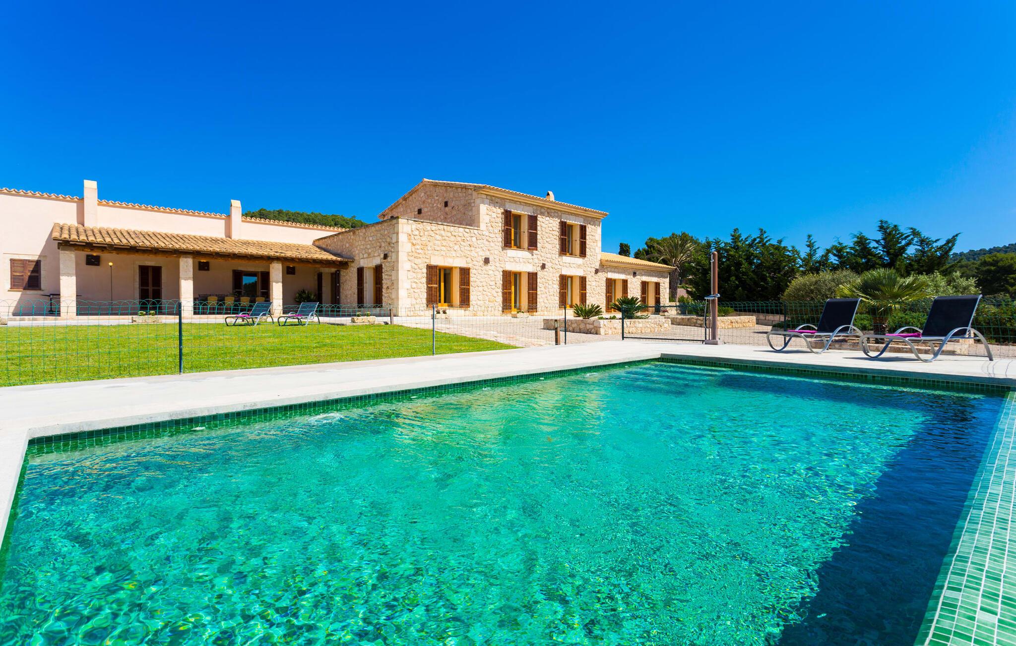 Efter en forfriskende svømmetur i jeres private mini-hav, kan I tage en siesta på den omsluttende terrasse, på en af liggestolene under en markise eller, hvis I føler, at I ikke har fået nok sol endnu, tage en pause til frokost og slap af på græsplænen og lad den varme sol blidt kærtegne jeres hud. Rejser I med børn? Ingen grund til bekymring – poolen er børnesikker. Udearealet er smukt anlagt med aflange grusarealer og fire øer med omhyggeligt beplantet grønt. Den restaurerede facade på den 100 år gamle villa er et sandt blikfang med sine brune skodder og ligger over en overdækket terrasse med et stort bord, hvor I kan nyde ferielækkerier tilberedt efter jeres smag på grillen. Indenfor vil I hurtigt mærke, at jeres sommerhus - selvom det har en lang historie - er fyldt med moderne elementer og udstråler en sublim lysstyrke. Alt her vidner om ejernes udsøgte stil, som har skabt et meget lyst og indbydende interiør med stor sans for detaljer og også takket være de store vinduespartier. I kan nemt tilberede mere kunstfærdige retter i det perfekt udstyrede køkken og servere dem i samme rum ved det hvide træbord, som også kan bruges til at spille brætspil eller til socialt samvær. En skydedør i lyst træ åbner udsigten ind til den moderne stue, hvor I kan vælge mellem gyngestole og to komfortable sofaer. Når I sidder her, kan I nyde den knitrende, stilfulde pejs, der skaber en hjemlig, varm atmosfære, eller se en af klassikerne fra jeres must-see-filmliste. Når alt kommer til alt, er ferie den perfekte mulighed for endelig at gøre alle de ting, I aldrig finder tid til. I stueetagen er der et soveværelse, et badeværelse og et andet soveværelse med badeværelse, som kun er tilgængeligt fra dette værelse. Upåfaldende kunstværker fordelt i hele huset bryder rummet op med et generøst, minimalistisk, klart præg. Trappen i gangen fører op til øverste etage, hvor I bliver mødt af endnu en stue med sofaer. Hvid er den fremherskende farve i kombination med andre jordnære naturtoner. Der er også en balkon på første sal med udsigt til havet i det fjerne, der glitrer i tusinde nuancer af blåt. Selvom I forlader villaen for at udforske omgivelserne, vil I finde mange naturlige toner. Villaen ligger lige på en gade, som I nogle gange kan høre. Fordelen er dog, at I er meget godt forbundet, og jeres daglige indkøb kan gøres i landsbyen Son Servera, kun 7 km væk, som er ideel til en gåtur med sine stejle gader. På vejen dertil kommer I forbi Pula golfbane, hvor I kan arbejde på jeres handicap. Eller I kan tage til den livlige kystby Cala Millor, kun 7 km fra jeres villa. Her kan I besøge det lokale marked om søndagen, hvor I kan købe frisk fisk fanget af fiskerne om morgenen. I kan selvfølgelig også gå i havet, for takket være det fine, hvide sand og den fremragende vandkvalitet er indsejlingen skånsom og meget skånsom. Costa de los Pinos med dets turkise vand og idylliske bugter, der får enhver ferierejsendes hjerte til at banke hurtigere, kan nås på kun 8 minutter. For at afslutte jeres dag kan I nyde den uforglemmelige aftenstemning i byen Artà, omkring 7,6 km væk, med dens mange snoede gader. Villaen "Bell Jardi" kombinerer århundreders tradition med uforlignelig modernitet og vidner om alsidigheden i denne særlige region på Mallorca. Her står Son Servera med sine stejle gader i skærende kontrast til den smukke, blide natur, der omgiver den. Hvis I er en hav- og naturelsker, vil overfloden af smukke kystbyer og strande som Cala Millor, Cala Bona, Costa dels Pins og Cala Agulla få jer til at føle, at I er i paradis - og gæt hvad: det er I faktisk! Artà, middelalderbyen med magisk charme, ligger kun 10 minutters kørsel væk.