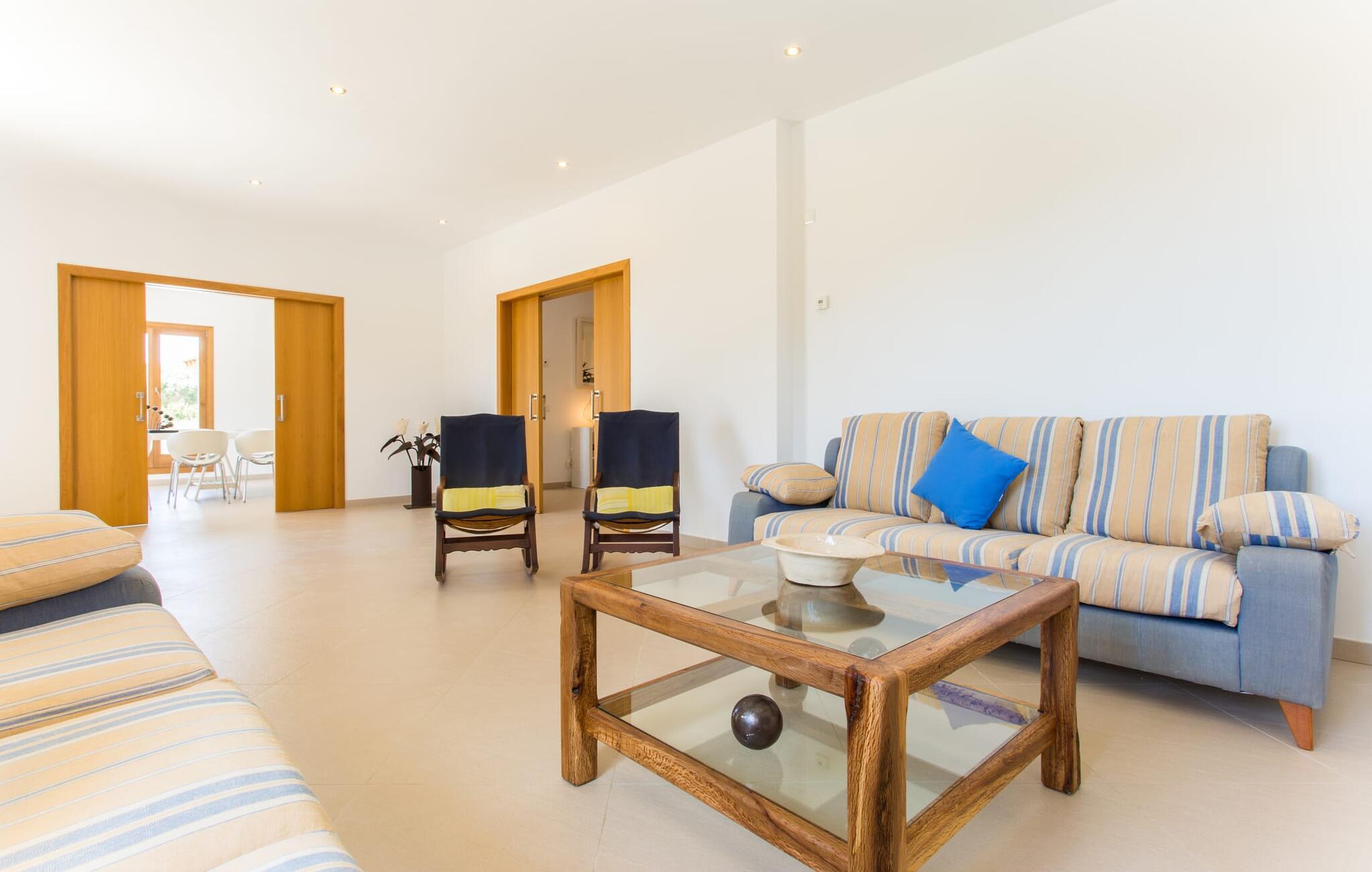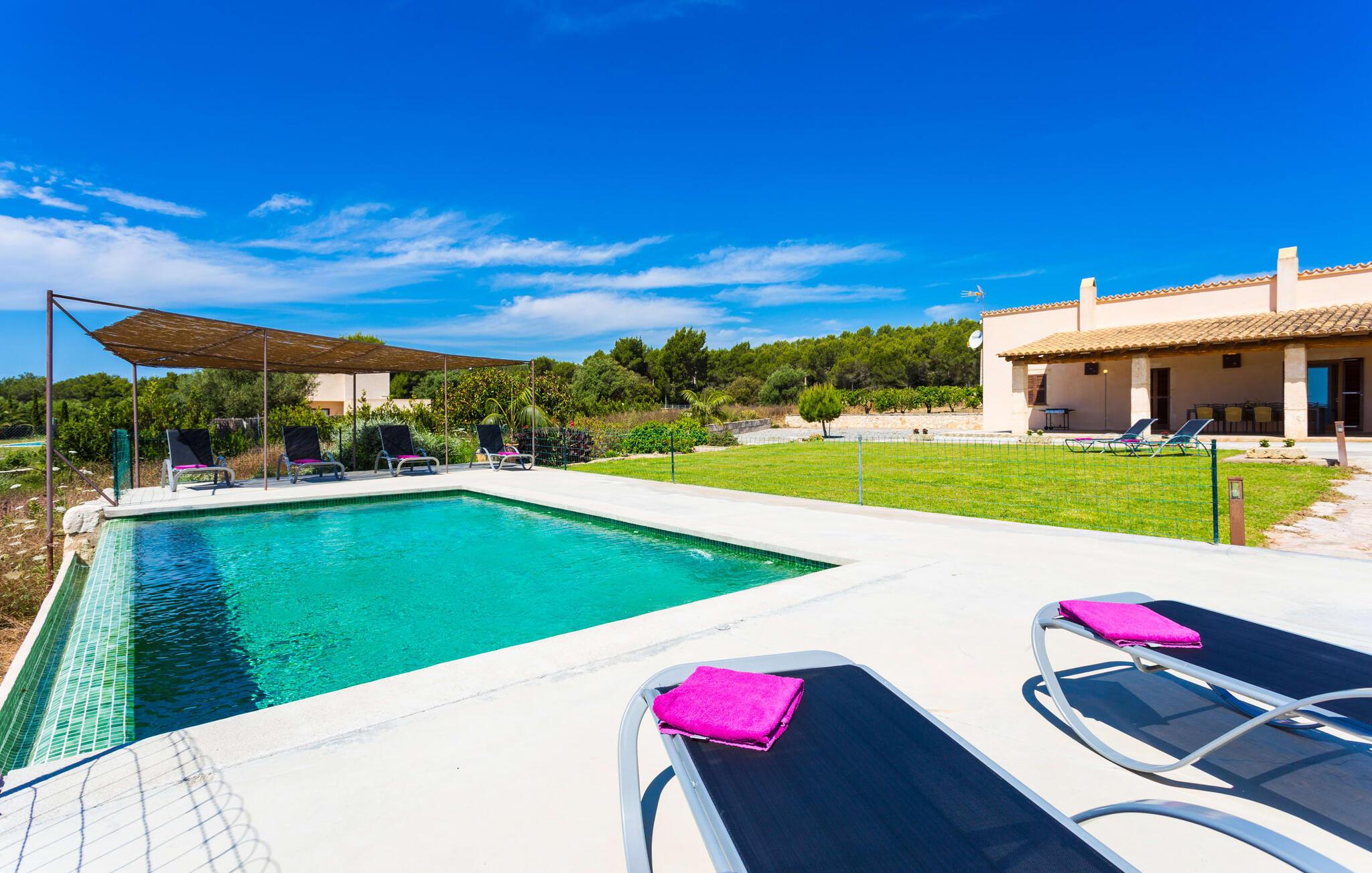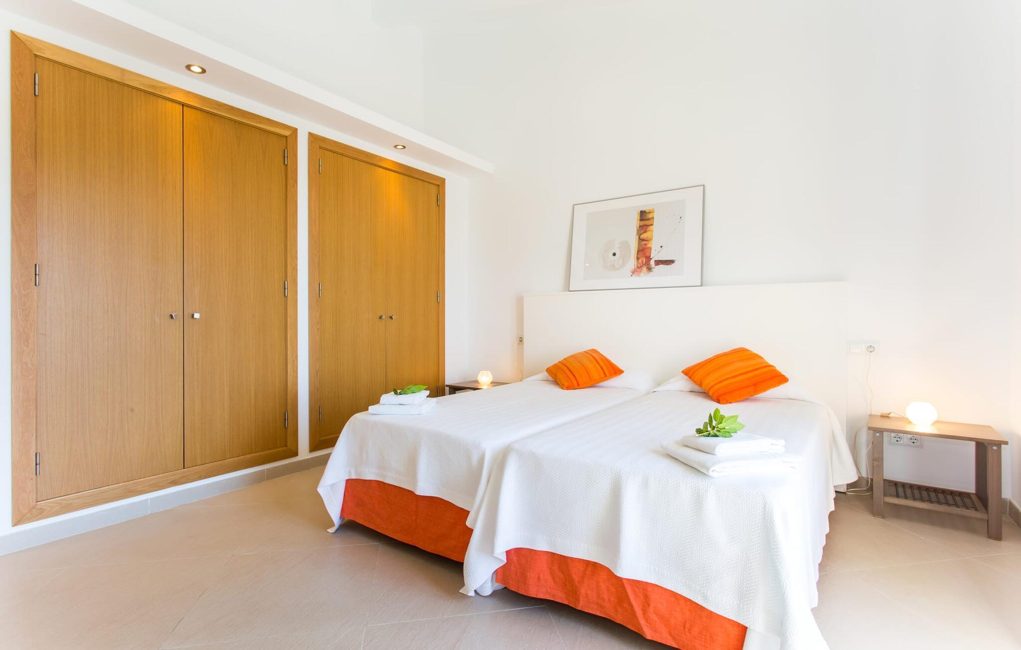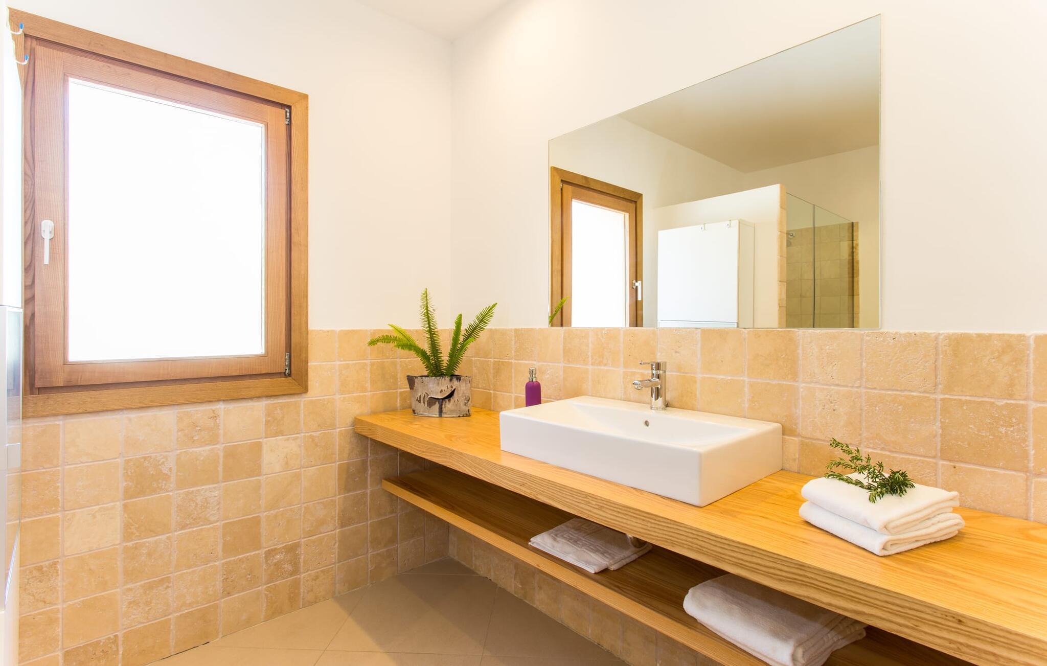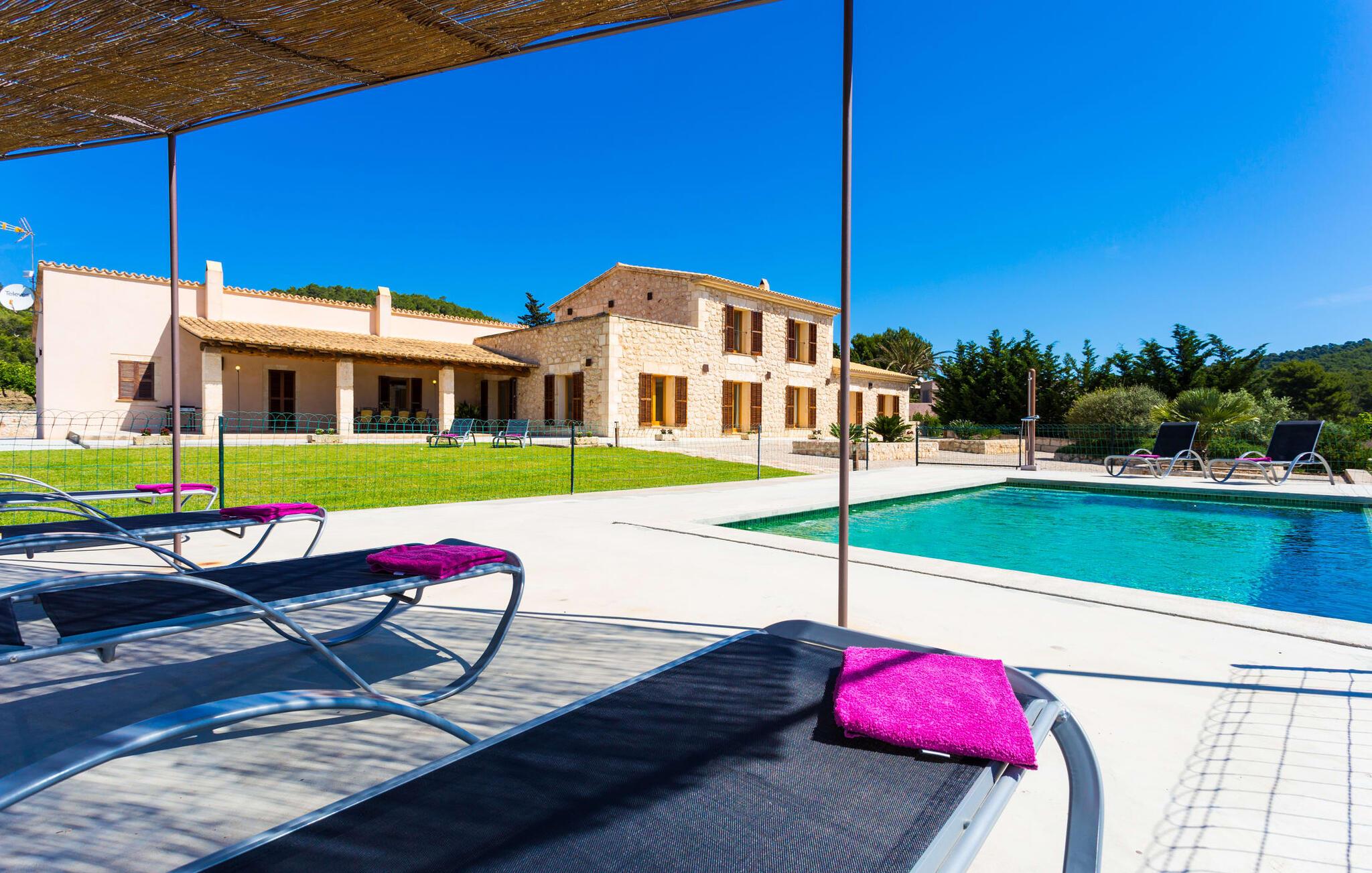 Efter en forfriskende svømmetur i jeres private mini-hav, kan I tage en siesta på den omsluttende terrasse, på en af liggestolene under en markise eller, hvis I føler, at I ikke har fået nok sol endnu, tage en pause til frokost og slap af på græsplænen og lad den varme sol blidt kærtegne jeres hud. Rejser I med børn? Ingen grund til bekymring – poolen er børnesikker. Udearealet er smukt anlagt med aflange grusarealer og fire øer med omhyggeligt beplantet grønt. Den restaurerede facade på den 100 år gamle villa er et sandt blikfang med sine brune skodder og ligger over en overdækket terrasse med et stort bord, hvor I kan nyde ferielækkerier tilberedt efter jeres smag på grillen. Indenfor vil I hurtigt mærke, at jeres sommerhus - selvom det har en lang historie - er fyldt med moderne elementer og udstråler en sublim lysstyrke. Alt her vidner om ejernes udsøgte stil, som har skabt et meget lyst og indbydende interiør med stor sans for detaljer og også takket være de store vinduespartier. I kan nemt tilberede mere kunstfærdige retter i det perfekt udstyrede køkken og servere dem i samme rum ved det hvide træbord, som også kan bruges til at spille brætspil eller til socialt samvær. En skydedør i lyst træ åbner udsigten ind til den moderne stue, hvor I kan vælge mellem gyngestole og to komfortable sofaer. Når I sidder her, kan I nyde den knitrende, stilfulde pejs, der skaber en hjemlig, varm atmosfære, eller se en af klassikerne fra jeres must-see-filmliste. Når alt kommer til alt, er ferie den perfekte mulighed for endelig at gøre alle de ting, I aldrig finder tid til. I stueetagen er der et soveværelse, et badeværelse og et andet soveværelse med badeværelse, som kun er tilgængeligt fra dette værelse. Upåfaldende kunstværker fordelt i hele huset bryder rummet op med et generøst, minimalistisk, klart præg. Trappen i gangen fører op til øverste etage, hvor I bliver mødt af endnu en stue med sofaer. Hvid er den fremherskende farve i kombination med andre jordnære naturtoner. Der er også en balkon på første sal med udsigt til havet i det fjerne, der glitrer i tusinde nuancer af blåt. Selvom I forlader villaen for at udforske omgivelserne, vil I finde mange naturlige toner. Villaen ligger lige på en gade, som I nogle gange kan høre. Fordelen er dog, at I er meget godt forbundet, og jeres daglige indkøb kan gøres i landsbyen Son Servera, kun 7 km væk, som er ideel til en gåtur med sine stejle gader. På vejen dertil kommer I forbi Pula golfbane, hvor I kan arbejde på jeres handicap. Eller I kan tage til den livlige kystby Cala Millor, kun 7 km fra jeres villa. Her kan I besøge det lokale marked om søndagen, hvor I kan købe frisk fisk fanget af fiskerne om morgenen. I kan selvfølgelig også gå i havet, for takket være det fine, hvide sand og den fremragende vandkvalitet er indsejlingen skånsom og meget skånsom. Costa de los Pinos med dets turkise vand og idylliske bugter, der får enhver ferierejsendes hjerte til at banke hurtigere, kan nås på kun 8 minutter. For at afslutte jeres dag kan I nyde den uforglemmelige aftenstemning i byen Artà, omkring 7,6 km væk, med dens mange snoede gader. Villaen "Bell Jardi" kombinerer århundreders tradition med uforlignelig modernitet og vidner om alsidigheden i denne særlige region på Mallorca. Her står Son Servera med sine stejle gader i skærende kontrast til den smukke, blide natur, der omgiver den. Hvis I er en hav- og naturelsker, vil overfloden af smukke kystbyer og strande som Cala Millor, Cala Bona, Costa dels Pins og Cala Agulla få jer til at føle, at I er i paradis - og gæt hvad: det er I faktisk! Artà, middelalderbyen med magisk charme, ligger kun 10 minutters kørsel væk.