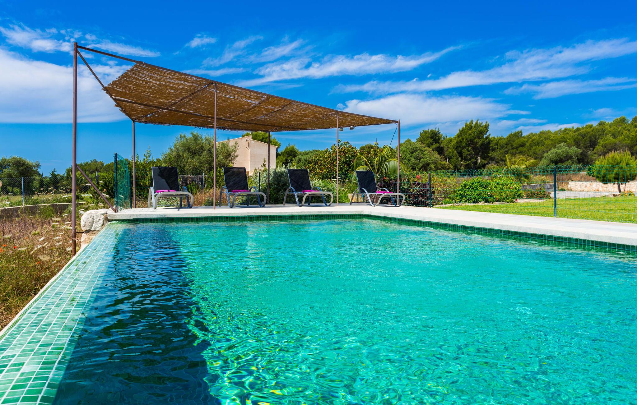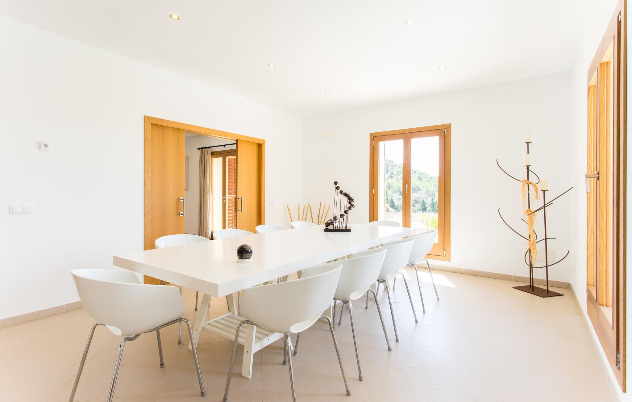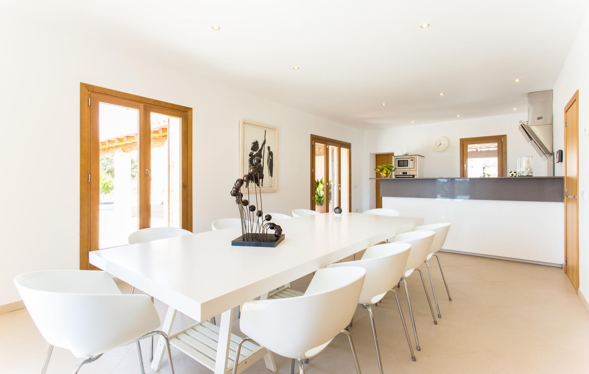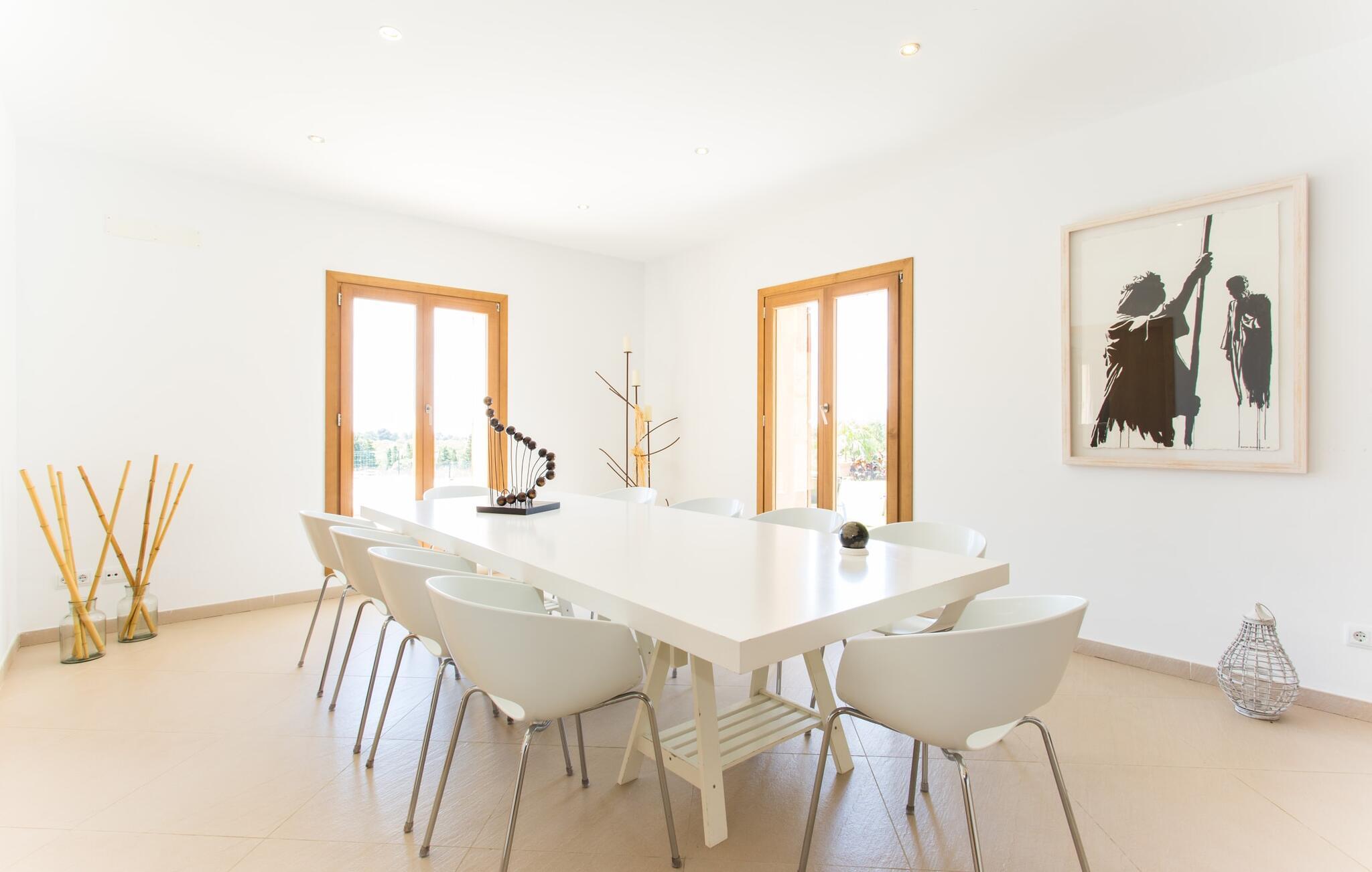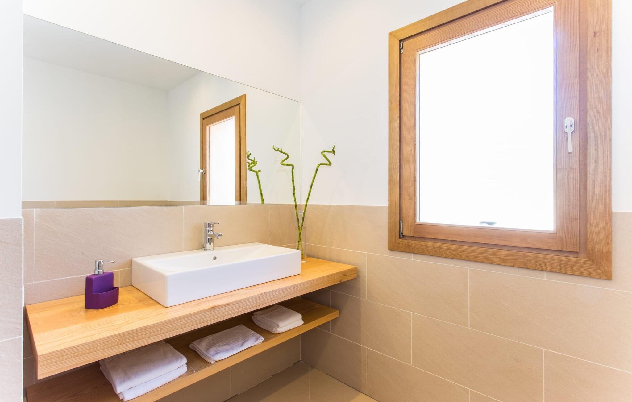 Efter en forfriskende svømmetur i jeres private mini-hav, kan I tage en siesta på den omsluttende terrasse, på en af liggestolene under en markise eller, hvis I føler, at I ikke har fået nok sol endnu, tage en pause til frokost og slap af på græsplænen og lad den varme sol blidt kærtegne jeres hud. Rejser I med børn? Ingen grund til bekymring – poolen er børnesikker. Udearealet er smukt anlagt med aflange grusarealer og fire øer med omhyggeligt beplantet grønt. Den restaurerede facade på den 100 år gamle villa er et sandt blikfang med sine brune skodder og ligger over en overdækket terrasse med et stort bord, hvor I kan nyde ferielækkerier tilberedt efter jeres smag på grillen. Indenfor vil I hurtigt mærke, at jeres sommerhus - selvom det har en lang historie - er fyldt med moderne elementer og udstråler en sublim lysstyrke. Alt her vidner om ejernes udsøgte stil, som har skabt et meget lyst og indbydende interiør med stor sans for detaljer og også takket være de store vinduespartier. I kan nemt tilberede mere kunstfærdige retter i det perfekt udstyrede køkken og servere dem i samme rum ved det hvide træbord, som også kan bruges til at spille brætspil eller til socialt samvær. En skydedør i lyst træ åbner udsigten ind til den moderne stue, hvor I kan vælge mellem gyngestole og to komfortable sofaer. Når I sidder her, kan I nyde den knitrende, stilfulde pejs, der skaber en hjemlig, varm atmosfære, eller se en af klassikerne fra jeres must-see-filmliste. Når alt kommer til alt, er ferie den perfekte mulighed for endelig at gøre alle de ting, I aldrig finder tid til. I stueetagen er der et soveværelse, et badeværelse og et andet soveværelse med badeværelse, som kun er tilgængeligt fra dette værelse. Upåfaldende kunstværker fordelt i hele huset bryder rummet op med et generøst, minimalistisk, klart præg. Trappen i gangen fører op til øverste etage, hvor I bliver mødt af endnu en stue med sofaer. Hvid er den fremherskende farve i kombination med andre jordnære naturtoner. Der er også en balkon på første sal med udsigt til havet i det fjerne, der glitrer i tusinde nuancer af blåt. Selvom I forlader villaen for at udforske omgivelserne, vil I finde mange naturlige toner. Villaen ligger lige på en gade, som I nogle gange kan høre. Fordelen er dog, at I er meget godt forbundet, og jeres daglige indkøb kan gøres i landsbyen Son Servera, kun 7 km væk, som er ideel til en gåtur med sine stejle gader. På vejen dertil kommer I forbi Pula golfbane, hvor I kan arbejde på jeres handicap. Eller I kan tage til den livlige kystby Cala Millor, kun 7 km fra jeres villa. Her kan I besøge det lokale marked om søndagen, hvor I kan købe frisk fisk fanget af fiskerne om morgenen. I kan selvfølgelig også gå i havet, for takket være det fine, hvide sand og den fremragende vandkvalitet er indsejlingen skånsom og meget skånsom. Costa de los Pinos med dets turkise vand og idylliske bugter, der får enhver ferierejsendes hjerte til at banke hurtigere, kan nås på kun 8 minutter. For at afslutte jeres dag kan I nyde den uforglemmelige aftenstemning i byen Artà, omkring 7,6 km væk, med dens mange snoede gader. Villaen "Bell Jardi" kombinerer århundreders tradition med uforlignelig modernitet og vidner om alsidigheden i denne særlige region på Mallorca. Her står Son Servera med sine stejle gader i skærende kontrast til den smukke, blide natur, der omgiver den. Hvis I er en hav- og naturelsker, vil overfloden af smukke kystbyer og strande som Cala Millor, Cala Bona, Costa dels Pins og Cala Agulla få jer til at føle, at I er i paradis - og gæt hvad: det er I faktisk! Artà, middelalderbyen med magisk charme, ligger kun 10 minutters kørsel væk.