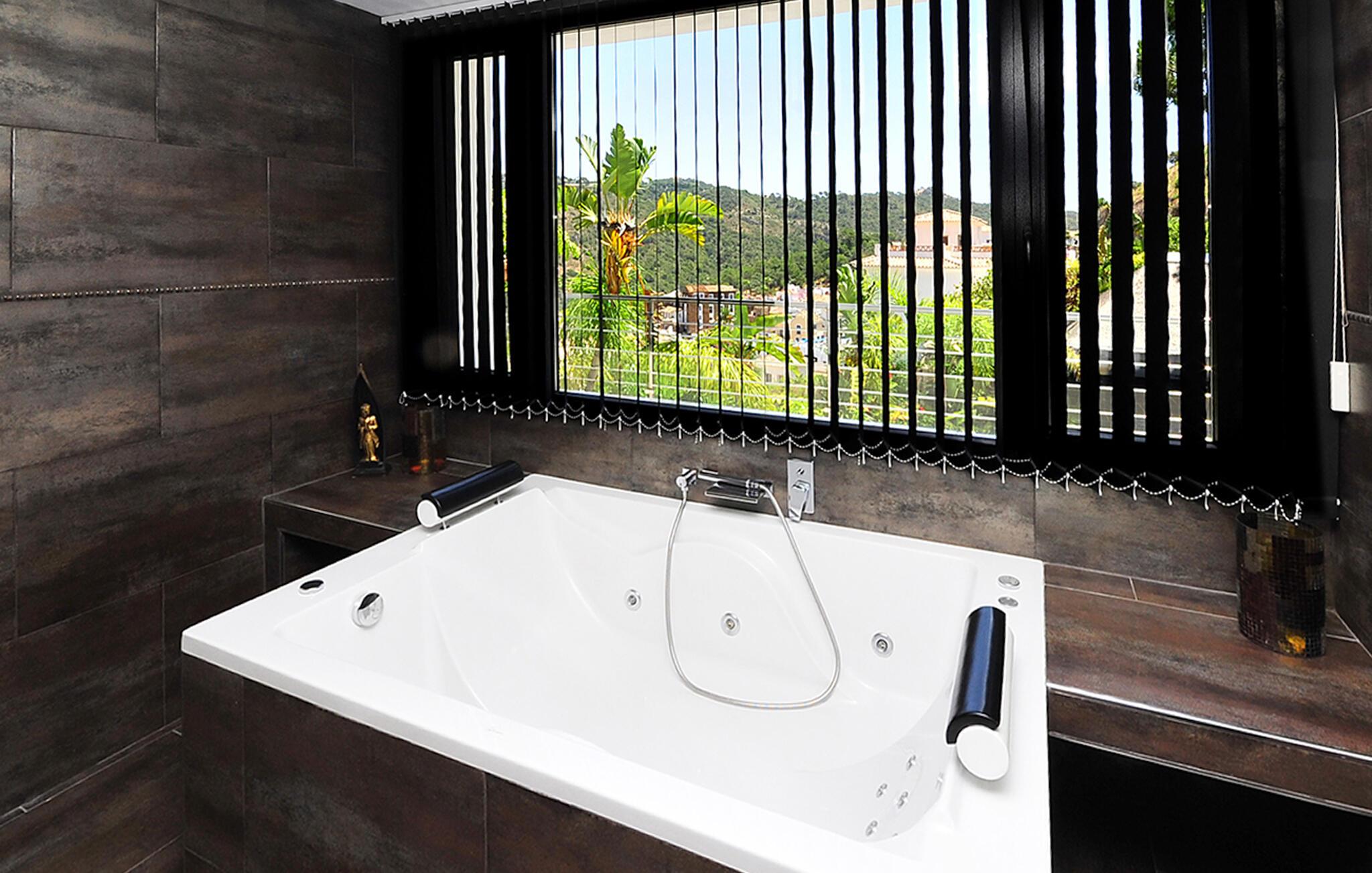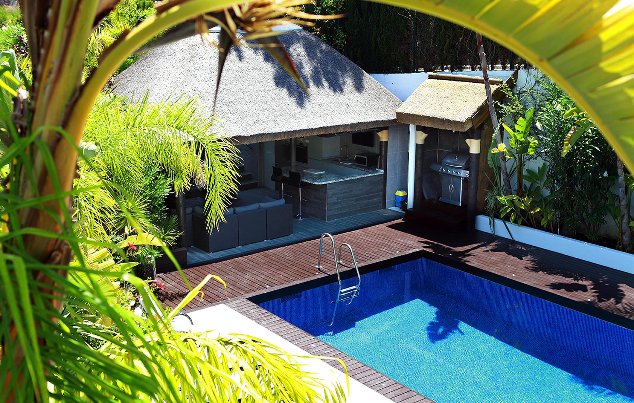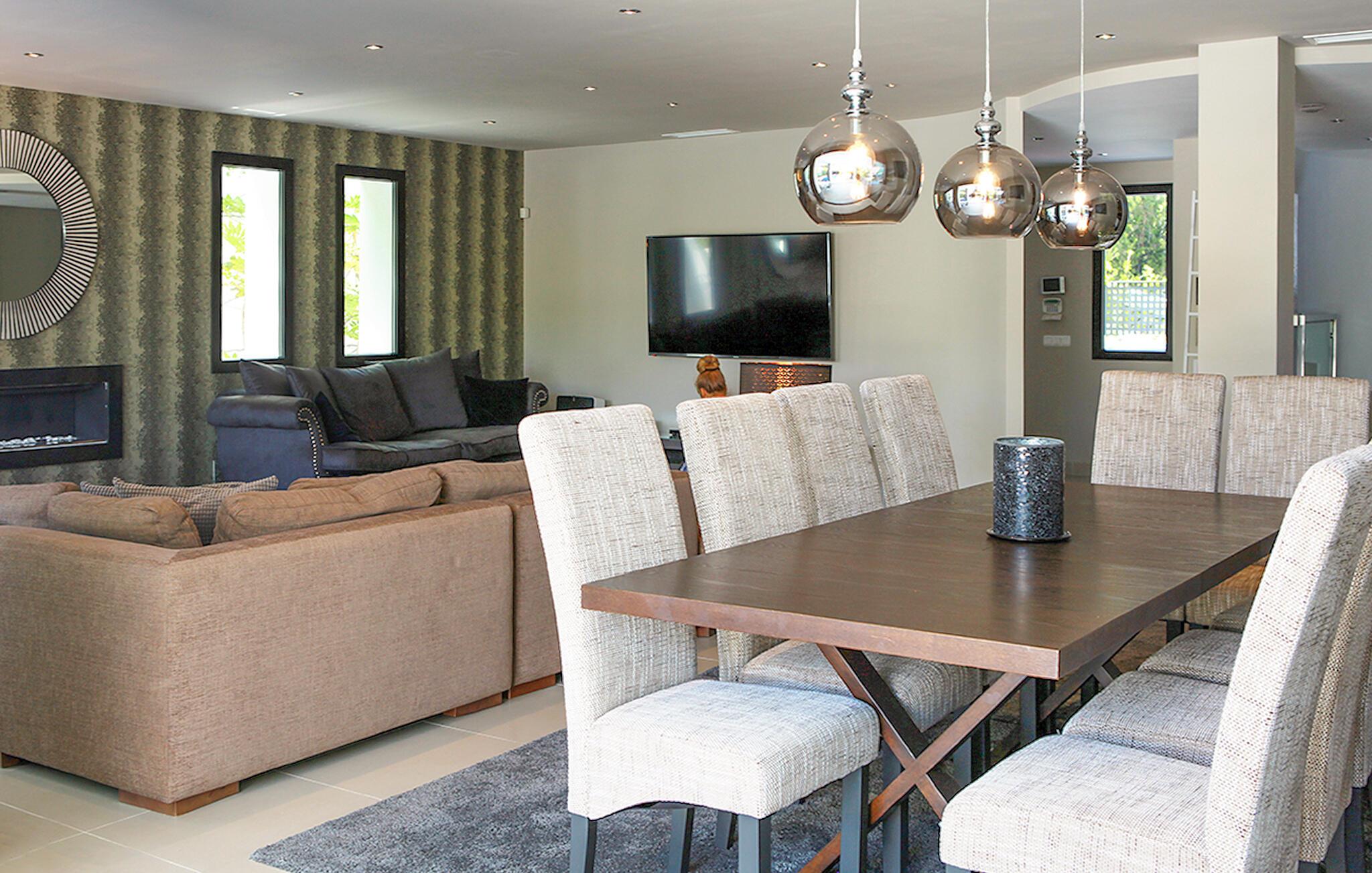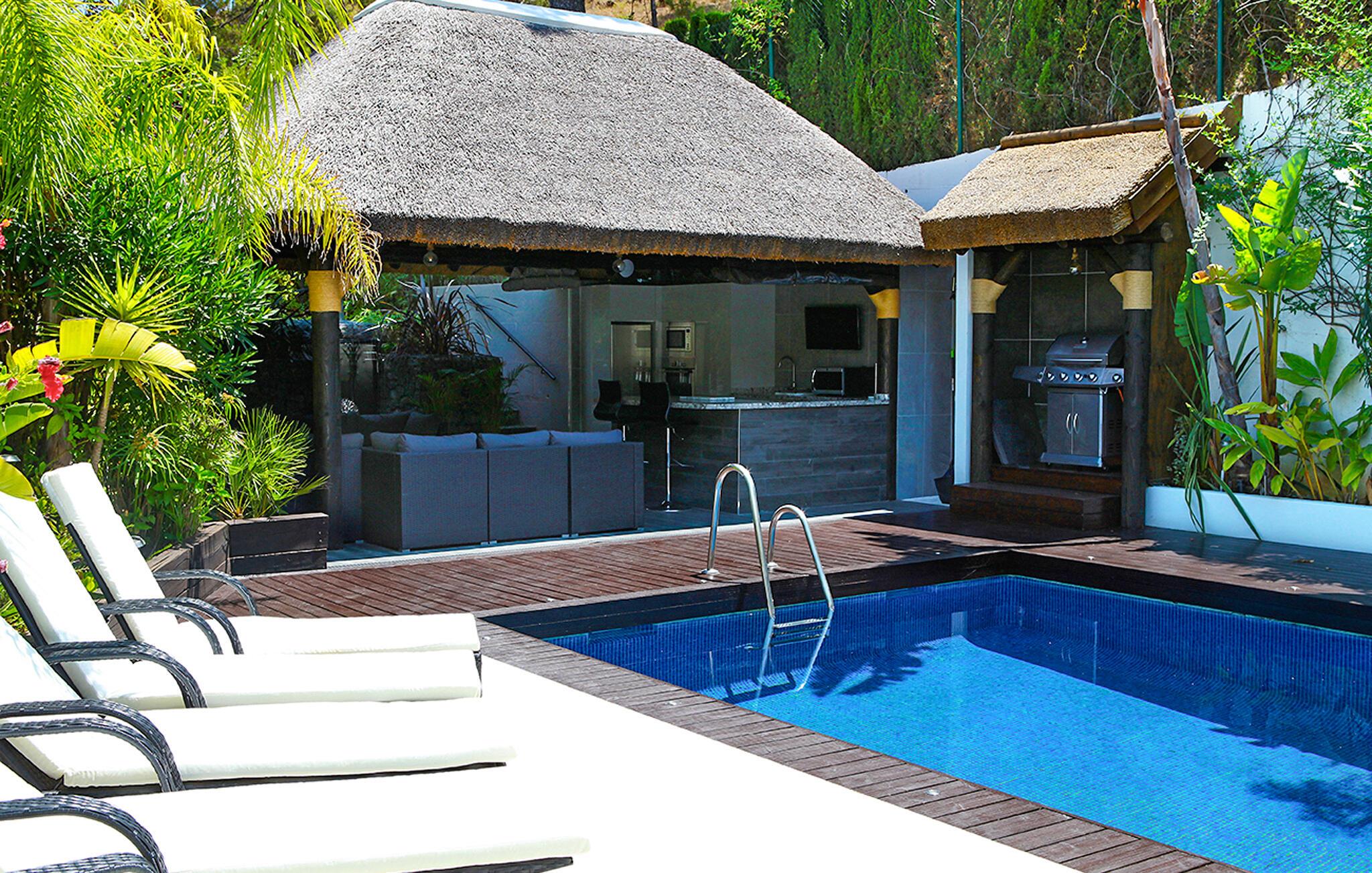 Fra den store terrasse kan I nyde den betagende udsigt over de omkringliggende bakker og slappe af med et glas vin. Svøm i poolen, solbad på de behagelige liggestole og nyd en kølig drink i sommervarmen. Tilbring tid med at være social i det overdækkede udendørsområde, tilbered lækre måltider og nyd middelhavsatmosfæren under palmer og en blå himmel.