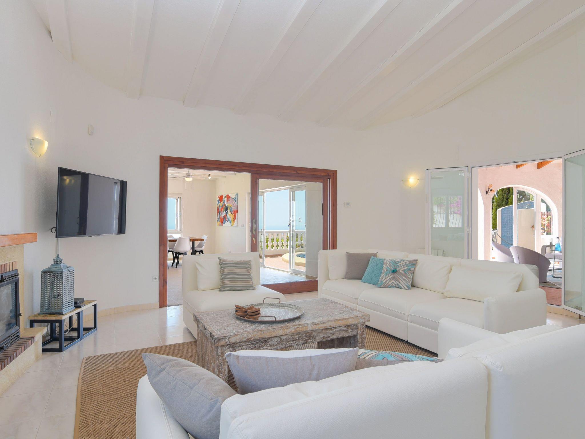 This beautiful villa with a private pool on Cumbre del Sol (Valencia province, Costa Blanca) offers stunning 180-degree views of the Mediterranean Sea! Privacy and tranquility are assured, as no one can see into the house or the ground-floor terrace. There is also a roof terrace (with a lounge area) from which the views are even more spectacular.