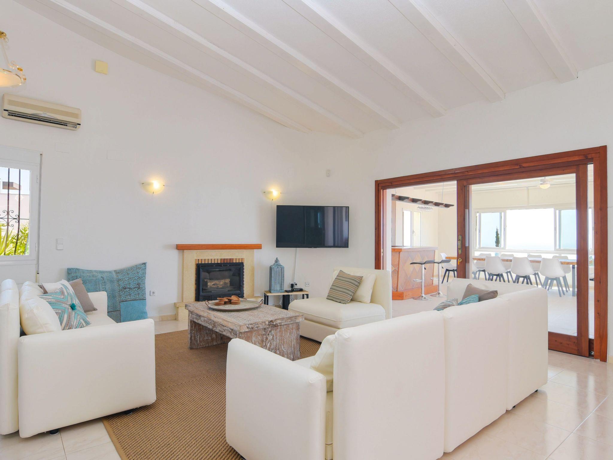 From the dining room, large sliding doors lead out onto the terrace with a private pool and outdoor shower. The terrace also features a traditional Spanish "naya," a covered Spanish patio connected to the house. Here you can relax in the shade in a cozy seating area, while also enjoying stunning views of the pool and sea. There's also a BBQ and a large wooden table in the garden, perfect for al fresco dining.