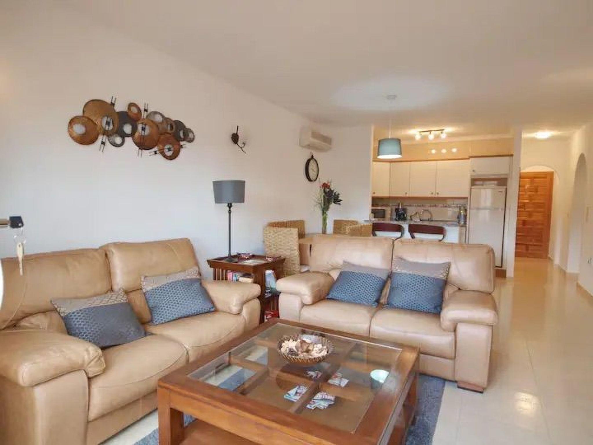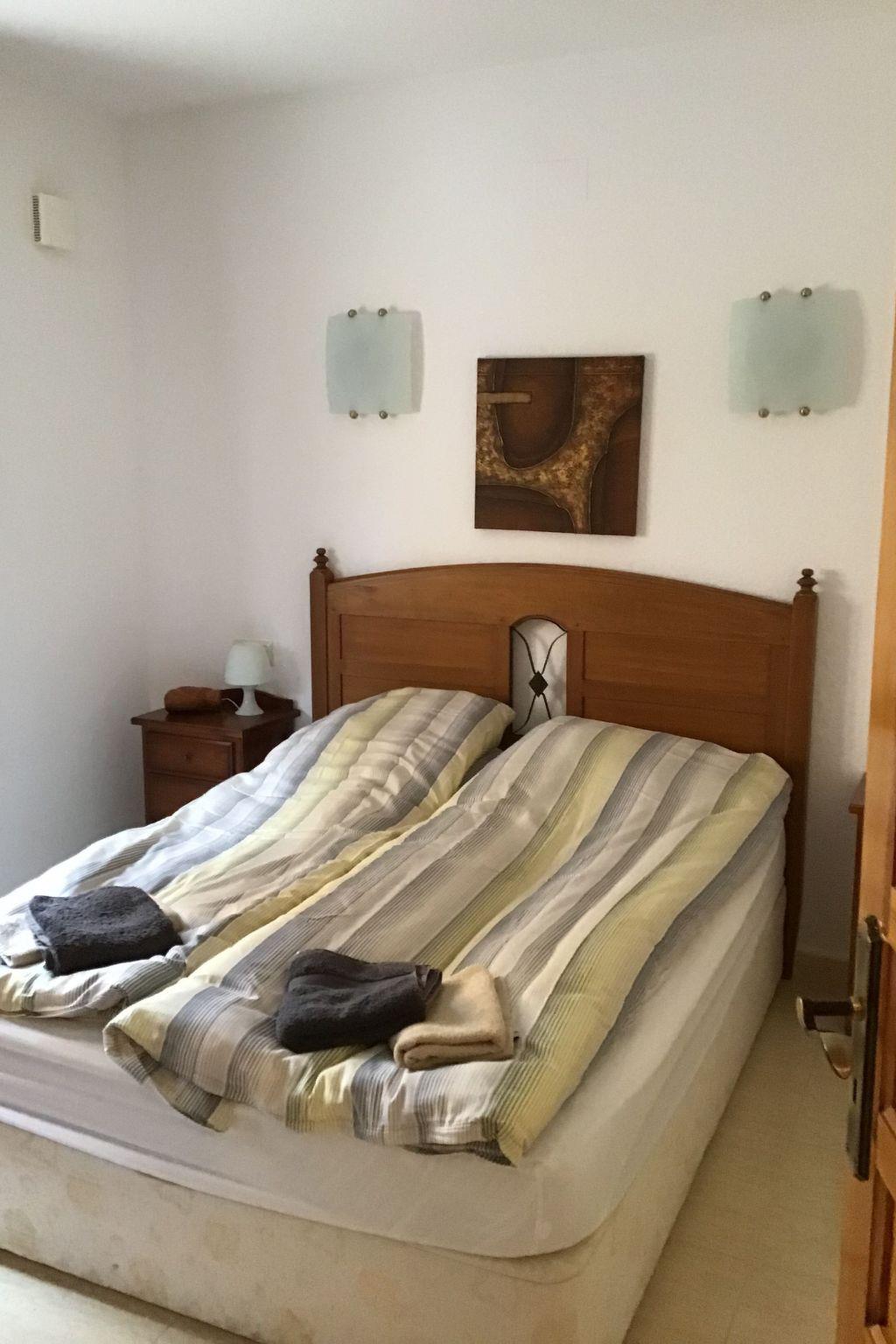 The flat is on 1 level. There are 5 steps up to the front door. Our flat has 3 bedrooms, 2 with double bed, 1 with 2 single beds. Two bathrooms. One with a bathtub and a cupboard containing the washing machine and water tank. The kitchen is in open connection with the living room. In the living room there is a dining table with 6 chairs. In the living area there is a 2 x 2 person leather sofa, coffee table and TV.