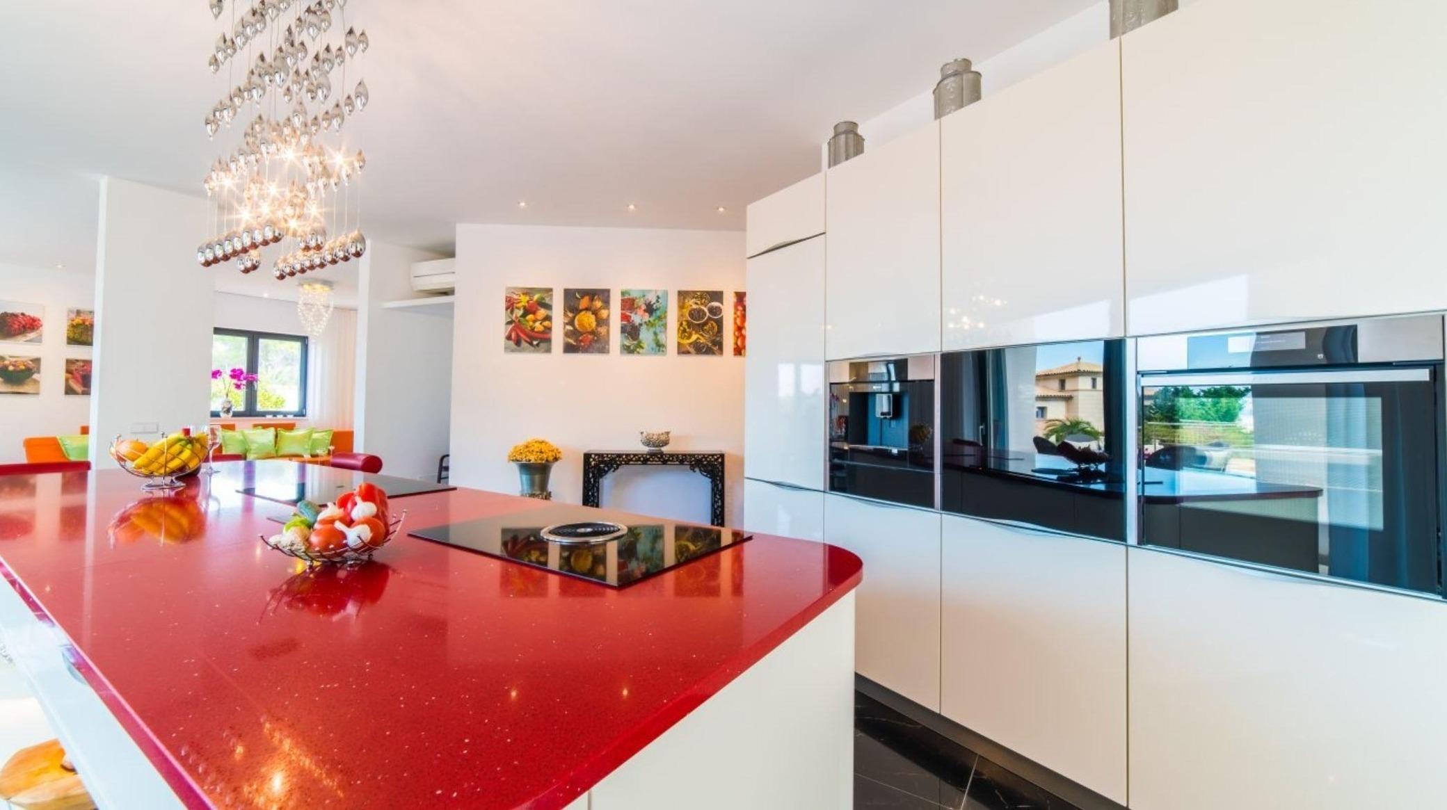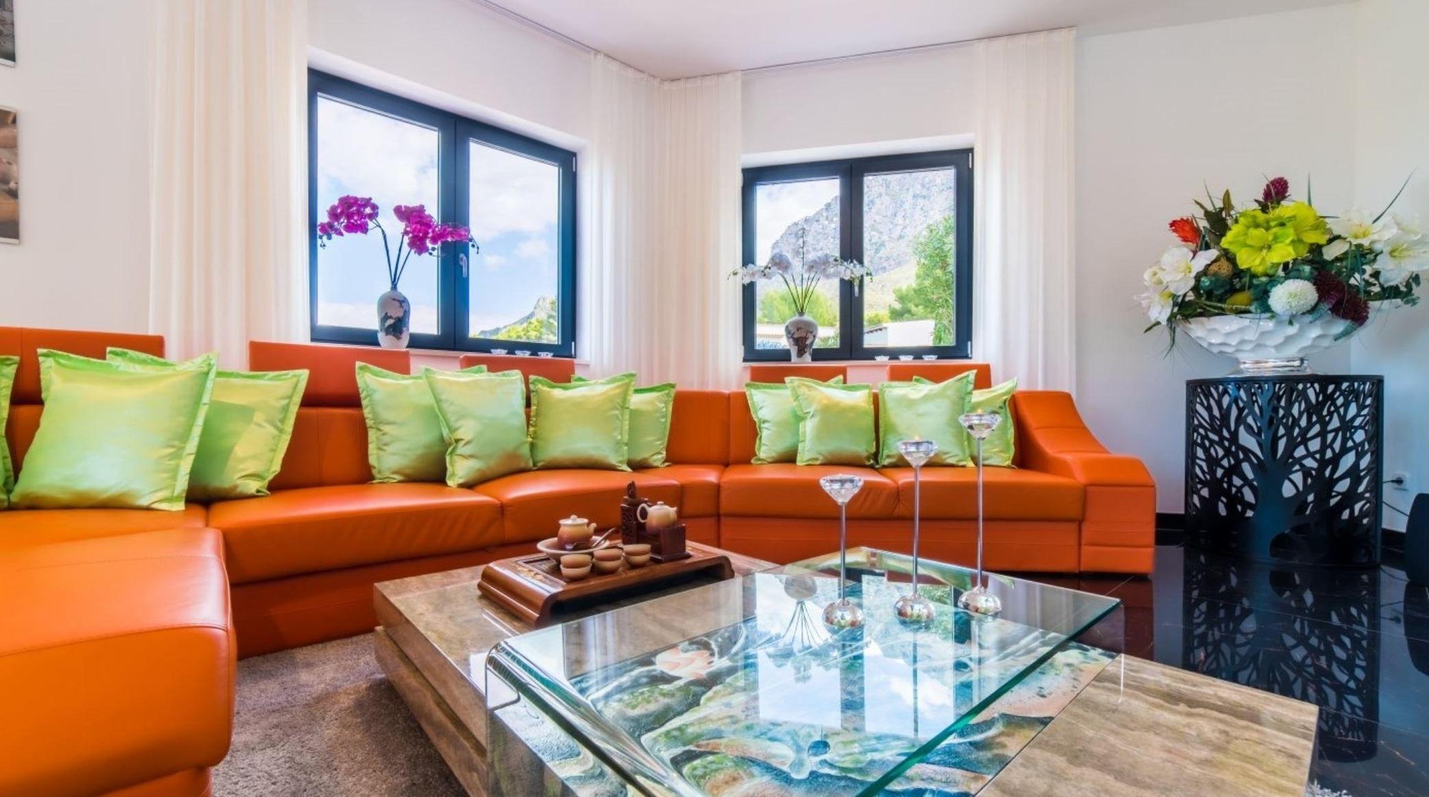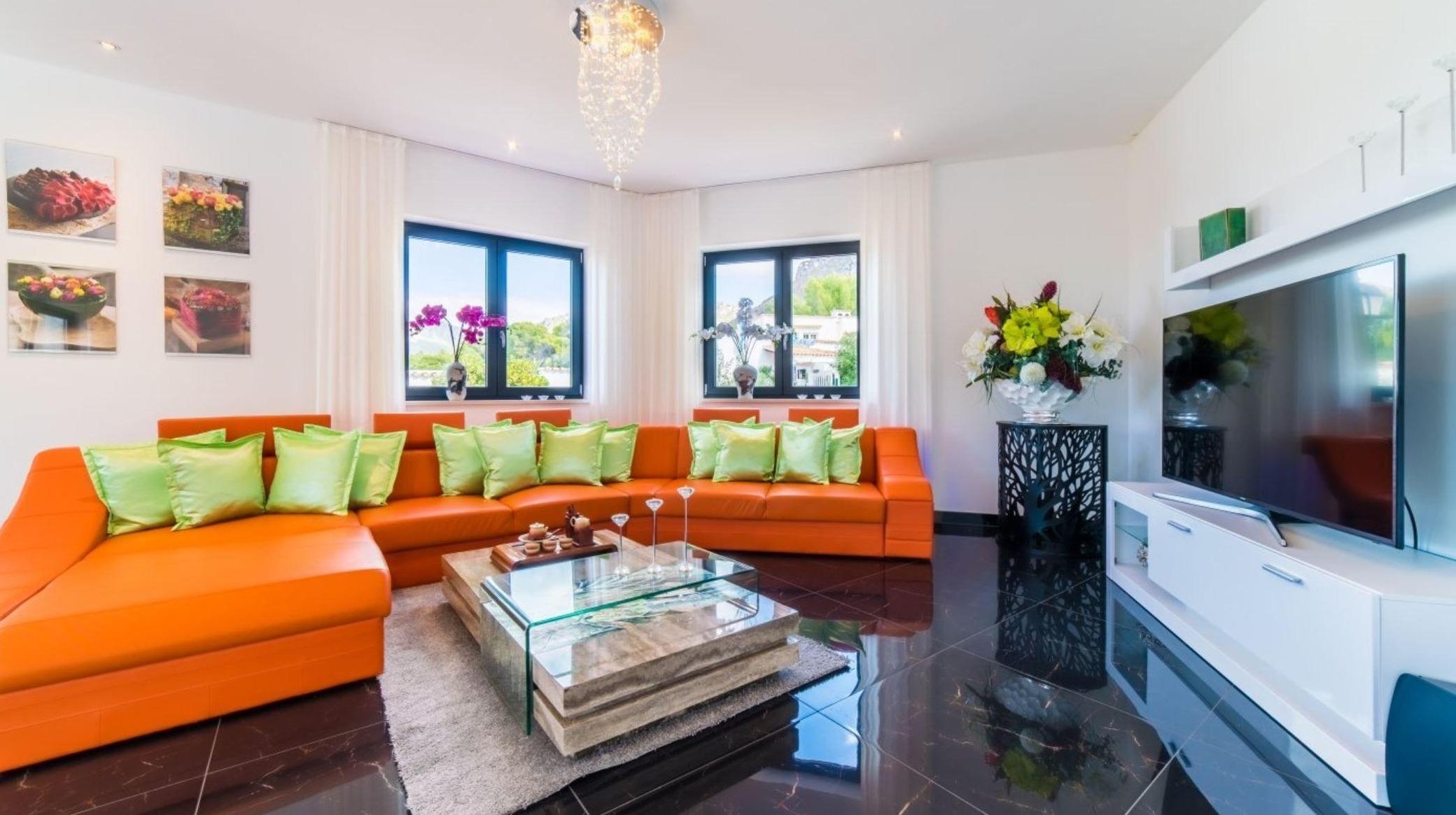 Durch bodentiefe Fenster kann viel Licht in den Wohnbereich fallen. Eine farbenfrohe Gestaltung lässt vom ersten Moment an erkennen, dass jenseits des Gewöhnlichen ein besonderer Wert auf das Kreieren eines einzigartigen Wohngefühls gelegt wurde. Acht Personen finden am großen Esstisch mit Blick auf den Pool gemeinsam Platz. Die riesige Sofalandschaft lädt zum Relaxen und Entspannen ein, während der große Flatscreen-Fernseher hervorragend mit der Raumgestaltung harmoniert.