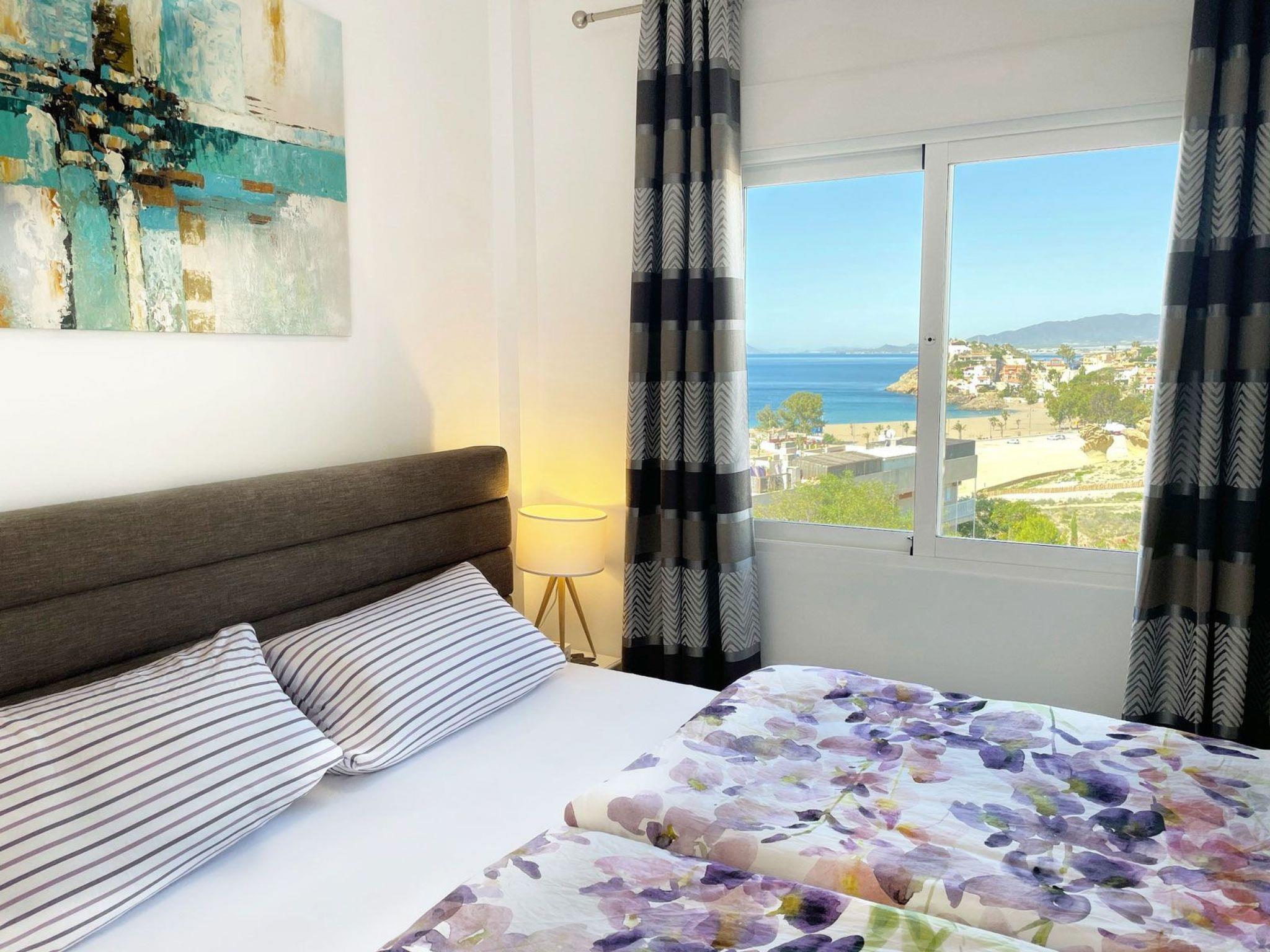 From the newly renovated flat Sophie you have a breathtaking view of the sea, the beach and the Gredas of Bolnuevo. The fully air-conditioned flat, which can be heated by a heat exchanger, is divided into a bright living room with dining area (sea view), 2 bedrooms (one with sea view), a fully equipped kitchen with separate storage room and bathroom. The beach is 180 metres away and in the summer months there is also a communal pool for swimming.