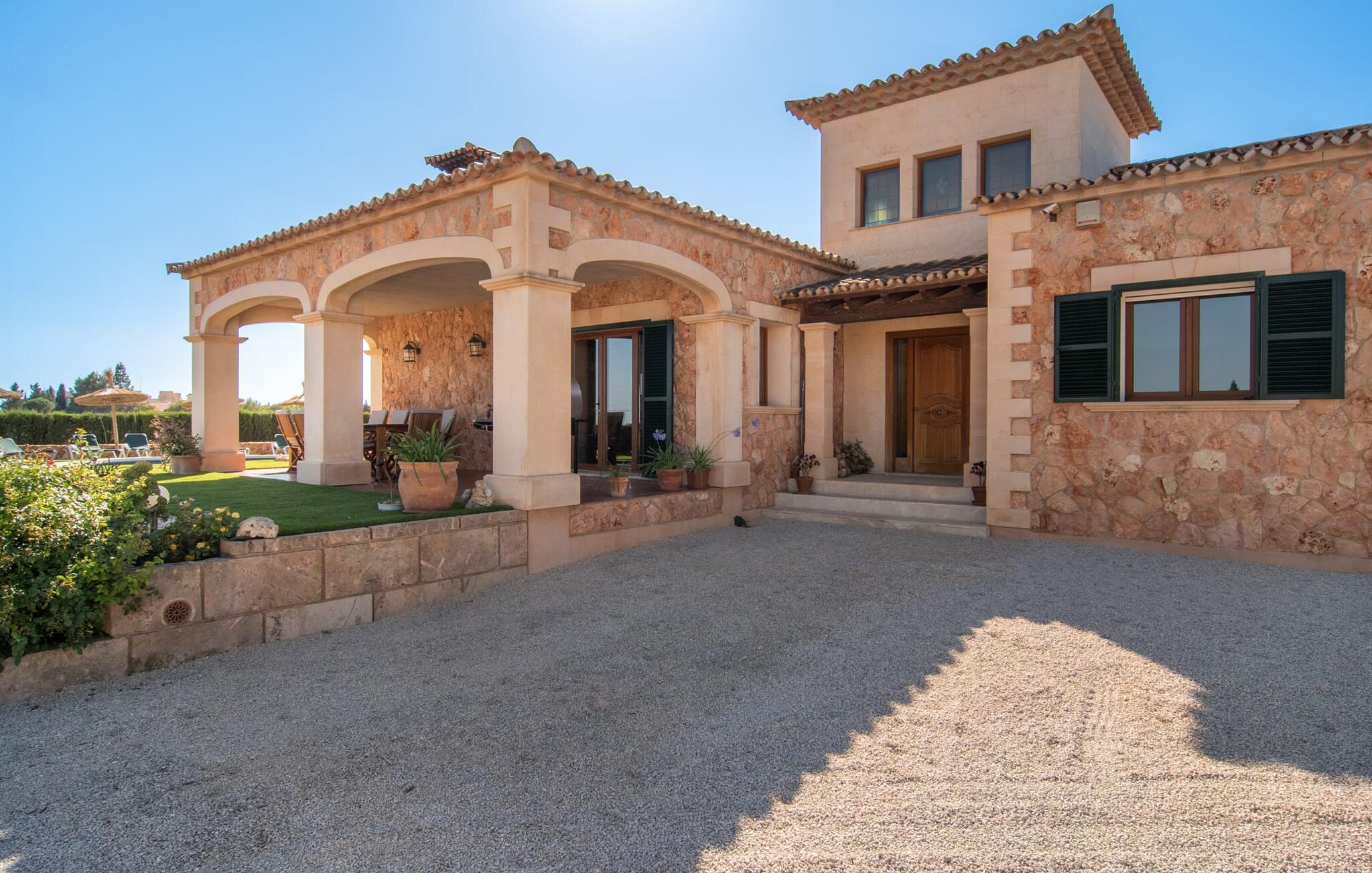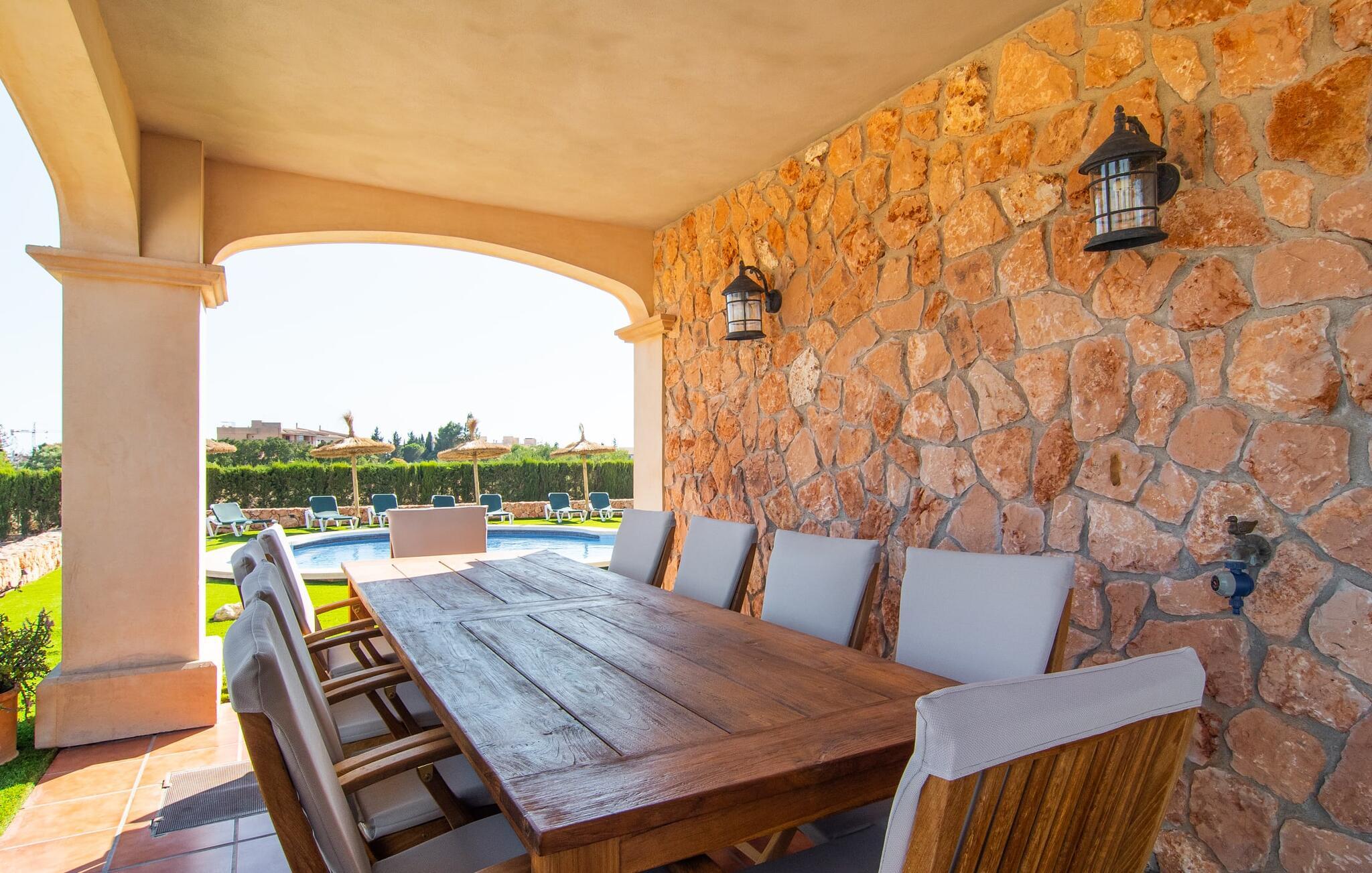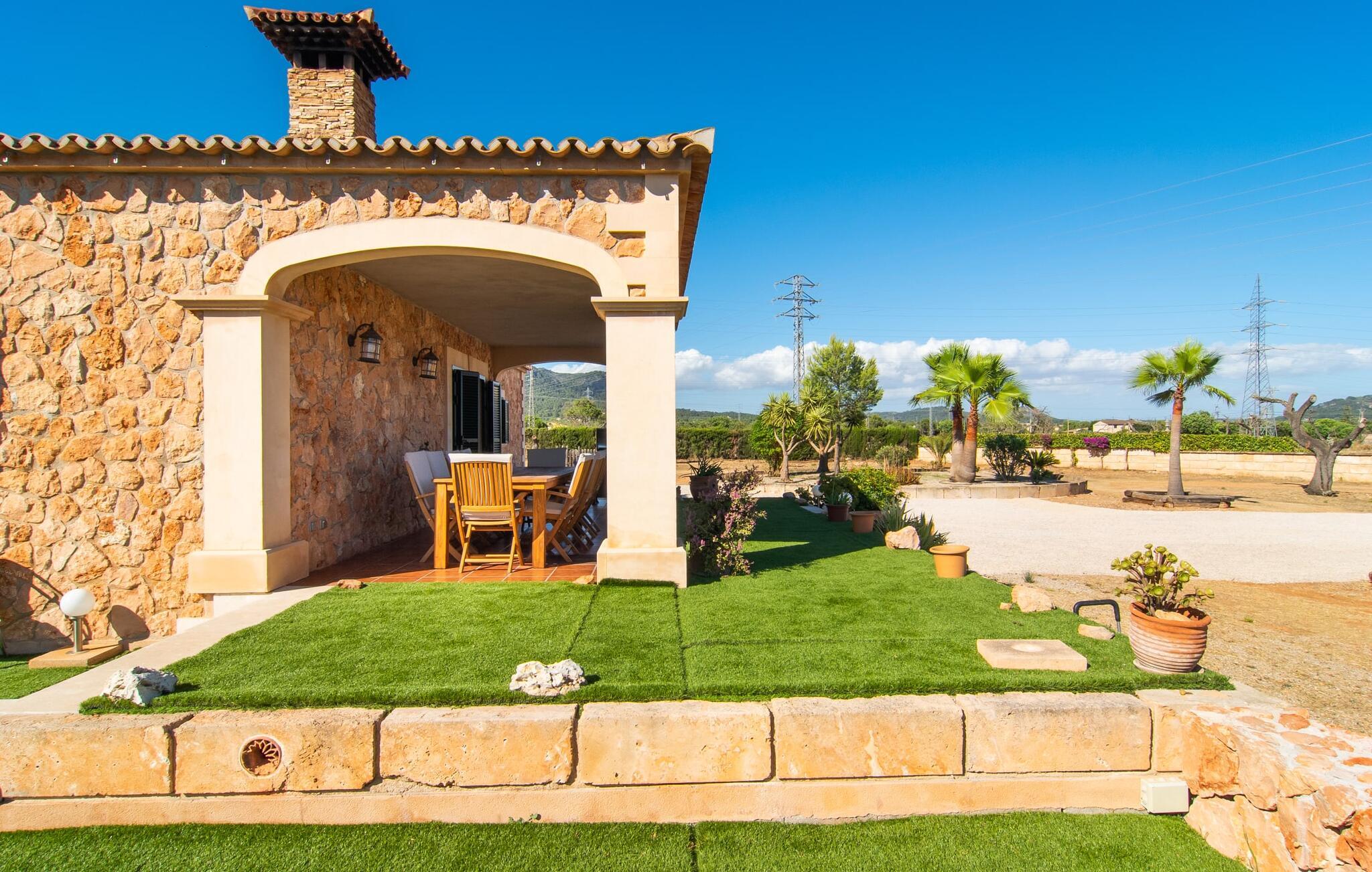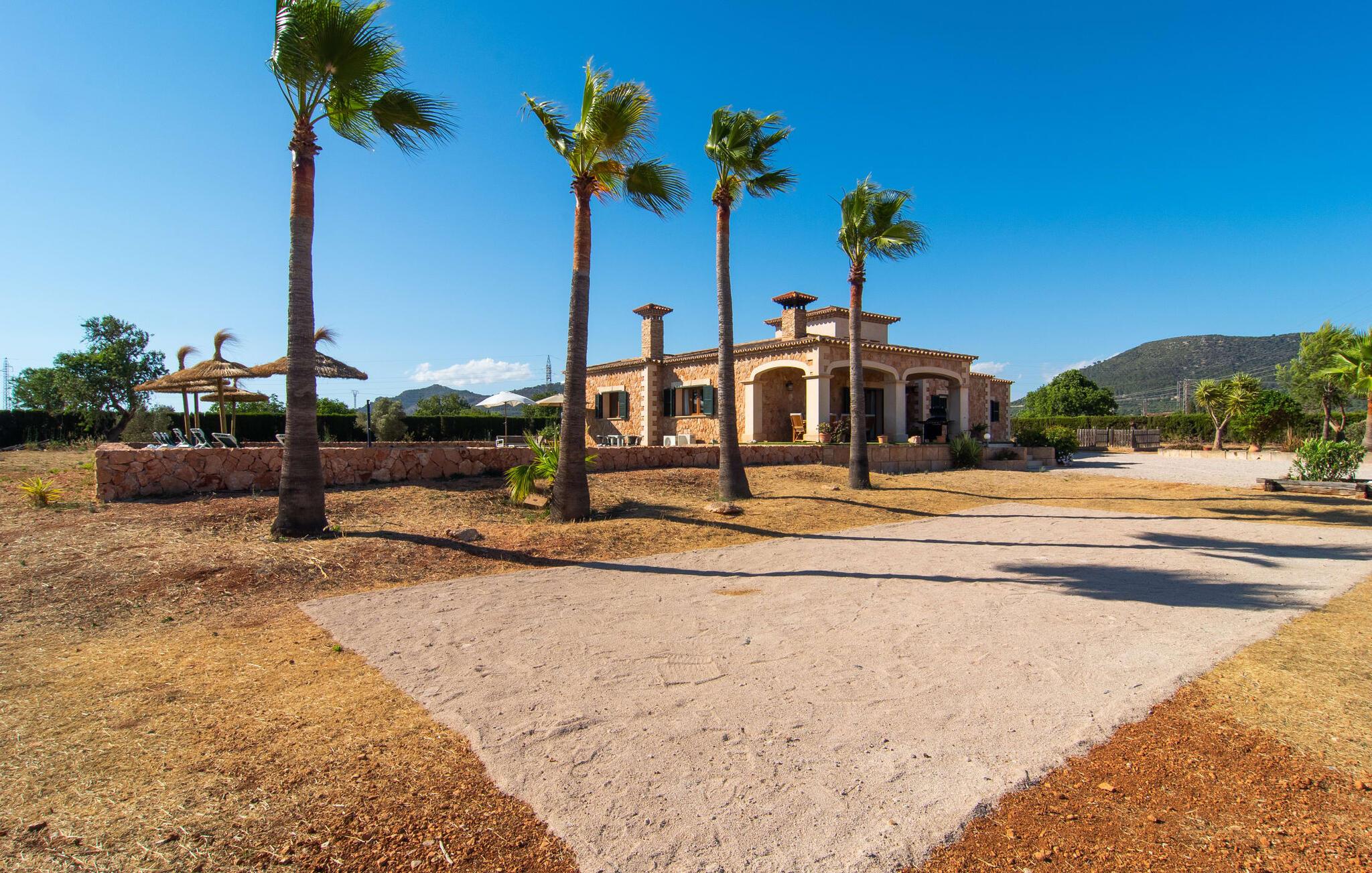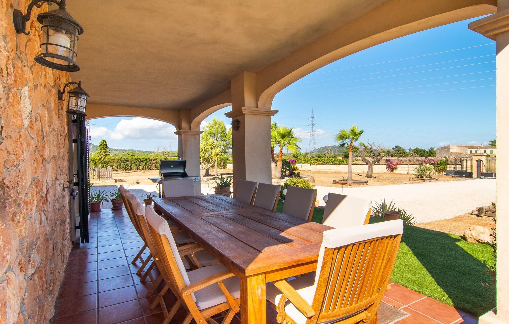 "Bouganville Resort" er en rummelig naturstensfinca nær Llucmajor i det maleriske sydlige Mallorca. Dette feriehus kan rumme op til ti gæster, hvilket gør det ideelt for familier, der rejser sammen. Den store have har høje palmer og masser af græsplæne, hvor børn kan lege, mens voksne kan slappe af på den overdækkede terrasse. En central attraktion er den runde pool med et lavvandet område, hvor små børn trygt kan more sig. Gæsterne kan slappe af på liggestolene ved poolen eller læse under en parasol. Der er praktisk parkering på en grusplads ved siden af huset. Fincaens indre kombinerer traditionel rustik charme med moderne komfort og er præget af venlige farver, mørke træaccenter og klinkegulve. Alle værelser er på ét plan, hvilket giver nem adgang for familier med små børn. Den indbydende indgang fører til et stort åbent opholds- og spiseområde, møbleret med en behagelig sofa, tv og pejs til køligere dage, samt et langt spisebord til familiemåltider. En skydedør adskiller dette værelse fra et veludstyret køkken. Ejendommen består af fem soveværelser med dobbeltsenge og tre stilfulde badeværelser, hvoraf det ene er en suite. Fincaen "Bouganville Resort" ligger kun få minutters kørsel fra den landlige by Llucmajor på det sydlige Mallorca. Der kan I nemt gøre jeres indkøb og slentre gennem det ugentlige marked. Playa S'Arenal er kun omkring 18 km væk med lejebil, andre smukke strande er omkring 20 km væk.