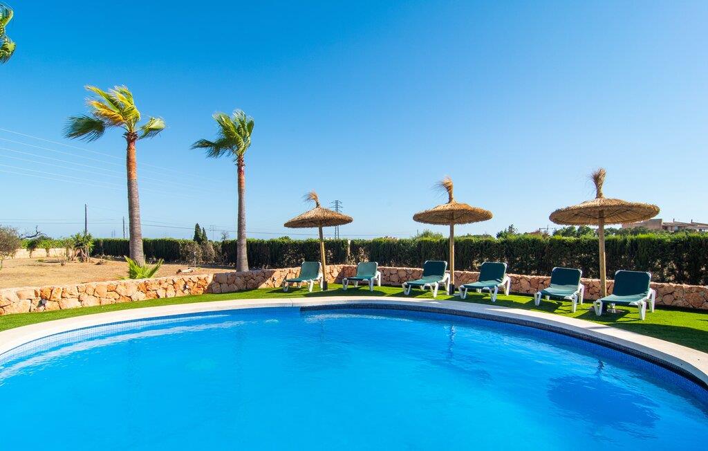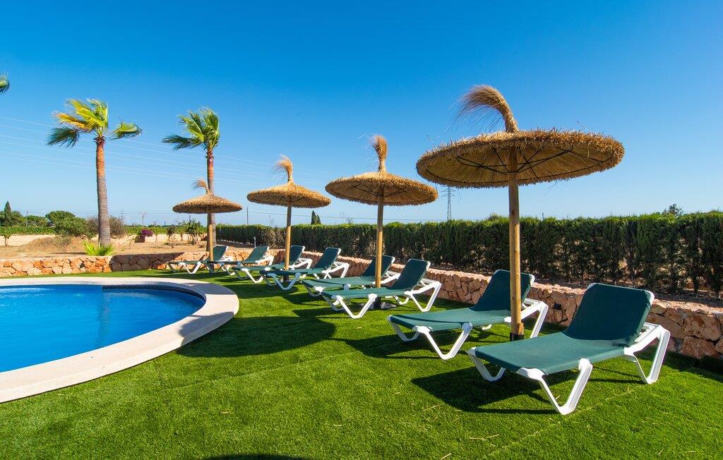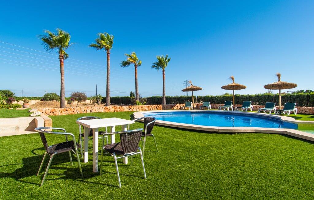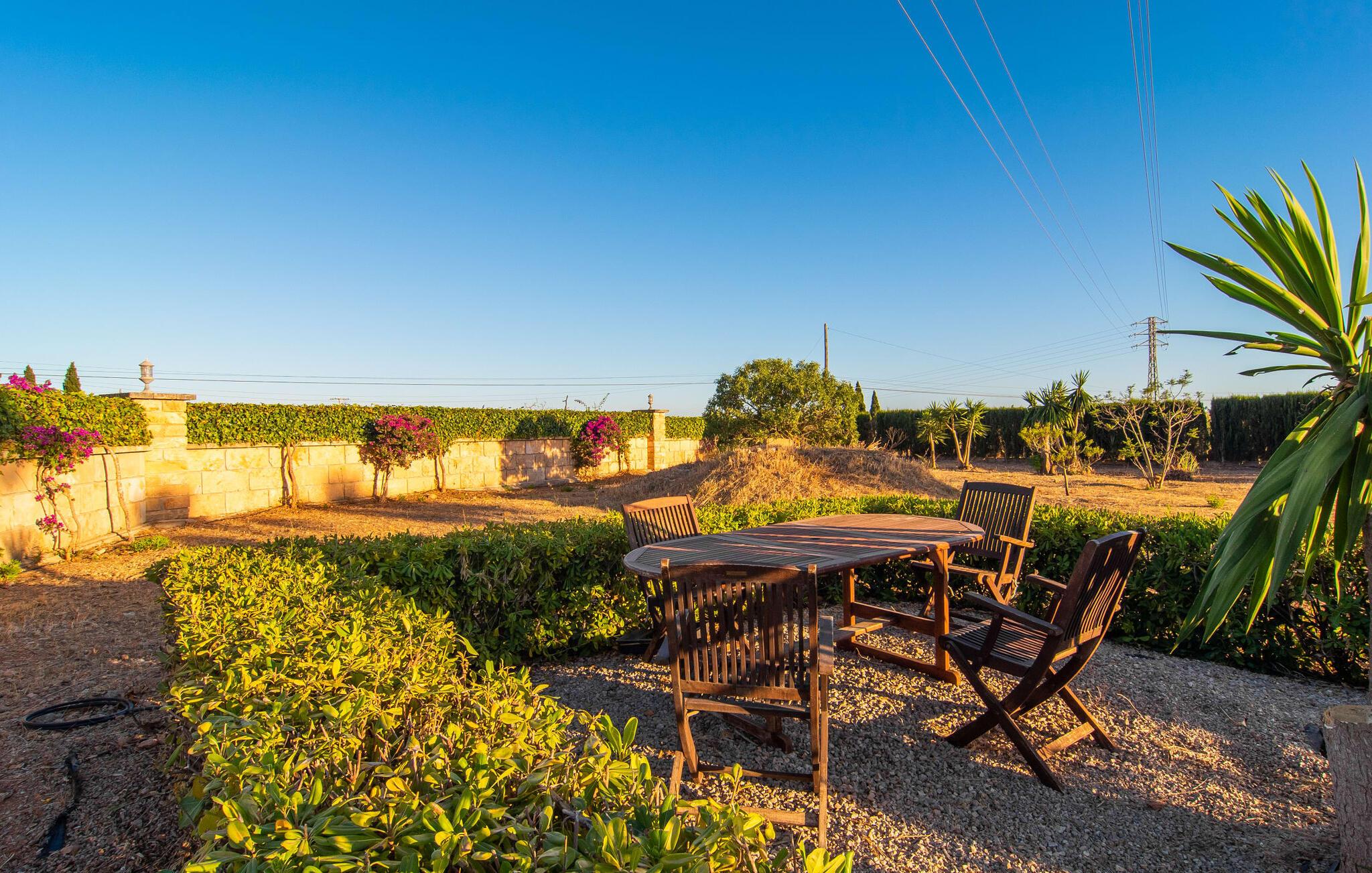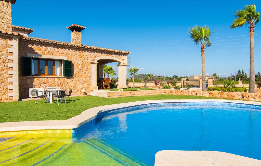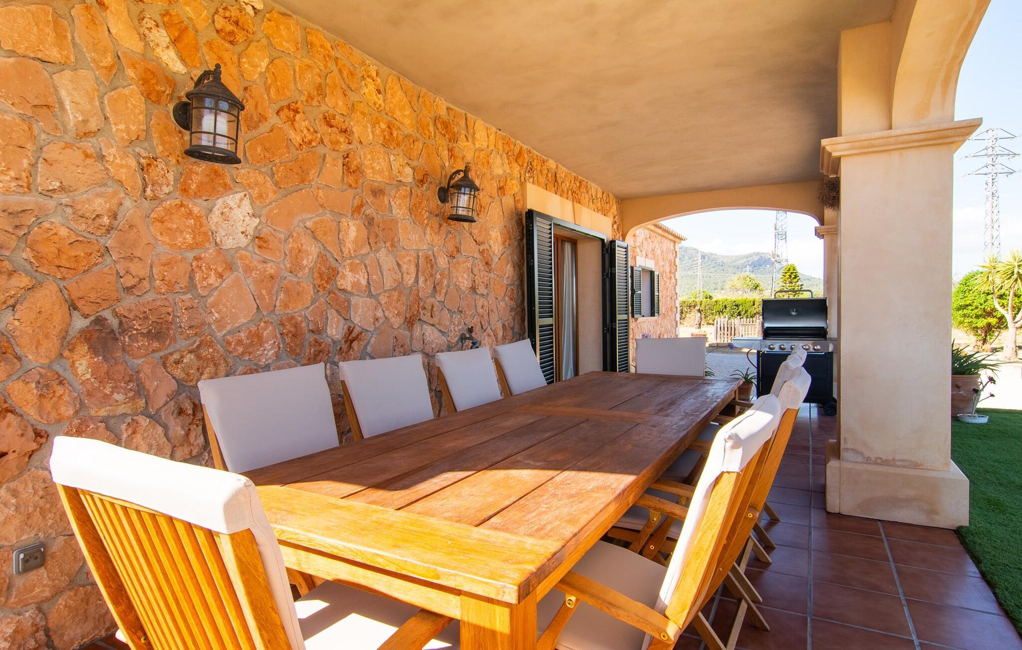 "Bouganville Resort" er en rummelig naturstensfinca nær Llucmajor i det maleriske sydlige Mallorca. Dette feriehus kan rumme op til ti gæster, hvilket gør det ideelt for familier, der rejser sammen. Den store have har høje palmer og masser af græsplæne, hvor børn kan lege, mens voksne kan slappe af på den overdækkede terrasse. En central attraktion er den runde pool med et lavvandet område, hvor små børn trygt kan more sig. Gæsterne kan slappe af på liggestolene ved poolen eller læse under en parasol. Der er praktisk parkering på en grusplads ved siden af huset. Fincaens indre kombinerer traditionel rustik charme med moderne komfort og er præget af venlige farver, mørke træaccenter og klinkegulve. Alle værelser er på ét plan, hvilket giver nem adgang for familier med små børn. Den indbydende indgang fører til et stort åbent opholds- og spiseområde, møbleret med en behagelig sofa, tv og pejs til køligere dage, samt et langt spisebord til familiemåltider. En skydedør adskiller dette værelse fra et veludstyret køkken. Ejendommen består af fem soveværelser med dobbeltsenge og tre stilfulde badeværelser, hvoraf det ene er en suite. Fincaen "Bouganville Resort" ligger kun få minutters kørsel fra den landlige by Llucmajor på det sydlige Mallorca. Der kan I nemt gøre jeres indkøb og slentre gennem det ugentlige marked. Playa S'Arenal er kun omkring 18 km væk med lejebil, andre smukke strande er omkring 20 km væk.