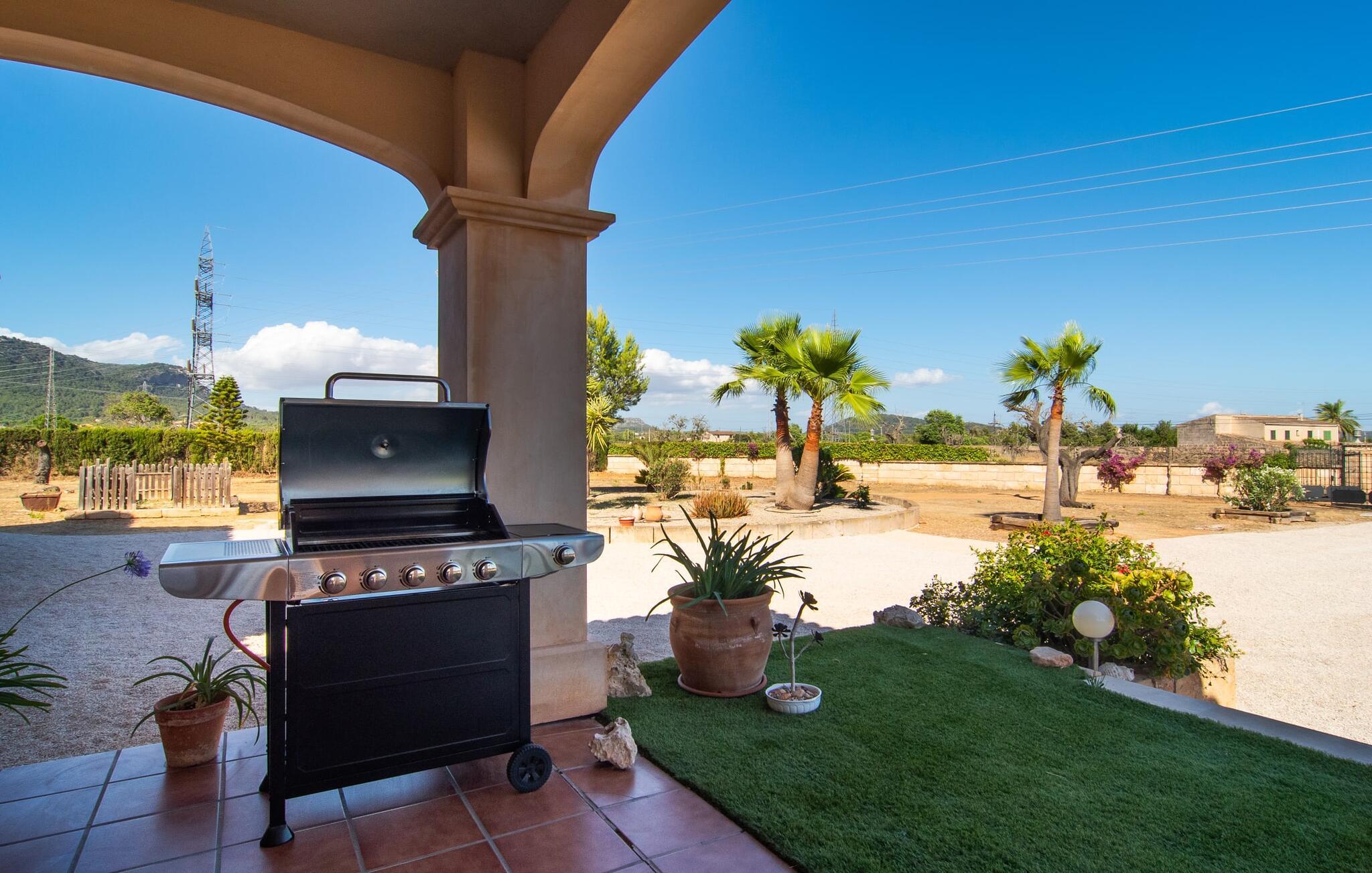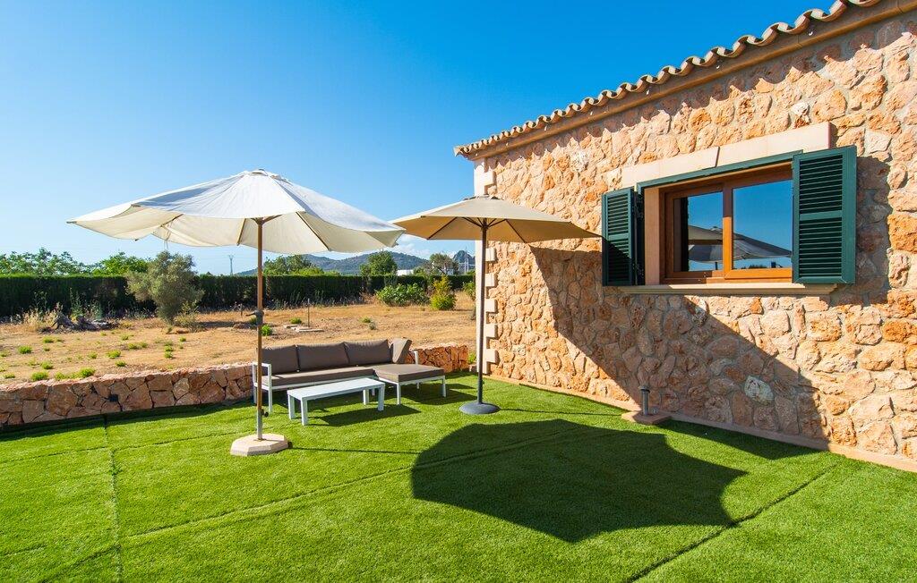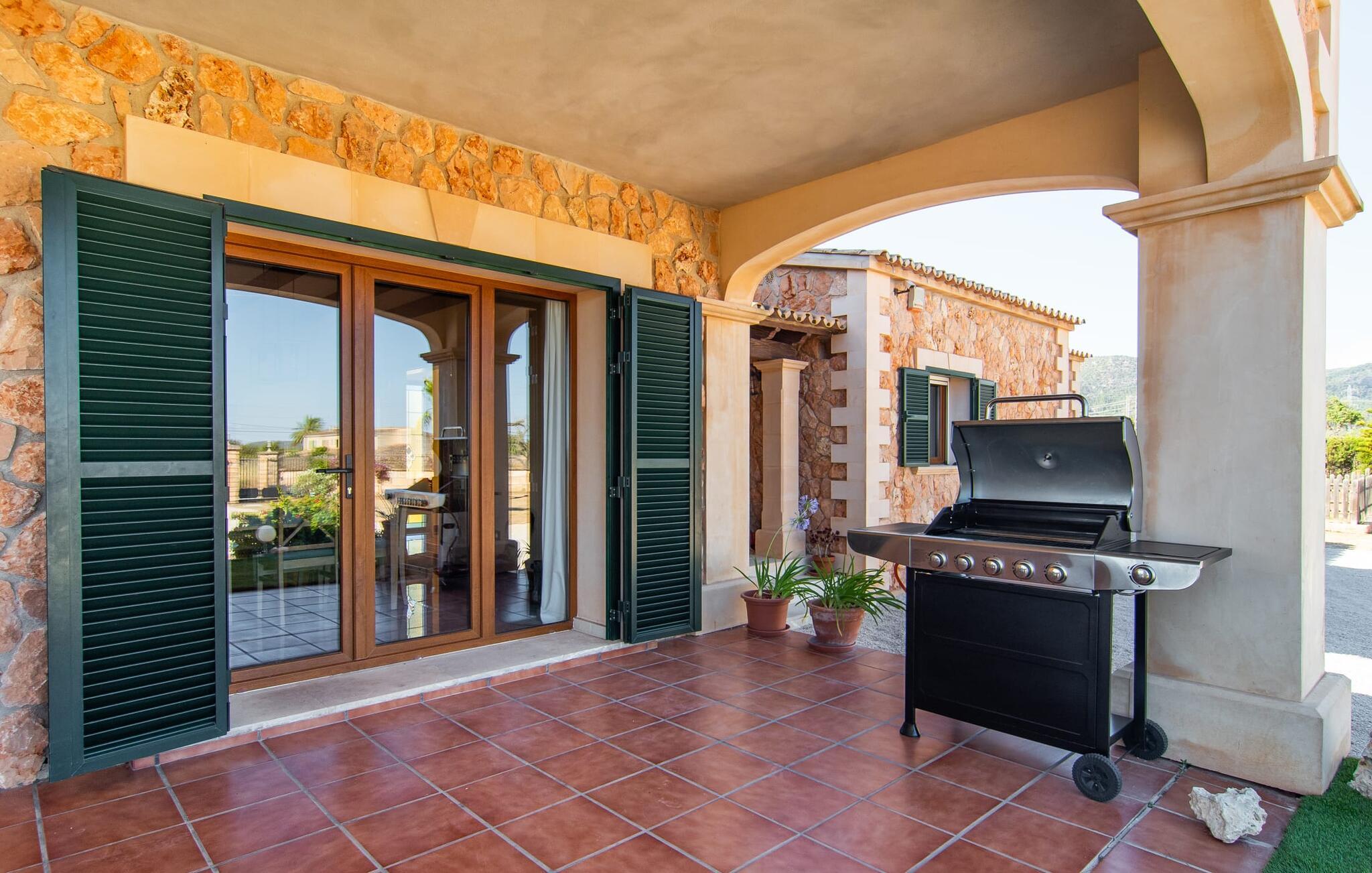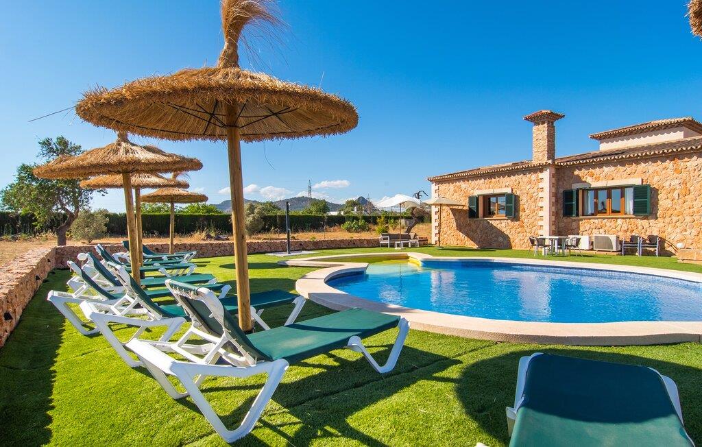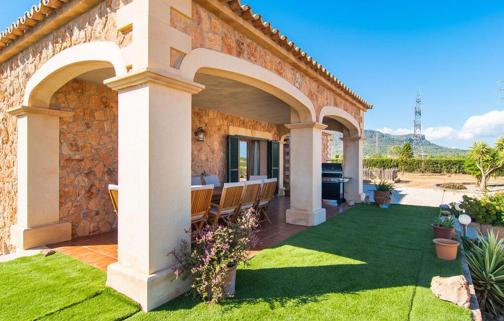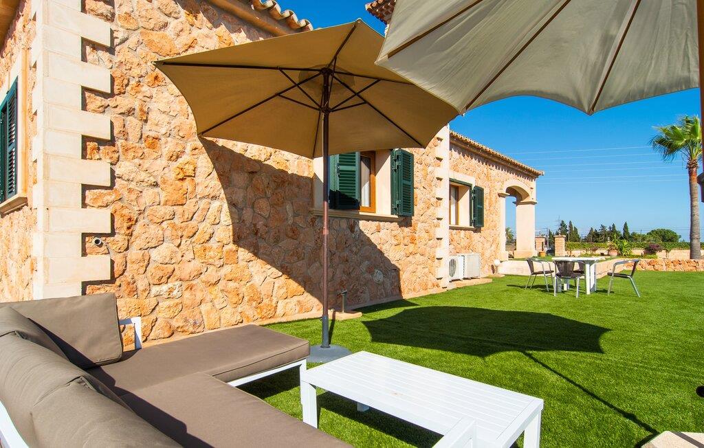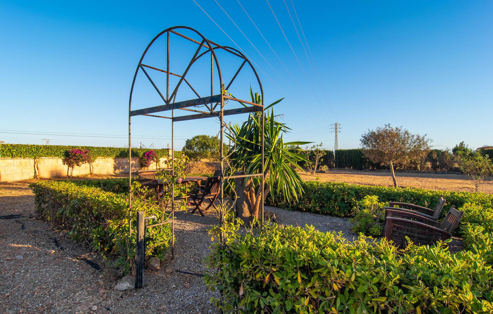"Bouganville Resort" er en rummelig naturstensfinca nær Llucmajor i det maleriske sydlige Mallorca. Dette feriehus kan rumme op til ti gæster, hvilket gør det ideelt for familier, der rejser sammen. Den store have har høje palmer og masser af græsplæne, hvor børn kan lege, mens voksne kan slappe af på den overdækkede terrasse. En central attraktion er den runde pool med et lavvandet område, hvor små børn trygt kan more sig. Gæsterne kan slappe af på liggestolene ved poolen eller læse under en parasol. Der er praktisk parkering på en grusplads ved siden af huset. Fincaens indre kombinerer traditionel rustik charme med moderne komfort og er præget af venlige farver, mørke træaccenter og klinkegulve. Alle værelser er på ét plan, hvilket giver nem adgang for familier med små børn. Den indbydende indgang fører til et stort åbent opholds- og spiseområde, møbleret med en behagelig sofa, tv og pejs til køligere dage, samt et langt spisebord til familiemåltider. En skydedør adskiller dette værelse fra et veludstyret køkken. Ejendommen består af fem soveværelser med dobbeltsenge og tre stilfulde badeværelser, hvoraf det ene er en suite. Fincaen "Bouganville Resort" ligger kun få minutters kørsel fra den landlige by Llucmajor på det sydlige Mallorca. Der kan I nemt gøre jeres indkøb og slentre gennem det ugentlige marked. Playa S'Arenal er kun omkring 18 km væk med lejebil, andre smukke strande er omkring 20 km væk.