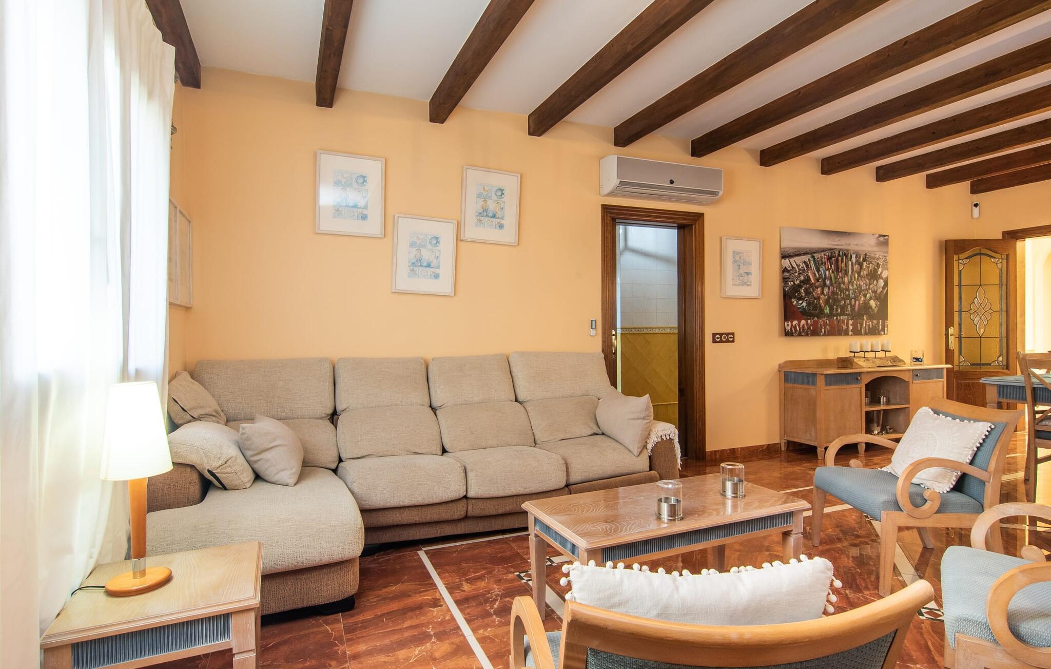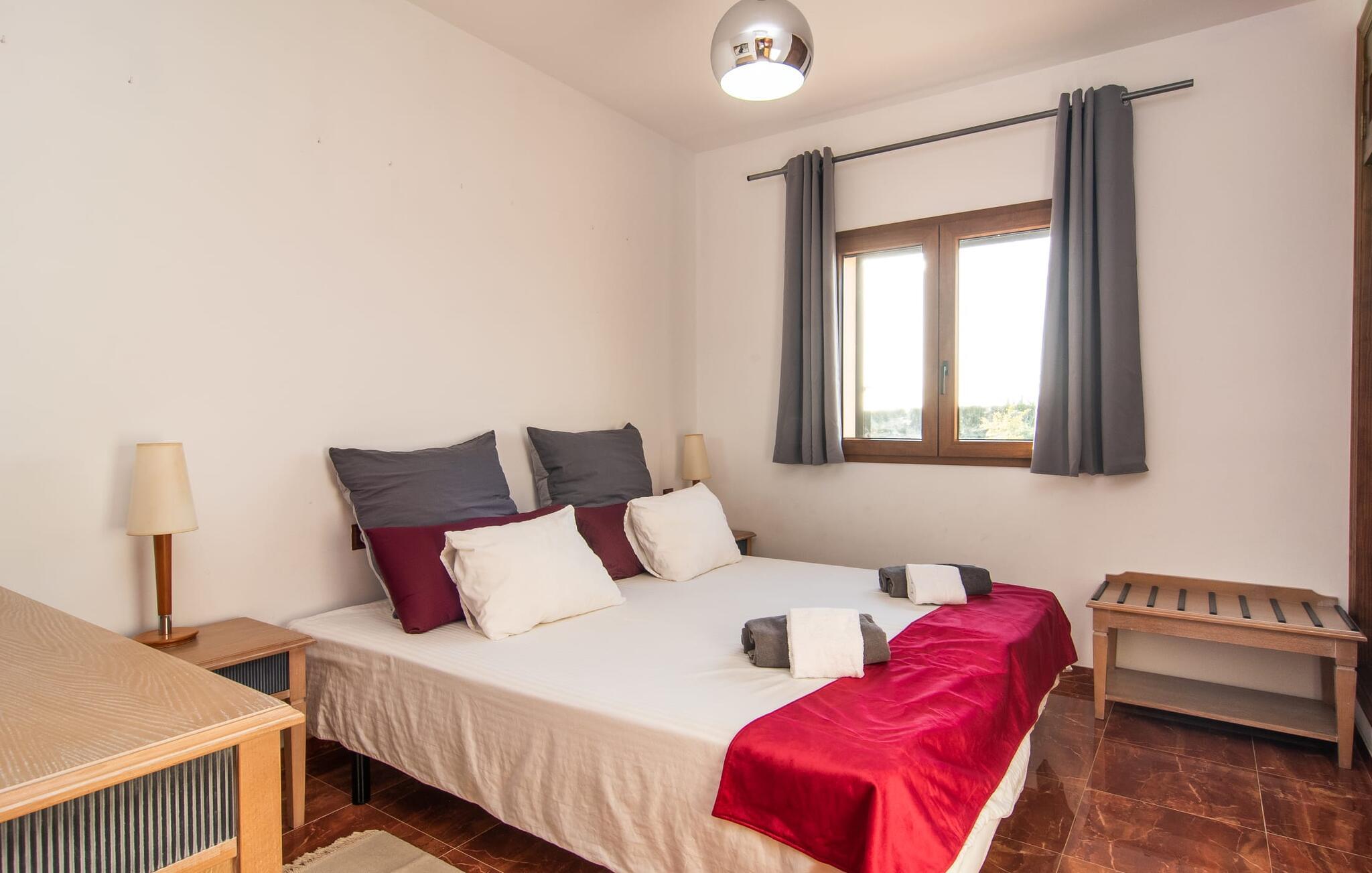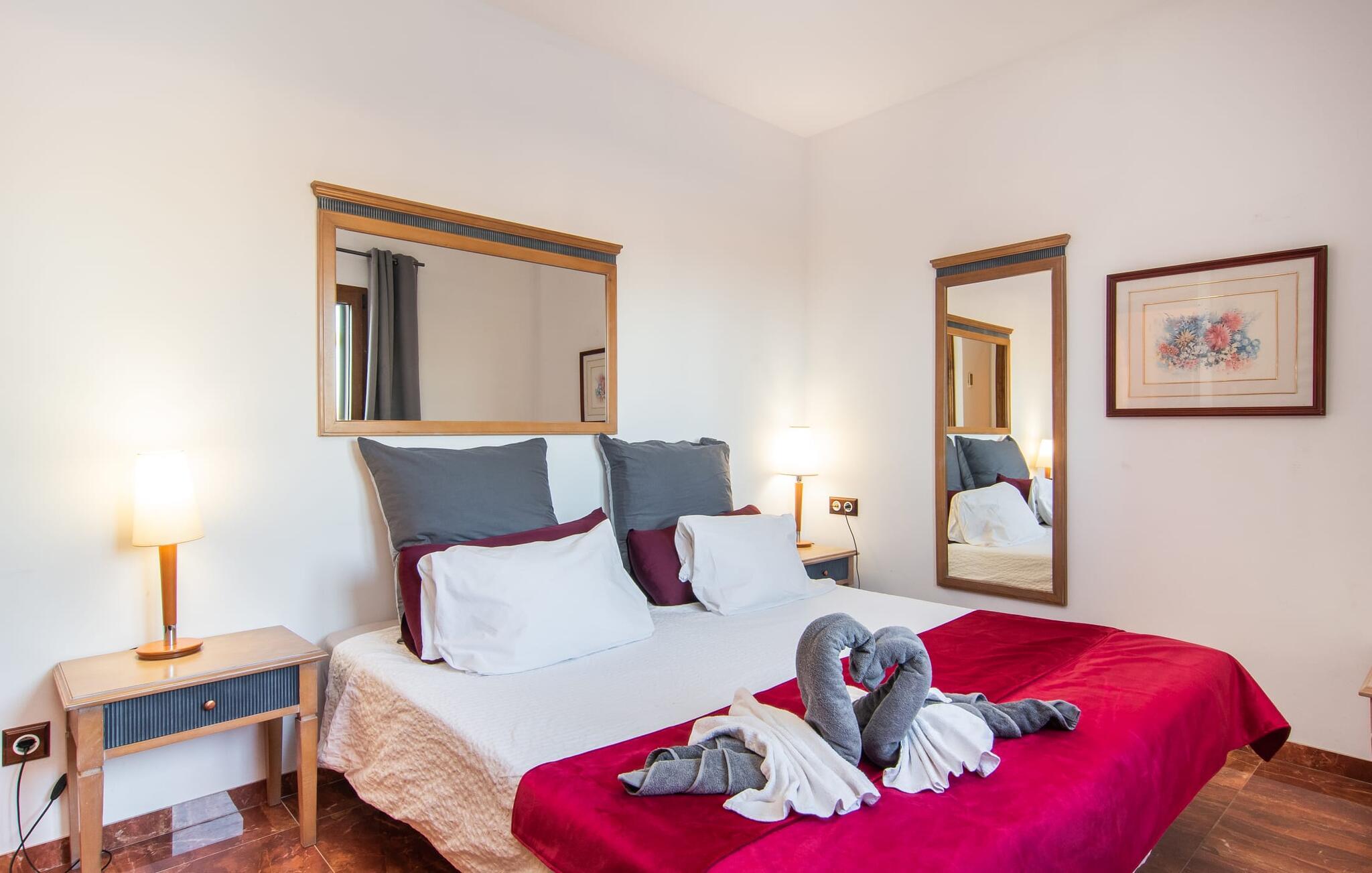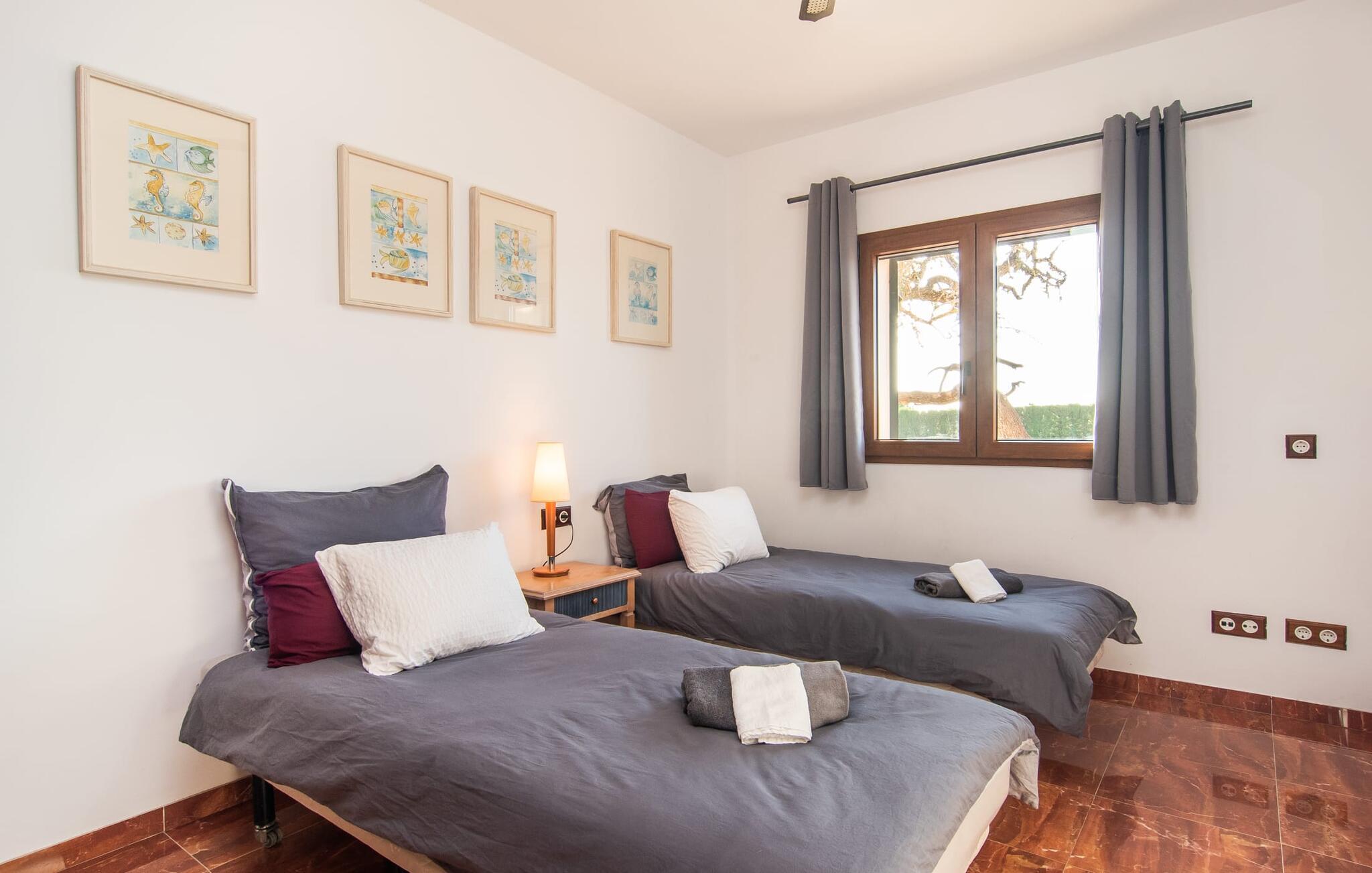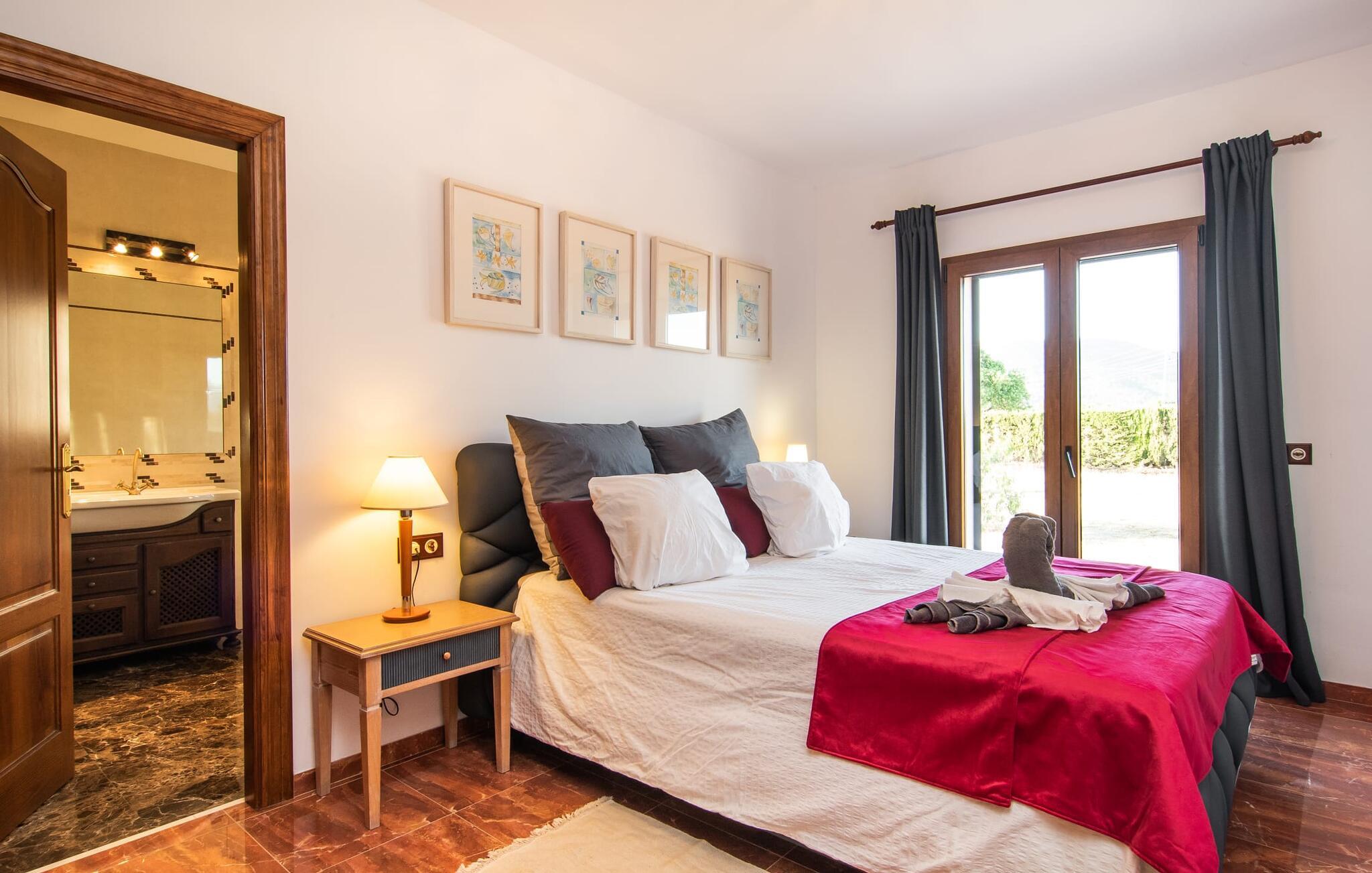 "Bouganville Resort" er en rummelig naturstensfinca nær Llucmajor i det maleriske sydlige Mallorca. Dette feriehus kan rumme op til ti gæster, hvilket gør det ideelt for familier, der rejser sammen. Den store have har høje palmer og masser af græsplæne, hvor børn kan lege, mens voksne kan slappe af på den overdækkede terrasse. En central attraktion er den runde pool med et lavvandet område, hvor små børn trygt kan more sig. Gæsterne kan slappe af på liggestolene ved poolen eller læse under en parasol. Der er praktisk parkering på en grusplads ved siden af huset. Fincaens indre kombinerer traditionel rustik charme med moderne komfort og er præget af venlige farver, mørke træaccenter og klinkegulve. Alle værelser er på ét plan, hvilket giver nem adgang for familier med små børn. Den indbydende indgang fører til et stort åbent opholds- og spiseområde, møbleret med en behagelig sofa, tv og pejs til køligere dage, samt et langt spisebord til familiemåltider. En skydedør adskiller dette værelse fra et veludstyret køkken. Ejendommen består af fem soveværelser med dobbeltsenge og tre stilfulde badeværelser, hvoraf det ene er en suite. Fincaen "Bouganville Resort" ligger kun få minutters kørsel fra den landlige by Llucmajor på det sydlige Mallorca. Der kan I nemt gøre jeres indkøb og slentre gennem det ugentlige marked. Playa S'Arenal er kun omkring 18 km væk med lejebil, andre smukke strande er omkring 20 km væk.