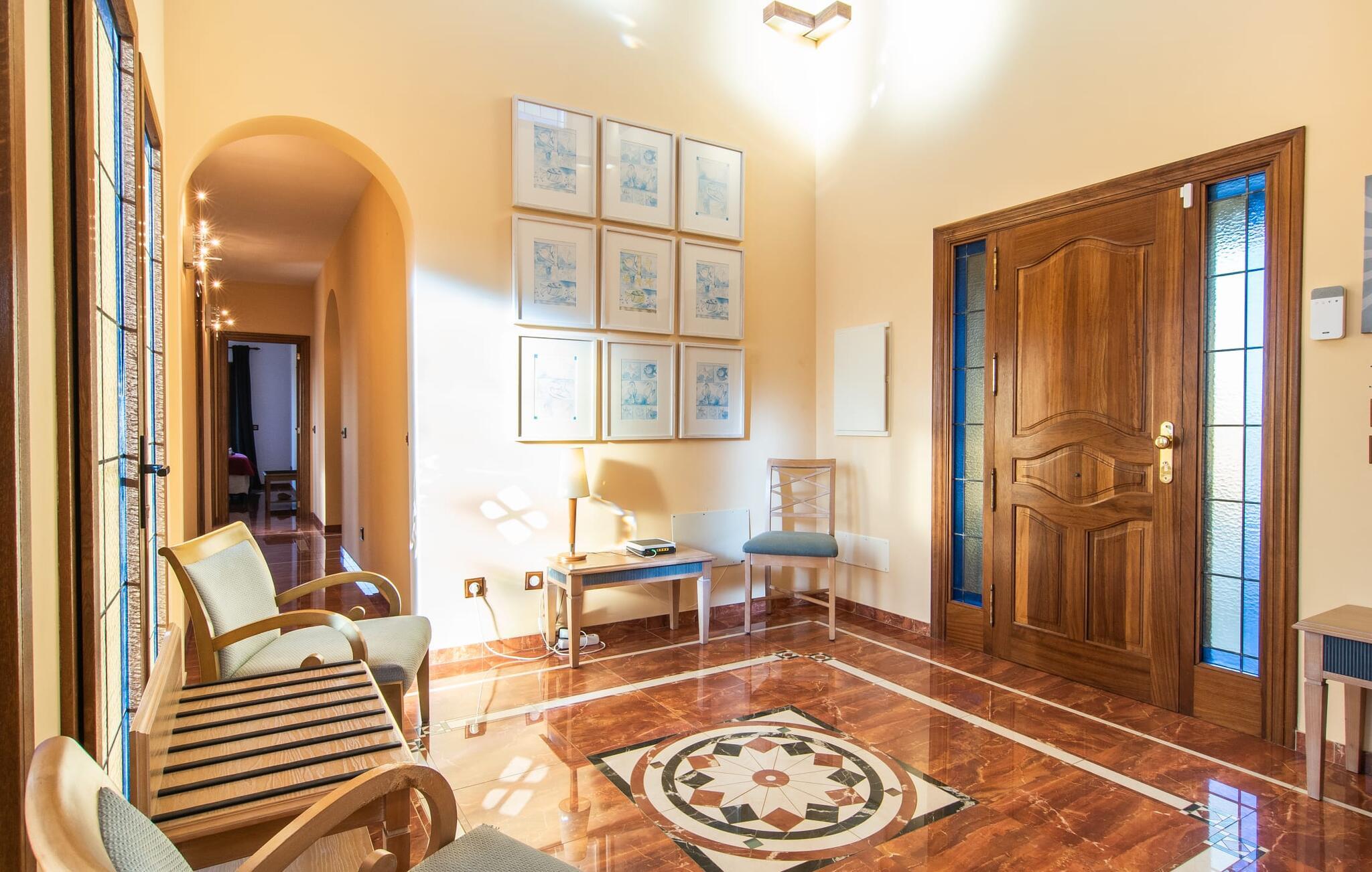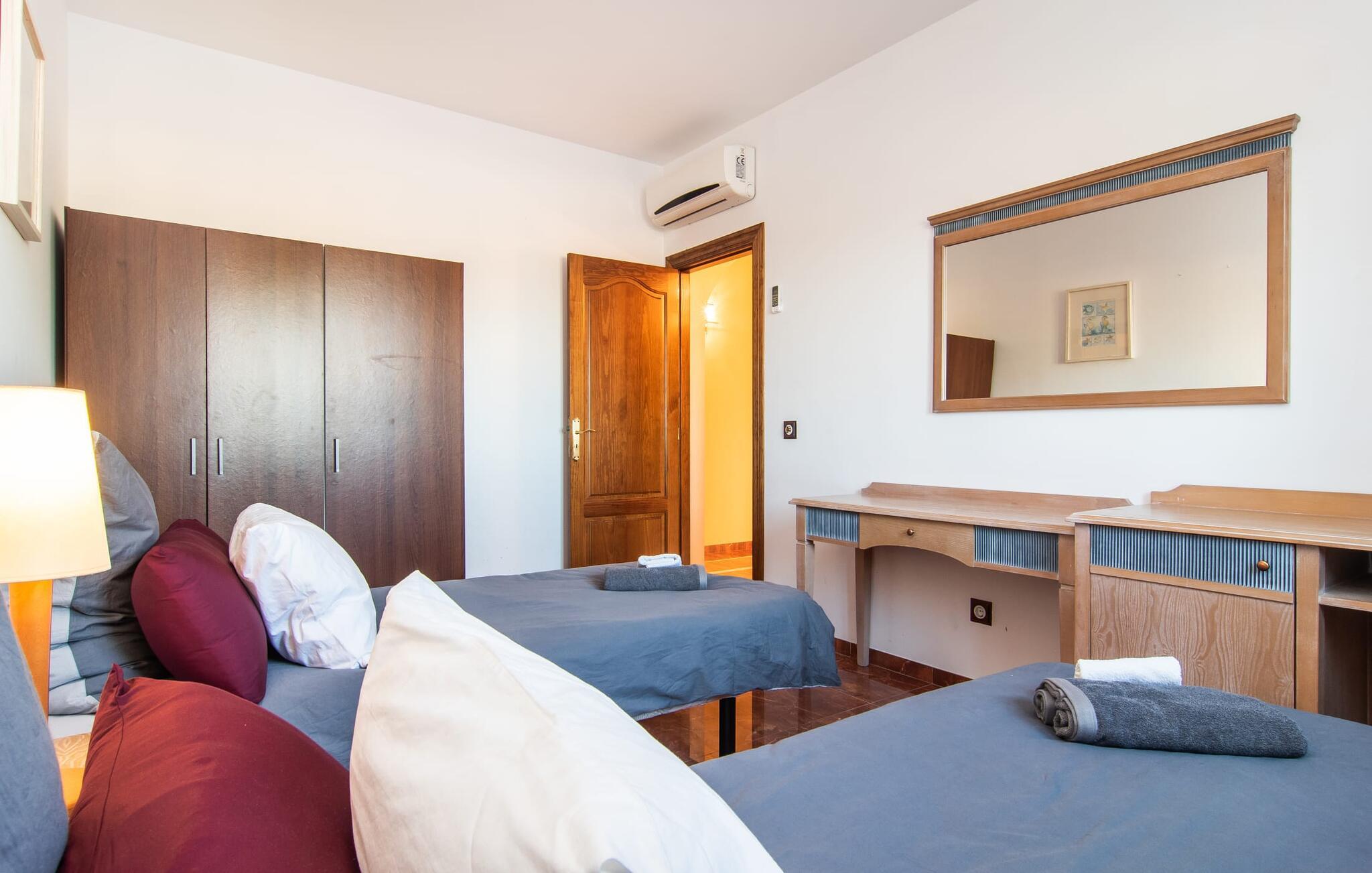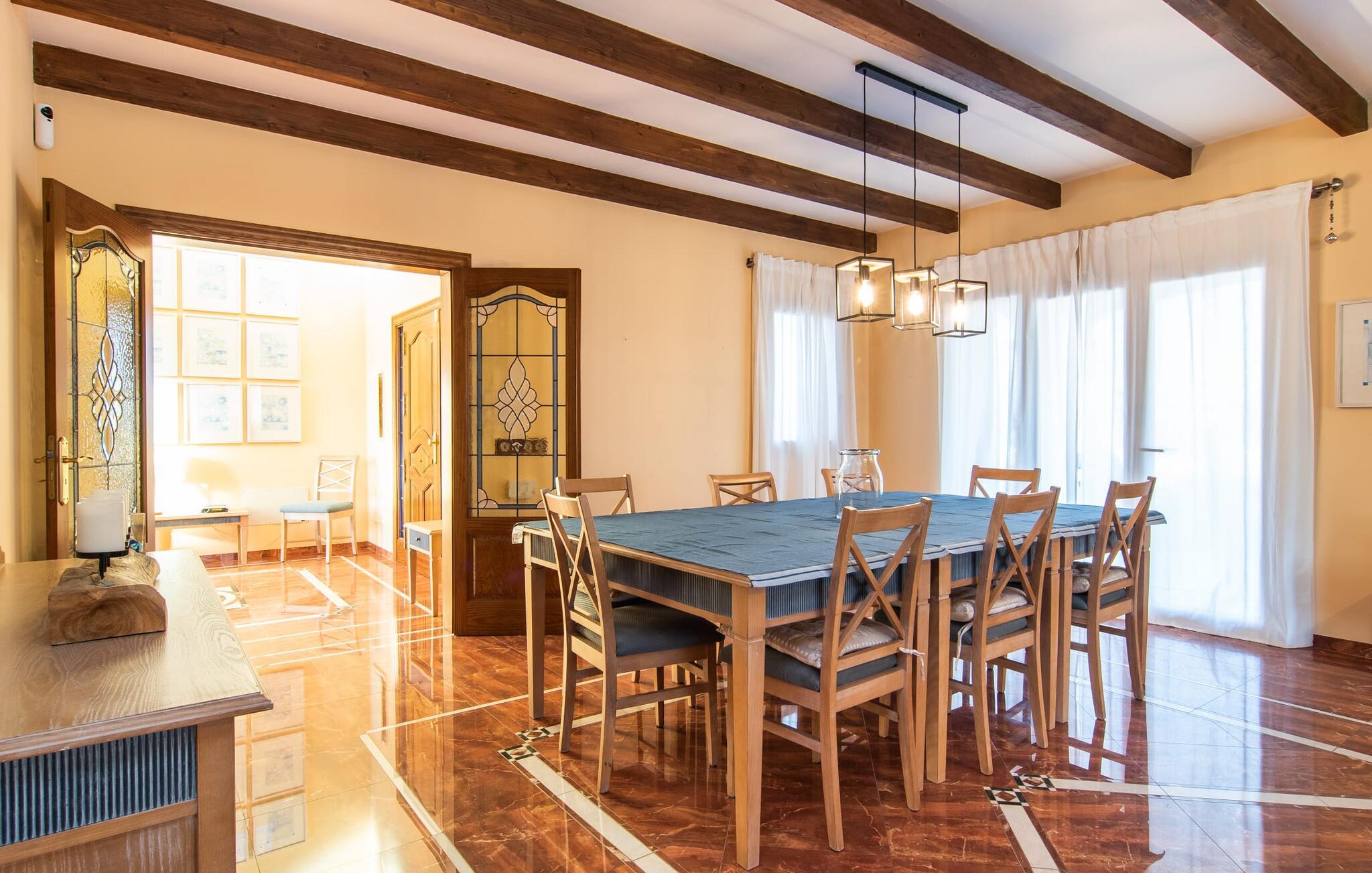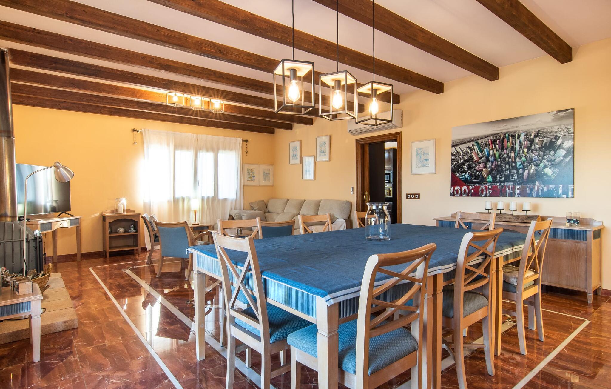 "Bouganville Resort" er en rummelig naturstensfinca nær Llucmajor i det maleriske sydlige Mallorca. Dette feriehus kan rumme op til ti gæster, hvilket gør det ideelt for familier, der rejser sammen. Den store have har høje palmer og masser af græsplæne, hvor børn kan lege, mens voksne kan slappe af på den overdækkede terrasse. En central attraktion er den runde pool med et lavvandet område, hvor små børn trygt kan more sig. Gæsterne kan slappe af på liggestolene ved poolen eller læse under en parasol. Der er praktisk parkering på en grusplads ved siden af huset. Fincaens indre kombinerer traditionel rustik charme med moderne komfort og er præget af venlige farver, mørke træaccenter og klinkegulve. Alle værelser er på ét plan, hvilket giver nem adgang for familier med små børn. Den indbydende indgang fører til et stort åbent opholds- og spiseområde, møbleret med en behagelig sofa, tv og pejs til køligere dage, samt et langt spisebord til familiemåltider. En skydedør adskiller dette værelse fra et veludstyret køkken. Ejendommen består af fem soveværelser med dobbeltsenge og tre stilfulde badeværelser, hvoraf det ene er en suite. Fincaen "Bouganville Resort" ligger kun få minutters kørsel fra den landlige by Llucmajor på det sydlige Mallorca. Der kan I nemt gøre jeres indkøb og slentre gennem det ugentlige marked. Playa S'Arenal er kun omkring 18 km væk med lejebil, andre smukke strande er omkring 20 km væk.