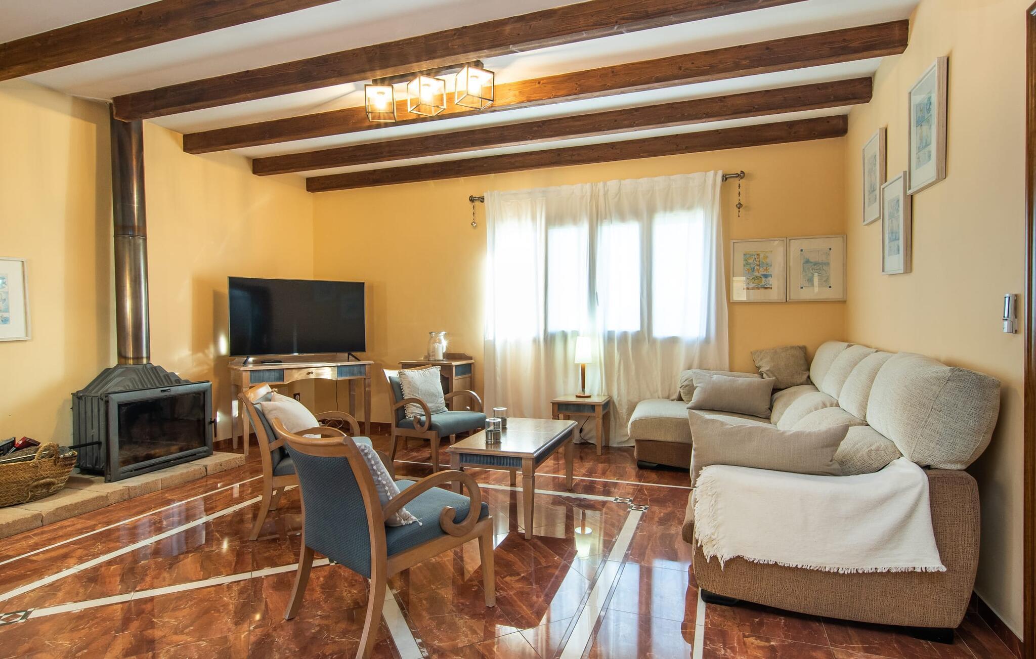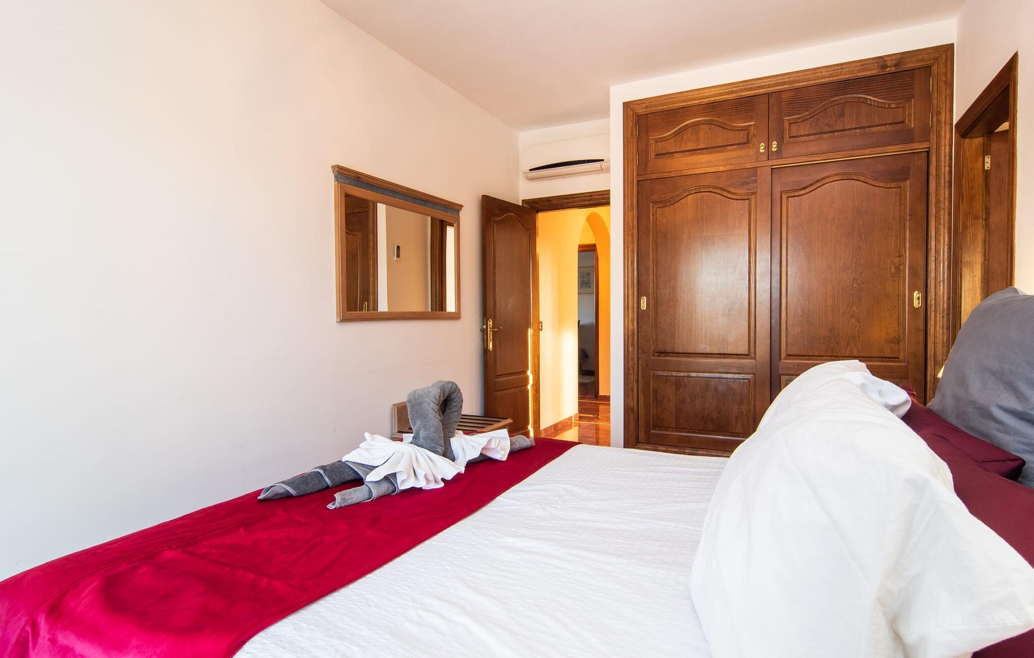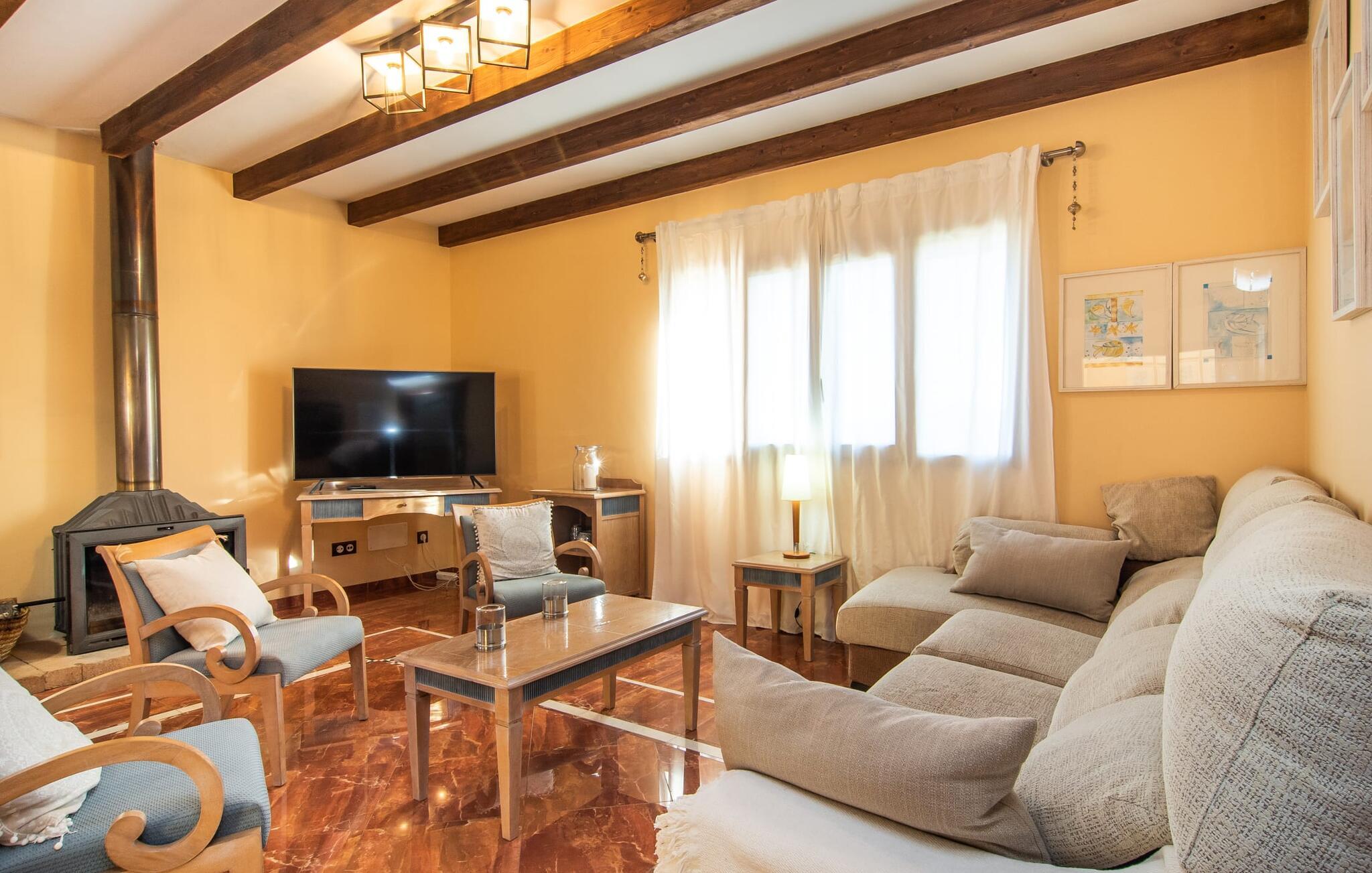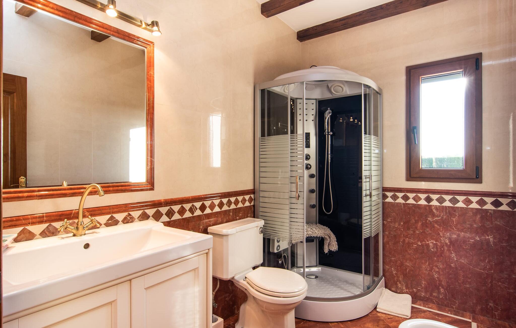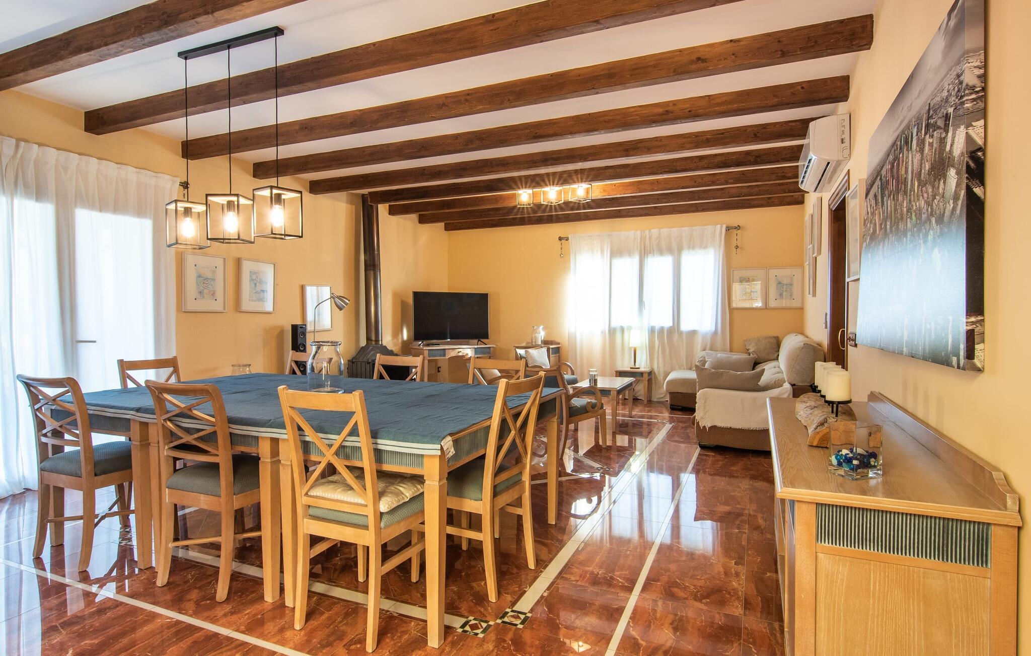 "Bouganville Resort" er en rummelig naturstensfinca nær Llucmajor i det maleriske sydlige Mallorca. Dette feriehus kan rumme op til ti gæster, hvilket gør det ideelt for familier, der rejser sammen. Den store have har høje palmer og masser af græsplæne, hvor børn kan lege, mens voksne kan slappe af på den overdækkede terrasse. En central attraktion er den runde pool med et lavvandet område, hvor små børn trygt kan more sig. Gæsterne kan slappe af på liggestolene ved poolen eller læse under en parasol. Der er praktisk parkering på en grusplads ved siden af huset. Fincaens indre kombinerer traditionel rustik charme med moderne komfort og er præget af venlige farver, mørke træaccenter og klinkegulve. Alle værelser er på ét plan, hvilket giver nem adgang for familier med små børn. Den indbydende indgang fører til et stort åbent opholds- og spiseområde, møbleret med en behagelig sofa, tv og pejs til køligere dage, samt et langt spisebord til familiemåltider. En skydedør adskiller dette værelse fra et veludstyret køkken. Ejendommen består af fem soveværelser med dobbeltsenge og tre stilfulde badeværelser, hvoraf det ene er en suite. Fincaen "Bouganville Resort" ligger kun få minutters kørsel fra den landlige by Llucmajor på det sydlige Mallorca. Der kan I nemt gøre jeres indkøb og slentre gennem det ugentlige marked. Playa S'Arenal er kun omkring 18 km væk med lejebil, andre smukke strande er omkring 20 km væk.