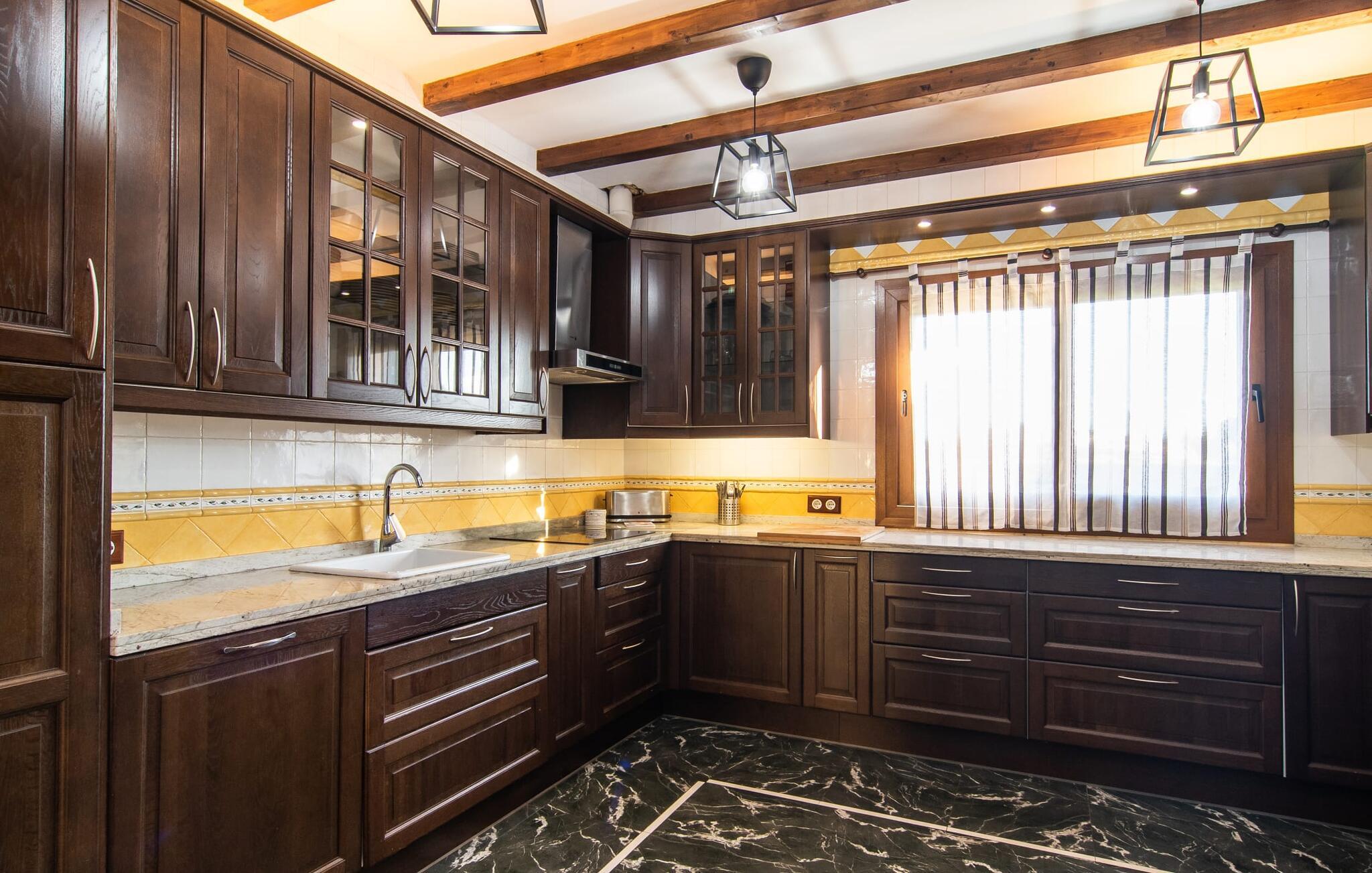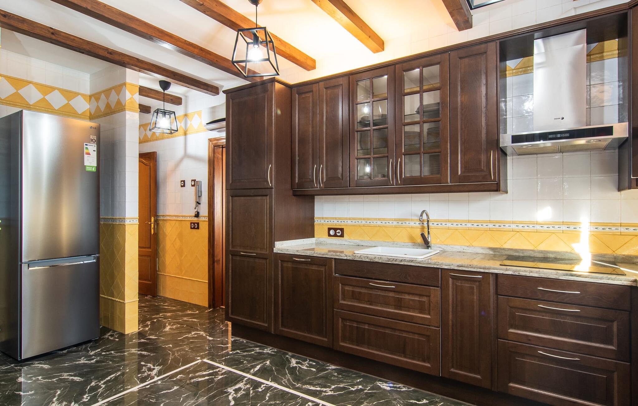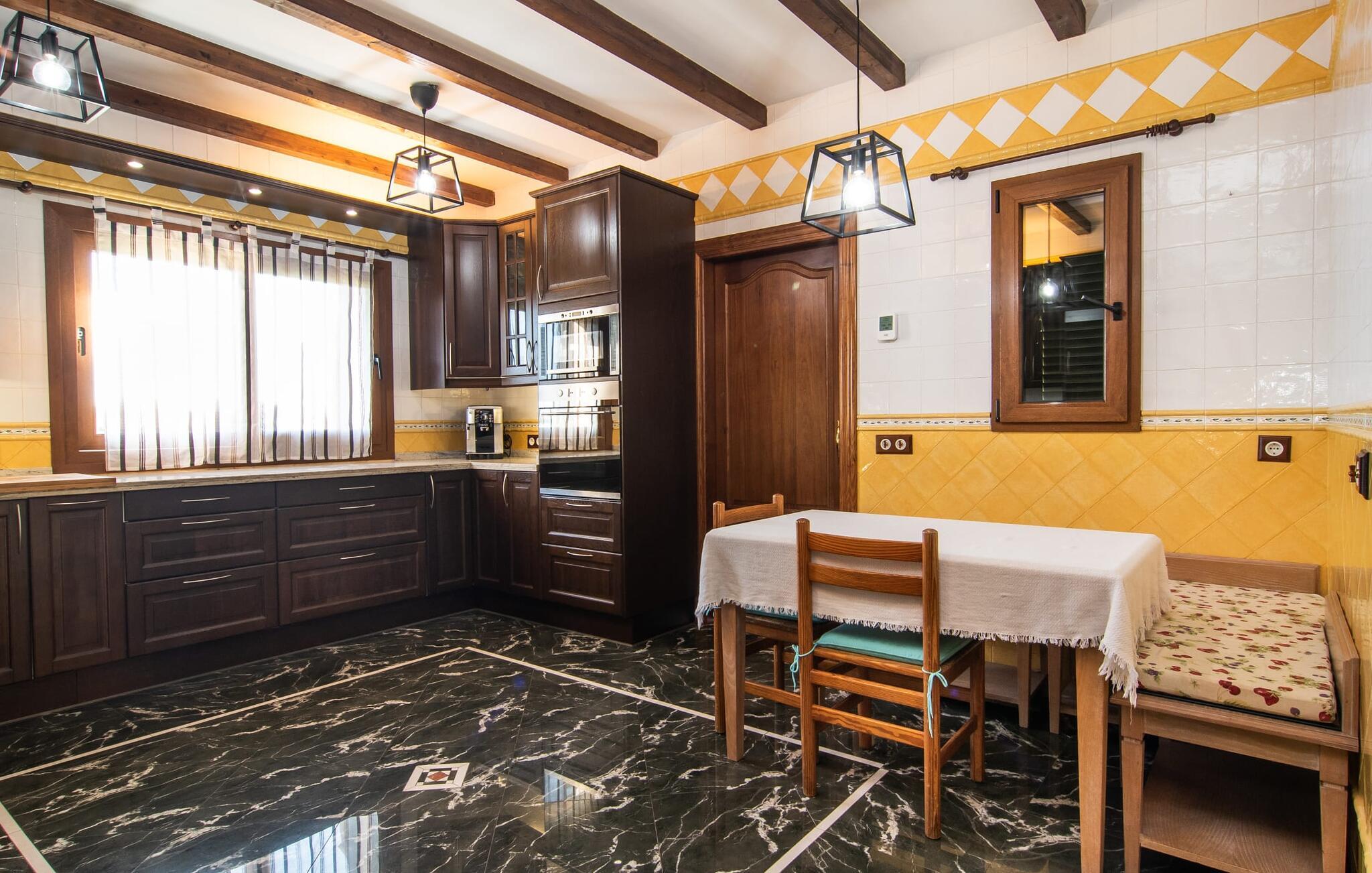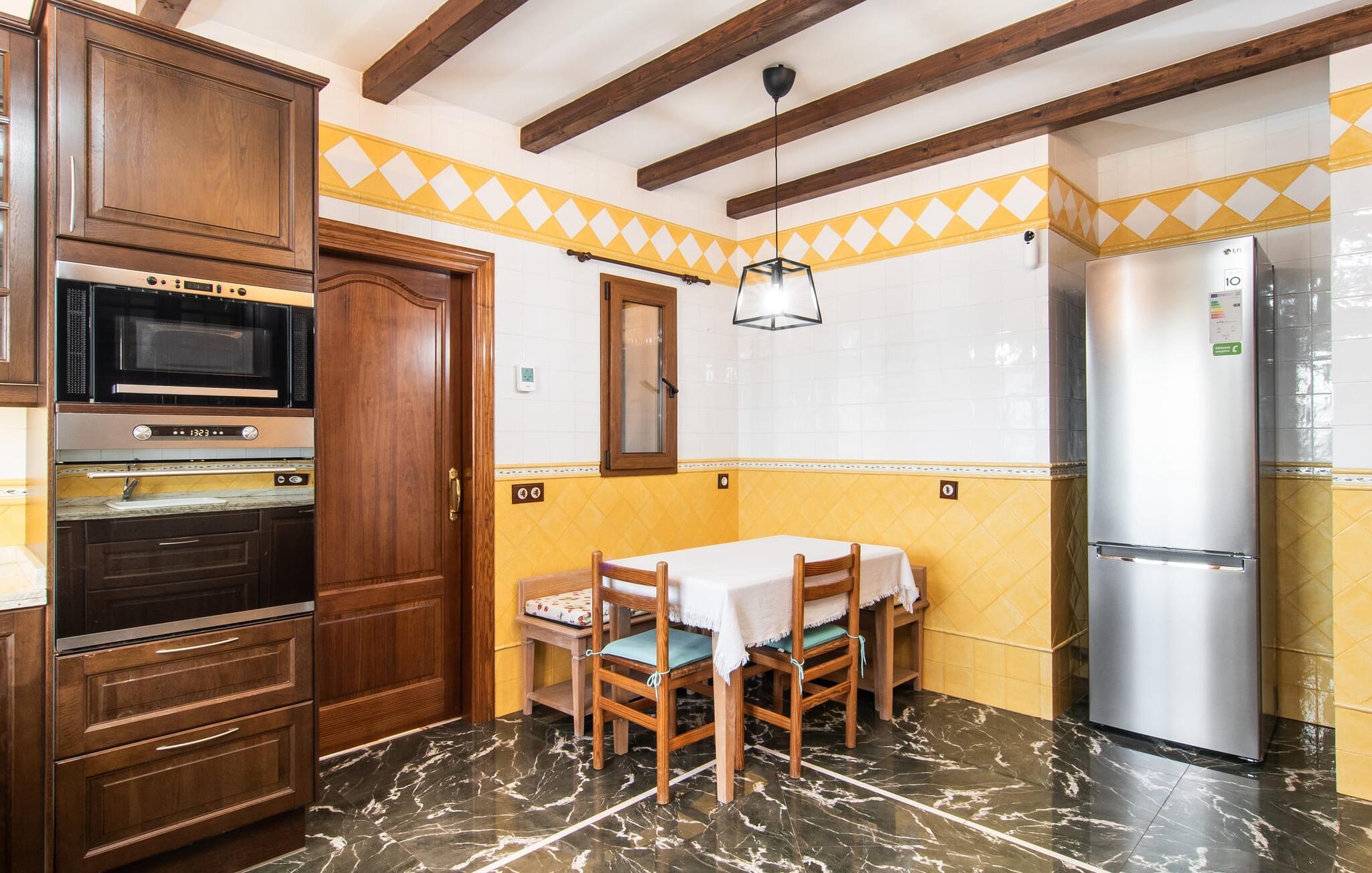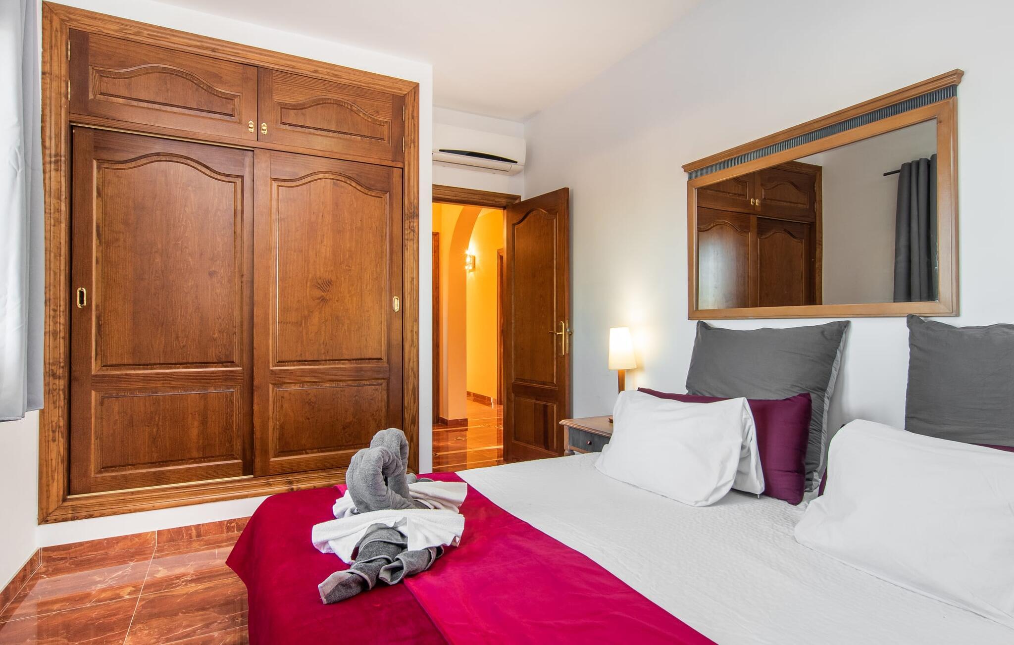 "Bouganville Resort" er en rummelig naturstensfinca nær Llucmajor i det maleriske sydlige Mallorca. Dette feriehus kan rumme op til ti gæster, hvilket gør det ideelt for familier, der rejser sammen. Den store have har høje palmer og masser af græsplæne, hvor børn kan lege, mens voksne kan slappe af på den overdækkede terrasse. En central attraktion er den runde pool med et lavvandet område, hvor små børn trygt kan more sig. Gæsterne kan slappe af på liggestolene ved poolen eller læse under en parasol. Der er praktisk parkering på en grusplads ved siden af huset. Fincaens indre kombinerer traditionel rustik charme med moderne komfort og er præget af venlige farver, mørke træaccenter og klinkegulve. Alle værelser er på ét plan, hvilket giver nem adgang for familier med små børn. Den indbydende indgang fører til et stort åbent opholds- og spiseområde, møbleret med en behagelig sofa, tv og pejs til køligere dage, samt et langt spisebord til familiemåltider. En skydedør adskiller dette værelse fra et veludstyret køkken. Ejendommen består af fem soveværelser med dobbeltsenge og tre stilfulde badeværelser, hvoraf det ene er en suite. Fincaen "Bouganville Resort" ligger kun få minutters kørsel fra den landlige by Llucmajor på det sydlige Mallorca. Der kan I nemt gøre jeres indkøb og slentre gennem det ugentlige marked. Playa S'Arenal er kun omkring 18 km væk med lejebil, andre smukke strande er omkring 20 km væk.