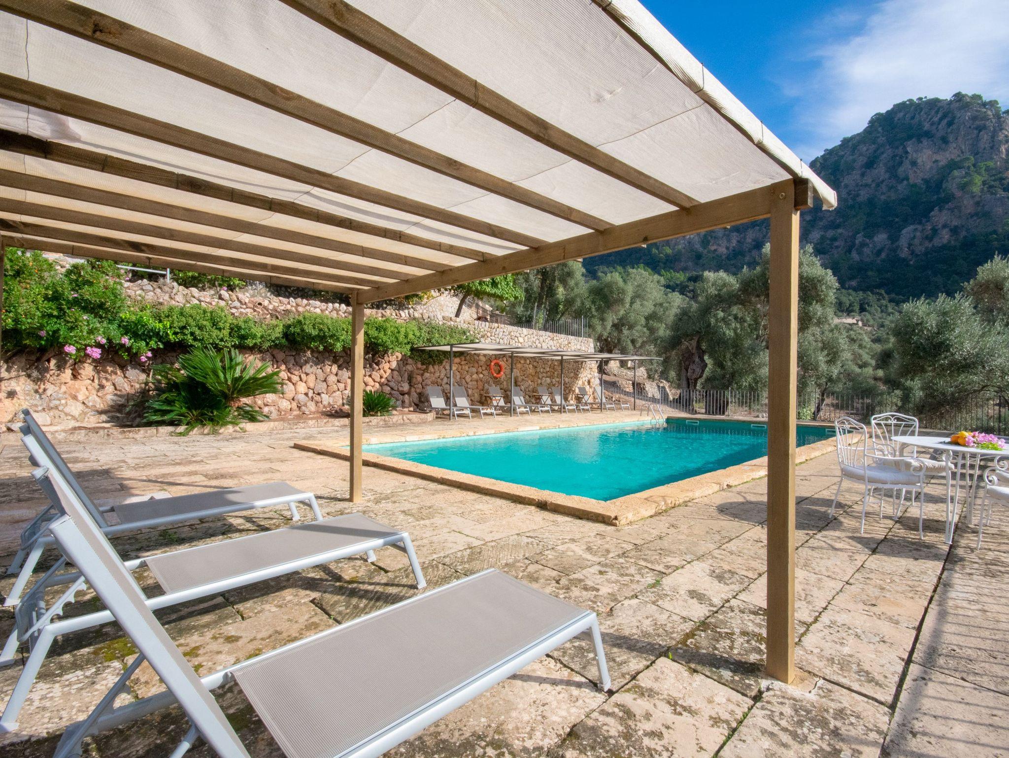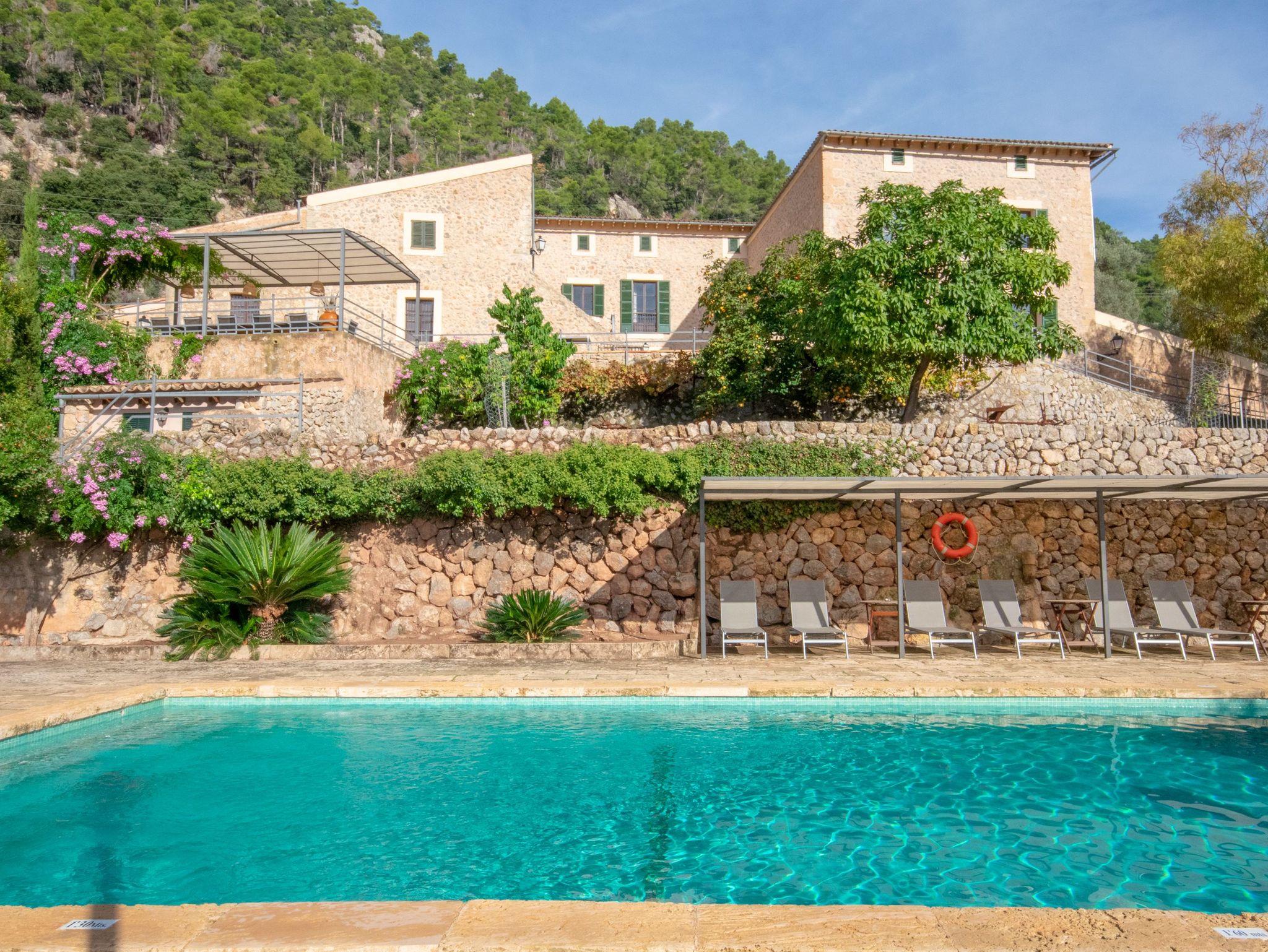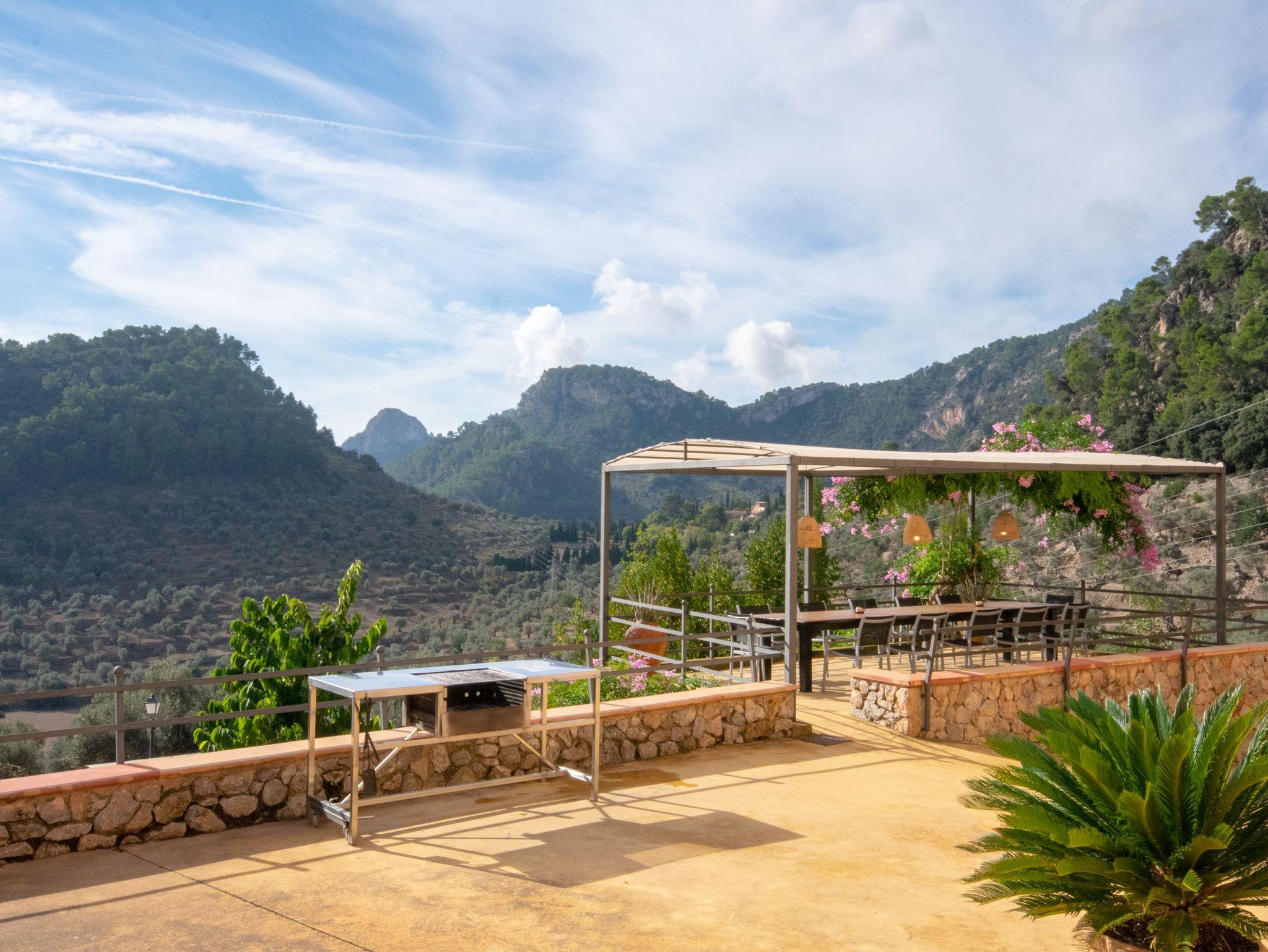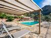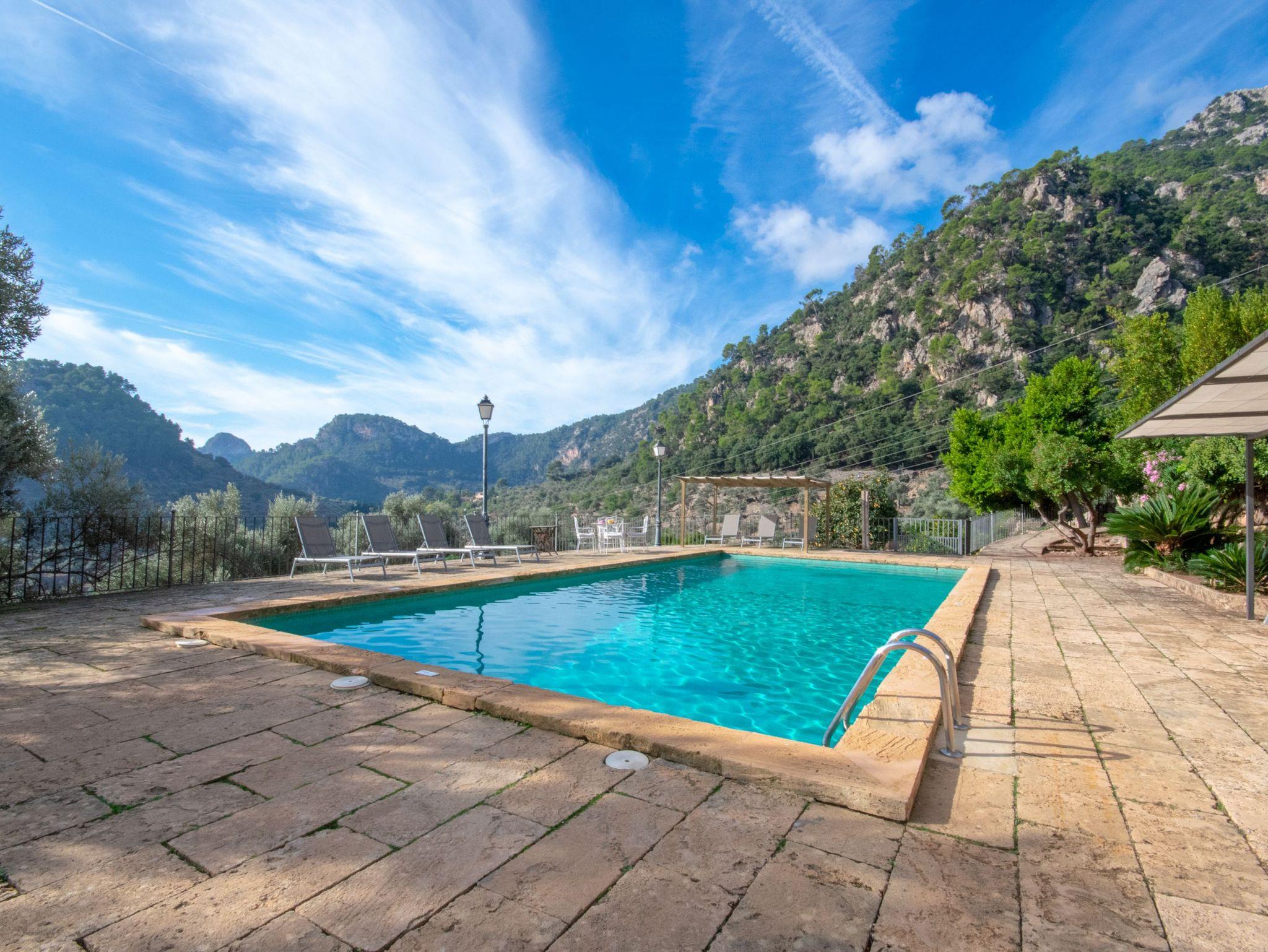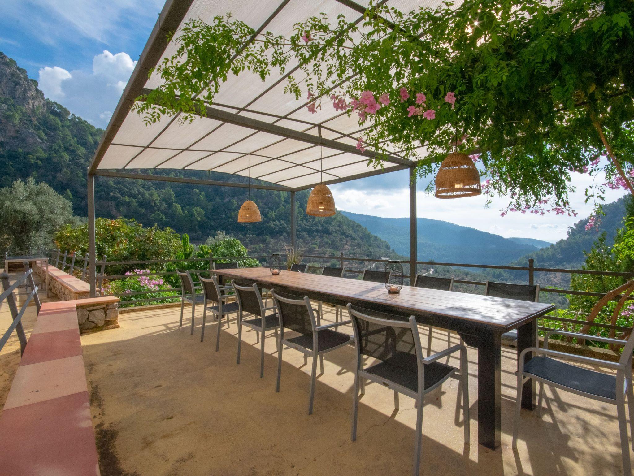 In den Außenanlagen des Ferienhauses Biniforani Nou stehen den Gästen verschiedene Bereiche zur Verfügung, in denen Sie sich ausruhen können, ein Essplatz im Freien, ein Barbecue-Grill und ein großer Pool mit einer Sonnenterrasse, die einen herrlichen Ausblick bietet.