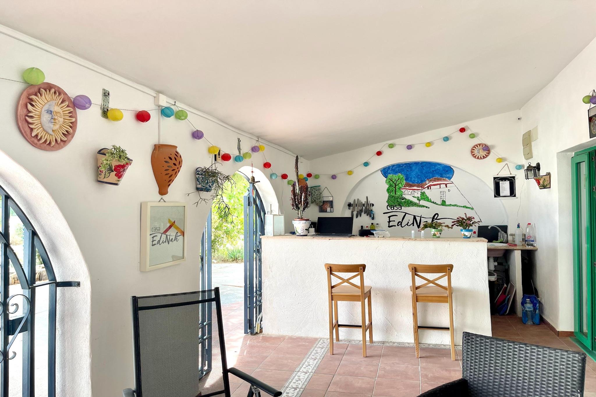 Dette fuldstændig renoverede hulehus, Casa Ed, er møbleret og udstyret med alle bekvemmeligheder. Med alle disse faciliteter tilbyder lejligheden et komfortabelt og veludstyret sted til et behageligt ophold. Residensen ligger i El Margen, Cúllar, i kort afstand fra flere hyggelige restauranter. Der er også mange andre turistattraktioner, der er værd at besøge, såsom Cuevas og Tabernas-ørkenen. Cúllar har en rig historie, der går tilbage til romertiden, og dette er tydeligt i dens arkitektur og monumenter. Udforsk de charmerende gader i det historiske centrum og beundr de mauriske påvirkninger i bygningerne. Byen er også kendt for sine farverige festivaler, såsom Feria de Cúllar, en årlig begivenhed, der afholdes i august. Gaderne er fyldt med musik, dans og traditionelle kostumer, og der er forskellige aktiviteter for både unge og gamle. Selve indkvarteringen rummer tilpassede soveværelser, badeværelser, en stue med pejs, et legerum og læserum, et fuldt udstyret køkken og et smukt udendørsområde med havemøbler og en gasgrill (mod betaling). Med bruser og hjælpemidler til personer med mobilitetsproblemer, begge i husets badeværelser, er boligen særligt tilgængelig. Poolen er ikke tilgængelig fra 30. september til 30. april på grund af vinterlukning.
