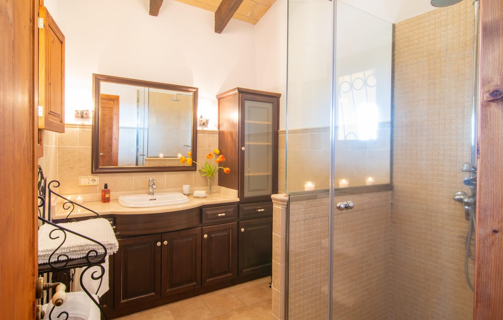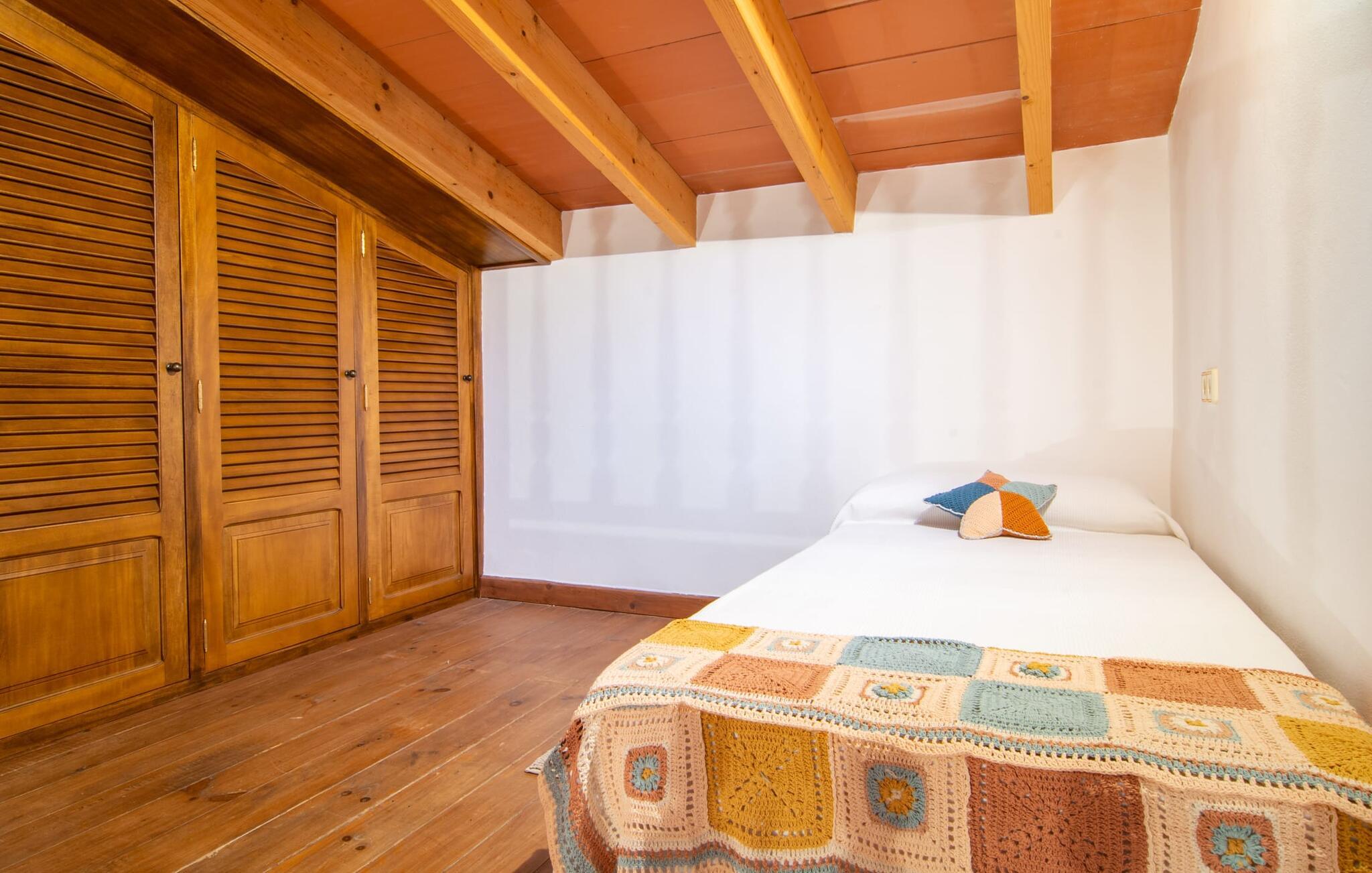 I vil opleve en sand charmeoffensiv, når I skal indrette dette feriehus. Naturstensfliser, fint træ og hvide vægge afspejler mallorcinsk tradition og samtidig en tidløs, rustik stil. Vinterhaven, egnet til alle årstider, med et langbord, vinrød glaseret væg og terracotta fliser giver direkte adgang til det fuldt udstyrede landhus køkken med træmøbler. Samtidig giver den lyse spisestue med talrige vinduespartier også adgang til den hyggelige, klimatiserede pejsestue med åbent galleri. Sidstnævnte tilbyder ekstra opbevaringsplads og et afslapningsområde. Apropos at sove - bag stuen finder I det første soveværelse med to enkeltsenge. Mellem dette og et andet soveværelse er der en gang og et moderne badeværelse med glasparti. Fra dette afslapningsrum fører en trappe til øverste etage til et tredje soveværelse med dobbeltseng med eget badeværelse med bruseniche. Nostalgiske detaljer gør dette charmerende feriehus for op til seks personer til et fantastisk sted med natur, kystflair og attraktionerne på et populært turiststed - kompromisløst afslappende!