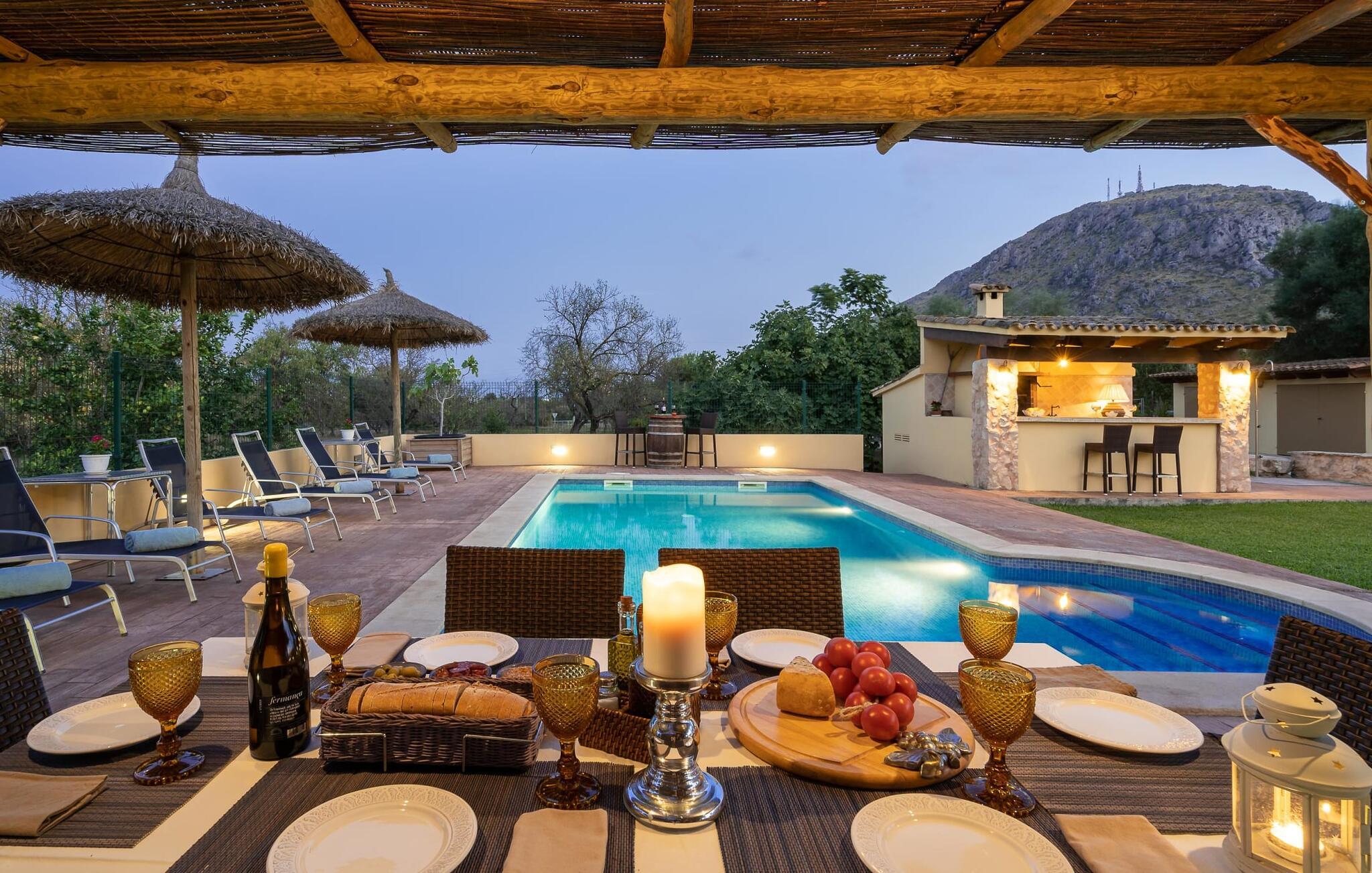 Velkommen til landvillaen "Ca Na Conceda", et smukt mallorcinsk feriehus i skønne naturomgivelser med bjergkulisse. Inden for syne af Alcúdia, i denne muntre landlige villa er I omgivet af mangfoldigheden af mallorcinsk natur. I den store have finder I et rigt udvalg af middelhavsplanter i et subtropisk klima, der kendetegner dette sted, beliggende på en halvø mellem bugterne Pollença og Alcúdia. I kan svømme i havet eller privat i den hudvenlige pool og derefter tage en pause på afslapningsstolene. Det overdækkede udekøkken med køleskab og bar byder også på en ren feriefølelse. Der er også andre fantastiske siddepladser i nærheden af poolen og baren. Derfra kan I se de små gæster spille på græsplænen. Børn elsker i øvrigt den lille zoologiske have, som består af kaniner og høns. I er velkommen til at hente morgenmadsæggene om morgenen, når I besøger dyrene. Selv om aftenen kan I nyde panoramaet over denne spektakulære smukke region på Mallorca fra den integrerede tagterrasse med loungemøbler på øverste etage, som tilbyder jer alt med bjerge, by og hav.