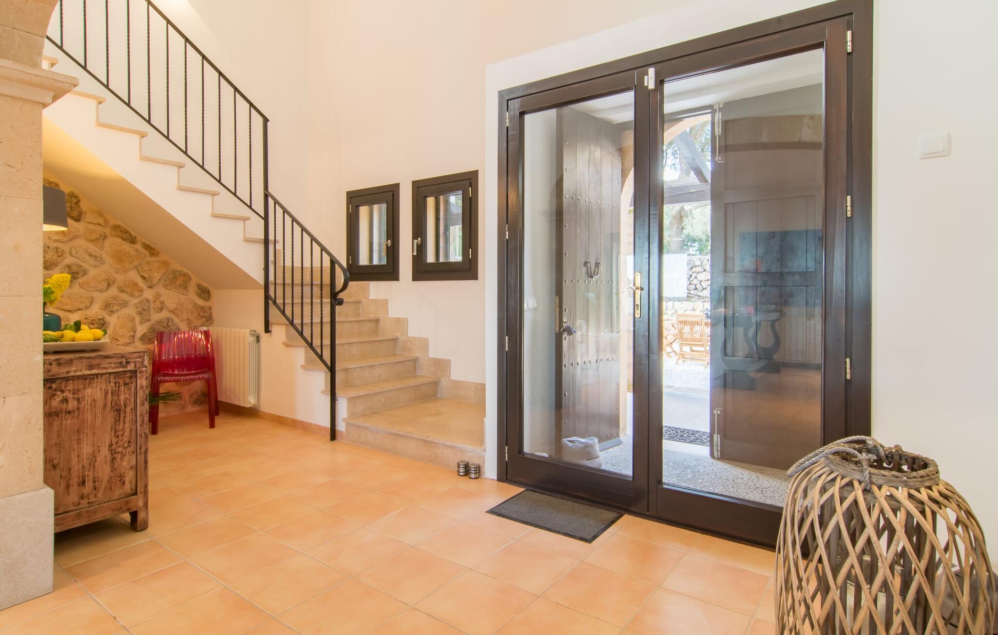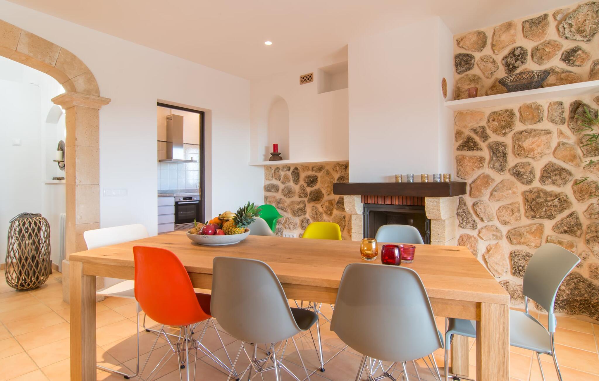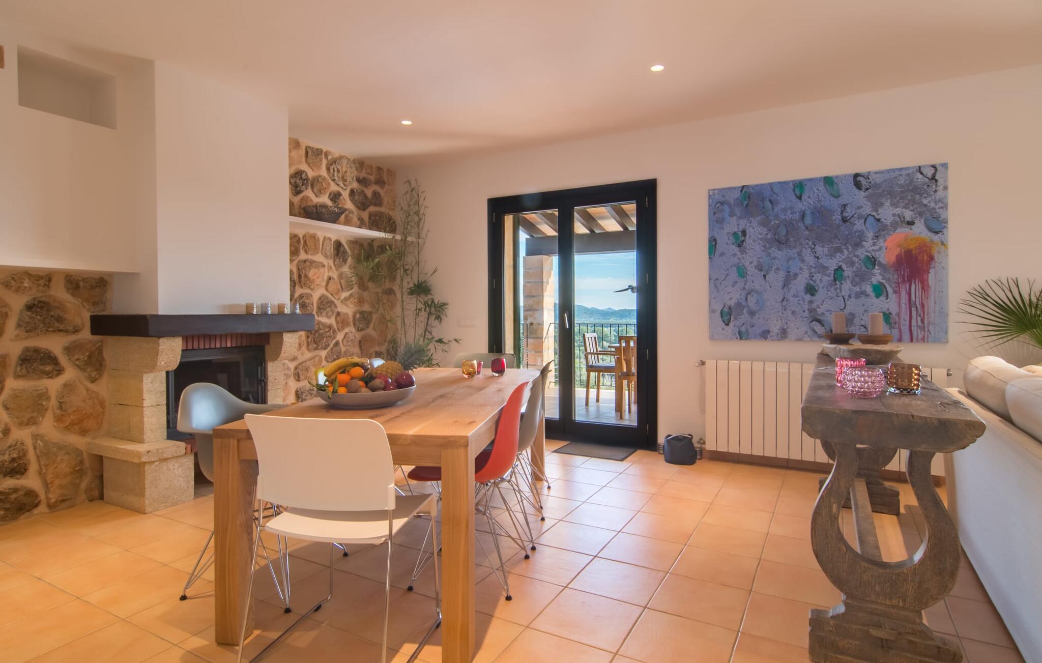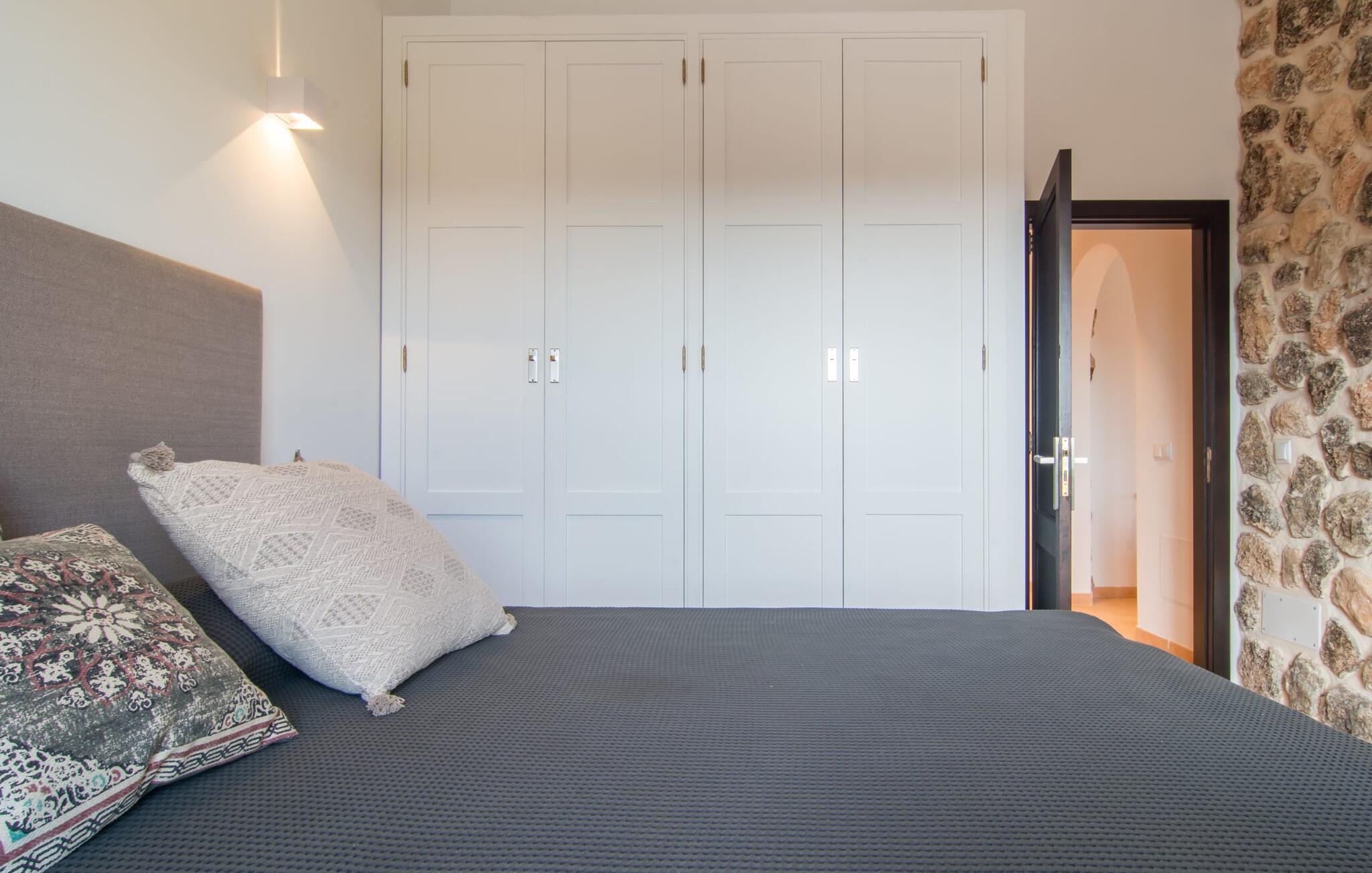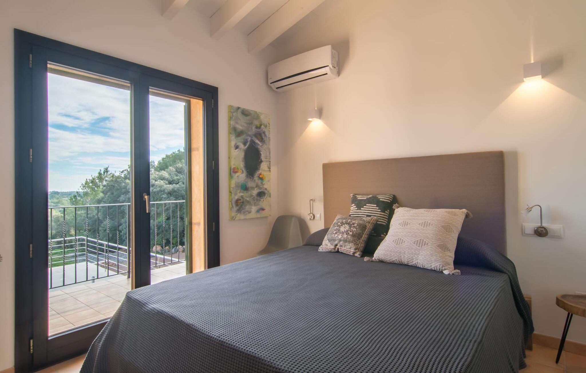Hvor givende det er at ændre jeres perspektiv nu og da. Villa "Ca Na Cristina de Carrossa" gør dette virkelig nemt! Højt beliggende på den østlige del af øen knejser huset, delvist beklædt med stenbrud, op over lokalområdets let bakkede landskab, uhøjtideligt, men stadig omgivet af en ædel charme. Yndlingssteder er lette at finde her – for eksempel lige ved siden af rækværket ved poolen, hvor udsigten kan vandre i det fjerne. Og mens I er i gang, kan I nyde jeres yndlings kolde drink eller fordybe jer i den bog, I har tænkt jer at læse i evigheder. Vand kærtegner jeres hud, når I af og til glider over hjørnetrinene ned i poolen og nyder denne helt specielle badeoplevelse, helt indlejret i den omkringliggende natur. På et tidspunkt bliver I uundgåeligt sulten, og I bliver glad for at sætte jer ved det overdækkede spisebord, som er et par trin oppe direkte fra huset og giver mulighed for korte afstande mellem indendørs og udendørs arealer. Nyd at tilberede friske delikatesser på grillen, der er ingen grænser for jeres fantasi! Villaens interiør, som er udstyret med aircondition og varme, udstråler også en usædvanlig venlig atmosfære. Æstetikken er i fokus her, og beskueren føler en harmonisk energi af møbler, tekstiler og dekorative elementer: Naturstenselementer komplementerer hvide vægge og indgangsbuer af sandsten, spotlights integreret i loftsbjælkerne konkurrerer med det naturlige dagslys om belysning i rummene. terracotta fliser harmonerer perfekt med stilfuldt brugt træ. Farverig vægkunst komplementerer disse elementer perfekt. I stueetagen er der den indbydende stue/spisestue med pejs og direkte adgang til terrassen, det fuldt udstyret køkken med opbevaringsrum, et badeværelse og to soveværelser med dobbeltsenge, mens det tredje soveværelse og et privat badeværelse er placeret på øverste etage. . Suite badeværelse. Disse værelser nyder også godt af masser af lys og smagfuldt design. Et hus, hvor I virkelig kan føle jer hjemme! Forskellige naturlige sandstrande kan nemt nås i bil fra villaen. På grund af de fremragende transportforbindelser kan trafikstøj høres i det fjerne, afhængigt af vindretningen. Hvis I leder efter noget andet, kan I for eksempel tage en tur til centrum af Son Servera. Et ugentligt marked finder sted her hver fredag. Udover kulinariske specialiteter fra regionen finder I smukke mallorcanske kunsthåndværk. Om aftenen bør I ikke gå glip af at slentre gennem Artàs oplyste gader. Under en gåtur kan I bestige Golgata og kirken Santuari de Sant Salvador. Fire golfbaner ligger kun få minutters kørsel fra villaen. Dette inkluderer den berømte golfbane "Pula Golf" mellem Artà og Son Servera. I er garanteret en betagende smuk udsigt, hvis I beslutter jer for at bo i denne villa: kun 2,5 km i luftlinje fra den smukke by Artà kan I overse det dejlige landskab på den nordlige del af øen. Både Artà og Capdepera byder på rigtig gode indkøbsmuligheder. Smukke strande som Sa Marjal og Cala Bona ligger blot et par minutter væk i bil. En vandretur fra Ermita de Betlem kan ende ved Platja de Colonia de San Pere.