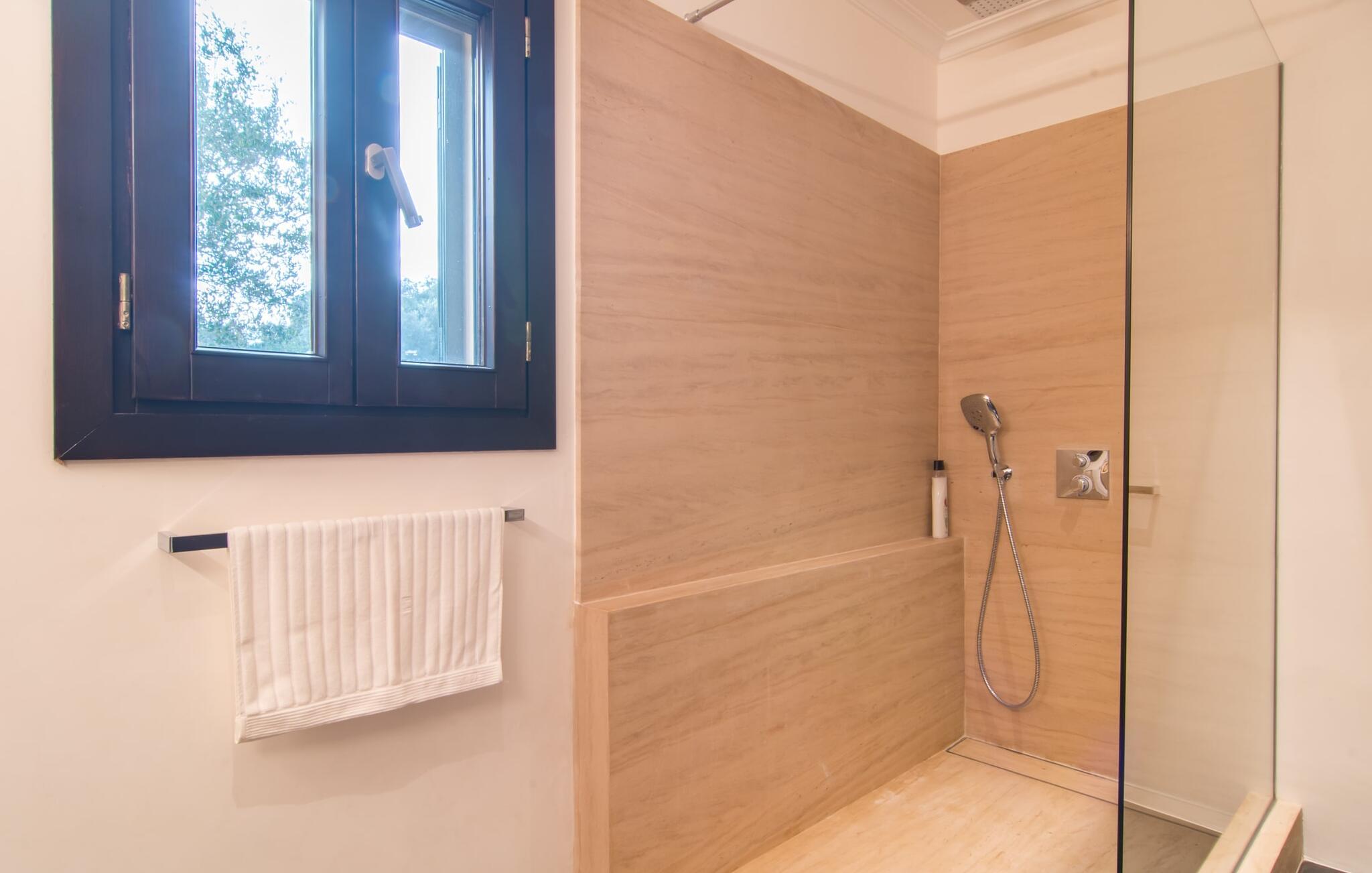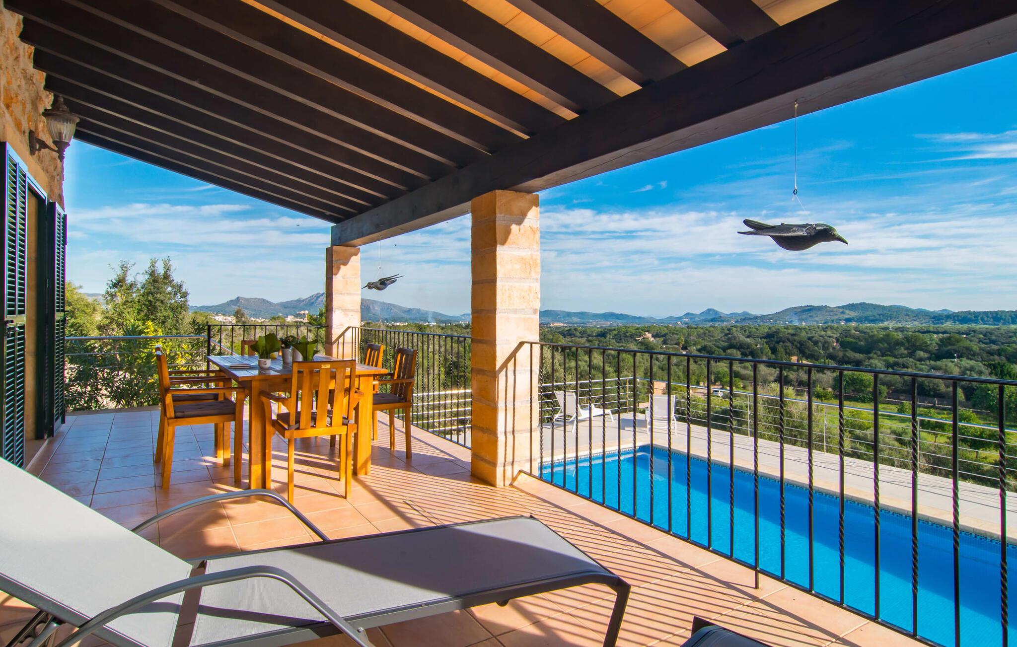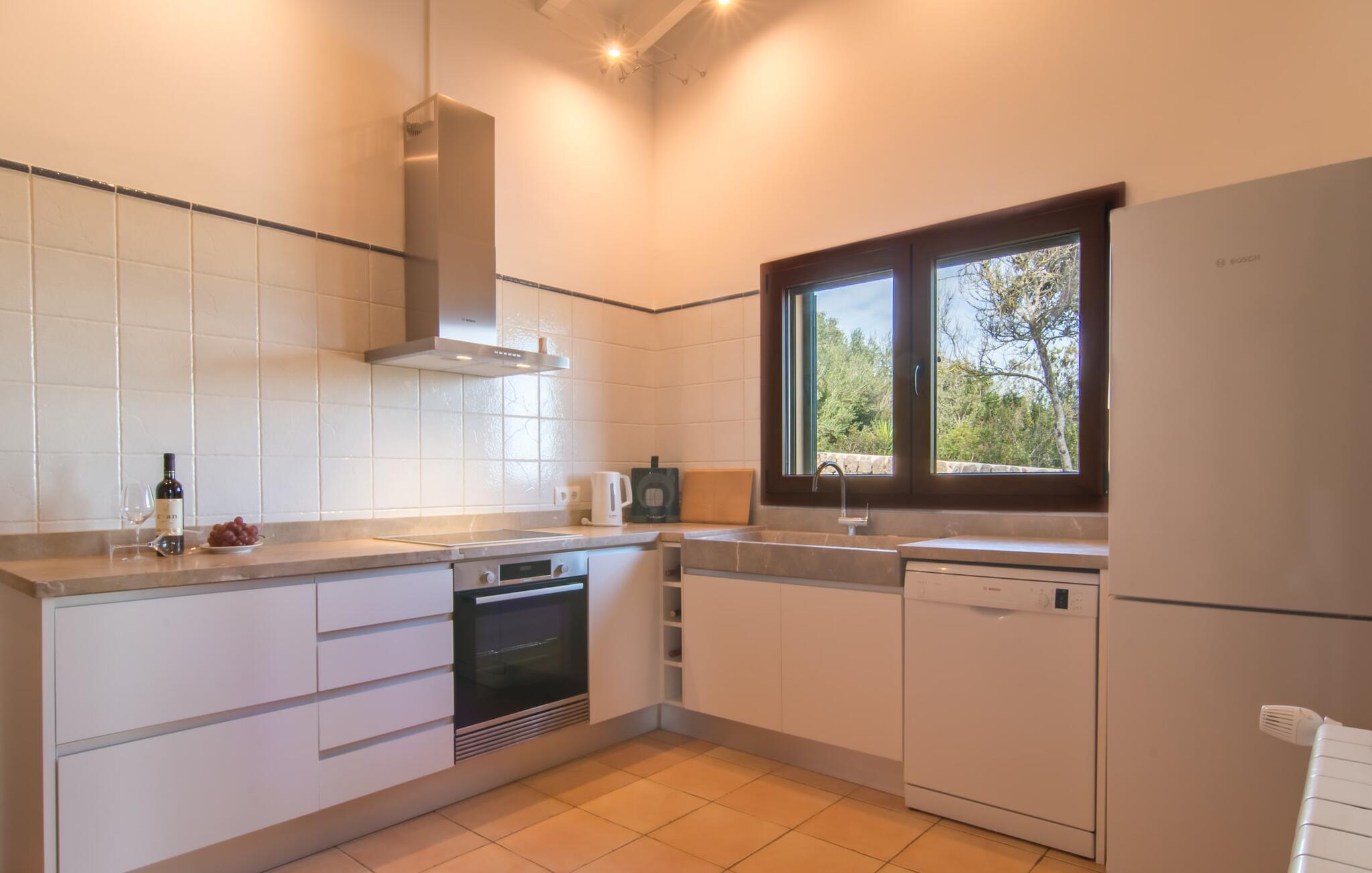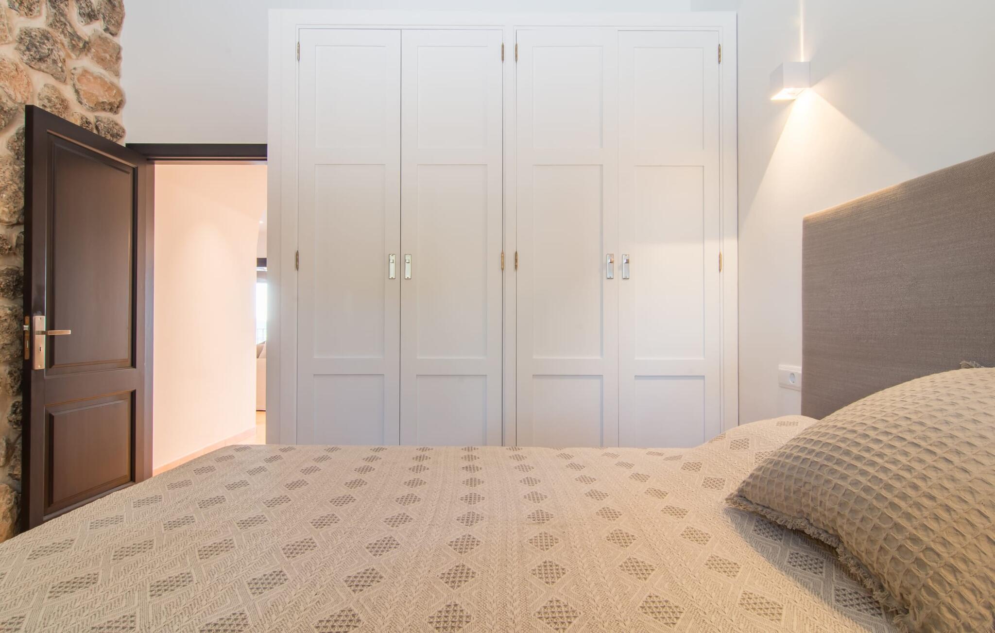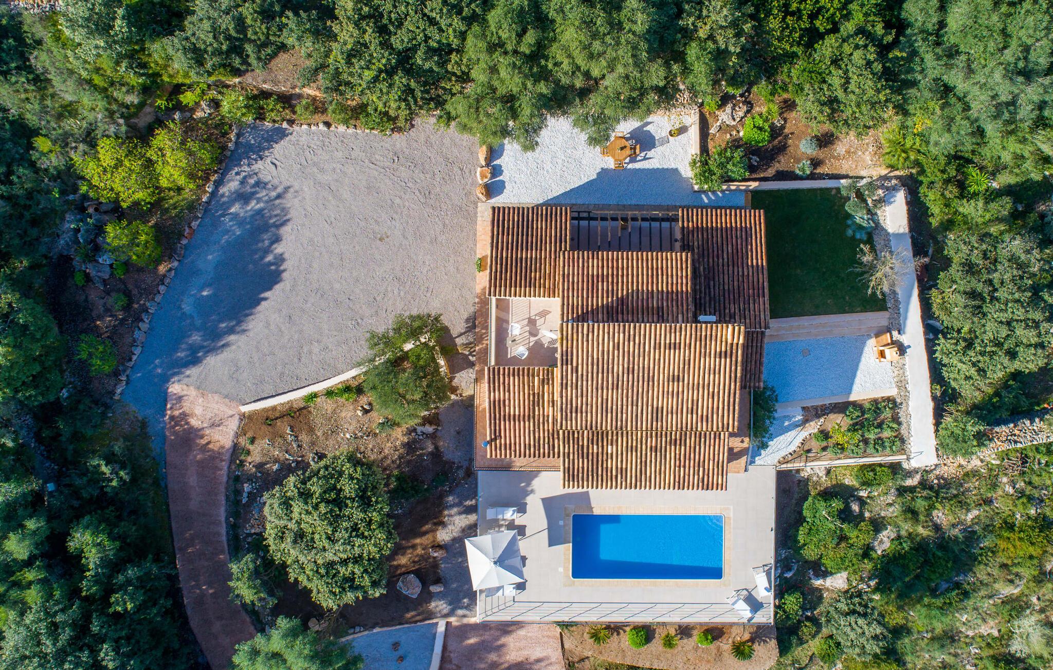 Hvor givende det er at ændre jeres perspektiv nu og da. Villa "Ca Na Cristina de Carrossa" gør dette virkelig nemt! Højt beliggende på den østlige del af øen knejser huset, delvist beklædt med stenbrud, op over lokalområdets let bakkede landskab, uhøjtideligt, men stadig omgivet af en ædel charme. Yndlingssteder er lette at finde her – for eksempel lige ved siden af rækværket ved poolen, hvor udsigten kan vandre i det fjerne. Og mens I er i gang, kan I nyde jeres yndlings kolde drink eller fordybe jer i den bog, I har tænkt jer at læse i evigheder. Vand kærtegner jeres hud, når I af og til glider over hjørnetrinene ned i poolen og nyder denne helt specielle badeoplevelse, helt indlejret i den omkringliggende natur. På et tidspunkt bliver I uundgåeligt sulten, og I bliver glad for at sætte jer ved det overdækkede spisebord, som er et par trin oppe direkte fra huset og giver mulighed for korte afstande mellem indendørs og udendørs arealer. Nyd at tilberede friske delikatesser på grillen, der er ingen grænser for jeres fantasi! Villaens interiør, som er udstyret med aircondition og varme, udstråler også en usædvanlig venlig atmosfære. Æstetikken er i fokus her, og beskueren føler en harmonisk energi af møbler, tekstiler og dekorative elementer: Naturstenselementer komplementerer hvide vægge og indgangsbuer af sandsten, spotlights integreret i loftsbjælkerne konkurrerer med det naturlige dagslys om belysning i rummene. terracotta fliser harmonerer perfekt med stilfuldt brugt træ. Farverig vægkunst komplementerer disse elementer perfekt. I stueetagen er der den indbydende stue/spisestue med pejs og direkte adgang til terrassen, det fuldt udstyret køkken med opbevaringsrum, et badeværelse og to soveværelser med dobbeltsenge, mens det tredje soveværelse og et privat badeværelse er placeret på øverste etage. . Suite badeværelse. Disse værelser nyder også godt af masser af lys og smagfuldt design. Et hus, hvor I virkelig kan føle jer hjemme! Forskellige naturlige sandstrande kan nemt nås i bil fra villaen. På grund af de fremragende transportforbindelser kan trafikstøj høres i det fjerne, afhængigt af vindretningen. Hvis I leder efter noget andet, kan I for eksempel tage en tur til centrum af Son Servera. Et ugentligt marked finder sted her hver fredag. Udover kulinariske specialiteter fra regionen finder I smukke mallorcanske kunsthåndværk. Om aftenen bør I ikke gå glip af at slentre gennem Artàs oplyste gader. Under en gåtur kan I bestige Golgata og kirken Santuari de Sant Salvador. Fire golfbaner ligger kun få minutters kørsel fra villaen. Dette inkluderer den berømte golfbane "Pula Golf" mellem Artà og Son Servera. I er garanteret en betagende smuk udsigt, hvis I beslutter jer for at bo i denne villa: kun 2,5 km i luftlinje fra den smukke by Artà kan I overse det dejlige landskab på den nordlige del af øen. Både Artà og Capdepera byder på rigtig gode indkøbsmuligheder. Smukke strande som Sa Marjal og Cala Bona ligger blot et par minutter væk i bil. En vandretur fra Ermita de Betlem kan ende ved Platja de Colonia de San Pere.