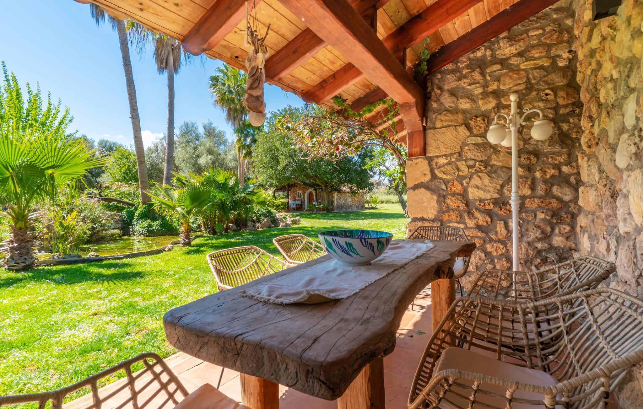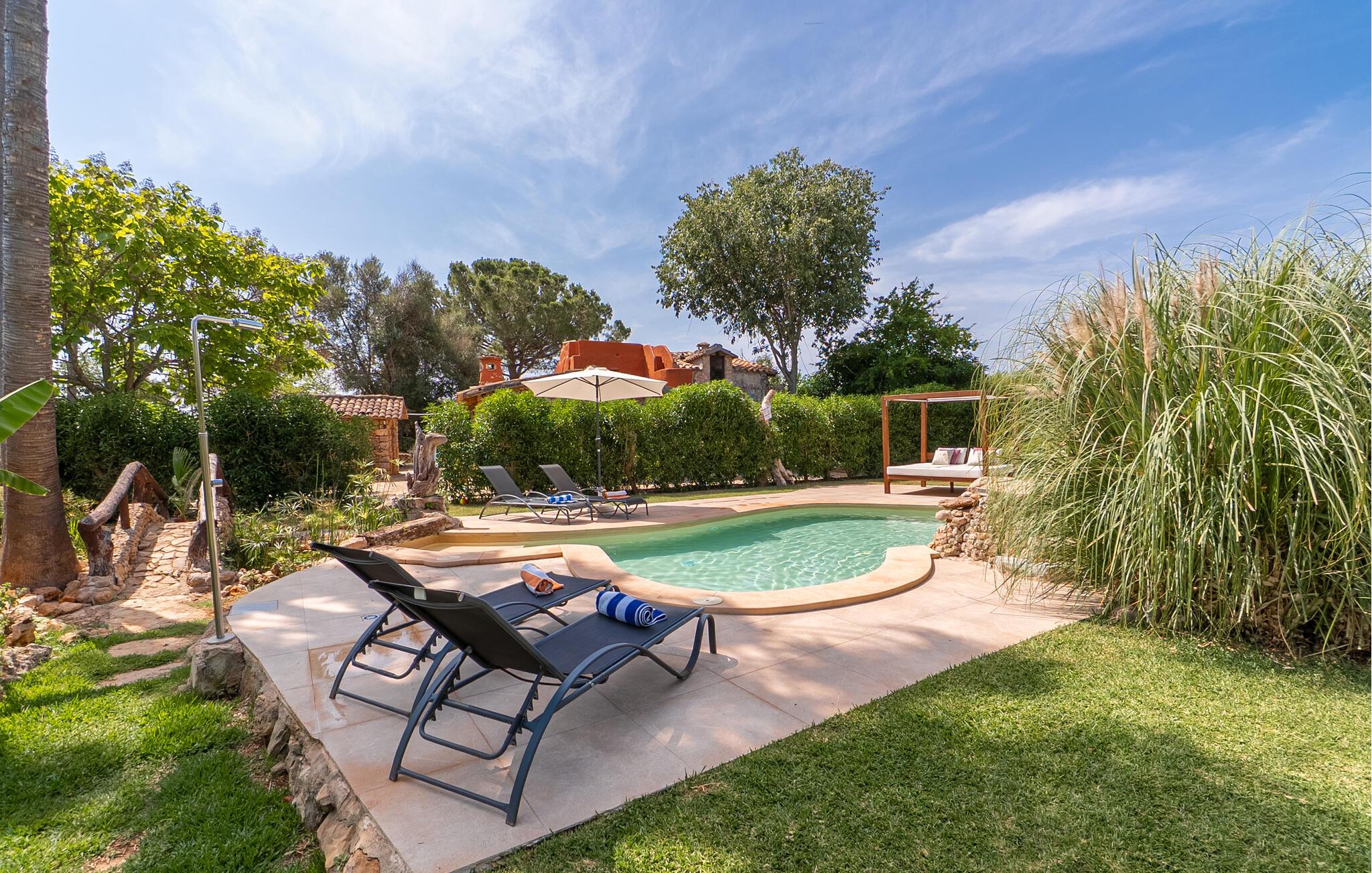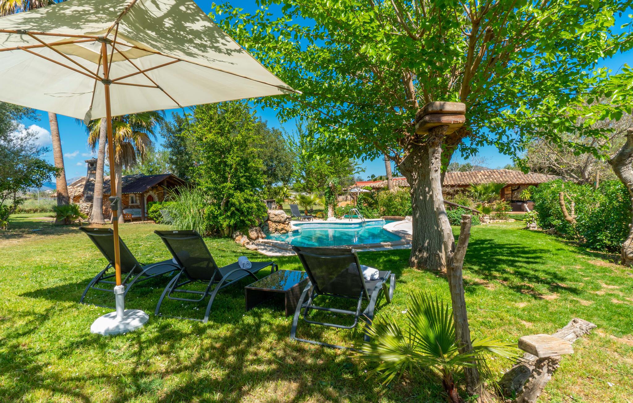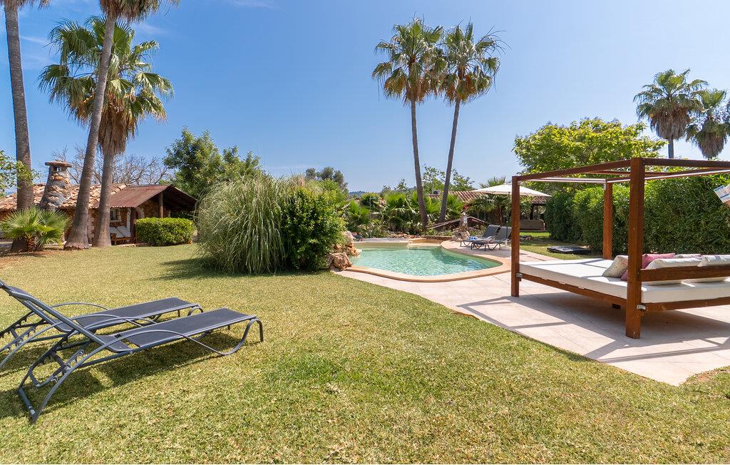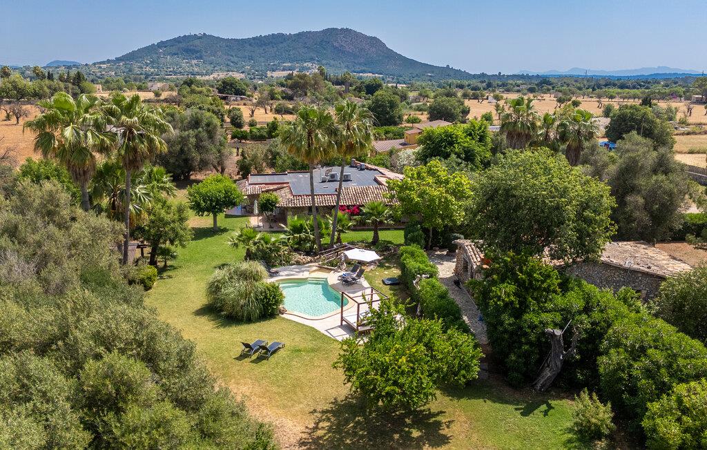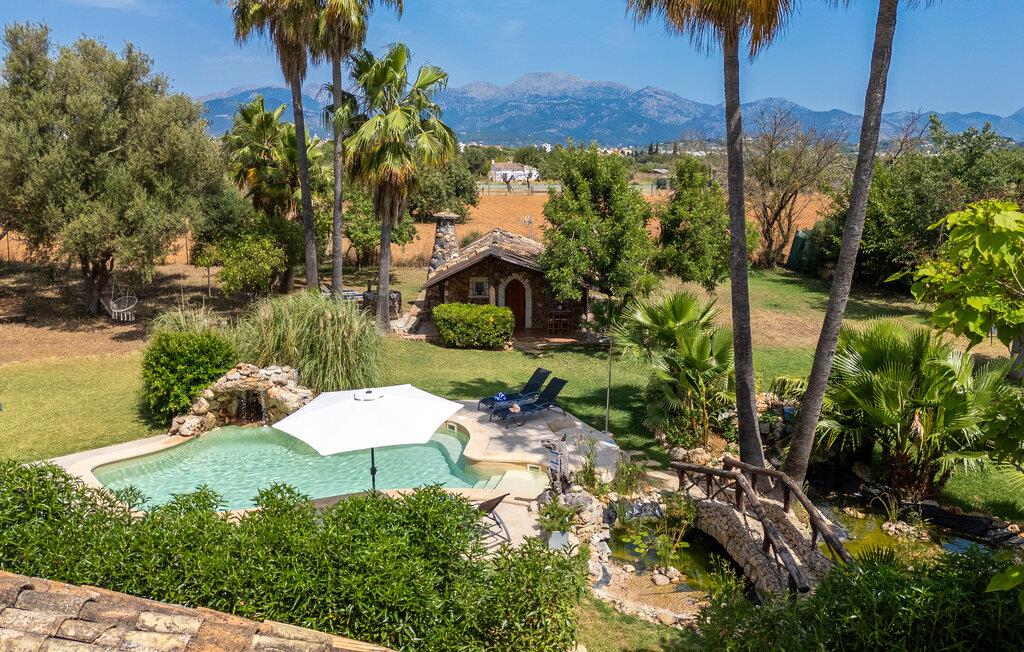 Landstedet "Ca Na Marlis" er ideelt, hvis I ønsker at tilbringe en afslappende ferie med gode venner på Mallorca. Bygningernes arkitektur kan minde om det nordlige Spanien, hvilket ikke er tilfældigt: De tilhørte engang en asturisk restaurant. Ejendommen er blevet nænsomt restaureret og omdannet til tre separate og komfortable boligenheder, fordelt på en afsondret havegrund med masser af græsplæne, fortryllende skyggefulde områder og en eksotisk designet pool med en lille grotte og vandfald. Der er masser af komfortable liggestole og siddepladser til læsning, solbadning og afslapning. Hvert hus har en individuelt designet terrasse. Det indre af hovedhuset og de to bungalower er oversvømmet med lys og indrettet i en moderne landlig stil. Hovedhuset har en stue, en spisestue, et moderne køkken med en anden spiseplads og tre rummelige soveværelser, hvoraf to har eget badeværelse. I tilknytning til huset finder I en skøn lounge, flere terrasser og en grillplads. Hver af de to bungalower har et dobbeltværelse med eget badeværelse. Den tredje bungalow med rustik indretning har ikke et soveværelse. Der er et lille fitnessrum, en hyggelig stue med pejs, en lille bar og et værelse med spil og et bordfodboldbord. Her kan I skabe jeres egen feststemning uden at skulle forlade jeres sommerhus på Mallorca. Feriehuset ligger kun 1 km fra Inca. Der er en paddlebane og flere tennisbaner i umiddelbar nærhed. Herfra kan I nå de lange, hvide strande på nordøstkysten på cirka 25 minutter i bil.