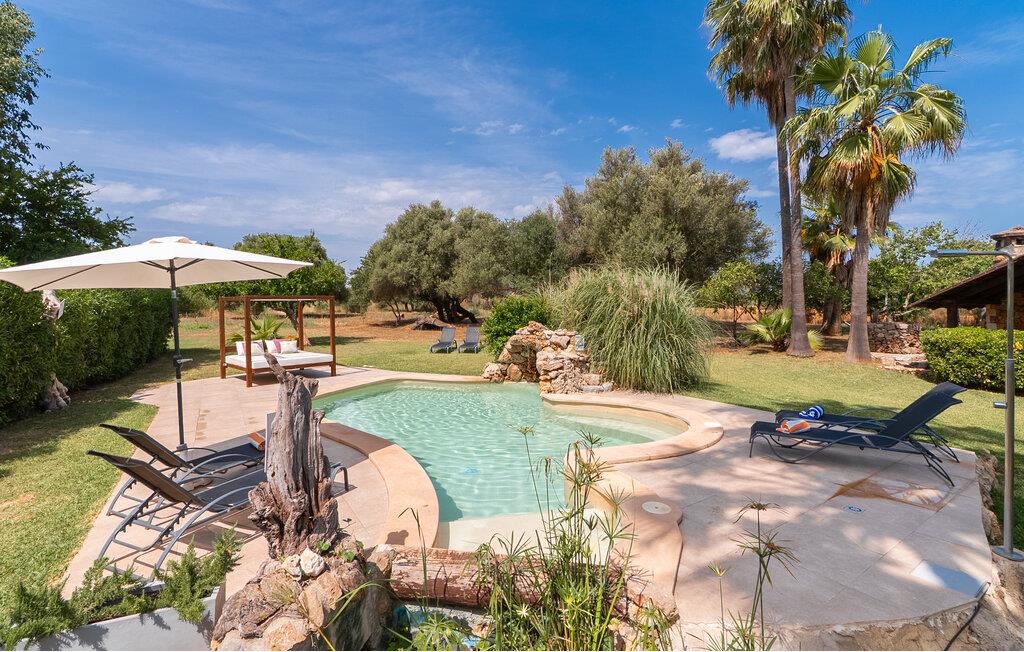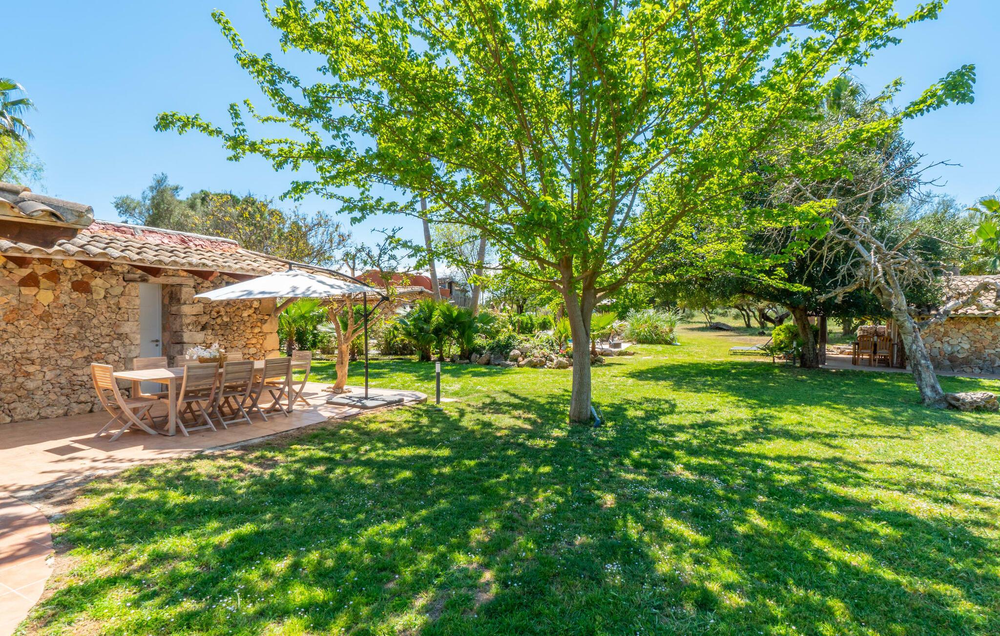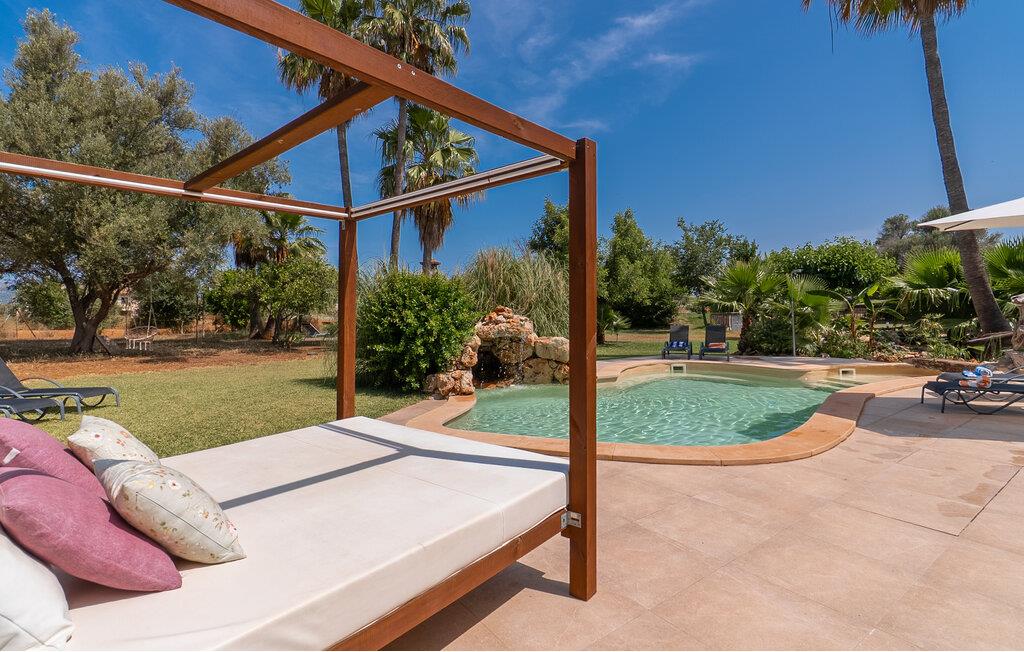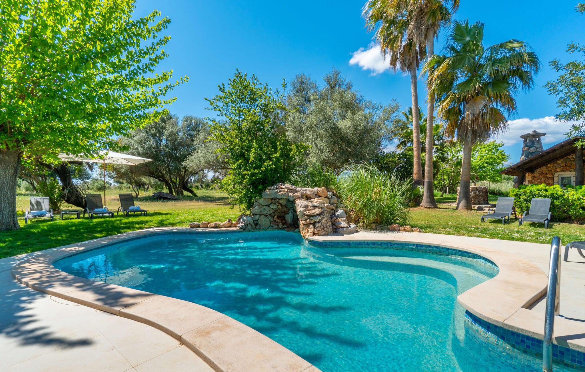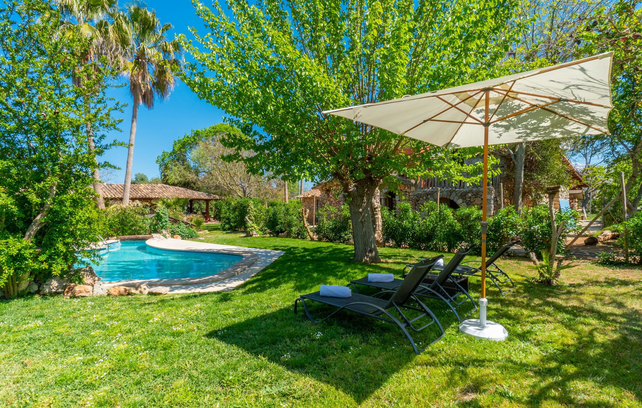 Landstedet "Ca Na Marlis" er ideelt, hvis I ønsker at tilbringe en afslappende ferie med gode venner på Mallorca. Bygningernes arkitektur kan minde om det nordlige Spanien, hvilket ikke er tilfældigt: De tilhørte engang en asturisk restaurant. Ejendommen er blevet nænsomt restaureret og omdannet til tre separate og komfortable boligenheder, fordelt på en afsondret havegrund med masser af græsplæne, fortryllende skyggefulde områder og en eksotisk designet pool med en lille grotte og vandfald. Der er masser af komfortable liggestole og siddepladser til læsning, solbadning og afslapning. Hvert hus har en individuelt designet terrasse. Det indre af hovedhuset og de to bungalower er oversvømmet med lys og indrettet i en moderne landlig stil. Hovedhuset har en stue, en spisestue, et moderne køkken med en anden spiseplads og tre rummelige soveværelser, hvoraf to har eget badeværelse. I tilknytning til huset finder I en skøn lounge, flere terrasser og en grillplads. Hver af de to bungalower har et dobbeltværelse med eget badeværelse. Den tredje bungalow med rustik indretning har ikke et soveværelse. Der er et lille fitnessrum, en hyggelig stue med pejs, en lille bar og et værelse med spil og et bordfodboldbord. Her kan I skabe jeres egen feststemning uden at skulle forlade jeres sommerhus på Mallorca. Feriehuset ligger kun 1 km fra Inca. Der er en paddlebane og flere tennisbaner i umiddelbar nærhed. Herfra kan I nå de lange, hvide strande på nordøstkysten på cirka 25 minutter i bil.