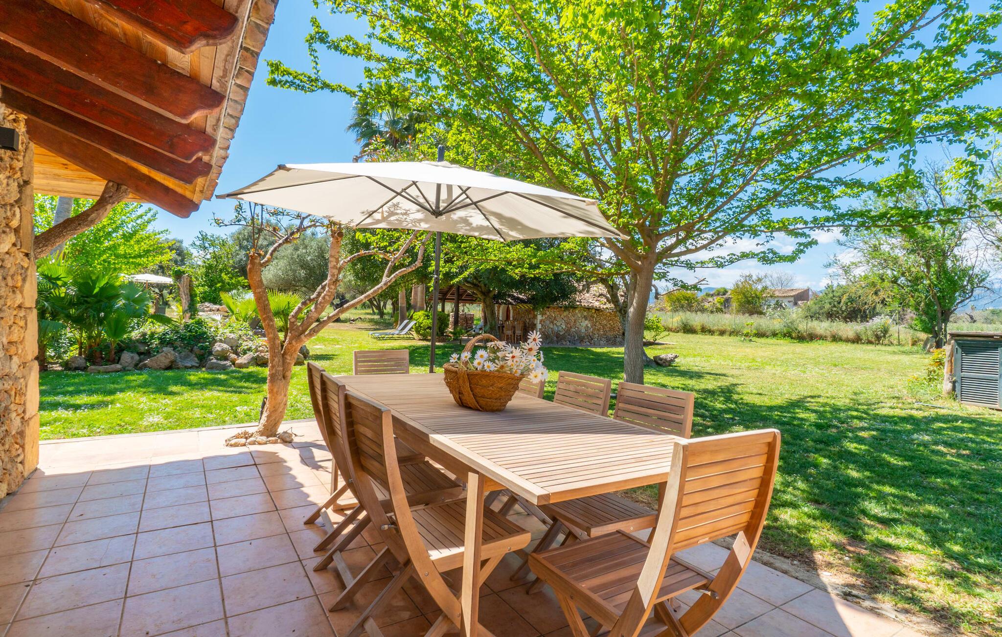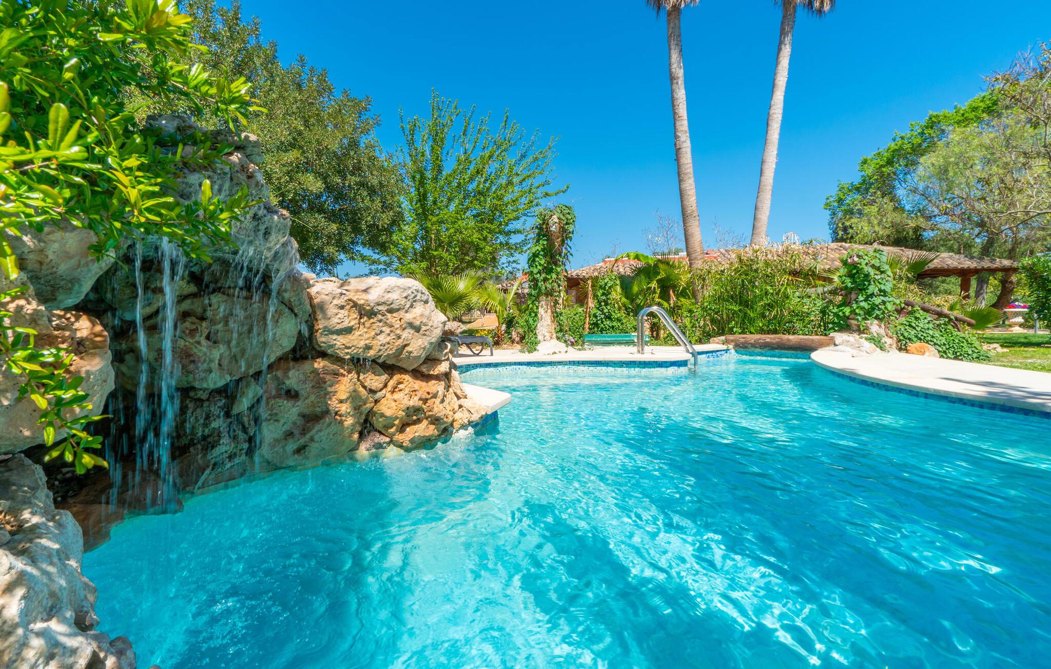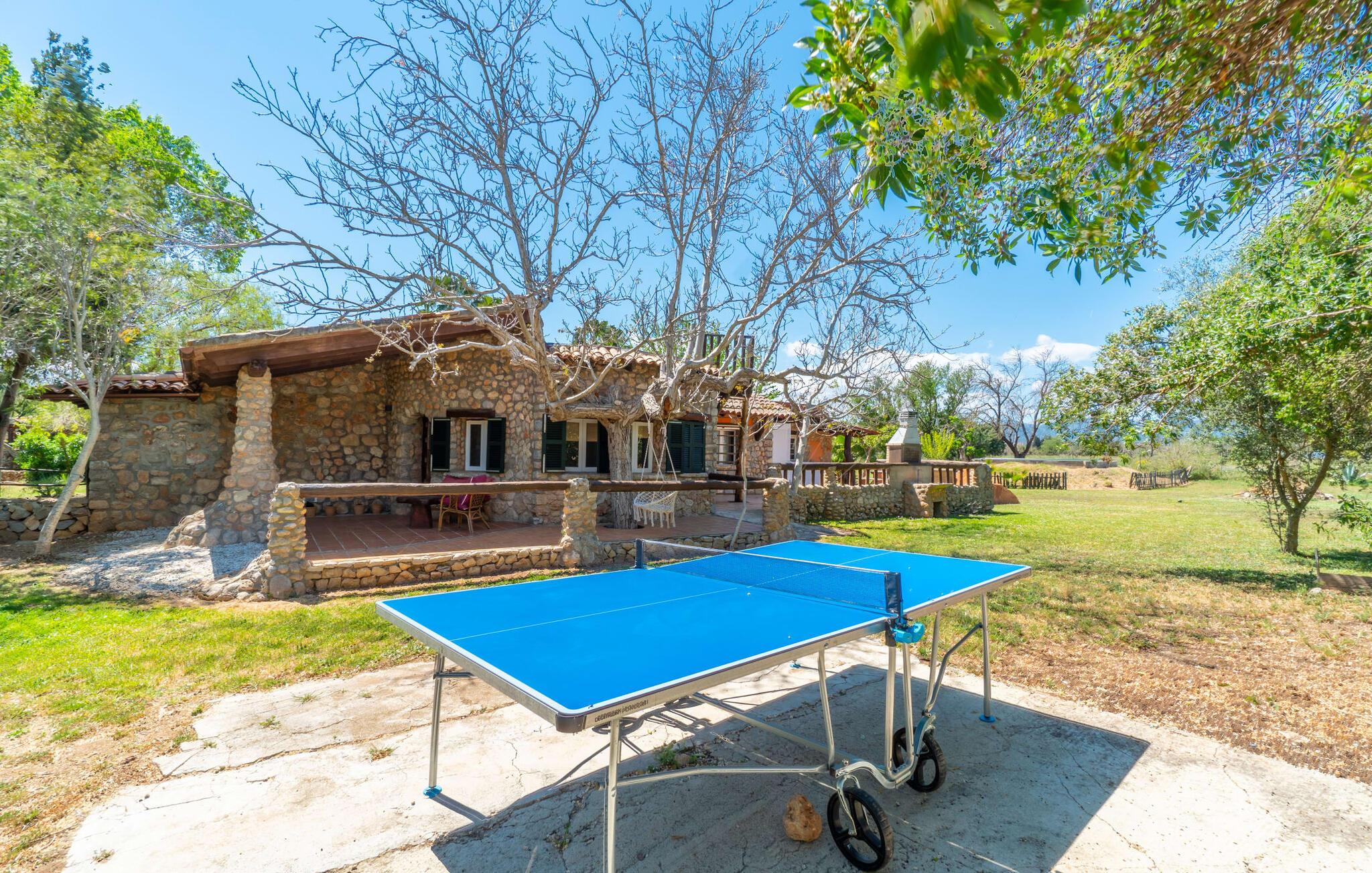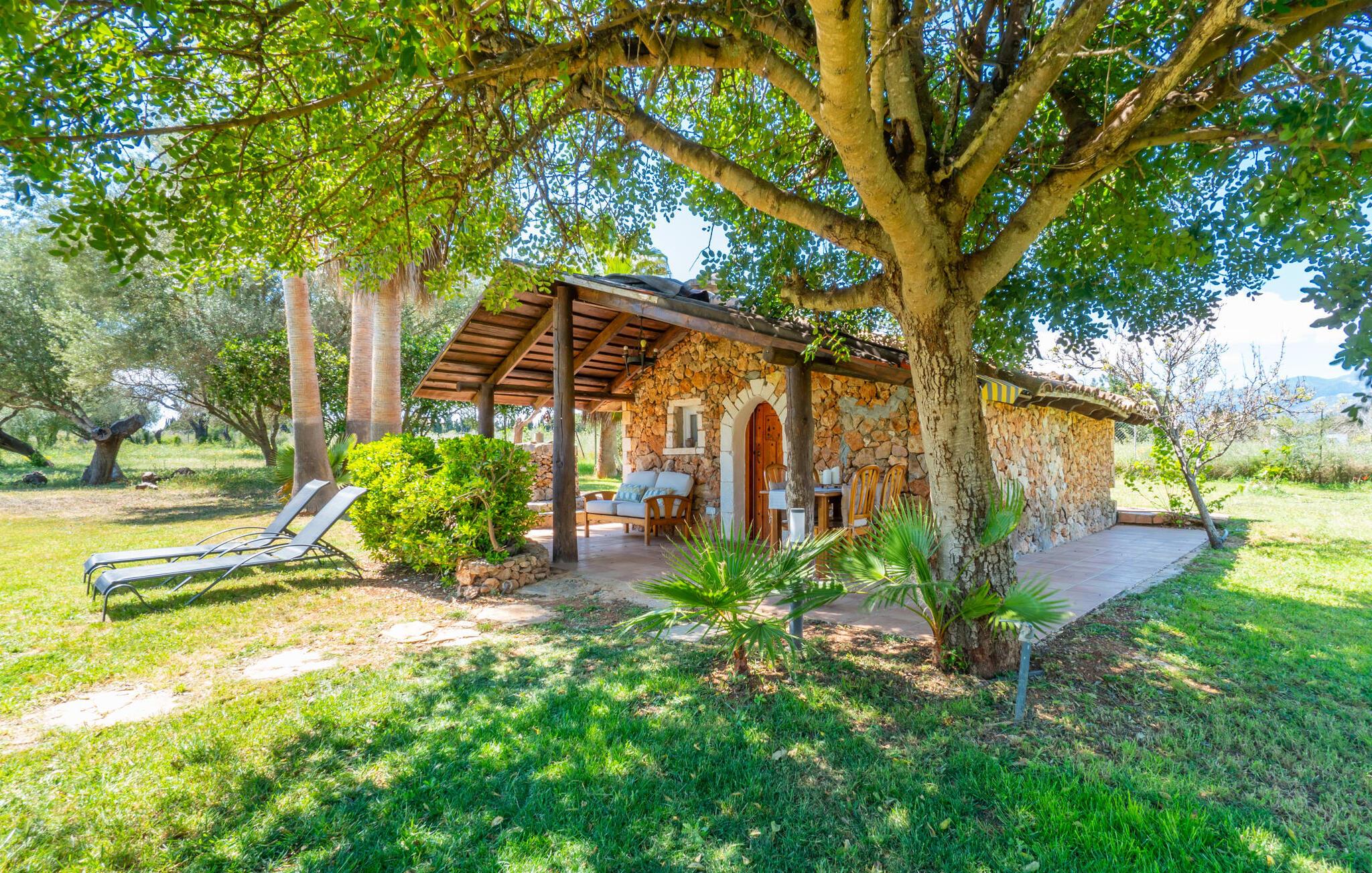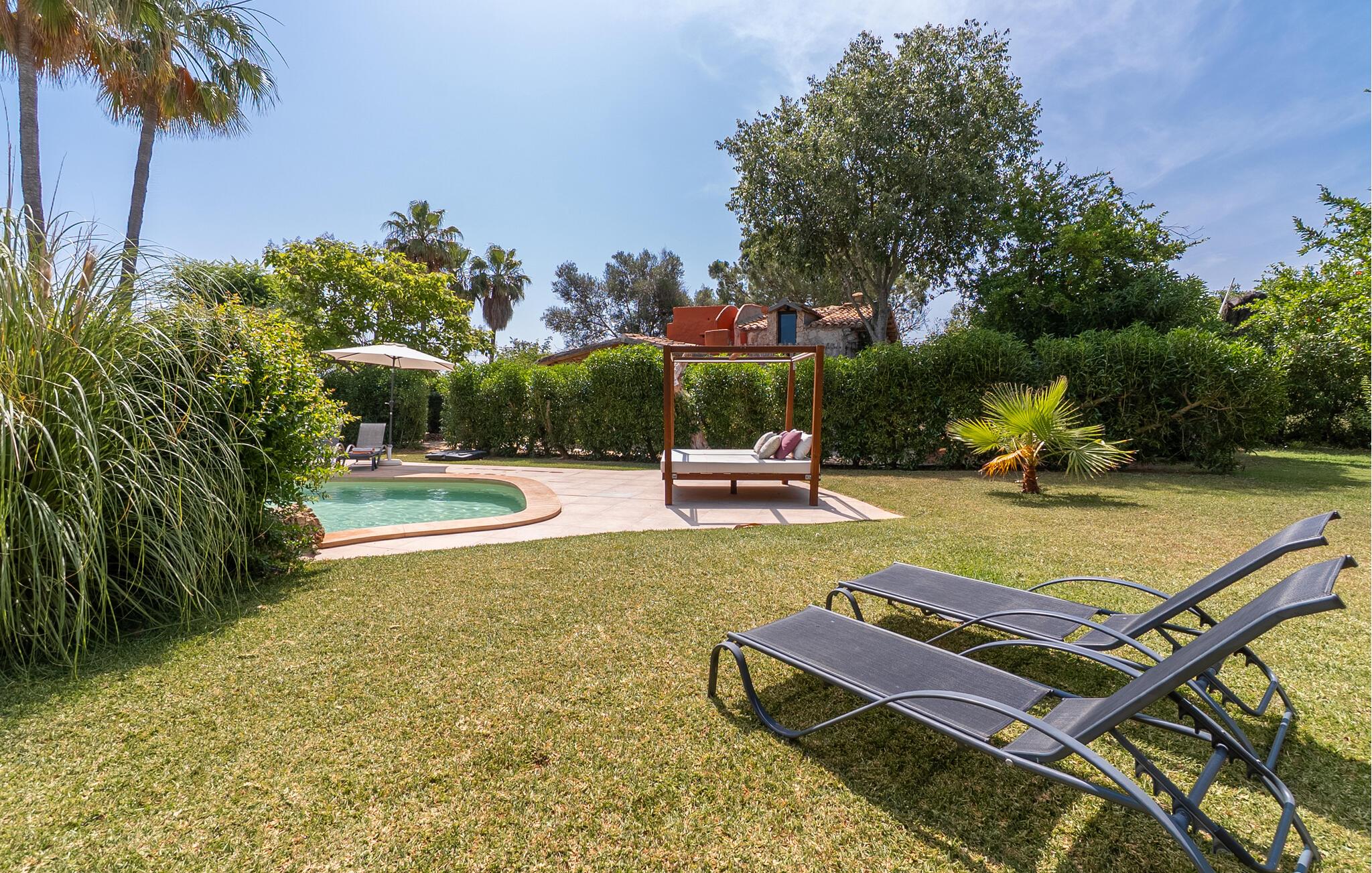 Landstedet "Ca Na Marlis" er ideelt, hvis I ønsker at tilbringe en afslappende ferie med gode venner på Mallorca. Bygningernes arkitektur kan minde om det nordlige Spanien, hvilket ikke er tilfældigt: De tilhørte engang en asturisk restaurant. Ejendommen er blevet nænsomt restaureret og omdannet til tre separate og komfortable boligenheder, fordelt på en afsondret havegrund med masser af græsplæne, fortryllende skyggefulde områder og en eksotisk designet pool med en lille grotte og vandfald. Der er masser af komfortable liggestole og siddepladser til læsning, solbadning og afslapning. Hvert hus har en individuelt designet terrasse. Det indre af hovedhuset og de to bungalower er oversvømmet med lys og indrettet i en moderne landlig stil. Hovedhuset har en stue, en spisestue, et moderne køkken med en anden spiseplads og tre rummelige soveværelser, hvoraf to har eget badeværelse. I tilknytning til huset finder I en skøn lounge, flere terrasser og en grillplads. Hver af de to bungalower har et dobbeltværelse med eget badeværelse. Den tredje bungalow med rustik indretning har ikke et soveværelse. Der er et lille fitnessrum, en hyggelig stue med pejs, en lille bar og et værelse med spil og et bordfodboldbord. Her kan I skabe jeres egen feststemning uden at skulle forlade jeres sommerhus på Mallorca. Feriehuset ligger kun 1 km fra Inca. Der er en paddlebane og flere tennisbaner i umiddelbar nærhed. Herfra kan I nå de lange, hvide strande på nordøstkysten på cirka 25 minutter i bil.