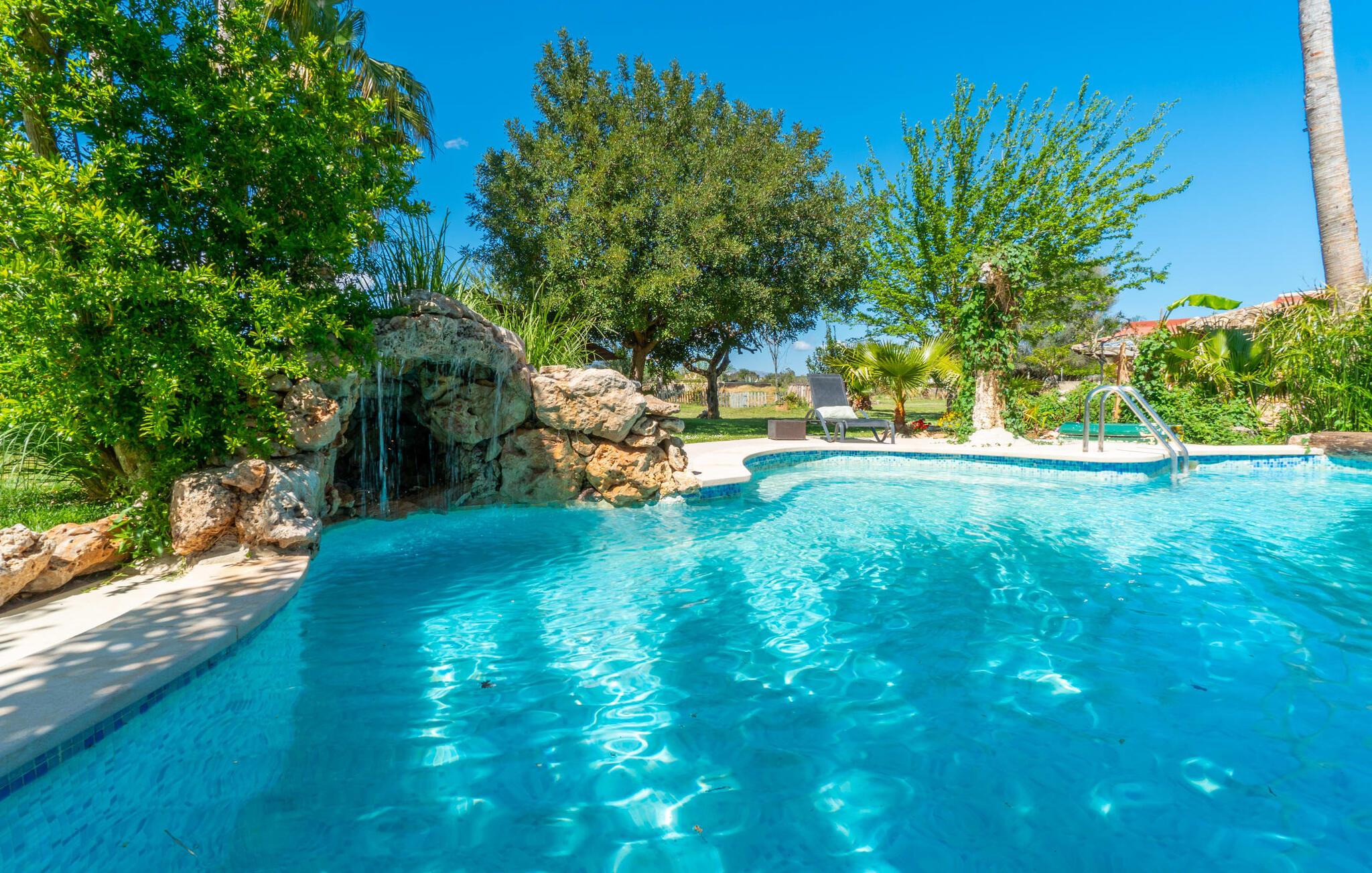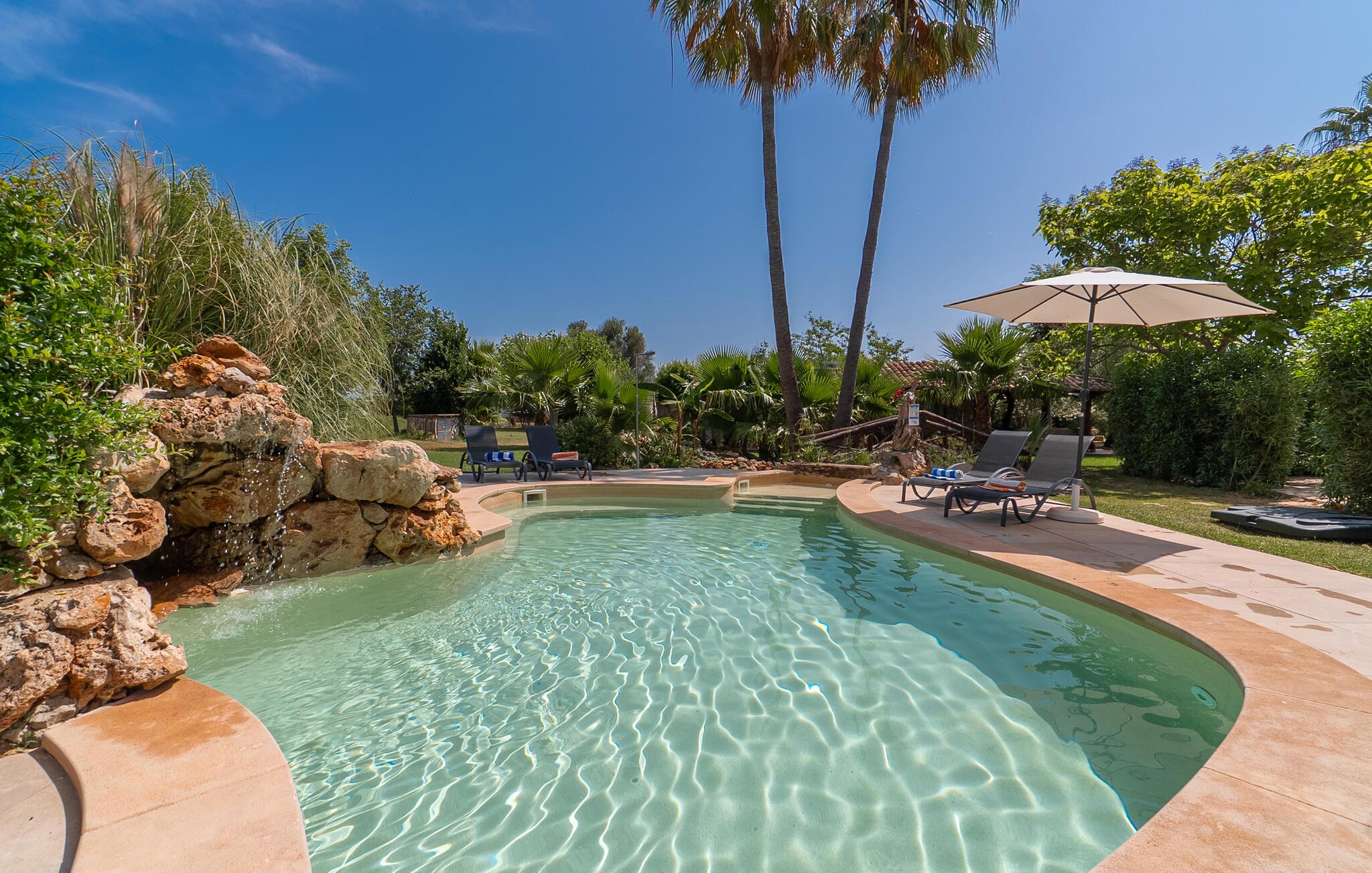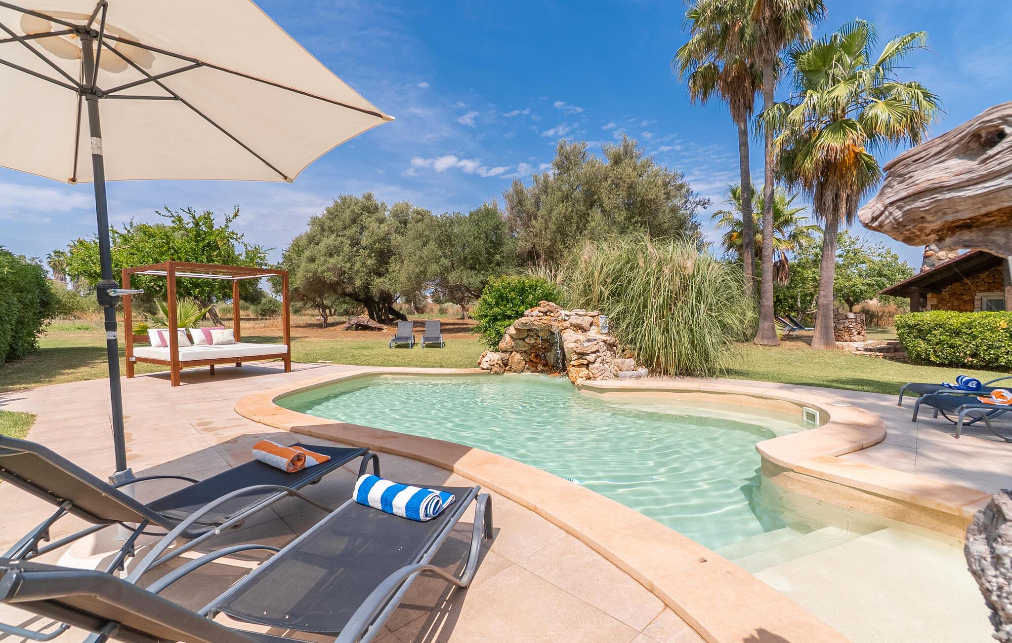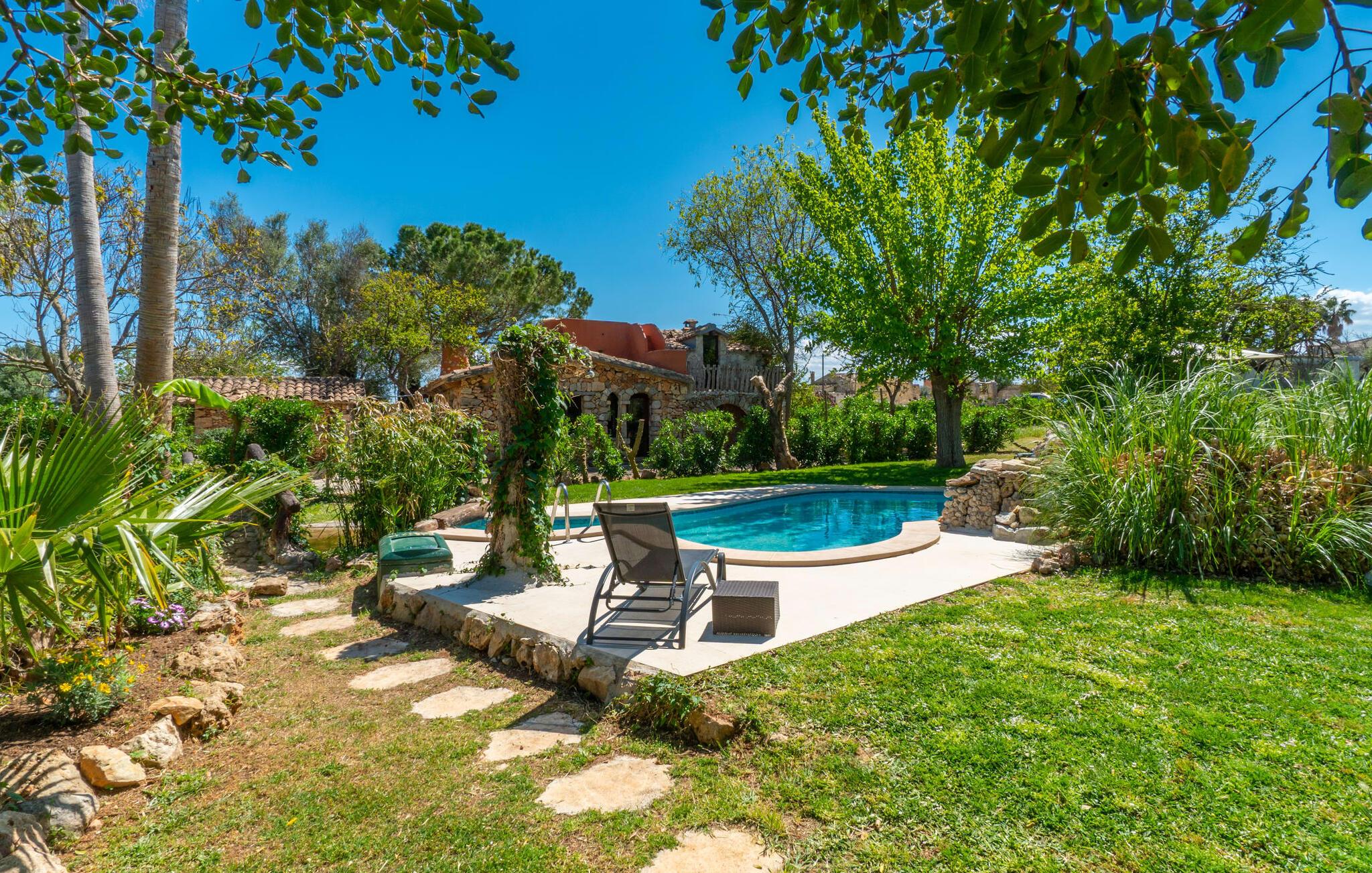 Landstedet "Ca Na Marlis" er ideelt, hvis I ønsker at tilbringe en afslappende ferie med gode venner på Mallorca. Bygningernes arkitektur kan minde om det nordlige Spanien, hvilket ikke er tilfældigt: De tilhørte engang en asturisk restaurant. Ejendommen er blevet nænsomt restaureret og omdannet til tre separate og komfortable boligenheder, fordelt på en afsondret havegrund med masser af græsplæne, fortryllende skyggefulde områder og en eksotisk designet pool med en lille grotte og vandfald. Der er masser af komfortable liggestole og siddepladser til læsning, solbadning og afslapning. Hvert hus har en individuelt designet terrasse. Det indre af hovedhuset og de to bungalower er oversvømmet med lys og indrettet i en moderne landlig stil. Hovedhuset har en stue, en spisestue, et moderne køkken med en anden spiseplads og tre rummelige soveværelser, hvoraf to har eget badeværelse. I tilknytning til huset finder I en skøn lounge, flere terrasser og en grillplads. Hver af de to bungalower har et dobbeltværelse med eget badeværelse. Den tredje bungalow med rustik indretning har ikke et soveværelse. Der er et lille fitnessrum, en hyggelig stue med pejs, en lille bar og et værelse med spil og et bordfodboldbord. Her kan I skabe jeres egen feststemning uden at skulle forlade jeres sommerhus på Mallorca. Feriehuset ligger kun 1 km fra Inca. Der er en paddlebane og flere tennisbaner i umiddelbar nærhed. Herfra kan I nå de lange, hvide strande på nordøstkysten på cirka 25 minutter i bil.