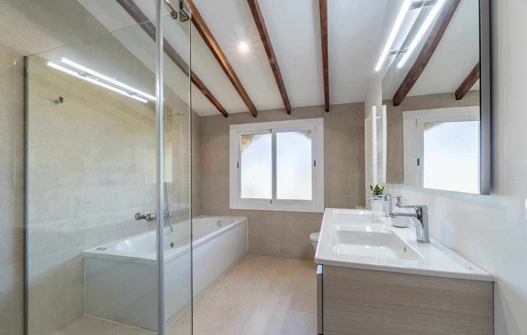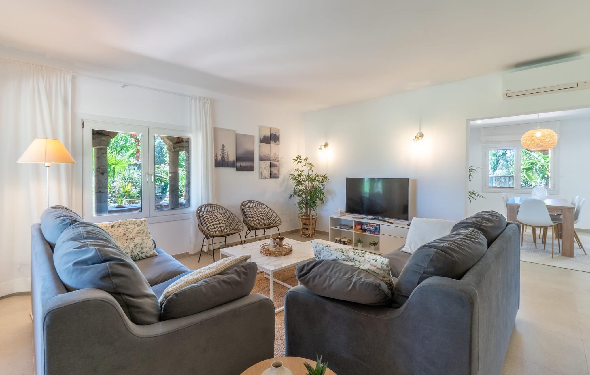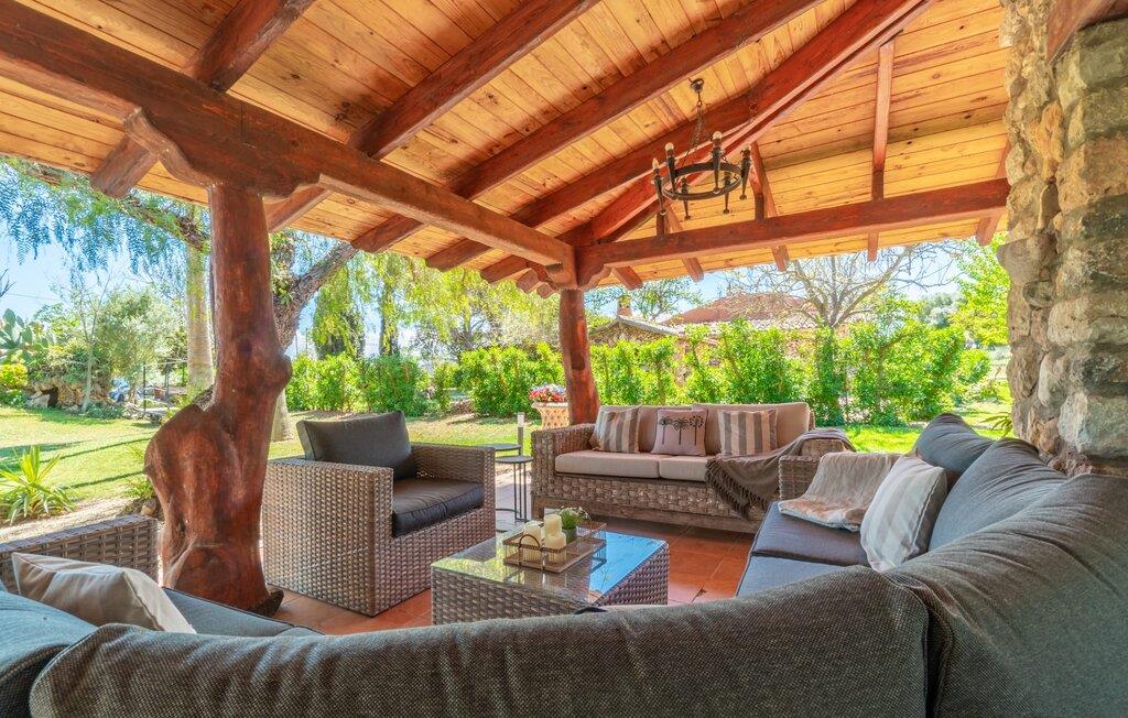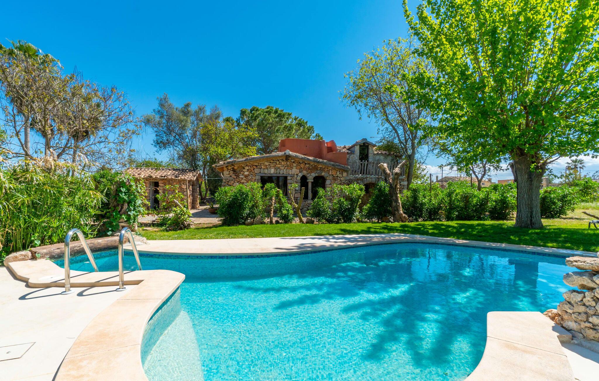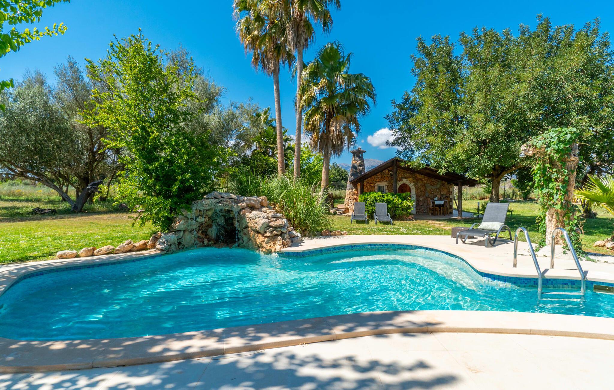 Landstedet "Ca Na Marlis" er ideelt, hvis I ønsker at tilbringe en afslappende ferie med gode venner på Mallorca. Bygningernes arkitektur kan minde om det nordlige Spanien, hvilket ikke er tilfældigt: De tilhørte engang en asturisk restaurant. Ejendommen er blevet nænsomt restaureret og omdannet til tre separate og komfortable boligenheder, fordelt på en afsondret havegrund med masser af græsplæne, fortryllende skyggefulde områder og en eksotisk designet pool med en lille grotte og vandfald. Der er masser af komfortable liggestole og siddepladser til læsning, solbadning og afslapning. Hvert hus har en individuelt designet terrasse. Det indre af hovedhuset og de to bungalower er oversvømmet med lys og indrettet i en moderne landlig stil. Hovedhuset har en stue, en spisestue, et moderne køkken med en anden spiseplads og tre rummelige soveværelser, hvoraf to har eget badeværelse. I tilknytning til huset finder I en skøn lounge, flere terrasser og en grillplads. Hver af de to bungalower har et dobbeltværelse med eget badeværelse. Den tredje bungalow med rustik indretning har ikke et soveværelse. Der er et lille fitnessrum, en hyggelig stue med pejs, en lille bar og et værelse med spil og et bordfodboldbord. Her kan I skabe jeres egen feststemning uden at skulle forlade jeres sommerhus på Mallorca. Feriehuset ligger kun 1 km fra Inca. Der er en paddlebane og flere tennisbaner i umiddelbar nærhed. Herfra kan I nå de lange, hvide strande på nordøstkysten på cirka 25 minutter i bil.