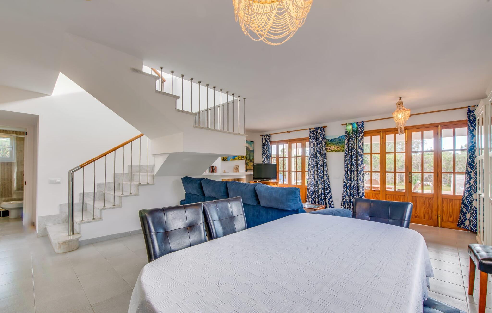 De varme solstråler glitrer på pooloverfladen, en blid vind kærtegner ejendommen og de blidt bølgende persianas. Den blå himmel, oversået med blide hvide skyer, strækker sig over den lyse hvide villa. Brisen bærer havets salt; Ikke så mærkeligt, for ejendommen "Ca Na Martina" ligger afsondret i en urbanisering nær Middelhavet. Dette forklarer også det maritime farveskema i den to-etagers villa. Ejendommen er omkranset af en grøn hæk. Den 30 m² store pool er placeret midt på en munter og frodig grøn græsplæne. I skal blot placere liggestolene på jeres yndlingssted. Hvis I foretrækker at bruge jeres tid udendørs, vil den overdækkede terrasse med det lange spisebord helt sikkert glæde jer. Her kan I nyde ethvert måltid på dagen, lige fra morgenmad og en let frokost til en hyggelig grillaften om aftenen, for derefter at afslutte dagen med et glas vin eller en anden kølig drink. Bagefter kan I trække jer tilbage til det indre af den smarte villa i hvid stil med et roligt sind og sanser og nyde en behagelig nattesøvn. De talrige trægitterdøre giver interiøret en nærmest sensuel atmosfære. Den usædvanligt lyse planløsning med hvidmalede vægge og døre og lysegrå gulvfliser giver villaen den æteriske fornemmelse af et strandhus. Fra terrassen når I direkte ind i det åbne, airconditionerede opholds- og spiseområde med et behageligt opholdsområde foran pejsen. Bliv underholdt af satellit-tv og dvd-afspiller. Spisepladsen er placeret foran køkkenet, som er lille, men stadig har alt hvad I behøver for komfortabel selvforplejning. Huset er ideelt til to familier, hver med en hel etage til deres rådighed. De tre trendy bruserum med brusekabine sørger også for en afslappet stemning om morgenen, for de fleste nyder ikke at skulle stå i kø til badeværelset. En trappe fører fra stuen til øverste etage, hvor yderligere to afslappende stuer med masser af opbevaringsplads i hvide skabe venter gæsterne. Et andet højdepunkt er tagterrassen. Det sætter prikken over i'et på "Ca Na Martina" og gør det til et så attraktivt rejsemål – ikke mindst takket være dens enestående beliggenhed. Cala D'Or - lige så attraktiv som den gyldne bugt, der giver den sit navn. Hvide villaer, et hyggeligt kvarter, fjordlignende bugter med forrevne kyststrækninger og en rigtig god infrastruktur med talrige indkøbsmuligheder, restauranter og barer giver jer et hjemligt miljø. “Ca Na Martina” ligger midt i det livlige Es Forti-kvarter. Det betyder også, at I i stedet for at køre bil, kan gå til en hyggelig bar og nyde en drink med udsigt over havet eller besøge en restaurant for en romantisk middag. At slentre rundt får jer til at føle, at I er på ferie. Og her vil det helt sikkert være en af jeres yndlingsbeskæftigelser, en gåtur langs molerne i den nærliggende lystbådehavn eller en gåtur op til fæstningen. Det er selvfølgelig også værd at tage en lejebil, hvis I vil lære landet og dets befolkning at kende. "Ca Na Martina" tilbyder jer en række muligheder for at opfylde jeres individuelle ferieønsker. Det eneste spørgsmål tilbage er: Hvornår tager vi afsted? "Ca Na Martina", den strålende hvide poolvilla med en lille have, er komfortabelt beliggende i gadelandskabet i den elegante kystby Cala D'Or. Den private ejendom er beliggende i hjertet af landsbyen i Es Forti-distriktet, så shopping og restauranter er inden for nem gåafstand. Havet ligger kun 200 m væk i luftlinje, og smukke badebugter som Caló d'es Pou ligger kun et stenkast væk.