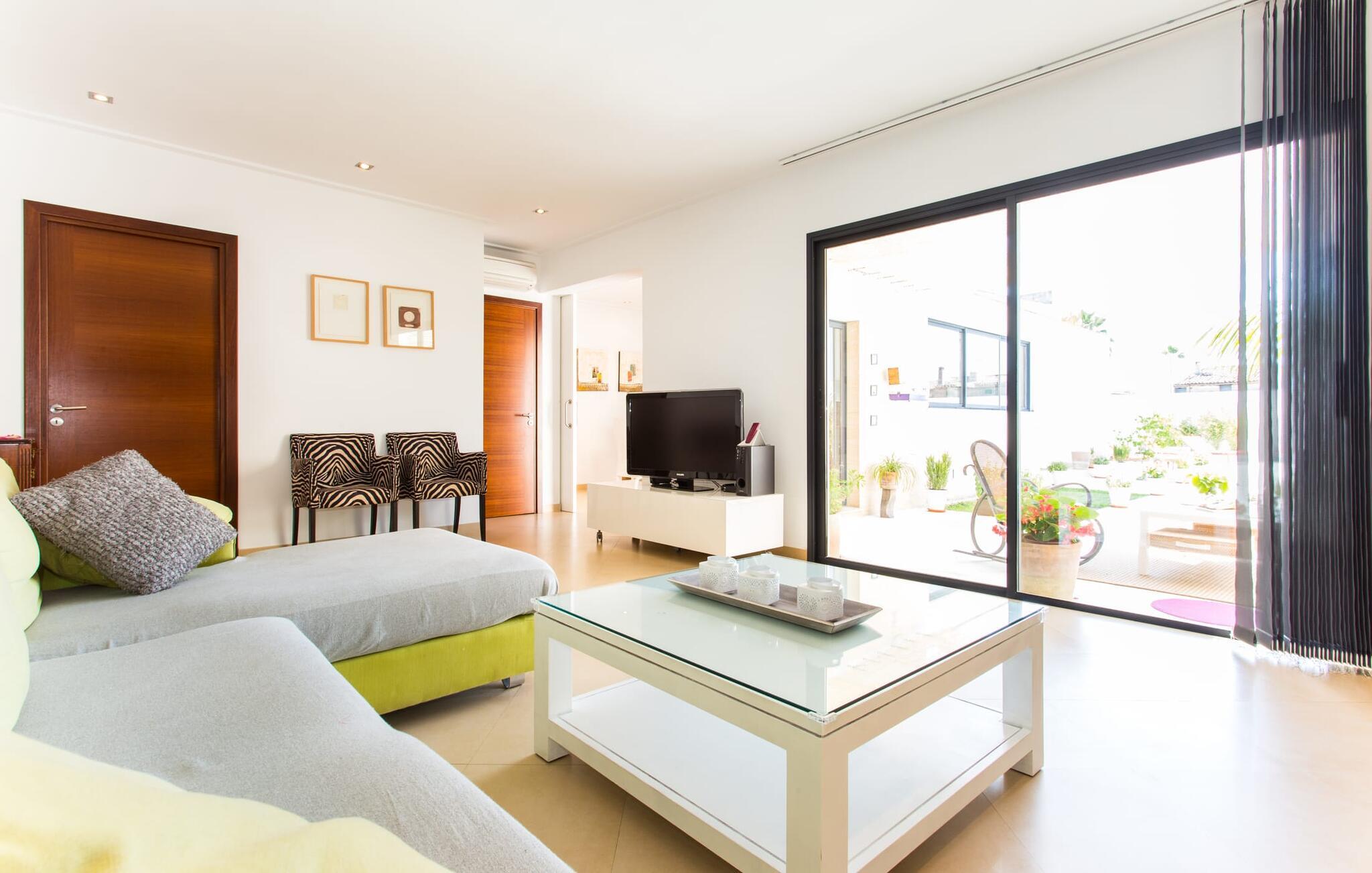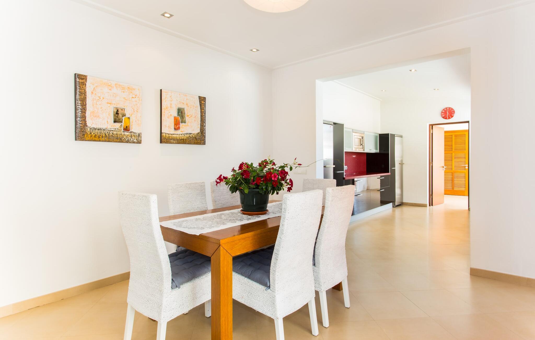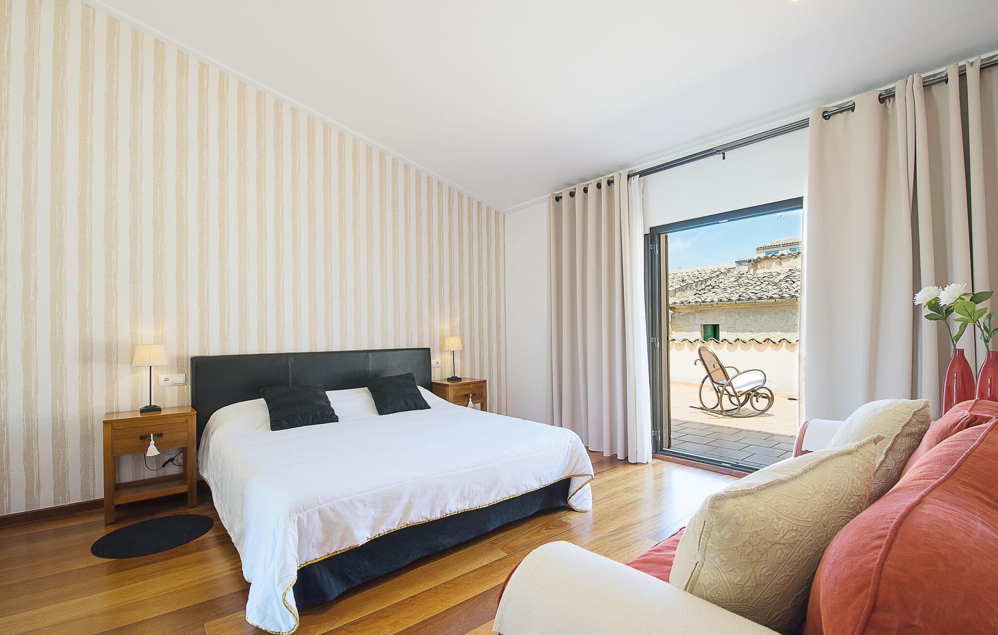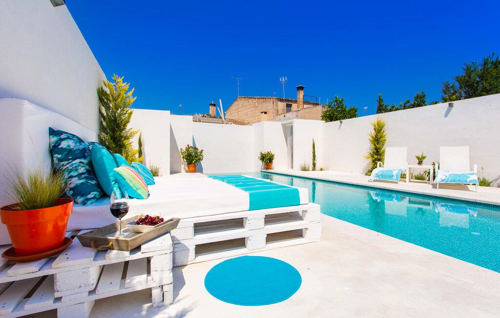 Kunne I tænke jer at holde ferie i et autentisk mallorcansk hus, men stadig være privat og nyde god infrastruktur? Så er det værd at kigge nærmere på. Villaen "Ca Na Molinera" kombinerer ikke kun disse kvaliteter, men supplerer dem med en moderne og meget stilfuld atmosfære, hvor I helt sikkert vil føle jer godt tilpas. Feriehuset ligger direkte i den centrale Pla de Mallorca-region i landsbyen Sant Joan, som byder på en typisk, næsten original flair. Villaen ligner en oase, der skiller sig ud fra omgivelserne takket være dens stilfulde indretning. Ved første øjekast virker alt meget lyst og strålende, og det maleriske udendørsområde inviterer jer til at tilbringe lange, fornøjelige timer udendørs. Et par middelhavsplanter, nogle i krukker, pynter på de ellers enkle og overvejende hvide områder. Der er en fantastisk chill-out zone lavet af pallemøbler lige ved siden af huset. Her kan I slappe af hele dagen lang, ideelt med en kølig drink og måske en forfriskende snack. Farverige puder pifter tingene op med lyse toner. Den brede sti til poolen fører først forbi andre afslapningsområder, som er perfekte steder at slappe af udendørs og med garanti vil være populære blandt alle rejsende. Poolen er meget stor til et rækkehus. I kan svømme rigtige runder over en længde på 12 m – har I nogensinde gjort dette, tidligt om morgenen, når dagens lys og livet begynder at vågne omkring dig? Hvis ikke, så skal I bestemt gøre det og nyde denne helt særlige form for luksus. Der er komfortable liggestole til rådighed, så I kan slappe af bagefter. Der er også et andet højdepunkt ved poolen - en slags renoveret garage, hvor I finder et fantastisk udekøkken med spisebord og køleskab. I denne stilfulde atmosfære med en smuk udsigt over poolen kan I spise sammen og nyde en grillsession om aftenen. Husets indre matcher det ydres æstetik. Moderne, behageligt farverig indretning skaber en meget stilfuld atmosfære, hvor I med det samme ønsker at tilbringe tid. Ekstraordinære arrangementer og individuelle stykker giver hele stemningen et ekstra individuelt præg. Bo i de rummelige værelser og skift frem og tilbage mellem de komfortable udendørs og indendørs områder, som I ønsker. I kan slappe perfekt af i den komfortable sofa i den store, lyse stue. Til underholdning er der et fladskærms-tv med satellitforbindelse og dvd-afspiller samt en højhastigheds internetforbindelse for at sikre jeres digitale forbindelse med venner og familie. Mellem opholds- og køkkenområderne er en spiseplads, der tilbyder en indbydende, eksklusiv fornemmelse for perfekte måltider. Køkkenet er et sandt blikfang med sit sorte og røde look: Her finder I plads nok til alt, hvad I skal bruge, så intet står i vejen for jeres selvforsyning. Der er også et soveværelse og et badeværelse på denne etage. Tager I den ekstravagante trappe op til øverste etage, kommer I til et soveværelse. Herfra kommer I ind i det andet værelse: et stort soveværelse med walk-in closet, en-suite badeværelse og privat terrasse. Der er også et andet badeværelse på dette niveau. Alle værelser er indrettet i elegant stil og har masser af plads. Elegante badeværelser giver plads til alle gæster og er udstyret med attraktive installationer og armaturer. Strygejern og hårtørrer er til rådighed i huset, så I behøver ikke at medbringe jeres eget hjemmefra. Den nærliggende landsby Petra (ca. 7 km) med sine gyldenbrune stenhuse minder om en drømmende by langt væk fra stress og jag. Sørg for at besøge det ugentlige marked og de små barer, caféer og restauranter i denne rolige by, som har udviklet en god infrastruktur, men stadig bevarer sin ro. Lloret de Vistalegre er også en attraktiv by og kun 15 minutter væk i bil. En tur til Inca (20 km) er også umagen værd. Den lille by Inca har en lang tradition inden for læder- og skohåndværk. Dette indbydende hus ligger midt i den smukke landsby Sant Joan - kun 7 km fra Petra, en lille, drømmende by, der har sin charme gennem både smukke gyder og gader omkranset af gamle bygninger. Sineu er også omkring 7 km væk. Et stort marked finder sted her hver onsdag morgen; Markedet i Sant Joan finder sted om torsdagen.