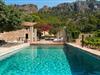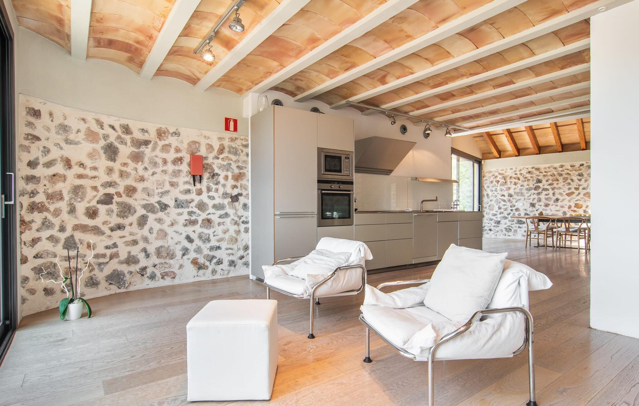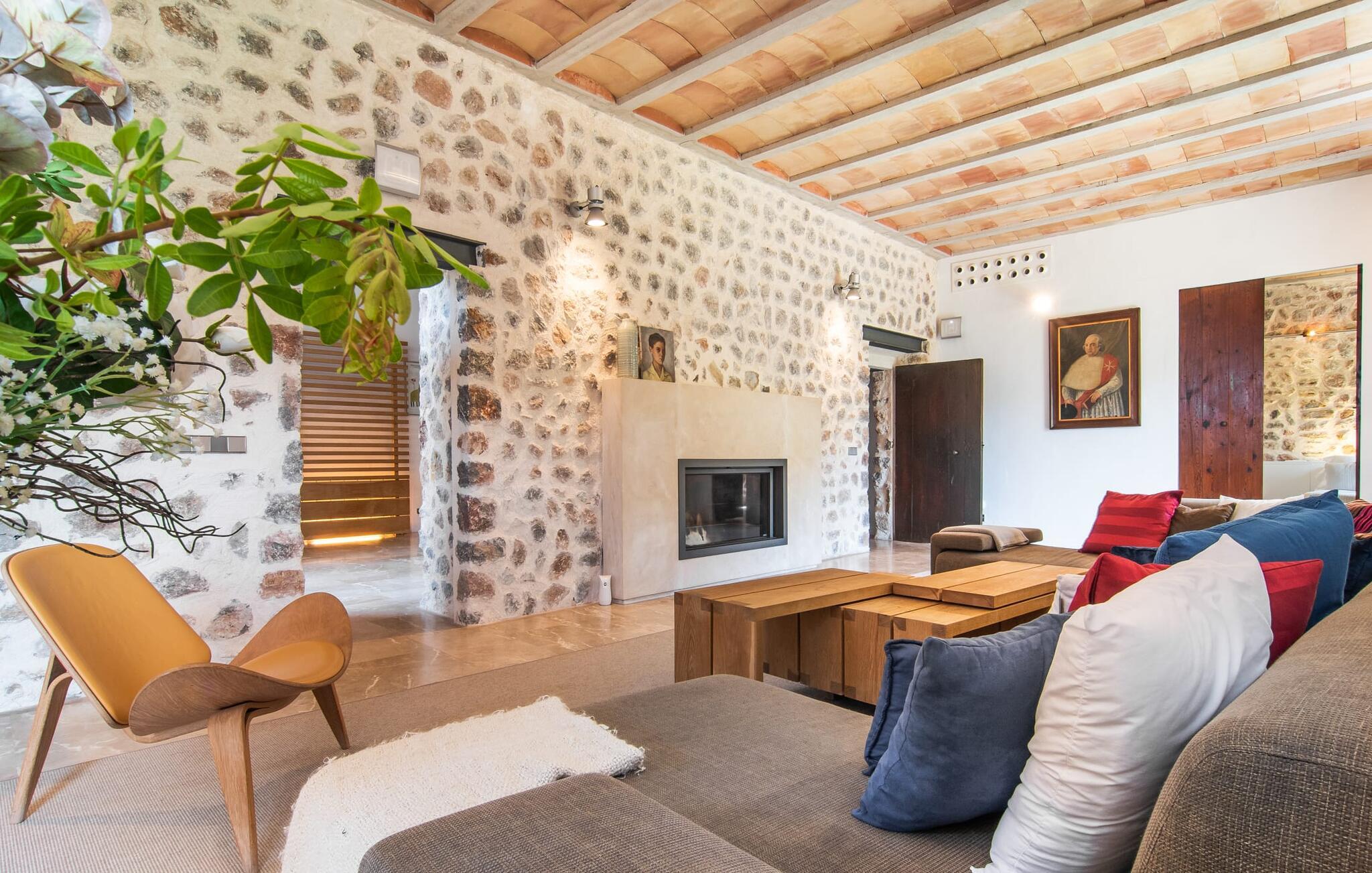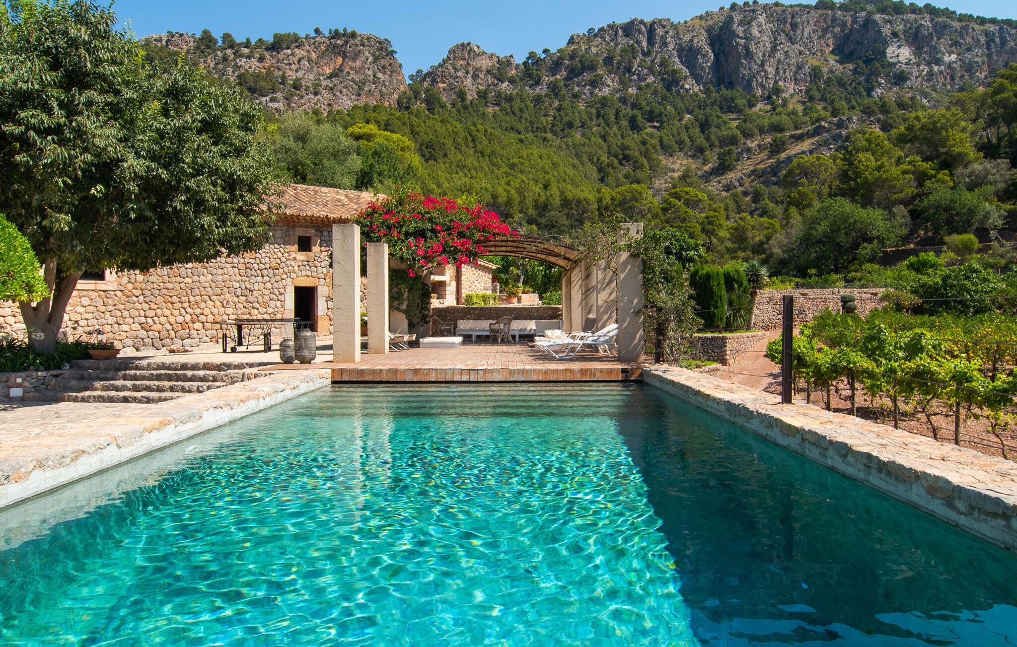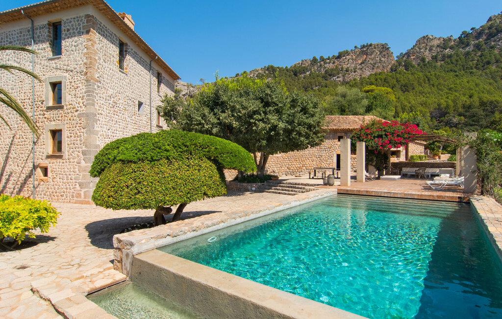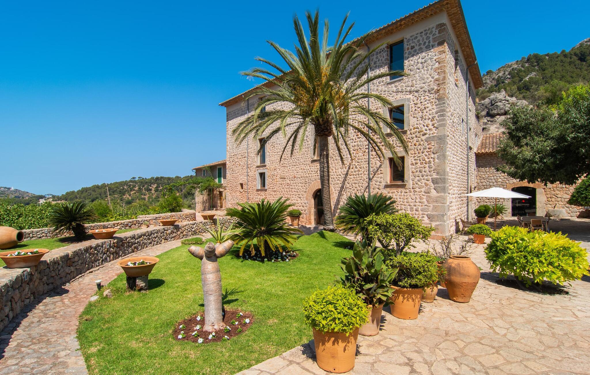 Kunne I tænke jer at tilbringe en uforglemmelig ferie med familie og venner? Det vidunderligt smukke og fantastisk beliggende bondehus “Ca S'Hereu del Puerto de Soller” i den nordvestlige del af Mallorca kan rumme op til tolv personer. Naturstensejendommen med den integrerede gamle oliemølle er ikke kun meget rummelig, men også rigtig smuk. Stuehuset blev totalrenoveret med stor indsats og smag og kombinerer i dag perfekt moderne komfort med traditionelle detaljer. Enhver, der elsker deres privatliv, er kommet til det rigtige sted, stuehuset ligger i en absolut rolig, landlig sydlig og afsondret beliggenhed. Der er forskellige meget velholdte terrasseområder rundt om huset - der er også tagterrasse - til afslapning. Hvis I har lyst, kan I spille et spil bordtennis eller tage en dukkert i poolen og nyde den unikke udsigt over de omkringliggende grønne bakker. I kan også tage afslappende gåture på den enorme ejendom med terrassehave og måske tage et kig på jeres egen appelsinlund. I kan parkere jeres lejebil direkte ved huset på grusparkeringspladsen eller under den skyggefulde carport. Et bondehus på Mallorca som noget ud af en billedbog - eller fra et blankt boligmagasin: naturstensgulve og -vægge overalt, kombineret med masser af hvide og naturlige farver, typiske mallorcanske antikke møbler, med en masse stil, suppleret med enkle, moderne designer stykker og smart placerede lamper, der bringer alt til sit bedste, flytter lyset. Huset strækker sig over 1. sal og har i alt tre overetager. Et særligt træk: et par trin fører ned fra første sal. Der er flere rum hugget ind i klippen, hvoraf nogle stadig indeholder elementer fra den gamle oliemølle - i dag et behageligt sted at læse og slappe af. De diskret og smagfuldt designede soveværelser, hver med luksuriøse en-suite badeværelser, er fordelt på de tre øverste etager. På første og tredje sal inviterer rummelige køkkener udstyret med højkvalitetsapparater til at lave mad og spise sammen. På anden og tredje sal er der desuden to store stuer med indbydende sofaer og fjernsyn. For at holde denne smukke ejendom i top stand arbejder gartnere og viceværter så diskret som muligt i flere timer næsten hver dag. Det stilfuldt renoverede bondehus "Ca S'Hereu del Puerto de Soller" ligger i en absolut rolig nordvestlig beliggenhed, kun 3 km fra Port de Sóller og dens strand i den nordvestlige del af Mallorca. Fra jeres kæmpe ejendom med pool, terrasser og jeres egen appelsinlund kan I nyde en vidunderlig udsigt over det bakkede landskab.