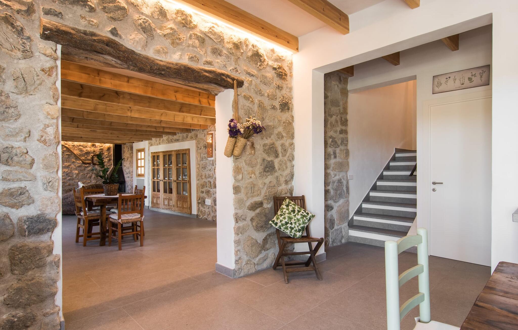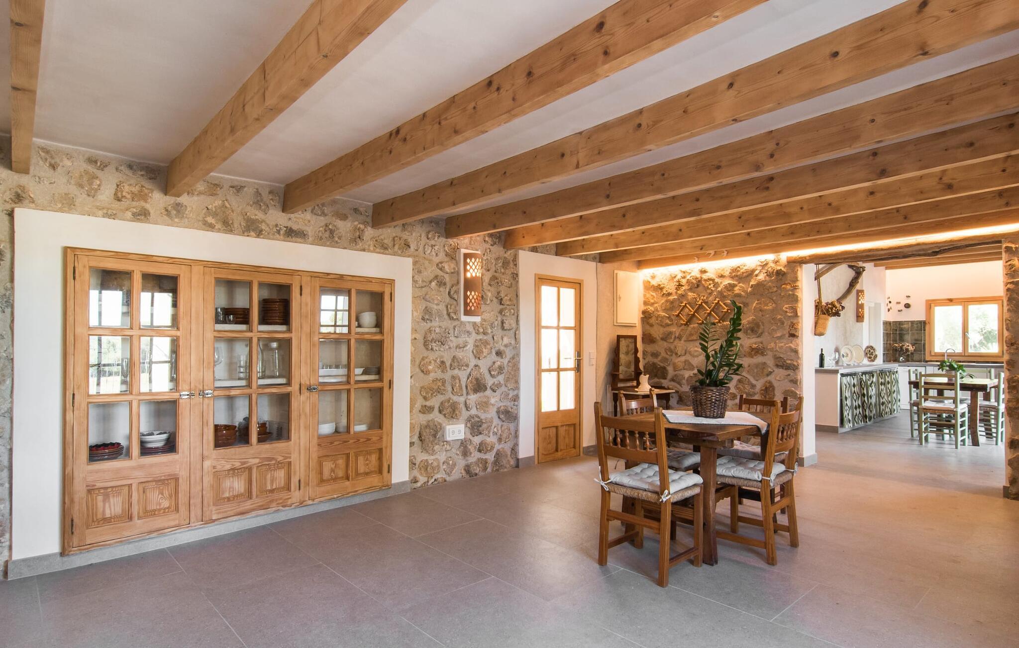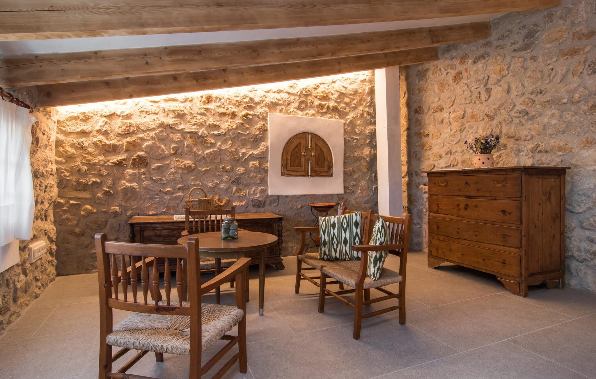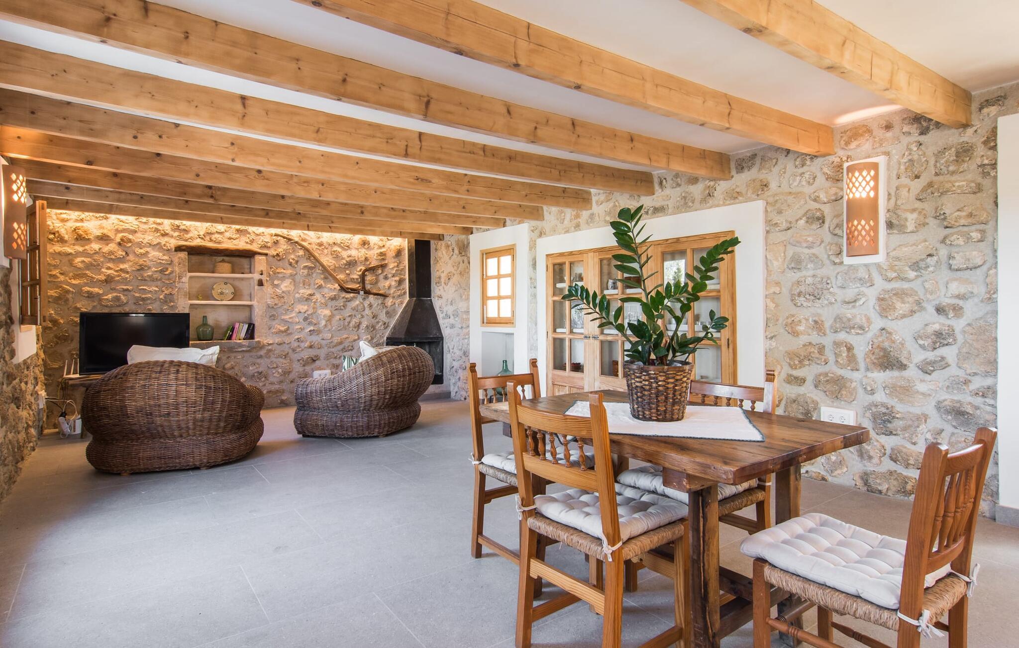 "Can Blai" byder på et rummeligt udendørsområde omgivet af frodige grønne områder, herunder majestætiske gamle træer, som giver de perfekte rammer for afslapning og kvalitetstid. Den charmerende terrasse, i skyggen af en vinstok, har et smukt spisebord, ideelt til morgenmad eller en eftermiddagskaffe med udsigt over poolen, let tilgængelig via en hjørnetrappe. Uanset om I nyder et glas vin på den rustikke bænk eller slapper af efter en tilfredsstillende dag, gør denne finca feriedrømme til virkelighed. Fincaen er stilfuld og rustik og kombinerer træ, smukke gulvfliser og smart belysning for at skabe en sand oase af velvære. Den rummelige stue/spisestue med hyggelig pejs og naturstensvægge byder på flere indbydende opholdssteder. Det fuldt udstyrede køkken med spisebord er perfekt til snacks eller en duftende kaffe. På øverste etage giver to komfortable soveværelser (det ene med enkeltsenge, det andet med en 1,5 m lang dobbeltseng) og to bruserum masser af privatliv og plads. Der er også et gæstetoilet i stueetagen. Nær kysten og i nærheden af indbydende byer som Canyamel, Artà og Cala Ratjada ligger fincaen "Ca'n Blai" i landlige omgivelser og er perfekt forbundet med infrastrukturen ad vej. Daglige indkøb, besøg på strand og caféer samt at gå ud om aftenen kan klares hurtigt og nemt herfra. Den fine sandstrand Canyamels ligger kun 4,6 km væk, og andre strande kan også nås hurtigt.