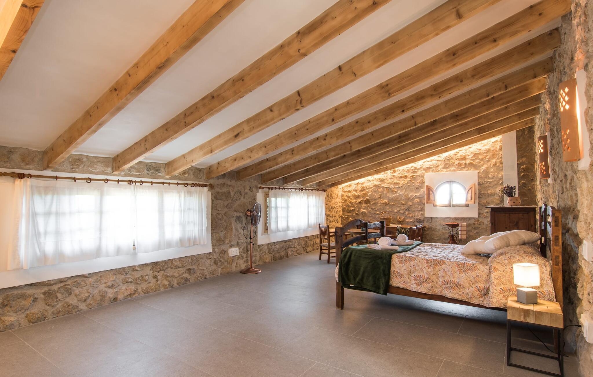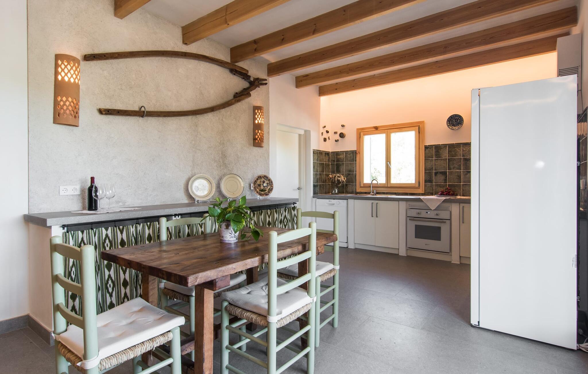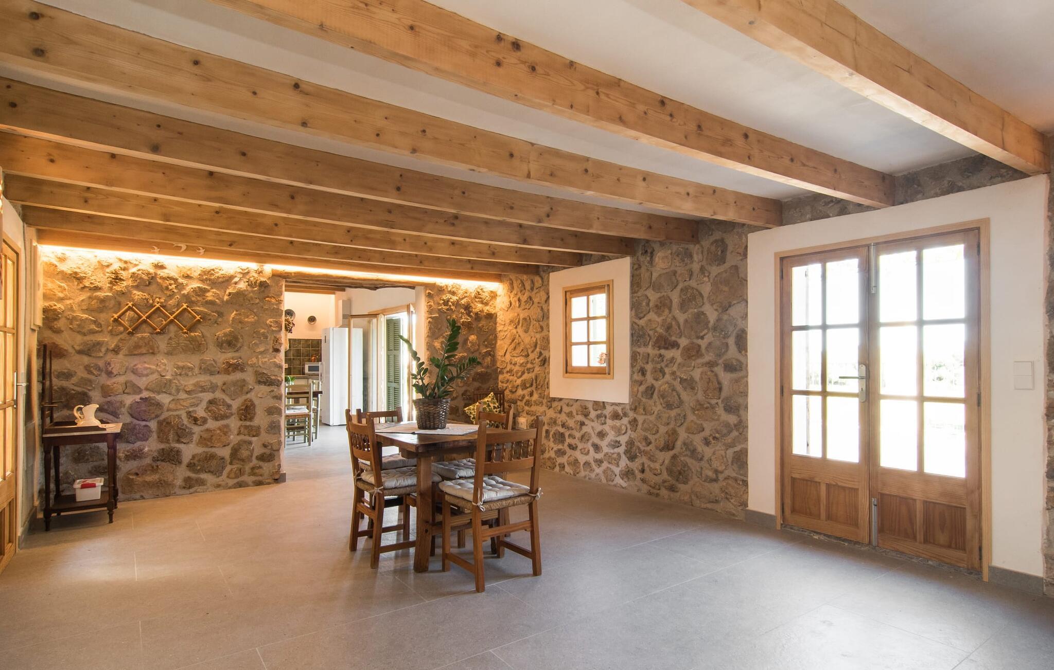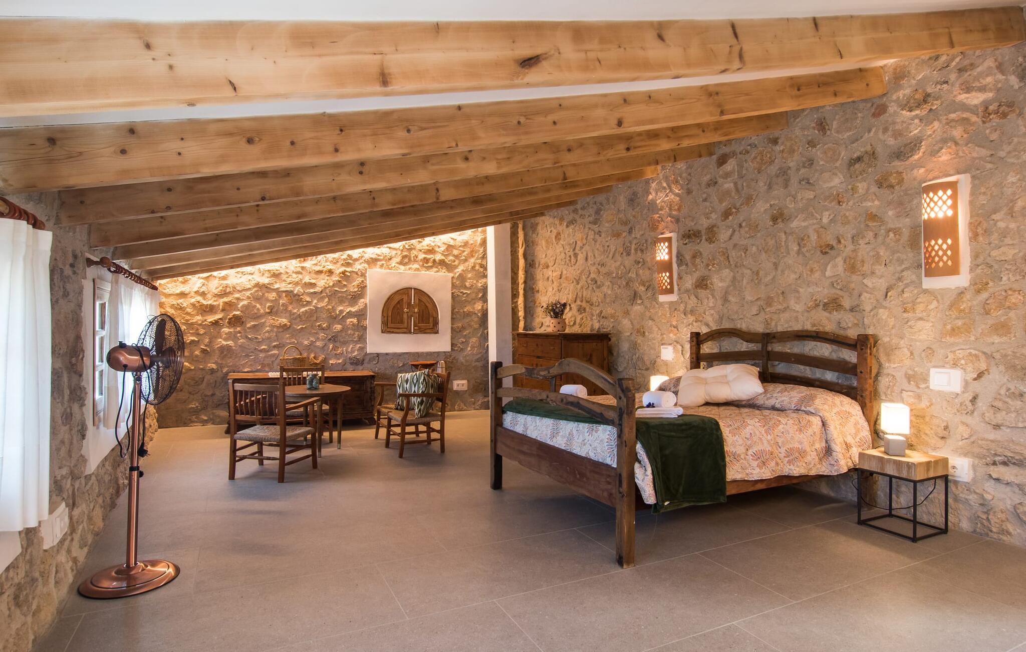"Can Blai" byder på et rummeligt udendørsområde omgivet af frodige grønne områder, herunder majestætiske gamle træer, som giver de perfekte rammer for afslapning og kvalitetstid. Den charmerende terrasse, i skyggen af en vinstok, har et smukt spisebord, ideelt til morgenmad eller en eftermiddagskaffe med udsigt over poolen, let tilgængelig via en hjørnetrappe. Uanset om I nyder et glas vin på den rustikke bænk eller slapper af efter en tilfredsstillende dag, gør denne finca feriedrømme til virkelighed. Fincaen er stilfuld og rustik og kombinerer træ, smukke gulvfliser og smart belysning for at skabe en sand oase af velvære. Den rummelige stue/spisestue med hyggelig pejs og naturstensvægge byder på flere indbydende opholdssteder. Det fuldt udstyrede køkken med spisebord er perfekt til snacks eller en duftende kaffe. På øverste etage giver to komfortable soveværelser (det ene med enkeltsenge, det andet med en 1,5 m lang dobbeltseng) og to bruserum masser af privatliv og plads. Der er også et gæstetoilet i stueetagen. Nær kysten og i nærheden af indbydende byer som Canyamel, Artà og Cala Ratjada ligger fincaen "Ca'n Blai" i landlige omgivelser og er perfekt forbundet med infrastrukturen ad vej. Daglige indkøb, besøg på strand og caféer samt at gå ud om aftenen kan klares hurtigt og nemt herfra. Den fine sandstrand Canyamels ligger kun 4,6 km væk, og andre strande kan også nås hurtigt.