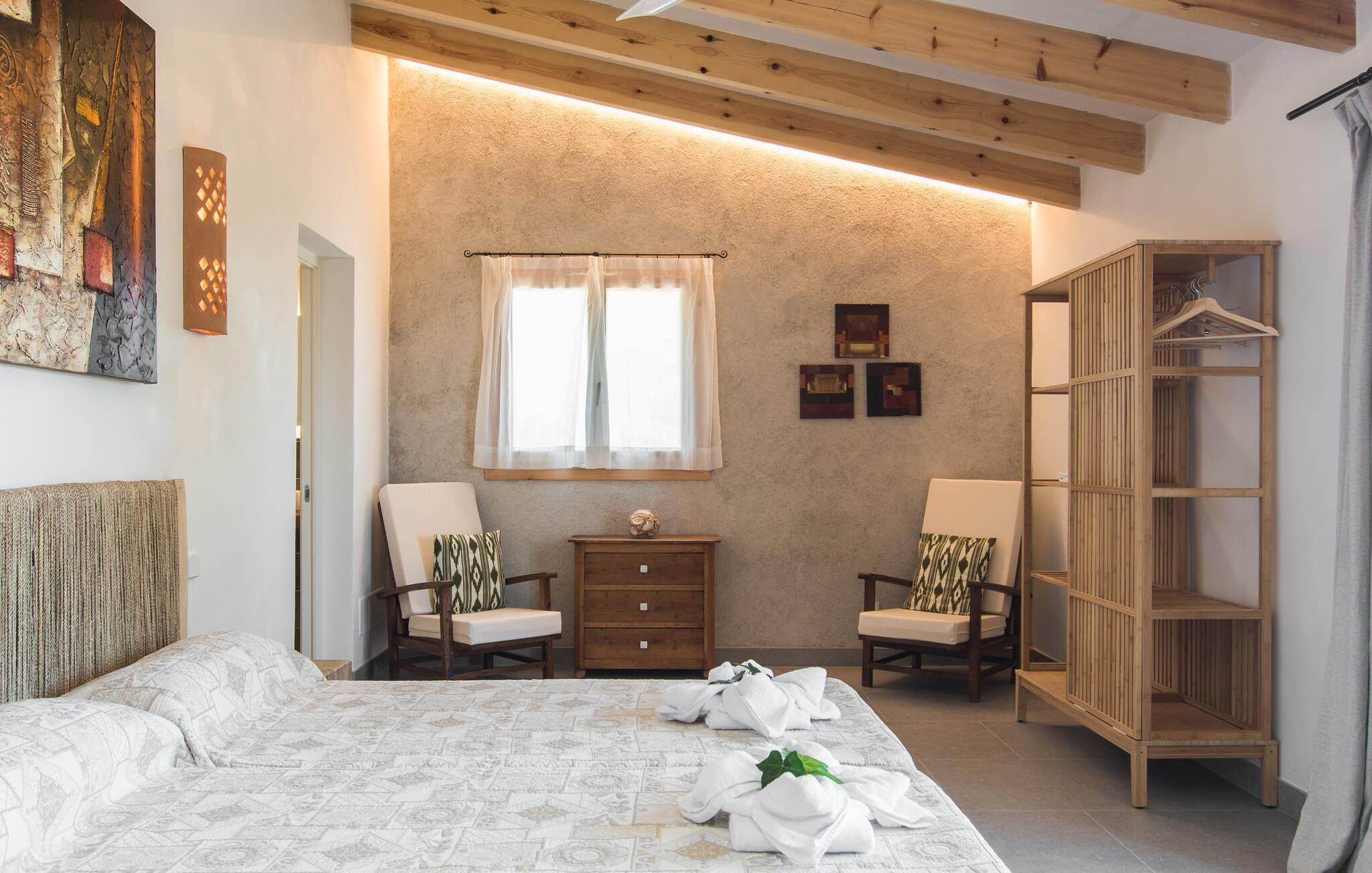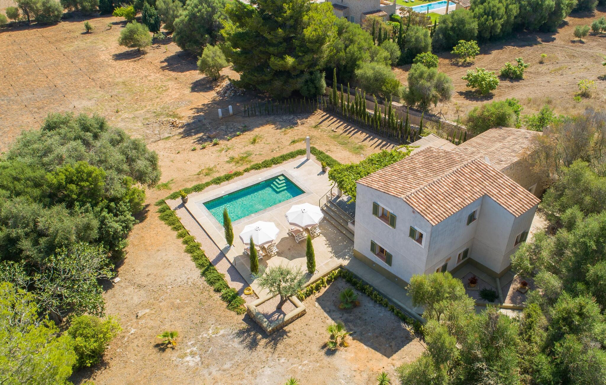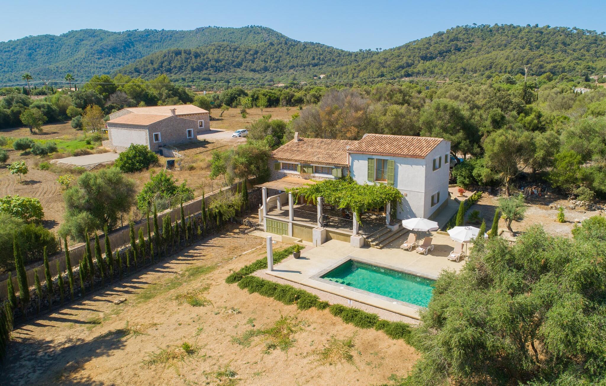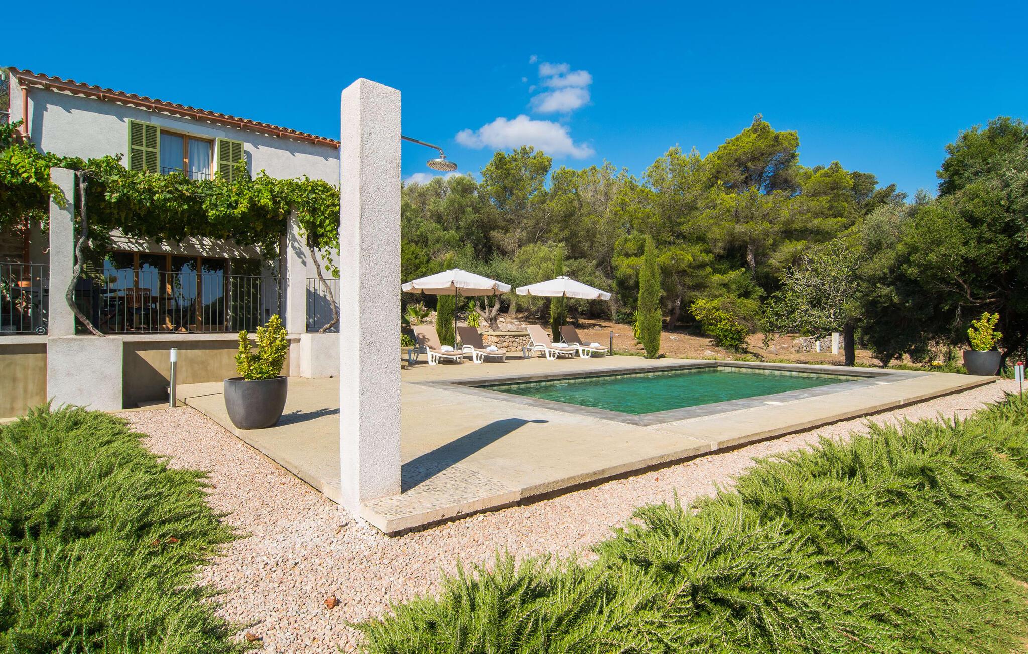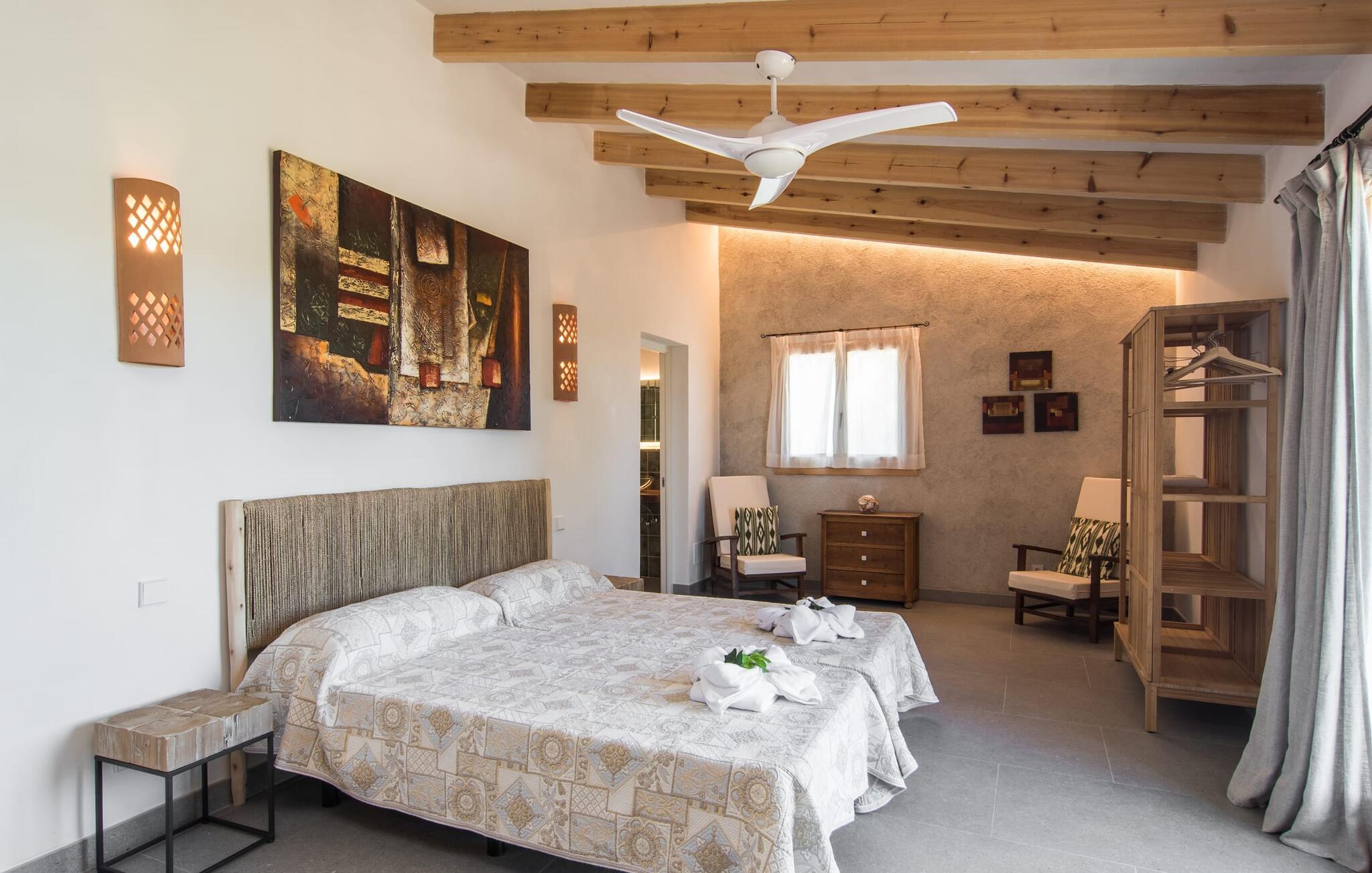 "Can Blai" byder på et rummeligt udendørsområde omgivet af frodige grønne områder, herunder majestætiske gamle træer, som giver de perfekte rammer for afslapning og kvalitetstid. Den charmerende terrasse, i skyggen af en vinstok, har et smukt spisebord, ideelt til morgenmad eller en eftermiddagskaffe med udsigt over poolen, let tilgængelig via en hjørnetrappe. Uanset om I nyder et glas vin på den rustikke bænk eller slapper af efter en tilfredsstillende dag, gør denne finca feriedrømme til virkelighed. Fincaen er stilfuld og rustik og kombinerer træ, smukke gulvfliser og smart belysning for at skabe en sand oase af velvære. Den rummelige stue/spisestue med hyggelig pejs og naturstensvægge byder på flere indbydende opholdssteder. Det fuldt udstyrede køkken med spisebord er perfekt til snacks eller en duftende kaffe. På øverste etage giver to komfortable soveværelser (det ene med enkeltsenge, det andet med en 1,5 m lang dobbeltseng) og to bruserum masser af privatliv og plads. Der er også et gæstetoilet i stueetagen. Nær kysten og i nærheden af indbydende byer som Canyamel, Artà og Cala Ratjada ligger fincaen "Ca'n Blai" i landlige omgivelser og er perfekt forbundet med infrastrukturen ad vej. Daglige indkøb, besøg på strand og caféer samt at gå ud om aftenen kan klares hurtigt og nemt herfra. Den fine sandstrand Canyamels ligger kun 4,6 km væk, og andre strande kan også nås hurtigt.