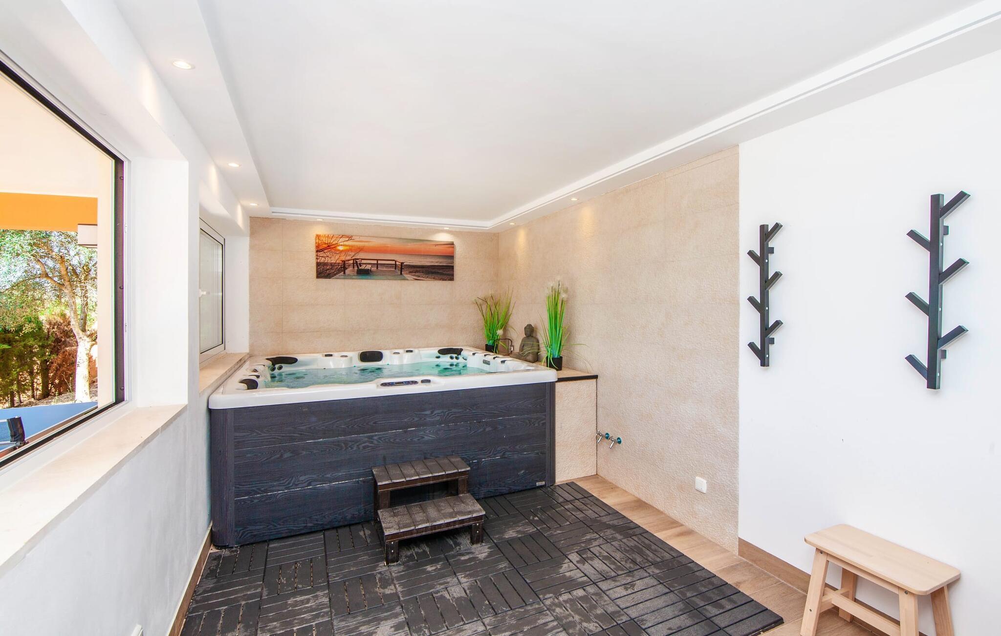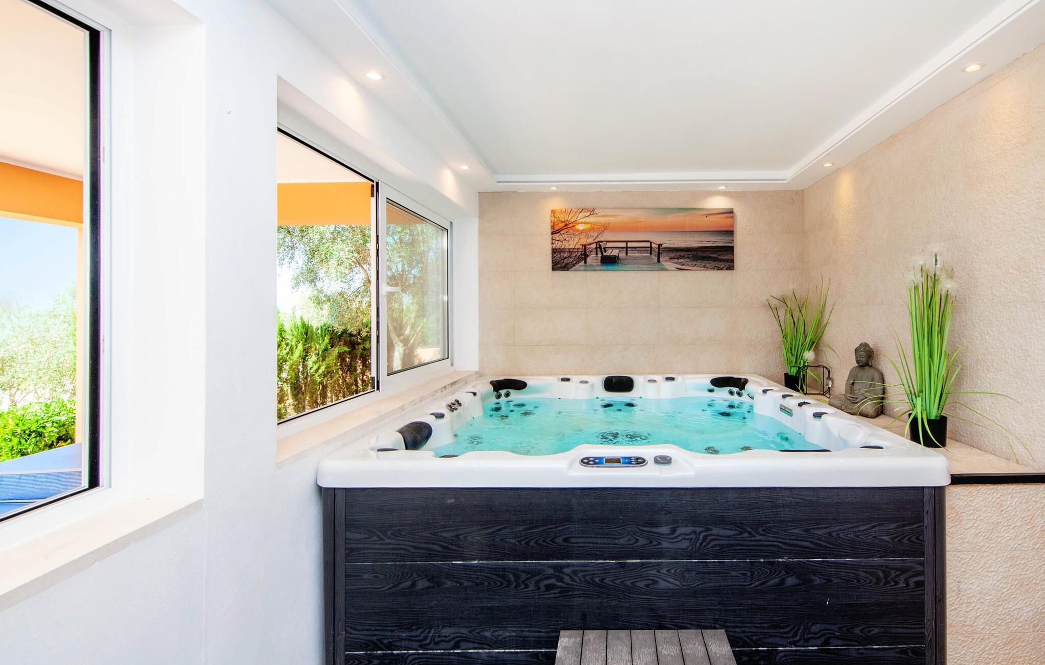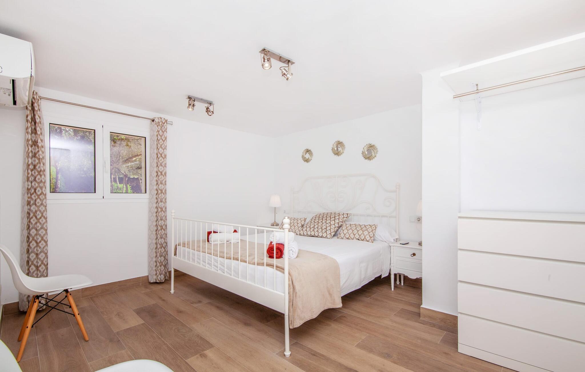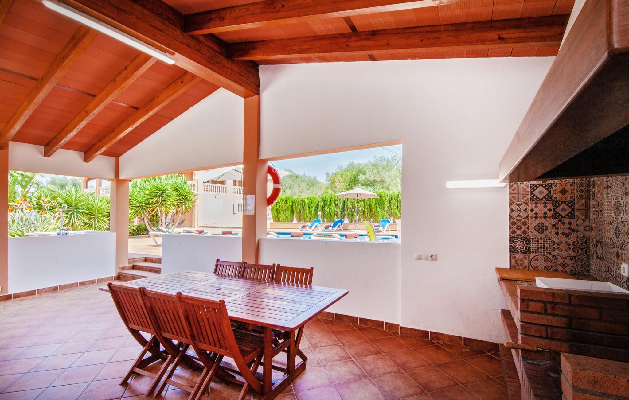 Denne finca, "Ca'n Roser", omgivet af olivenlunde og kun få skridt fra landsbyen, tilbyder et privat og roligt tilflugtssted. Det rummelige, velholdte udendørsareal er beklædt med palmer og skaber en indbydende atmosfære til udeliv. En pool med en stilfuld solterrasse tilbyder det perfekte sted at slappe af med komfortable liggestole. Rummelige, møblerede terrasser, hvoraf mange er overdækkede, tilbyder masser af plads til at slappe af, mens det alsidige udekøkken gør udendørslivet til en leg. Aktive gæster vil sætte pris på de mange forskellige aktiviteter, herunder det udendørs CrossFit-område. Fincaen har også et cykelværksted og er ideelt beliggende nær cykelstier. Indenfor fortsætter de rummelige opholdsområder temaet åbenhed og tilbyder masser af plads til, at større grupper kan slappe af i komfort. Indretningen er afslappet og indbydende, uden en fast stil, hvilket skaber en afslappet atmosfære. Det nederste niveau er totalrenoveret og har et sports- og wellnessområde med sauna, spabad og fitnessrum. Et soveværelse og et badeværelse er også på dette niveau. På øverste etage er der yderligere tre soveværelser og to badeværelser samt en stue/spisestue og et fuldt udstyret køkken. Den charmerende, abrikosfarvede finca ligger kun 9 km sydvest for den maleriske by Santa Maria, i hjertet af Mallorca. Den nærliggende vej forbinder jer nemt med populære destinationer og fremragende faciliteter. Palma, kun 14 km væk, byder på gode shoppingmuligheder, mens de smukke strande langs sydkysten, herunder Passeig de Molinar (13 km) eller Cuidad Jardin (10 km), tilbyder det perfekte sted for en afslappende dag ved havet.