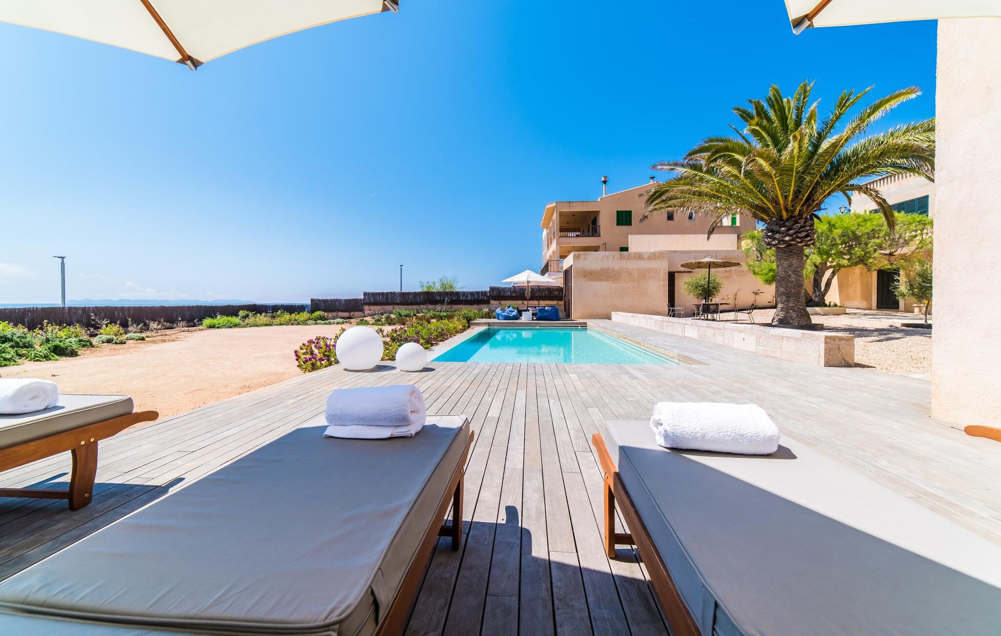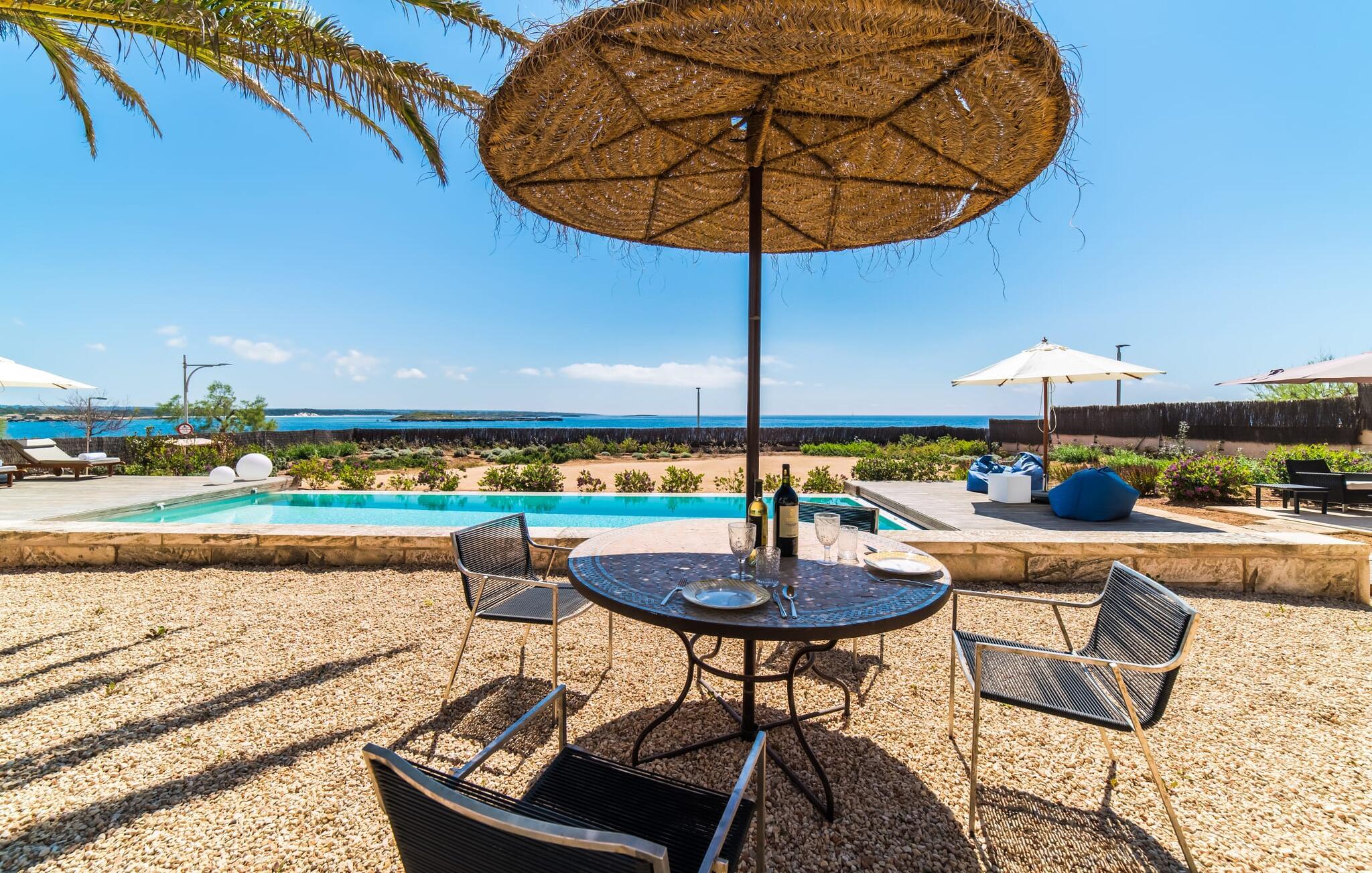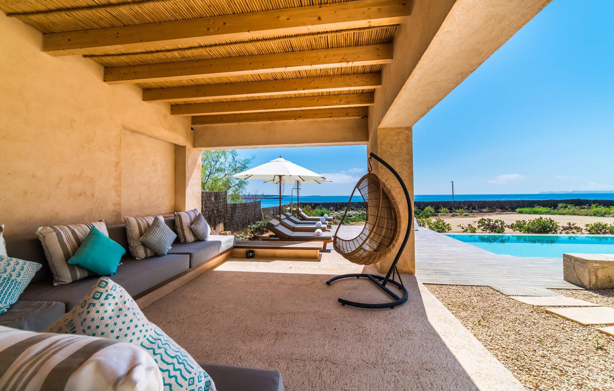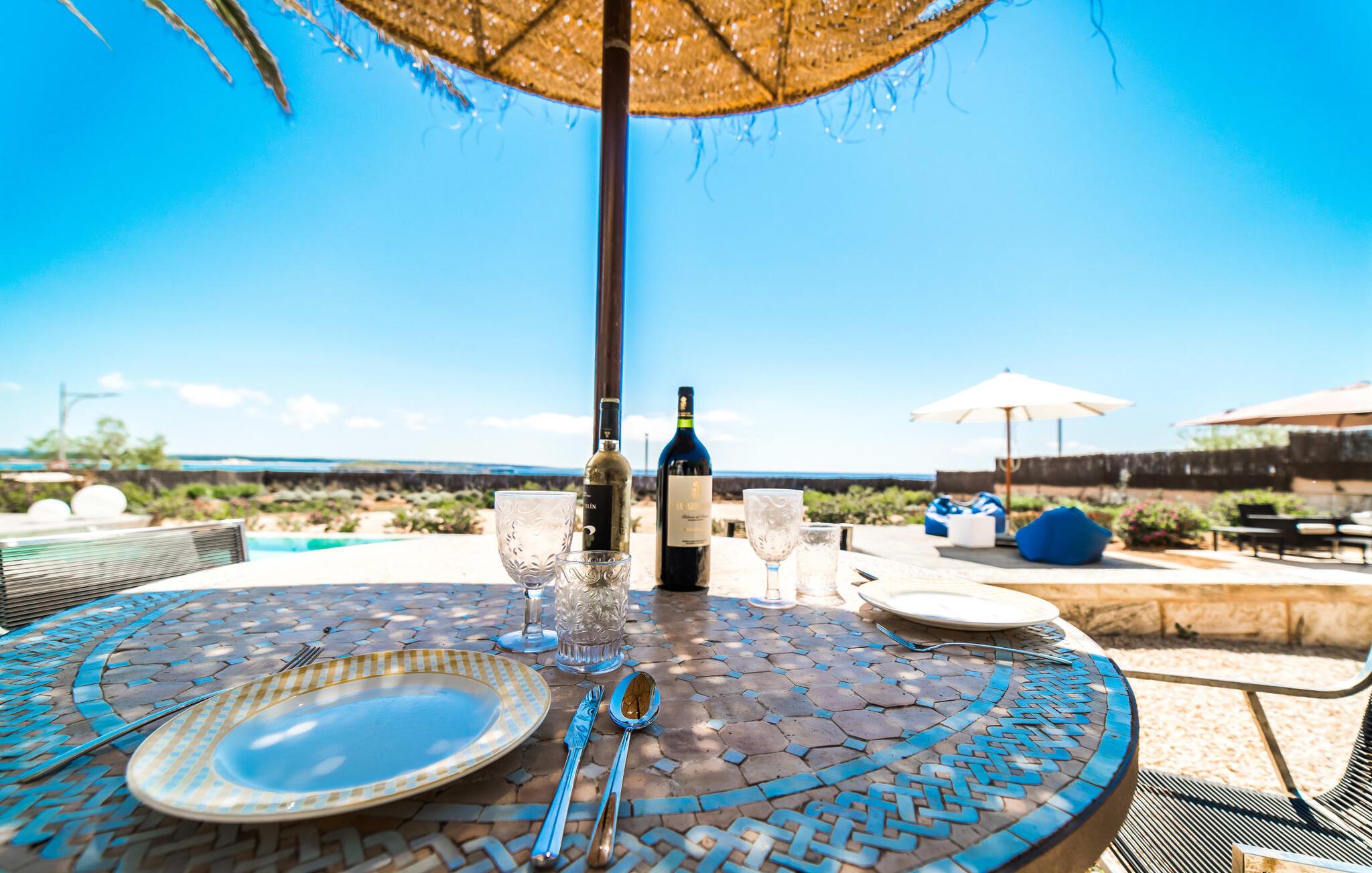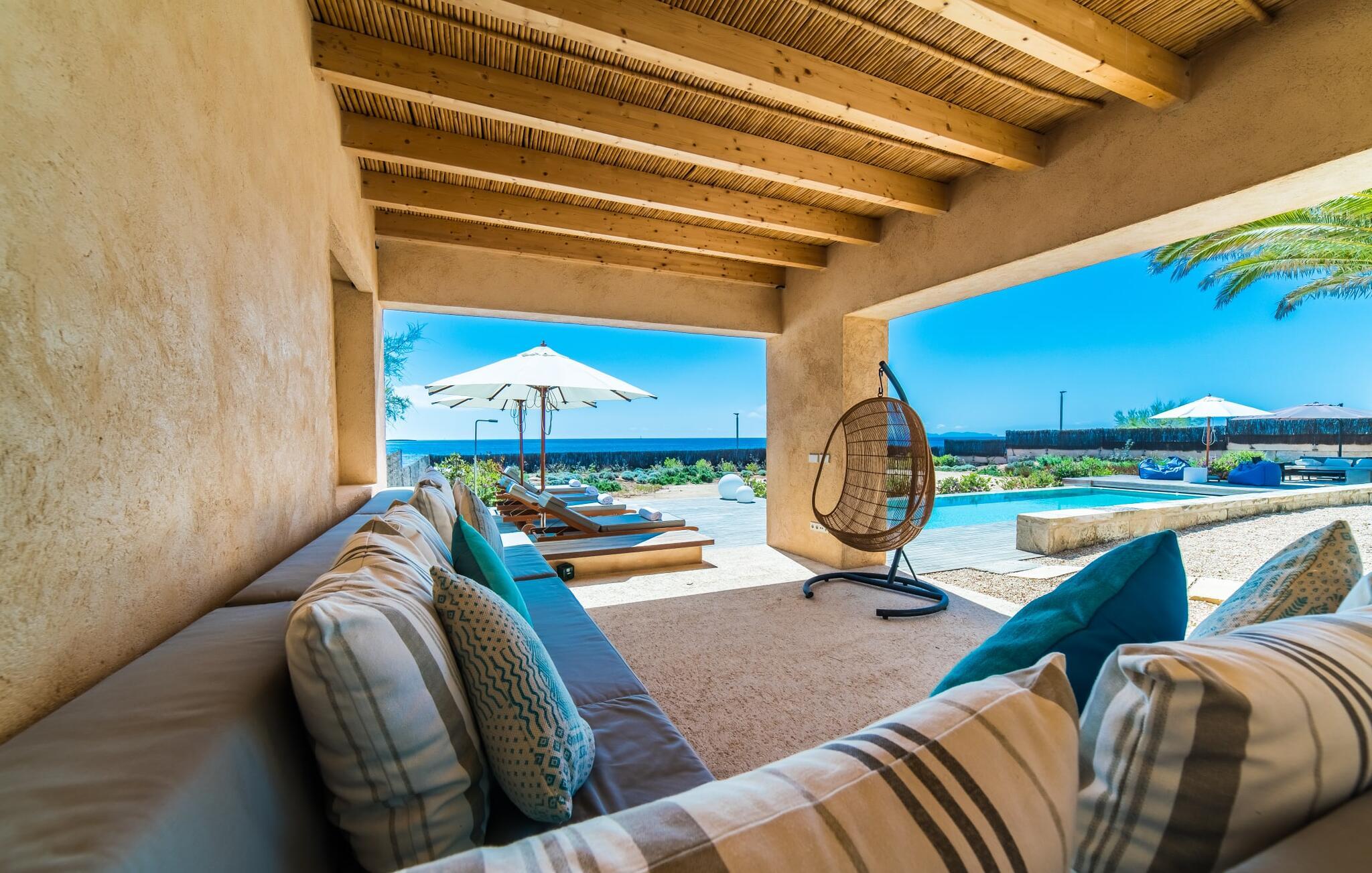 "Cabrera" - er det ikke sommerkærlighed ved første blik? Har I lyst til at smutte ind til byen, til Martas originale havnerestaurant eller i et supermarked for at fylde køleskabet? Aktive feriegæster, der elsker vandsport eller har lyst til at træne, som nyder at vandre, cykle og opleve ren natur får et fantastisk ophold her. Det samme gælder par, som kan se frem til en uforglemmelig ferie for to med denne topplacering. Hvis I ikke har noget imod at betale lidt ekstra for en uvurderlig beliggenhed, skal I se nærmere på dette lille, kubeformede strandhus. Det udendørs loungeområde med 11 meter lang pool, solterrasse og chill-out grillområde er større end interiøret, men hvem vil gå glip af et minut med denne sensationelle udsigt og den eksklusive følelse af at bo tæt ved vandet?