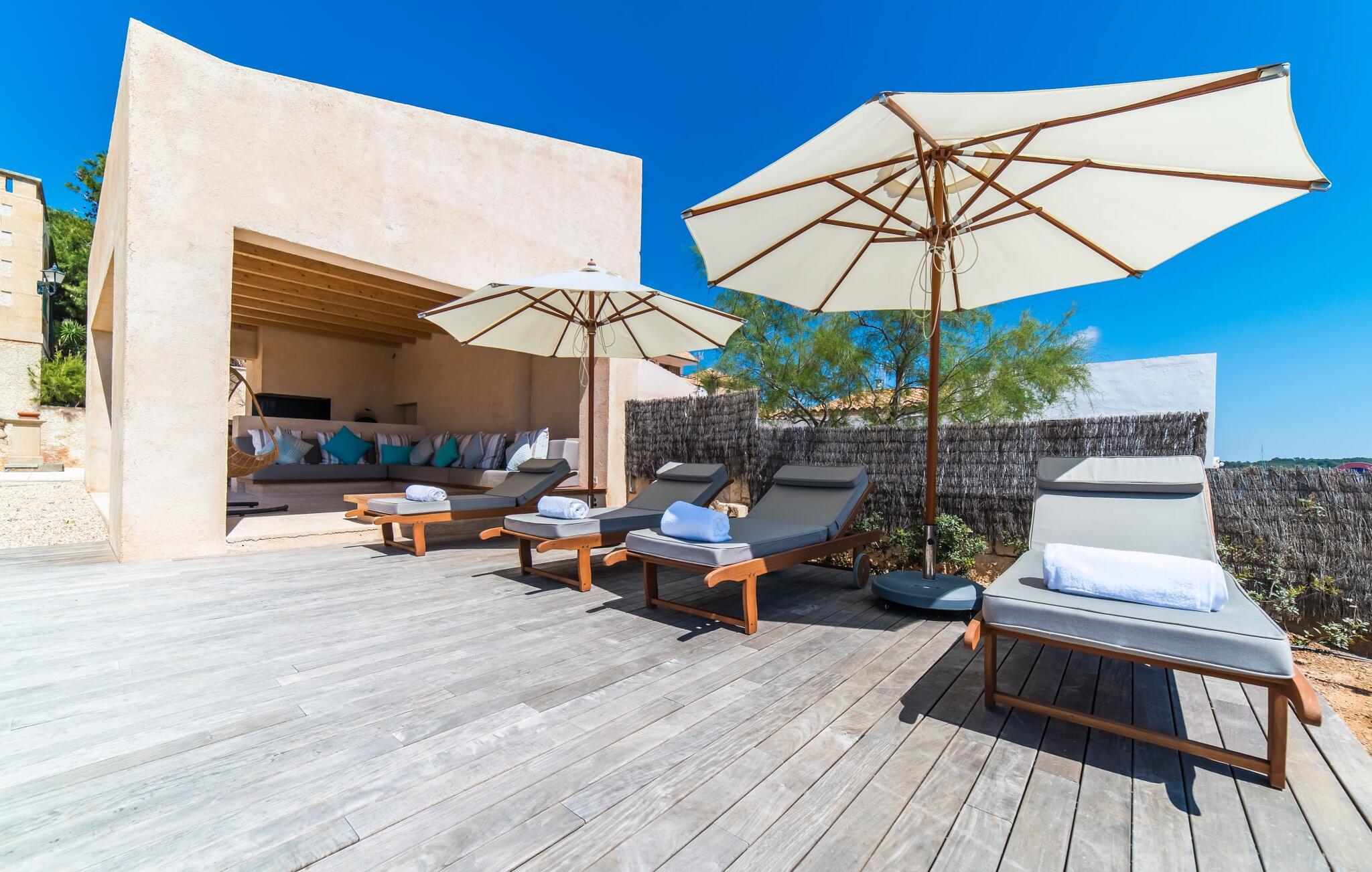 Den tidligere fiskerby Colònia de Sant Jordi, en del af kommunen Ses Salines, er nu et populært sted for sejlsport og vandsport. Som det har været tilfældet i generationer, udvindes hvidguld stadig fra de lyserøde laguner i saltmarkerne i Salinas de Llevant. Mere end 150 fuglearter lever i dette unikke kanallandskab. Der er masser af restauranter og caféer at besøge lige ved havnepromenaden i Colònia de Sant Jordi, og en menu på Martas eklektiske Sal de Cocó er ikke at gå glip af. I kan leje cykler i byen, og Santanyí, Campos, Cala d'Or og Cala Figurera er bestemt et besøg værd. Og sidst men ikke mindst giver den tre kilometer lange, uberørte drømmestrand Es Trenc, Parc Natural de Mondragó og Cabrera-marinereservatet tre overbevisende grunde til at vælge "Villa Cabrera" som strandferiebolig. Til havudsigtsfans: Den moderne, kubeformede villa "Cabrera" har en eksklusiv beliggenhed i udkanten af Colònia de Sant Jordi, et populært hotspot. Cabrera ("Gedeøen") øgruppen strækker sig lige foran jer, og havnen, badeområdet, butikker og restauranter er inden for nem gåafstand. Og drømmestrande som Es Trenc, Estanys og Can Curt lover førsteklasses stranddage og badesjov som i Caribien.