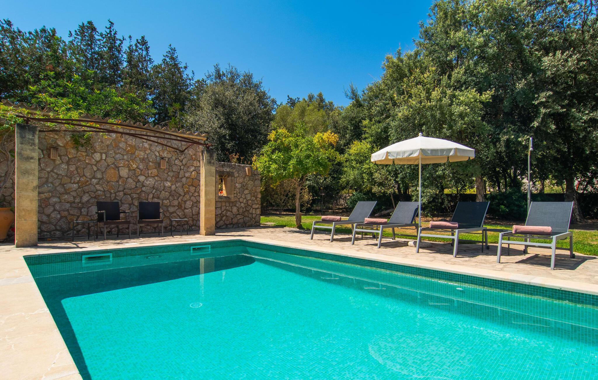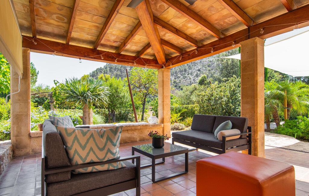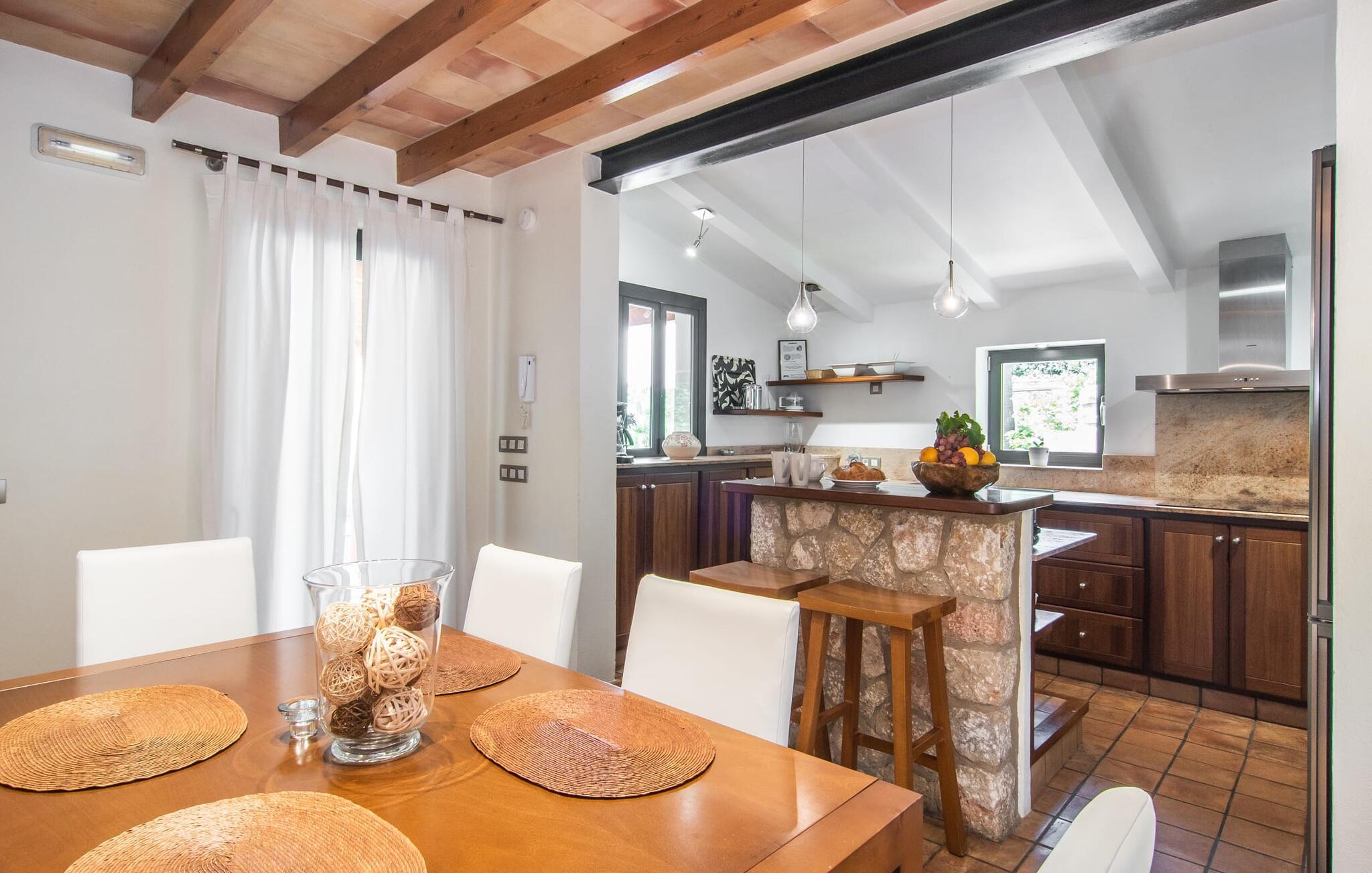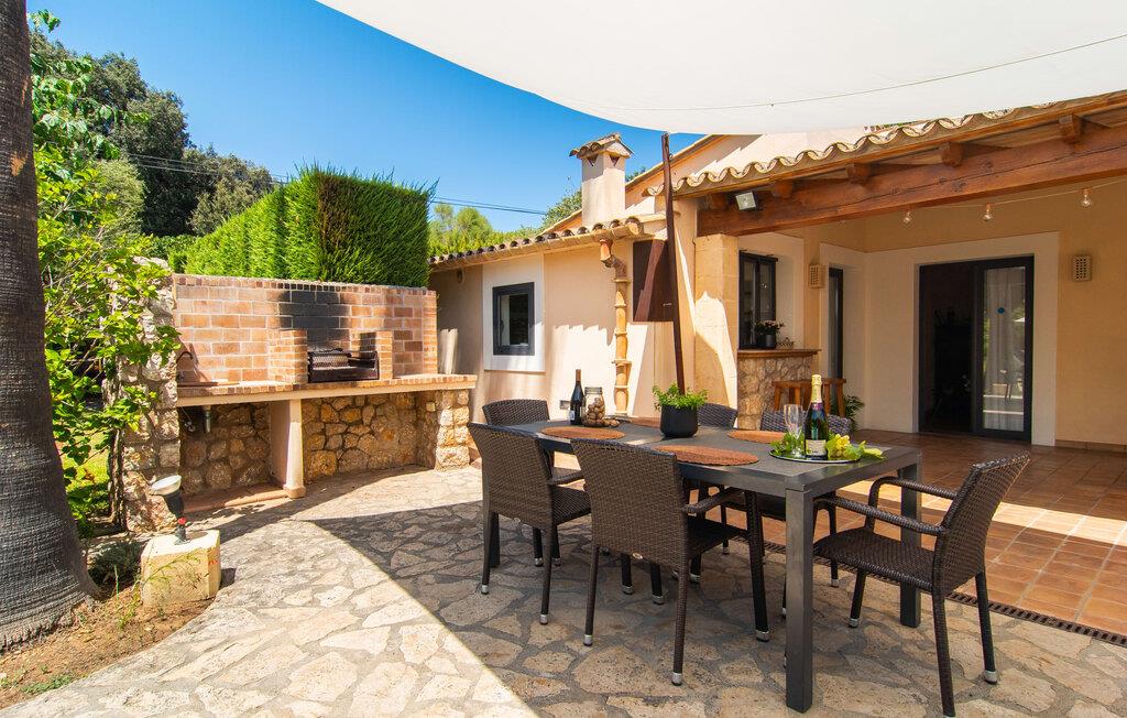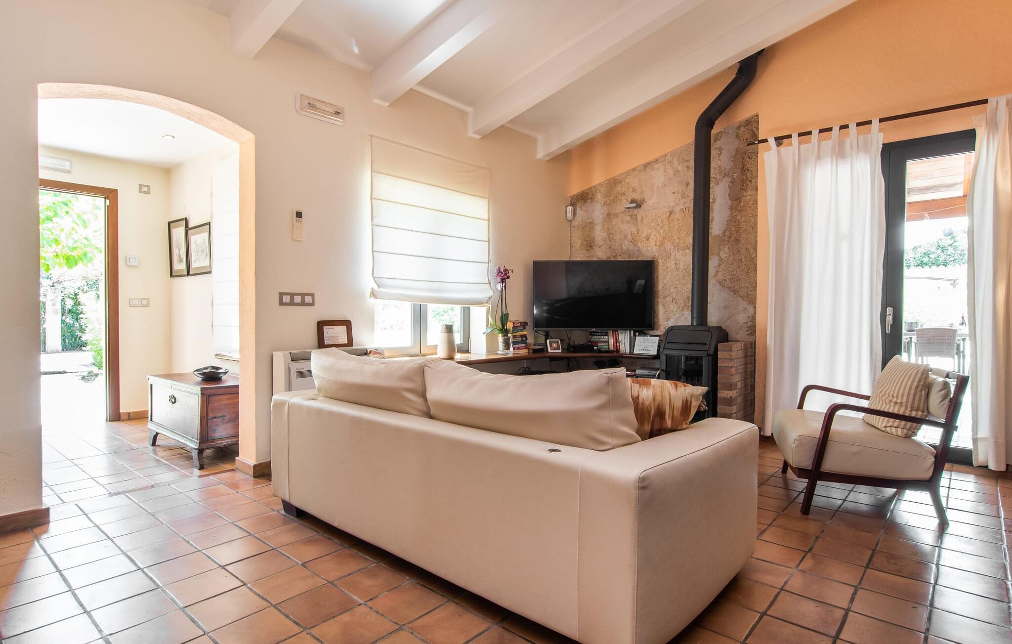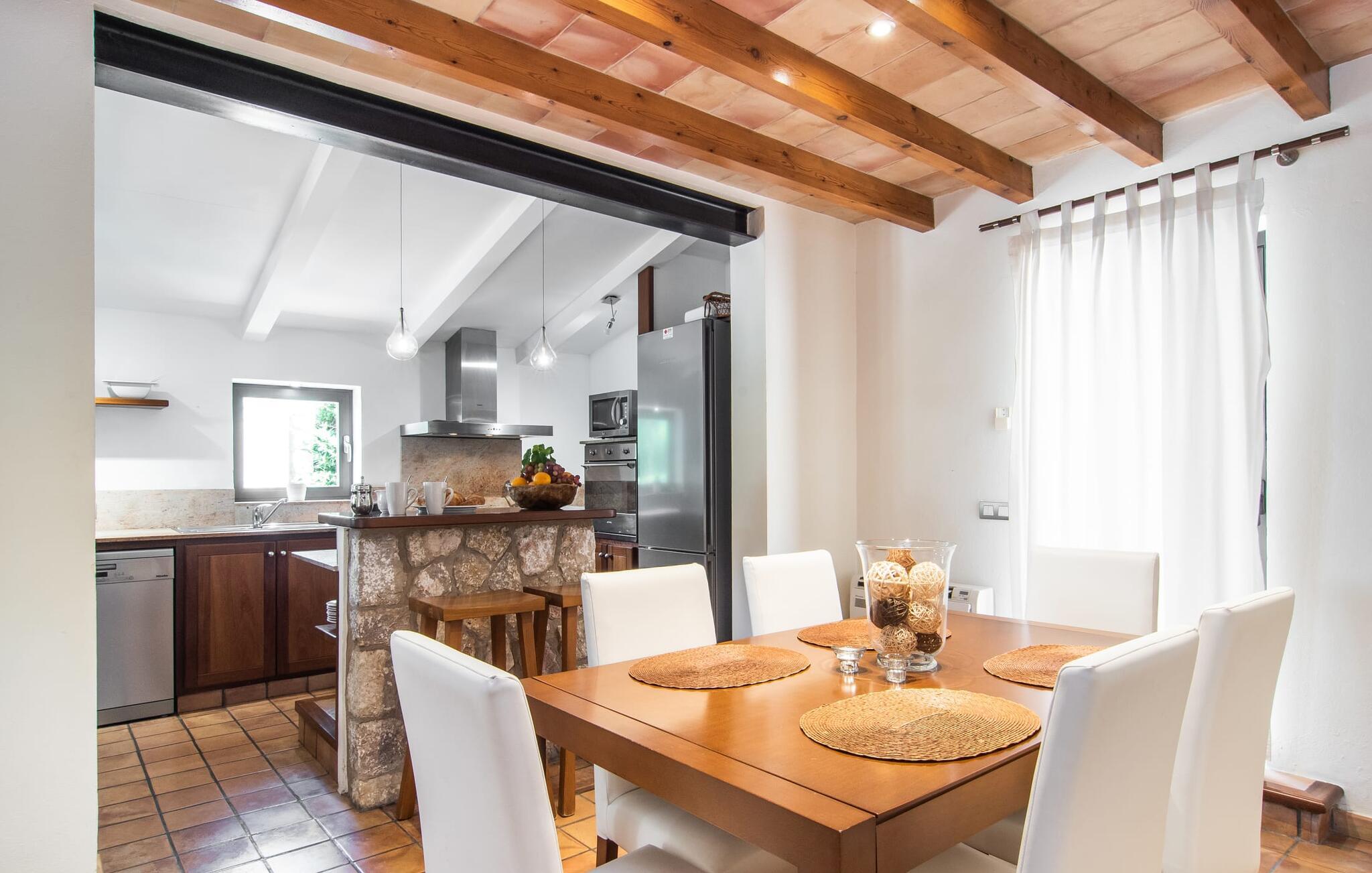 At slappe af på en liggestol ved den private pool, en kølig drink i hånden, kigge ud på bjergene - er det måske jeres idé om en fincaferie på Mallorca? "Cal Llenyater" står til jeres rådighed! Den 11 m lange pool med brede trapper og lille børneområde inviterer også familier til ferie og bruge det velholdte område til lange ophold under middelhavshimlen. Den smukt beplantede ejendom byder også på dejlige luftige, naturlige skyggeområder, og en muret grill inviterer til aftengrill med vennerne. På den overdækkede terrasse direkte ved huset kan I vælge mellem et spisebord og en hyggelig lounge og herfra kan I nyde udsigten over haven og en kort gåtur til køkkenet. Husets interiør i stueetagen er kendetegnet ved en charmerende atmosfære med klassiske mallorcanske elementer som naturstenselementer, synlige bjælkelofter og træmøbler. I opholdsstuen med brændeovn og stort fladskærms-tv kan I slappe af i sofaen og lænestolen når som helst på dagen. Herfra fører en åben passage til spisestuen, som igen er forbundet med køkkenet, som er fuldt udstyret med alt hvad I behøver til selvstændige selvforplejningsdage. To smagfuldt indrettede dobbeltværelser tilbyder en indbydende ramme om afslappende ferieaftener. Et af soveværelserne har enkeltsenge, det andet har en dobbeltseng og begge har eget badeværelse med badekar. I det grønt-inspirerede badeværelse giver et hydromassagebadekar yderligere wellness-øjeblikke. Vores konklusion: et fantastisk hus til fire personer i en absolut attraktiv beliggenhed nær havet. Denne indbydende bondegård på Mallorca ligger på den nordlige del af øen, lidt over 1 km fra Pollença. Der kan I gøre jeres daglige indkøb og opleve det farverige ugentlige marked om søndagen. Takket være dens beliggenhed på gaden kan I også nå forskellige attraktive udflugtsmål på ingen tid. Der er en lang sandstrand i Port de Pollença (ca. 7 km), og andre smukke bugter ligger også kun få kilometer væk. Den populære by Alcúdia er omkring femten minutter væk i bil.