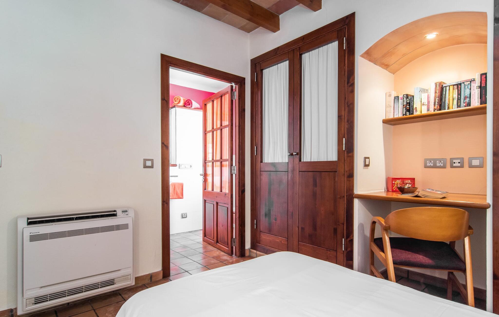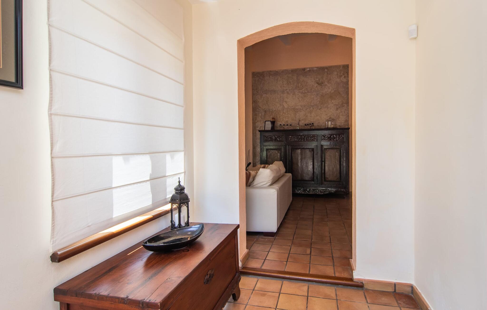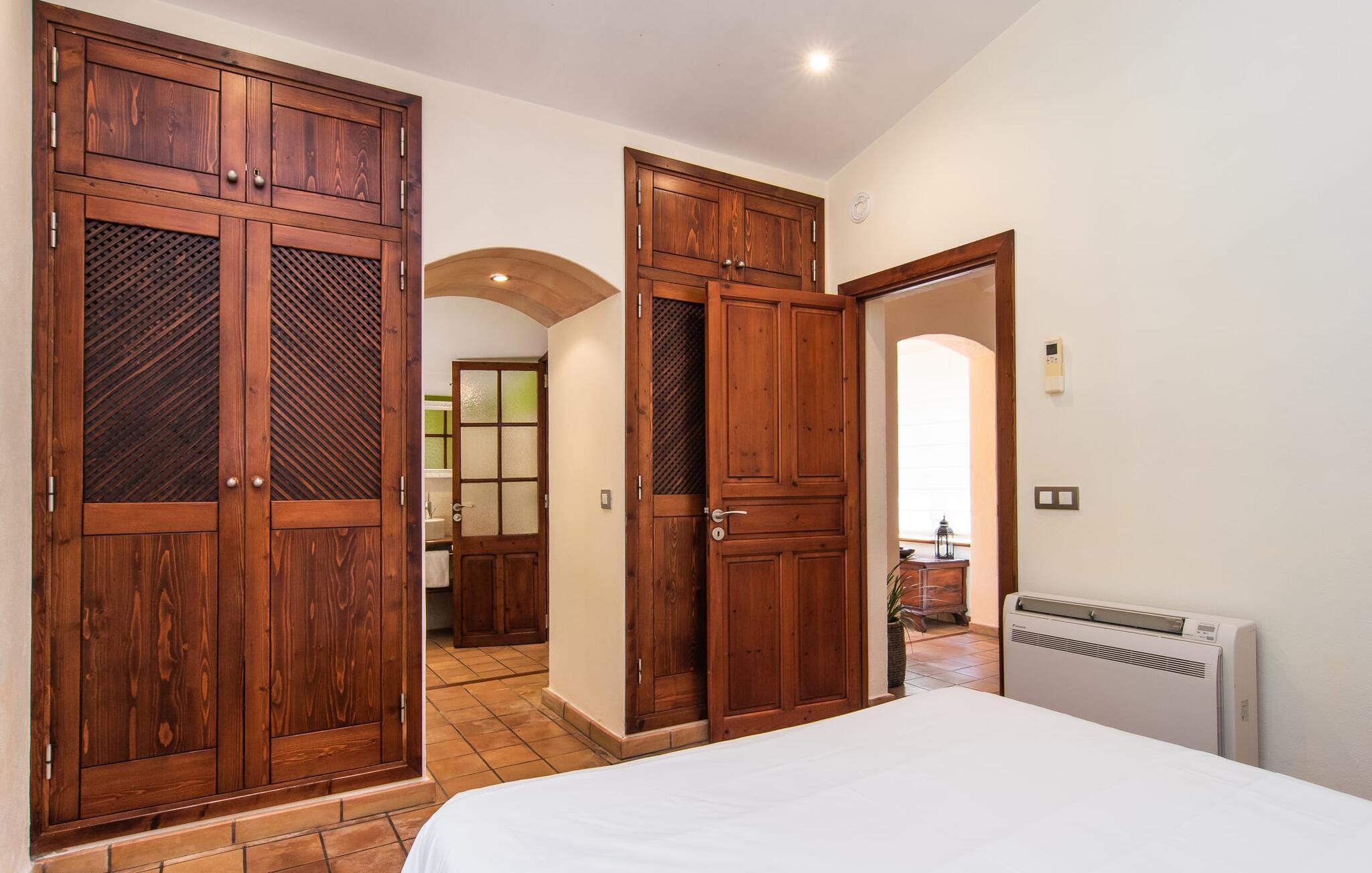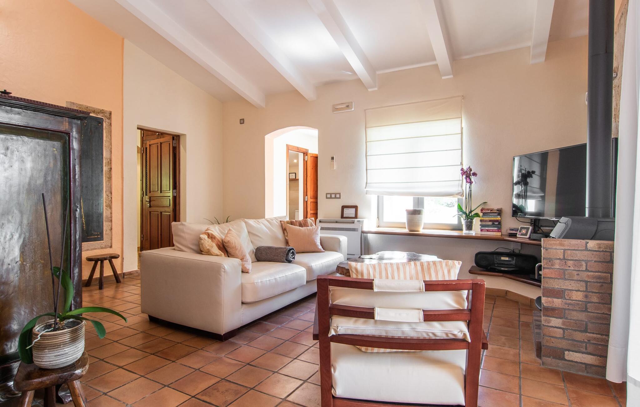 At slappe af på en liggestol ved den private pool, en kølig drink i hånden, kigge ud på bjergene - er det måske jeres idé om en fincaferie på Mallorca? "Cal Llenyater" står til jeres rådighed! Den 11 m lange pool med brede trapper og lille børneområde inviterer også familier til ferie og bruge det velholdte område til lange ophold under middelhavshimlen. Den smukt beplantede ejendom byder også på dejlige luftige, naturlige skyggeområder, og en muret grill inviterer til aftengrill med vennerne. På den overdækkede terrasse direkte ved huset kan I vælge mellem et spisebord og en hyggelig lounge og herfra kan I nyde udsigten over haven og en kort gåtur til køkkenet. Husets interiør i stueetagen er kendetegnet ved en charmerende atmosfære med klassiske mallorcanske elementer som naturstenselementer, synlige bjælkelofter og træmøbler. I opholdsstuen med brændeovn og stort fladskærms-tv kan I slappe af i sofaen og lænestolen når som helst på dagen. Herfra fører en åben passage til spisestuen, som igen er forbundet med køkkenet, som er fuldt udstyret med alt hvad I behøver til selvstændige selvforplejningsdage. To smagfuldt indrettede dobbeltværelser tilbyder en indbydende ramme om afslappende ferieaftener. Et af soveværelserne har enkeltsenge, det andet har en dobbeltseng og begge har eget badeværelse med badekar. I det grønt-inspirerede badeværelse giver et hydromassagebadekar yderligere wellness-øjeblikke. Vores konklusion: et fantastisk hus til fire personer i en absolut attraktiv beliggenhed nær havet. Denne indbydende bondegård på Mallorca ligger på den nordlige del af øen, lidt over 1 km fra Pollença. Der kan I gøre jeres daglige indkøb og opleve det farverige ugentlige marked om søndagen. Takket være dens beliggenhed på gaden kan I også nå forskellige attraktive udflugtsmål på ingen tid. Der er en lang sandstrand i Port de Pollença (ca. 7 km), og andre smukke bugter ligger også kun få kilometer væk. Den populære by Alcúdia er omkring femten minutter væk i bil.