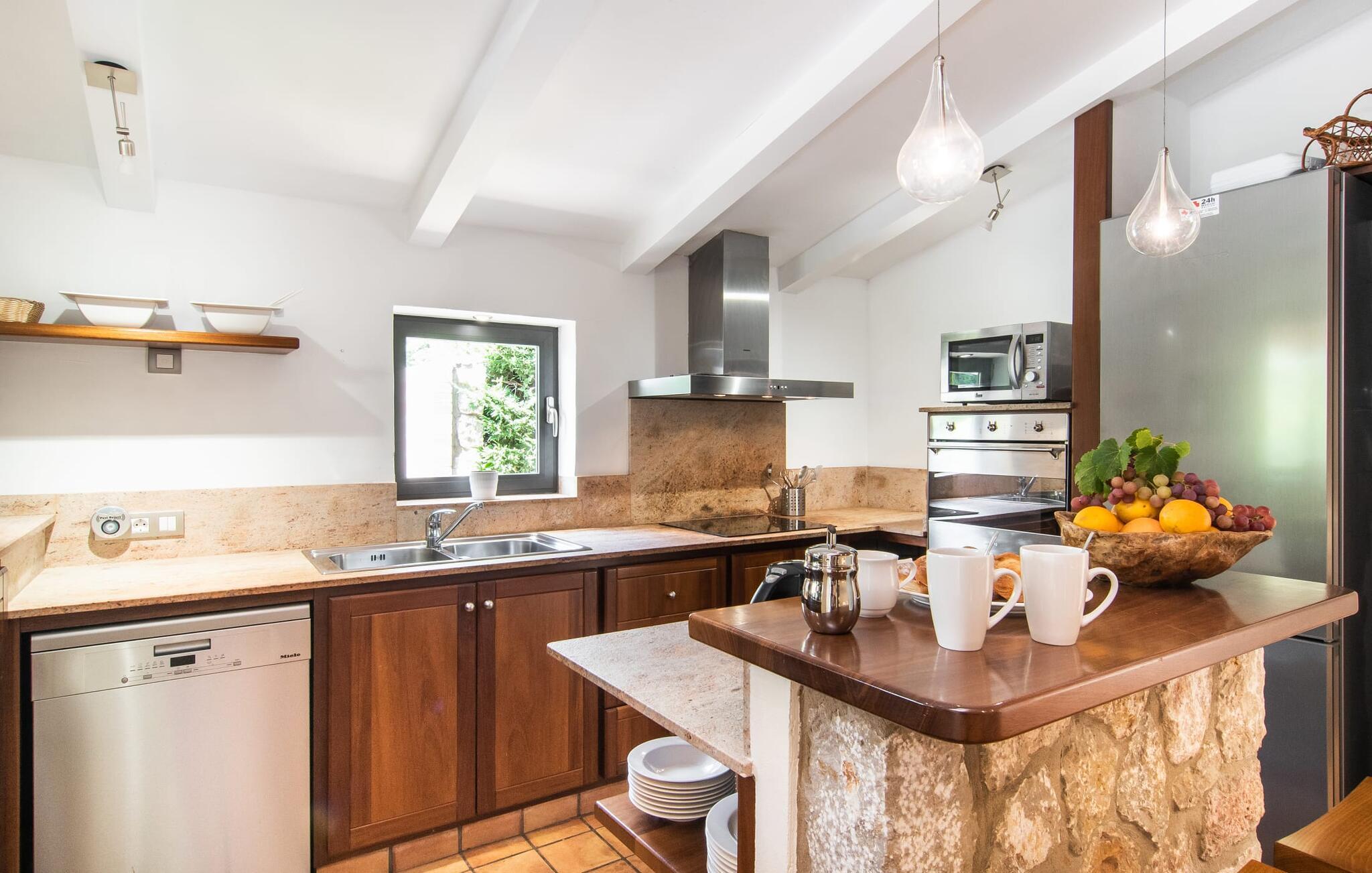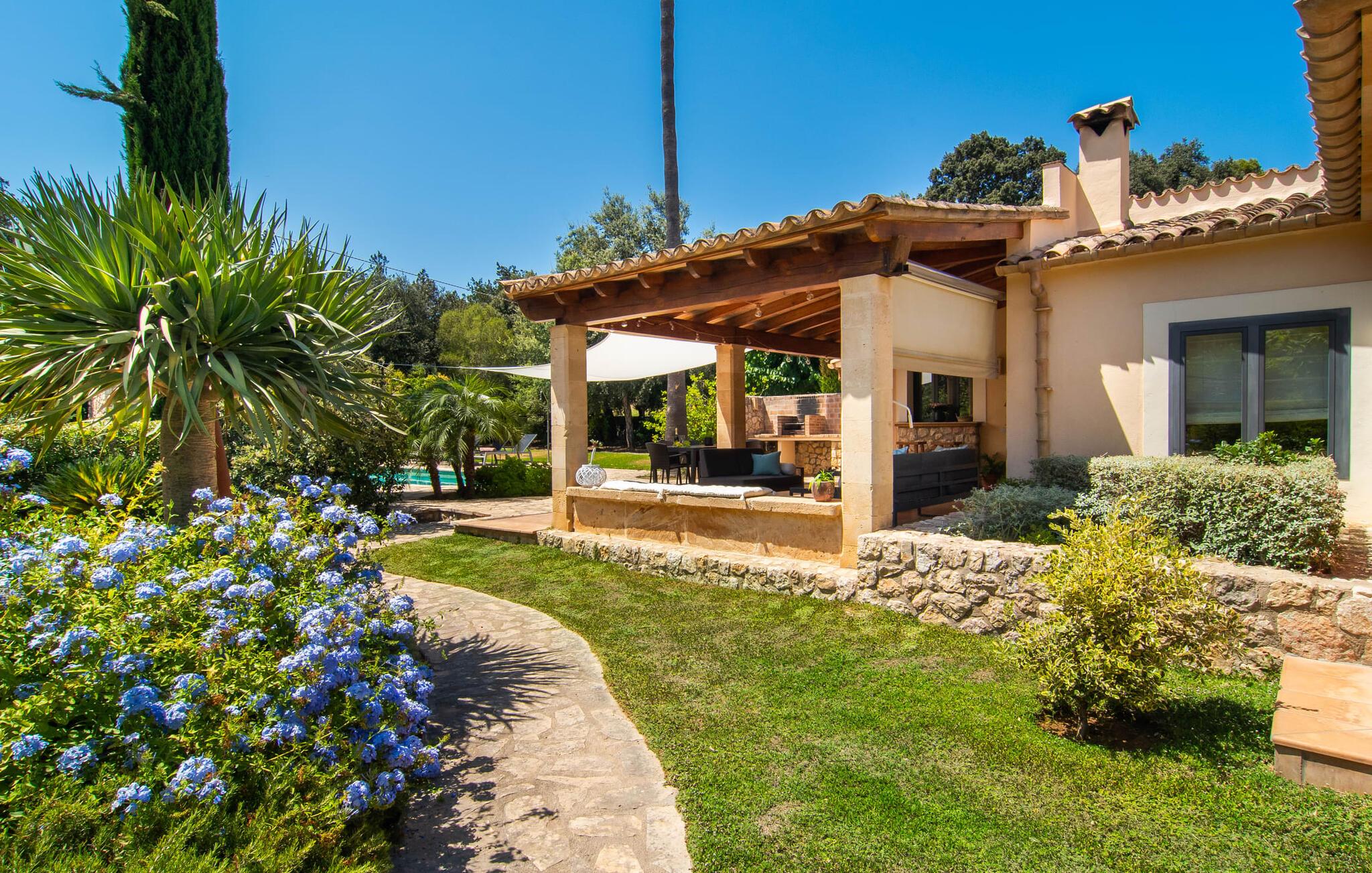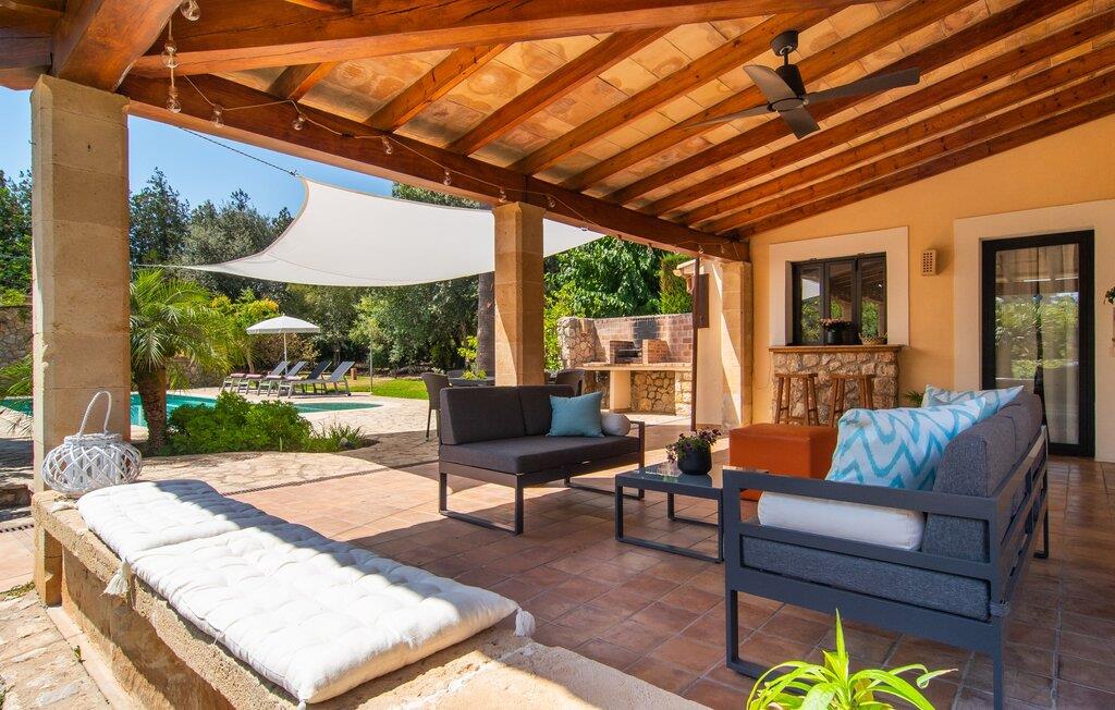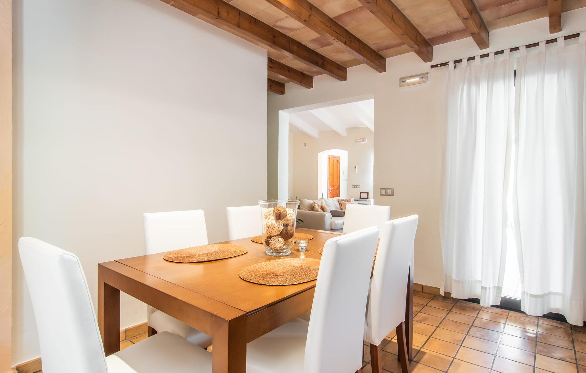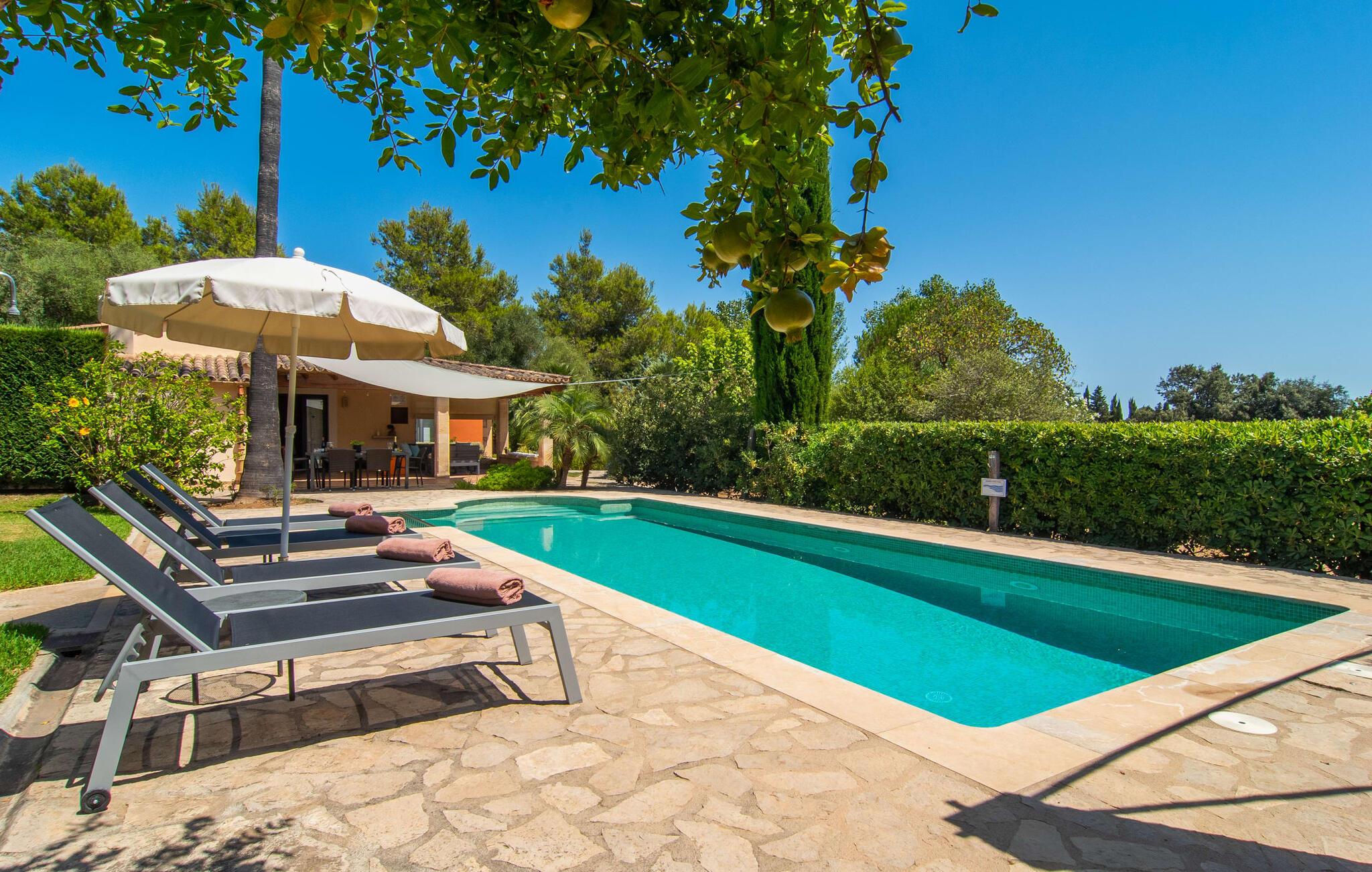 At slappe af på en liggestol ved den private pool, en kølig drink i hånden, kigge ud på bjergene - er det måske jeres idé om en fincaferie på Mallorca? "Cal Llenyater" står til jeres rådighed! Den 11 m lange pool med brede trapper og lille børneområde inviterer også familier til ferie og bruge det velholdte område til lange ophold under middelhavshimlen. Den smukt beplantede ejendom byder også på dejlige luftige, naturlige skyggeområder, og en muret grill inviterer til aftengrill med vennerne. På den overdækkede terrasse direkte ved huset kan I vælge mellem et spisebord og en hyggelig lounge og herfra kan I nyde udsigten over haven og en kort gåtur til køkkenet. Husets interiør i stueetagen er kendetegnet ved en charmerende atmosfære med klassiske mallorcanske elementer som naturstenselementer, synlige bjælkelofter og træmøbler. I opholdsstuen med brændeovn og stort fladskærms-tv kan I slappe af i sofaen og lænestolen når som helst på dagen. Herfra fører en åben passage til spisestuen, som igen er forbundet med køkkenet, som er fuldt udstyret med alt hvad I behøver til selvstændige selvforplejningsdage. To smagfuldt indrettede dobbeltværelser tilbyder en indbydende ramme om afslappende ferieaftener. Et af soveværelserne har enkeltsenge, det andet har en dobbeltseng og begge har eget badeværelse med badekar. I det grønt-inspirerede badeværelse giver et hydromassagebadekar yderligere wellness-øjeblikke. Vores konklusion: et fantastisk hus til fire personer i en absolut attraktiv beliggenhed nær havet. Denne indbydende bondegård på Mallorca ligger på den nordlige del af øen, lidt over 1 km fra Pollença. Der kan I gøre jeres daglige indkøb og opleve det farverige ugentlige marked om søndagen. Takket være dens beliggenhed på gaden kan I også nå forskellige attraktive udflugtsmål på ingen tid. Der er en lang sandstrand i Port de Pollença (ca. 7 km), og andre smukke bugter ligger også kun få kilometer væk. Den populære by Alcúdia er omkring femten minutter væk i bil.