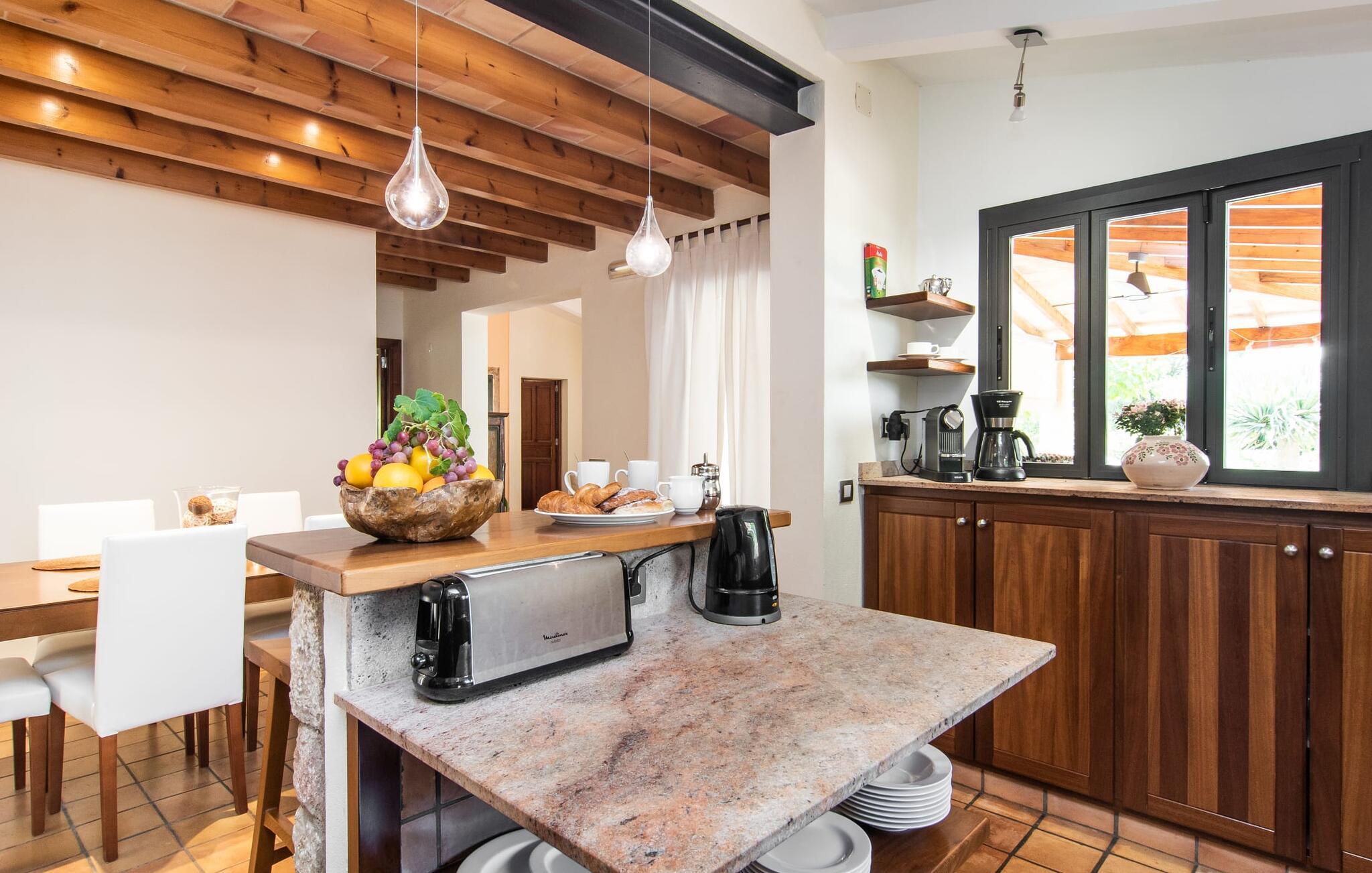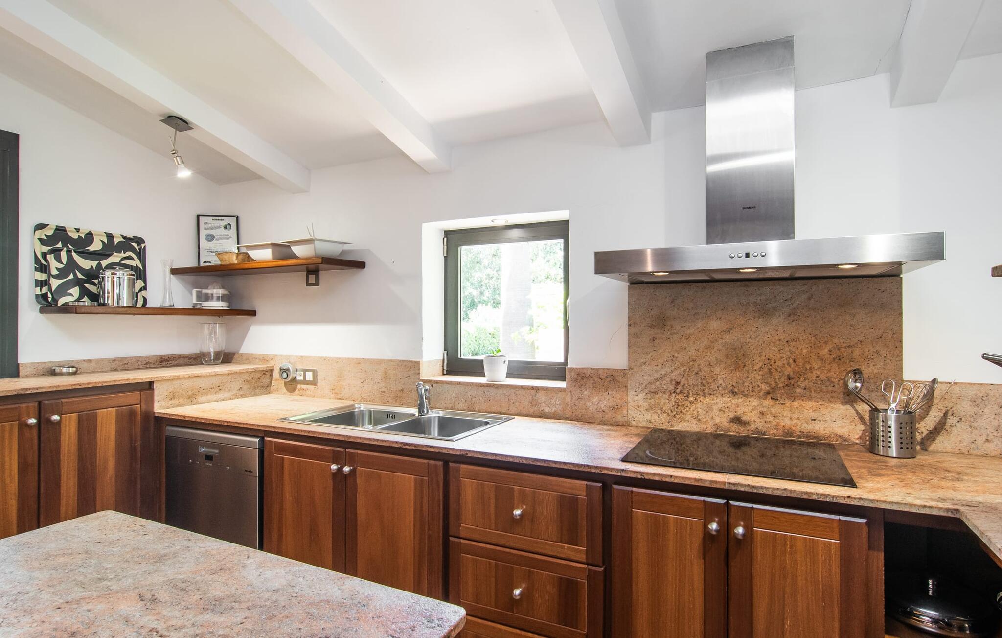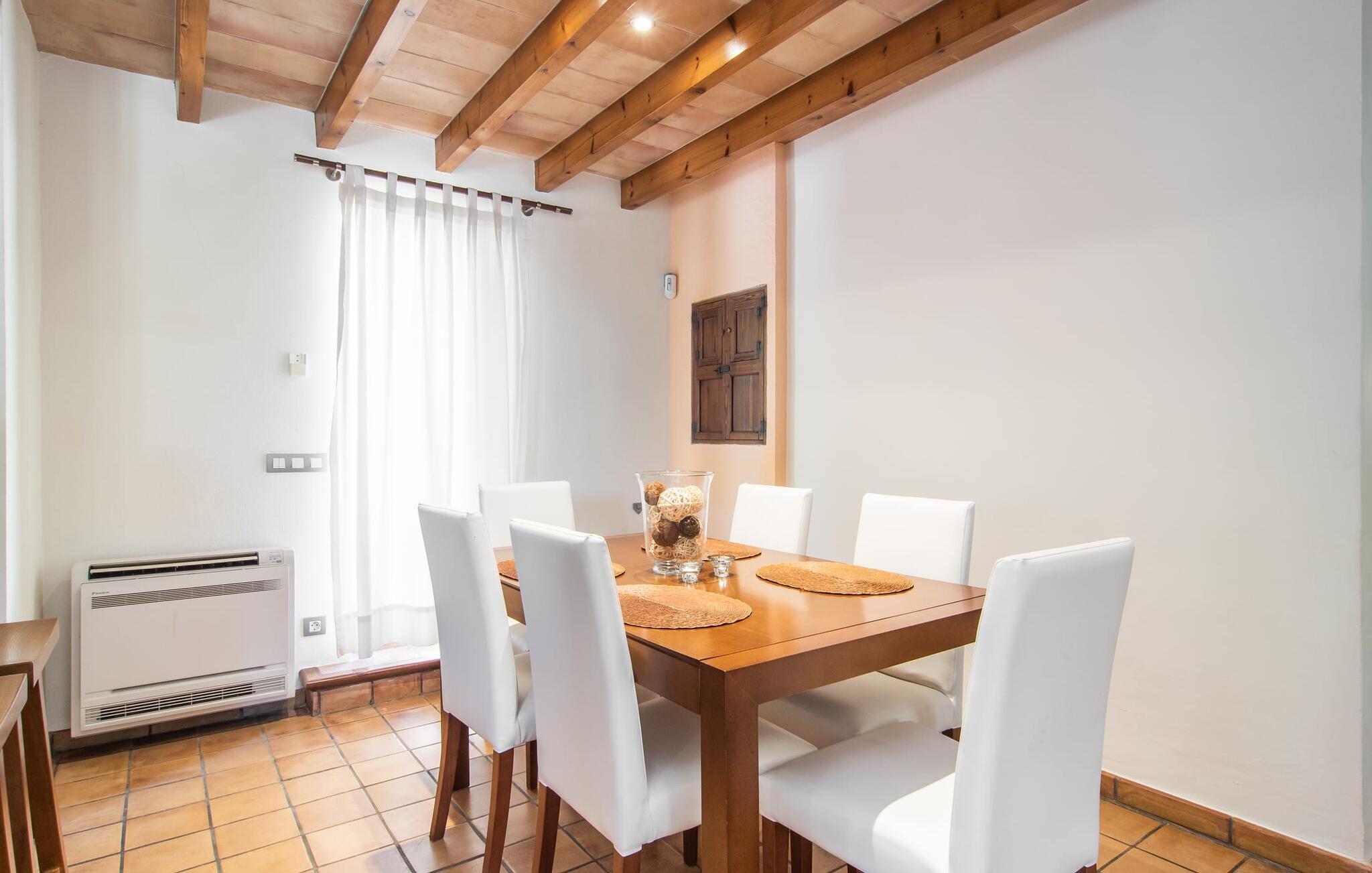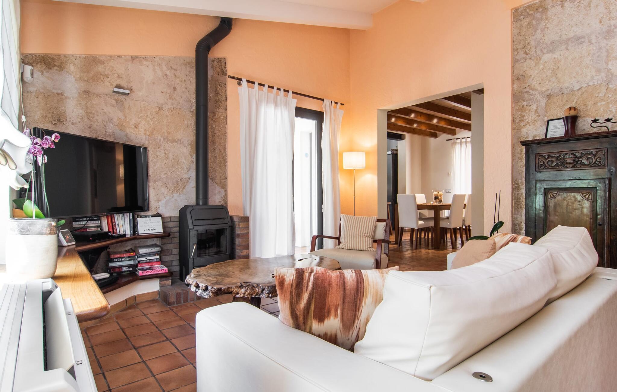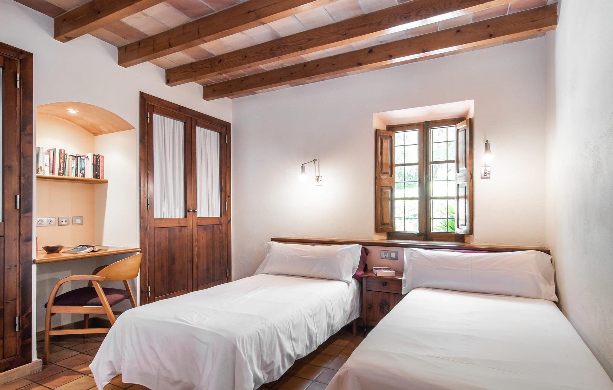 At slappe af på en liggestol ved den private pool, en kølig drink i hånden, kigge ud på bjergene - er det måske jeres idé om en fincaferie på Mallorca? "Cal Llenyater" står til jeres rådighed! Den 11 m lange pool med brede trapper og lille børneområde inviterer også familier til ferie og bruge det velholdte område til lange ophold under middelhavshimlen. Den smukt beplantede ejendom byder også på dejlige luftige, naturlige skyggeområder, og en muret grill inviterer til aftengrill med vennerne. På den overdækkede terrasse direkte ved huset kan I vælge mellem et spisebord og en hyggelig lounge og herfra kan I nyde udsigten over haven og en kort gåtur til køkkenet. Husets interiør i stueetagen er kendetegnet ved en charmerende atmosfære med klassiske mallorcanske elementer som naturstenselementer, synlige bjælkelofter og træmøbler. I opholdsstuen med brændeovn og stort fladskærms-tv kan I slappe af i sofaen og lænestolen når som helst på dagen. Herfra fører en åben passage til spisestuen, som igen er forbundet med køkkenet, som er fuldt udstyret med alt hvad I behøver til selvstændige selvforplejningsdage. To smagfuldt indrettede dobbeltværelser tilbyder en indbydende ramme om afslappende ferieaftener. Et af soveværelserne har enkeltsenge, det andet har en dobbeltseng og begge har eget badeværelse med badekar. I det grønt-inspirerede badeværelse giver et hydromassagebadekar yderligere wellness-øjeblikke. Vores konklusion: et fantastisk hus til fire personer i en absolut attraktiv beliggenhed nær havet. Denne indbydende bondegård på Mallorca ligger på den nordlige del af øen, lidt over 1 km fra Pollença. Der kan I gøre jeres daglige indkøb og opleve det farverige ugentlige marked om søndagen. Takket være dens beliggenhed på gaden kan I også nå forskellige attraktive udflugtsmål på ingen tid. Der er en lang sandstrand i Port de Pollença (ca. 7 km), og andre smukke bugter ligger også kun få kilometer væk. Den populære by Alcúdia er omkring femten minutter væk i bil.