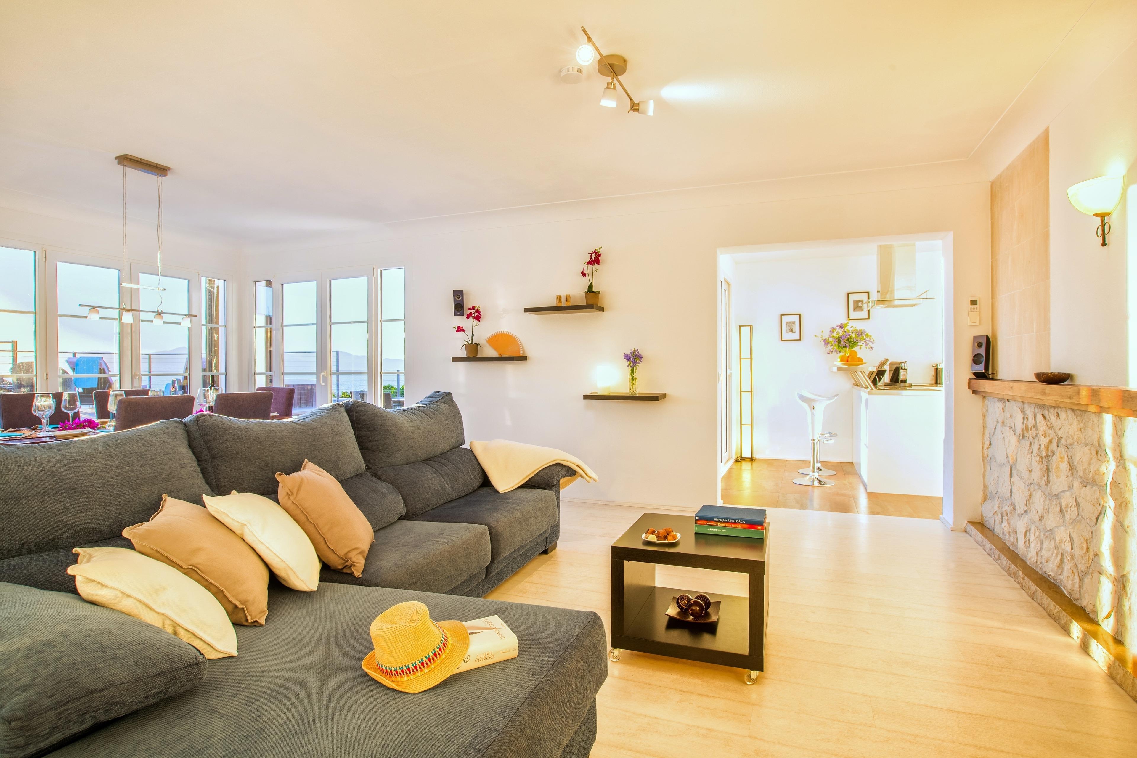 Die Casa Pura liegt fantastisch platziert über dem Meer. Kleine romantische Buchten, die alle in 3 - 5 Gehminuten zu erreichen sind, laden zum Baden, Schnorcheln, Bräunen und Loslassen ein. Von Terrasse, Wohnzimmer und Küche aus haben Sie einen unvergleichlichen Blick auf das Meer und die gewaltige Bucht von Palma. Abends kann man jenseits der Gipfel der gegenüberliegenden Tramuntana-Berge zauberhafte Sonnenuntergänge beobachten. Ob im beheizten Whirlpool oder von der Terrasse aus: Diese Momente werden Ihnen in Erinnerung bleiben!