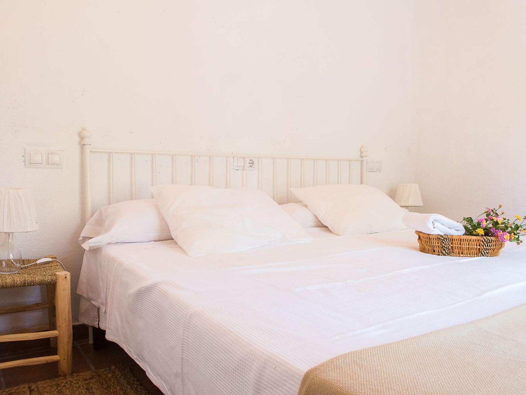 Es gibt insgesamt drei Schlafzimmer. Eines ist mit einem Doppelbett ausgestattet und die anderen mit jeweils zwei Einzelbetten und Kleiderschränken. Aus jedem Schlafzimmer haben Sie einen Blick auf den Garten und den Pool.