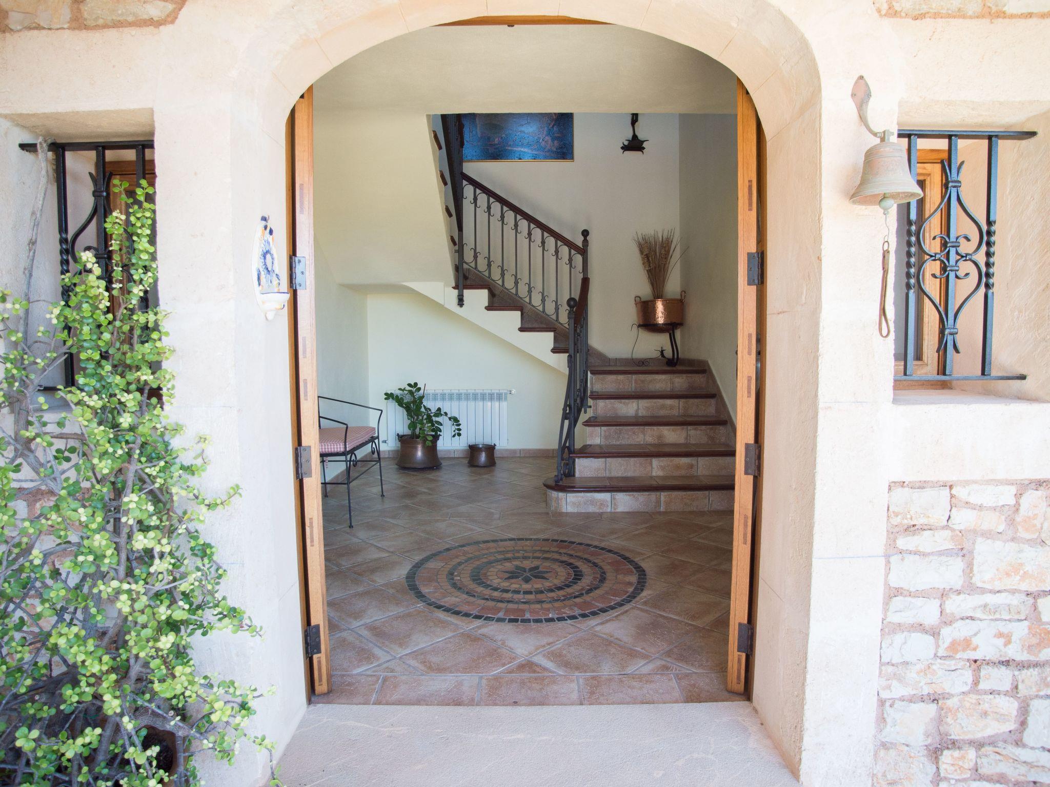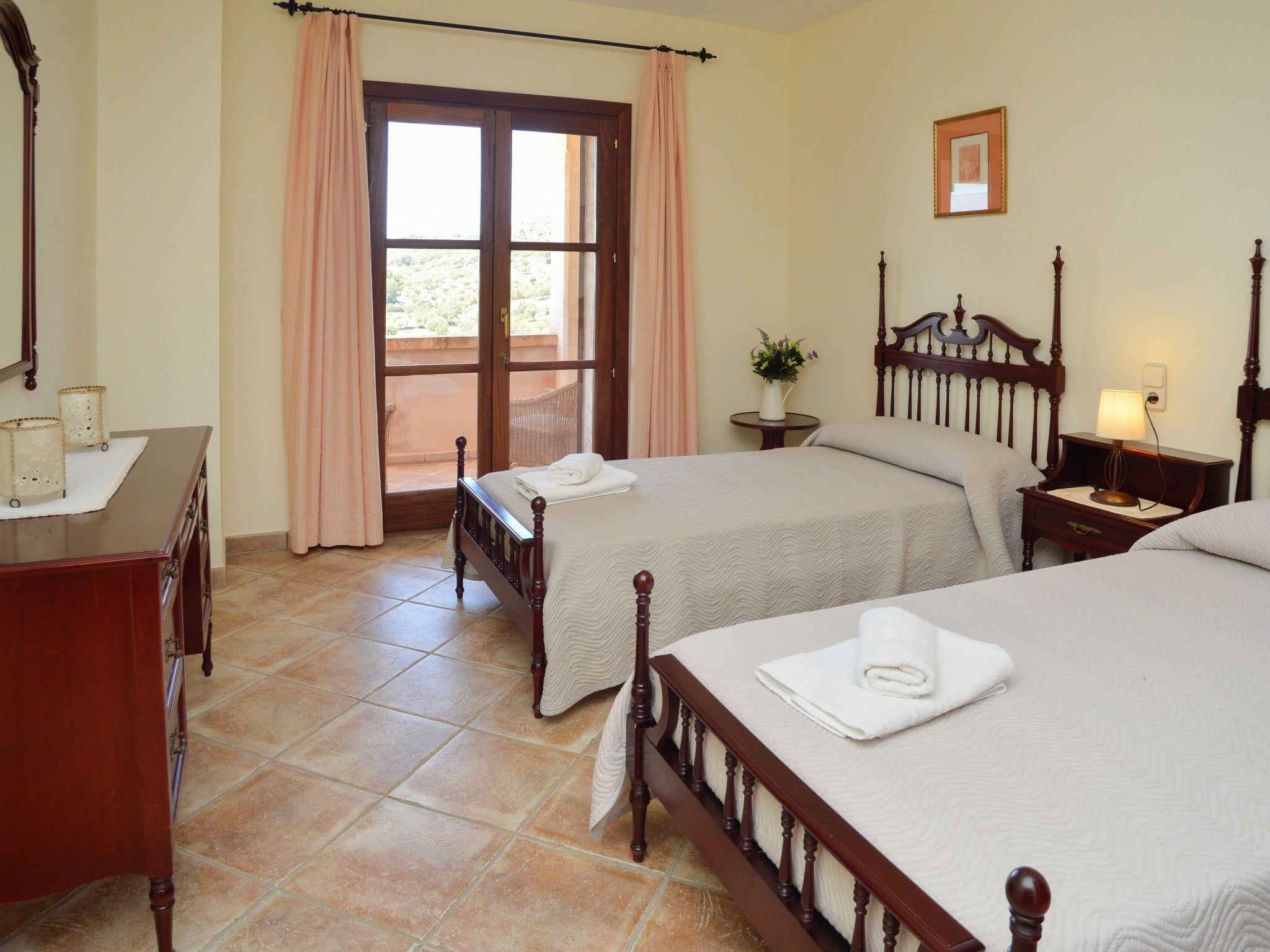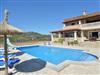 Turo den Golf is a spacious finca clad in natural stone and set over two floors. A shady terrace lines the entire house and the terraces on the upper floor are also covered. The entrance area leads to an open-plan living area and the adjoining dining area with a massive dining table that comfortably seats 10 people. From here there is access to a covered terrace with further outdoor furniture and a view of the pool with sun terrace. The dining area leads to a spacious and well-equipped kitchen with adjoining utility room. On the ground floor there is also one of the bedrooms with two single beds, access to the terrace and a separate bathroom with bath and shower. The upper floor houses another spacious living room with access to a covered terrace and four bedrooms, two of which have a double bed and en-suite bathroom with shower. Bed and en-suite bathrooms with corner bath, one of which has an additional shower. Both bedrooms also have access to the covered terrace with views as far as the sea on the horizon. The other two bedrooms, one with a double bed and the other with two single beds, share a bathroom. The bedrooms also have access to a terrace with views of the surrounding area and the golf course. The entire house is equipped with air conditioning in the bedrooms with fixed and limited usage time