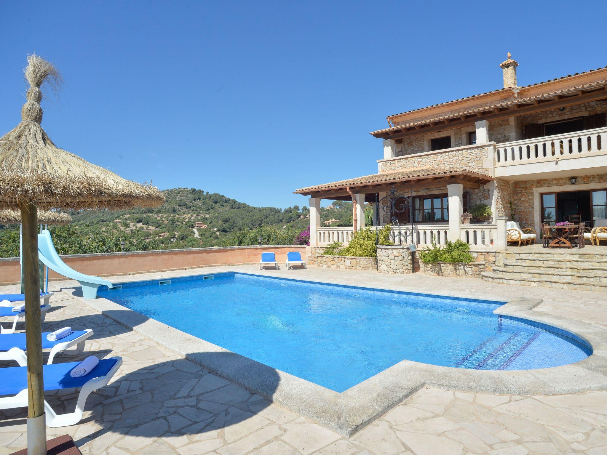 The outside area of Turo Golf is very spacious and enjoys wonderful views. From the large covered terraces that surround the house to the large sun terrace paved with natural stone that surrounds the large pool (10x5m, depth 0.90-1.80m) with Roman steps and a large winding slide. What fun for children!!! In a separate "casita" there is a rustic outdoor kitchen with table, a large brick barbecue, an open fireplace and gas cooker. A fridge has also been thought of so that you have everything together or a cool drink quickly to hand if you feel thirsty by the pool. There is also a guest toilet and shower here to avoid long journeys into the house. There is a small lawn area at the rear of the house, facing the golf course