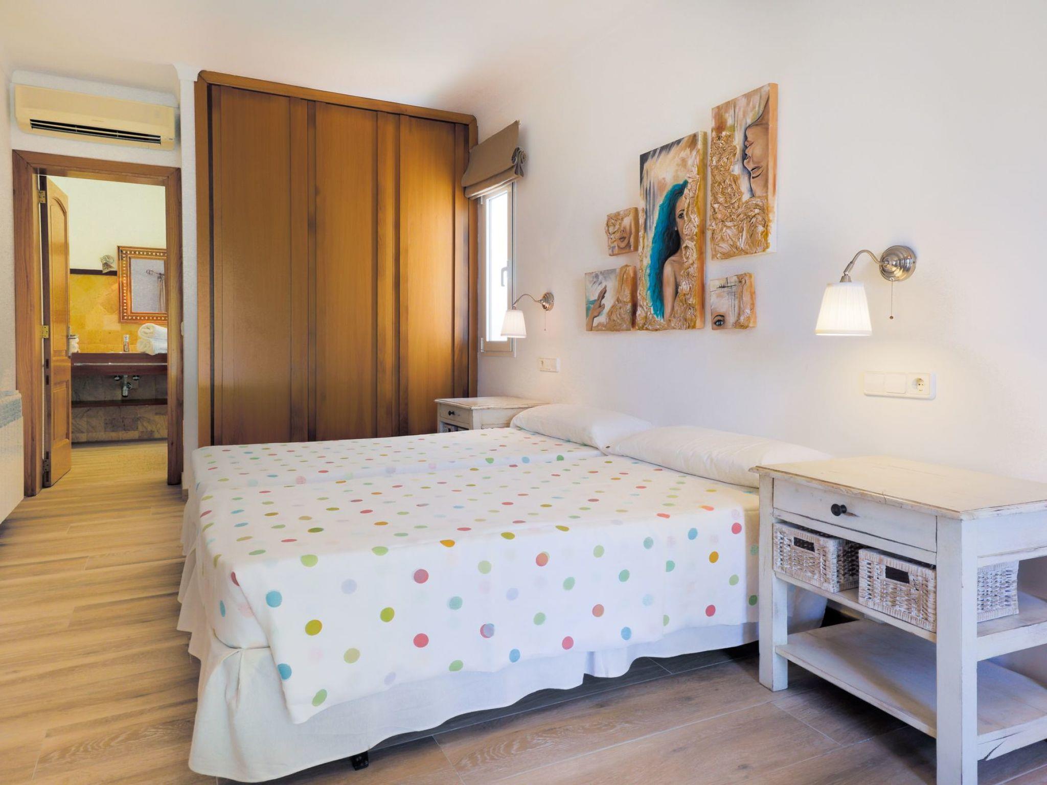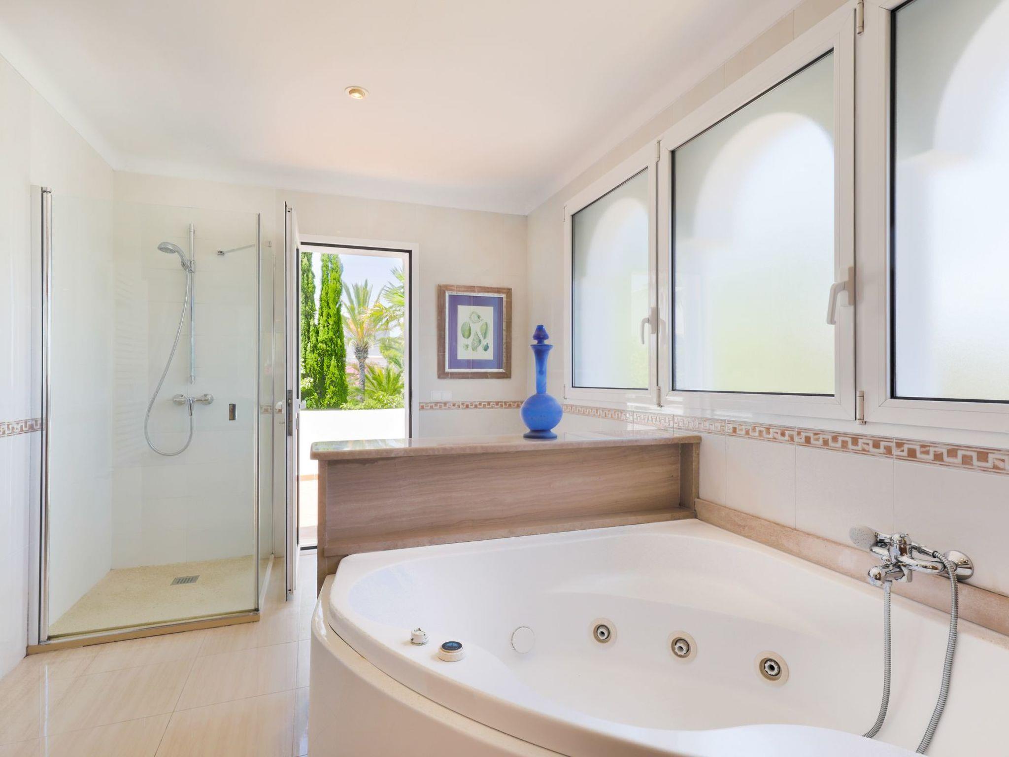 Villa Marques de Comillas 12 is a beautiful, detached villa over 2 floors. Large windows give the rooms plenty of natural light and an airy ambience. The ground floor has high-quality wooden laminate flooring and all rooms have both air conditioning and central heating. The ground floor has a spacious lounge with comfortable seating, TV, DVD and music system. Large sliding glass doors lead out onto the covered terrace, which is furnished with beautiful wooden outdoor furniture. The spacious dining room is very tastefully furnished, with a staircase connecting the ground floor with the upper floor. The modern kitchen with a large cooking island is equipped to a high standard and also offers ample seating. There is also a utility room with washing machine, tumble dryer, iron and ironing board as well as a guest toilet. A bedroom with two single beds as well as a full bathroom (shower and bath) en suite and access to the outside area complete the ground floor. Upstairs is the spacious master bedroom with two single beds joined together as a double bed, a dressing room and a fantastic en suite bathroom with a large Jacuzzi bath and a separate shower. The room has access to an outside terrace overlooking the garden and pool area. Furthermore, this floor offers another double bedroom with 2 single beds and one with a double bed. Both bedrooms have en suite bathrooms with a Jacuzzi bath and a small terrace.