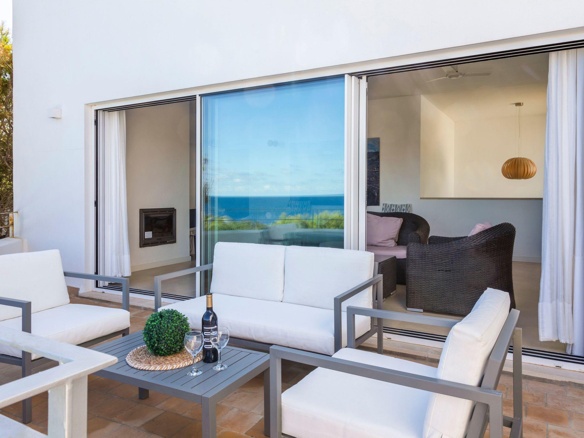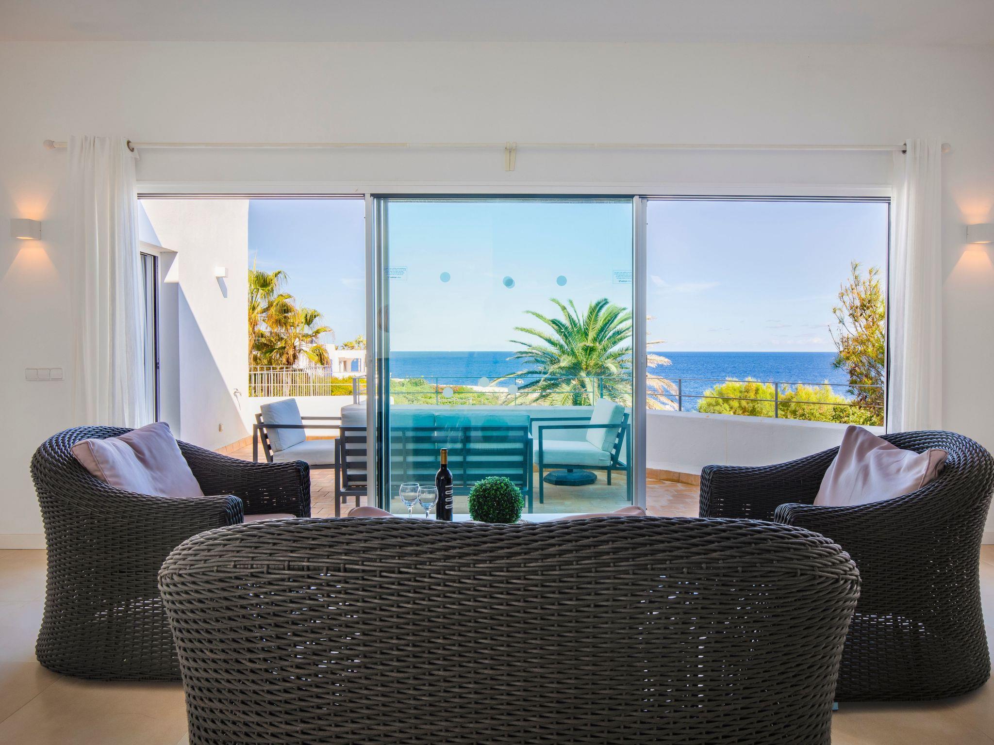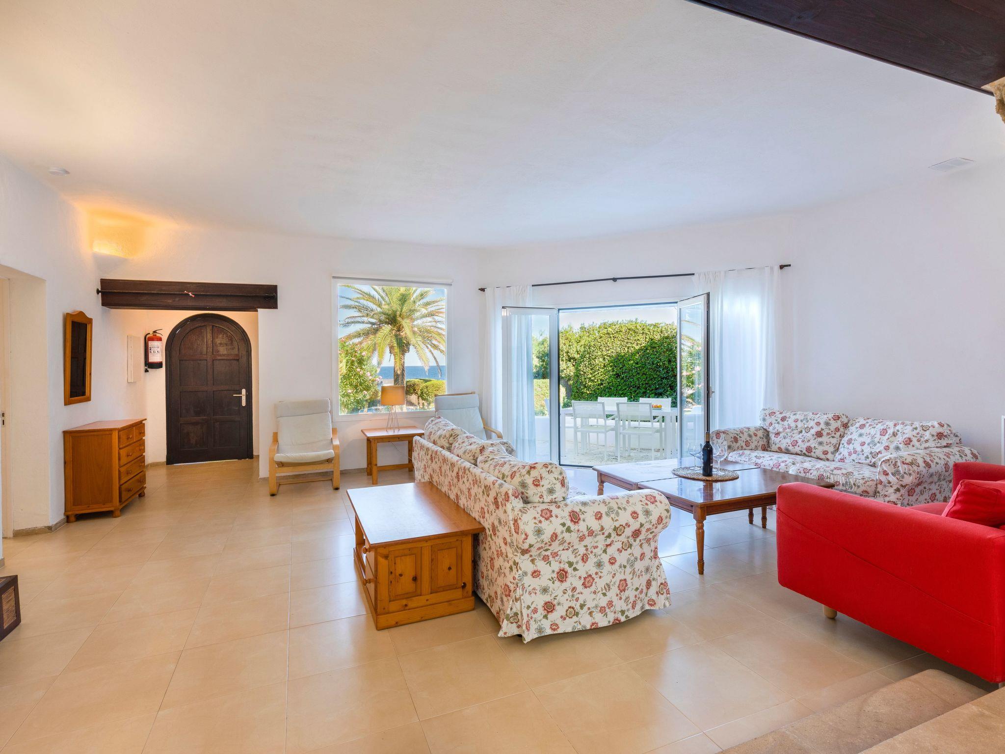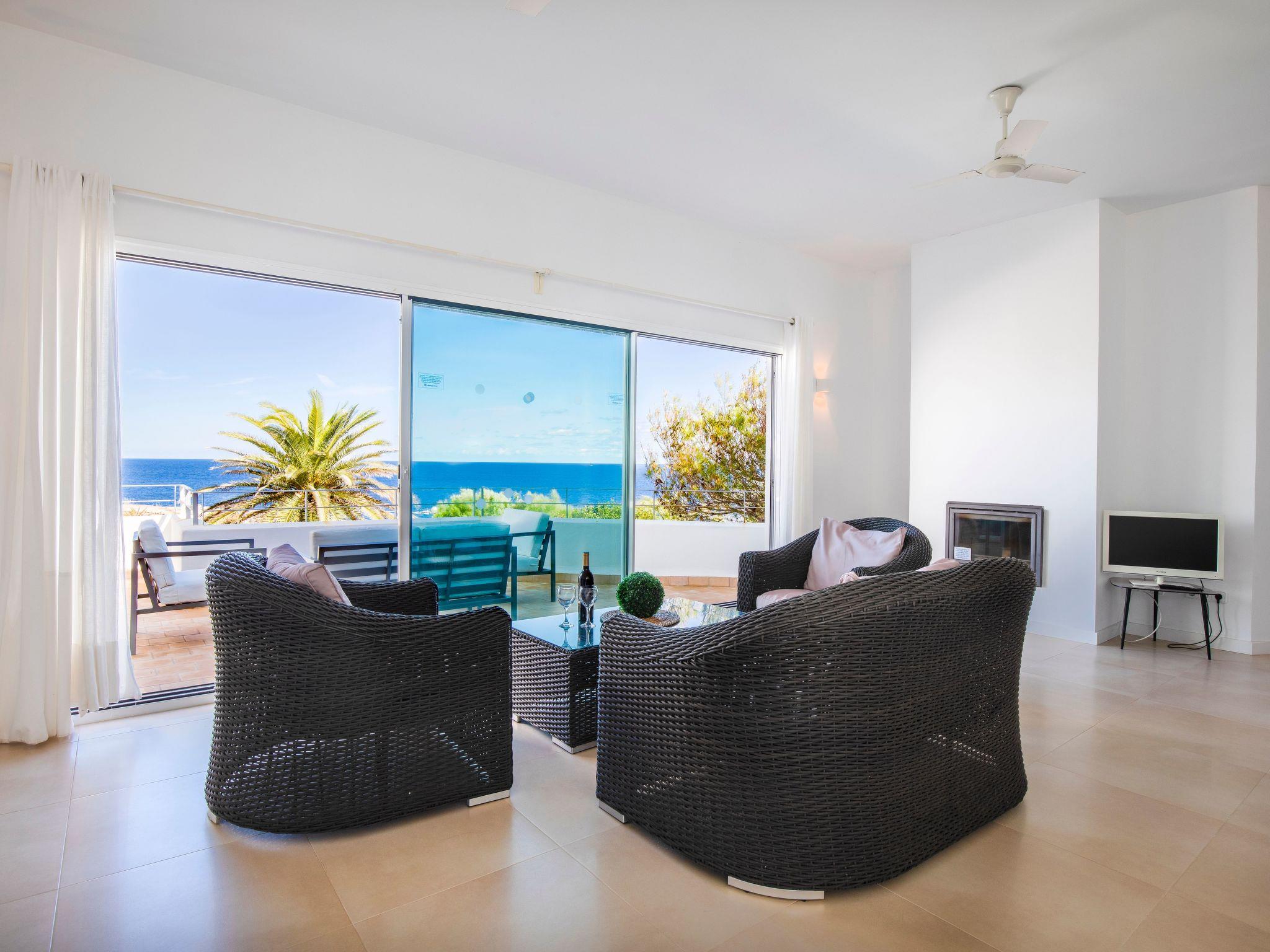 Villa Gran Mar is built in the old Ibizan style. A short path leads to the house through a small garden with a lawn. The entrance area leads into the spacious, bright and cosily furnished living/dining room. Patio doors open out to the pool area and a further private terrace, a perfect place for al fresco dining. You have a well-equipped modern kitchen. From the living room you enter a beautiful double bedroom with an en-suite shower room and access to the terrace and pool area. A further bedroom is located on the opposite side of the living room. Steps lead from the dining area to the first floor. There is a seating area here. Large French windows allow you to enjoy the fantastic sea view and access to the terrace, which is also equipped with a seating area. From this living room there is access to the 3rd bedroom with en-suite shower room, which also has access to the terrace.