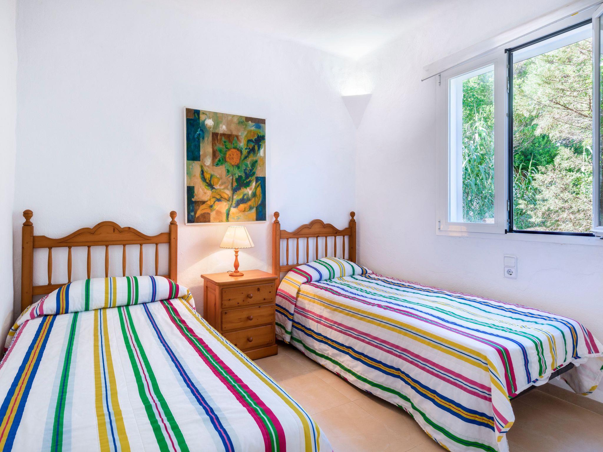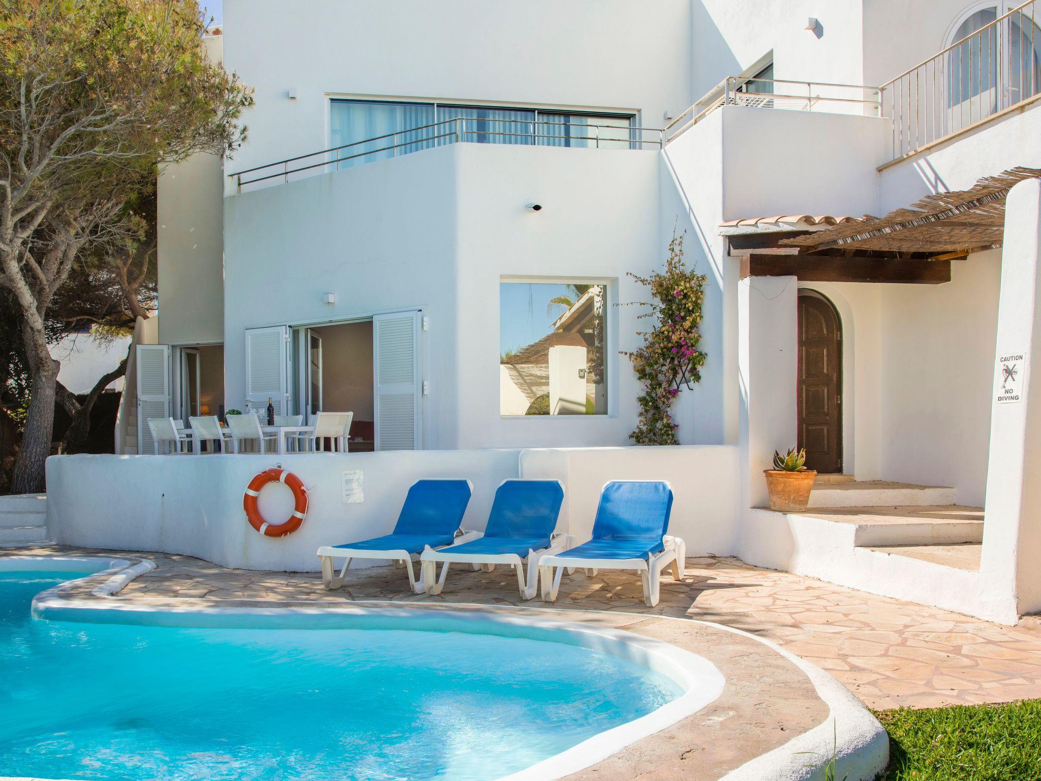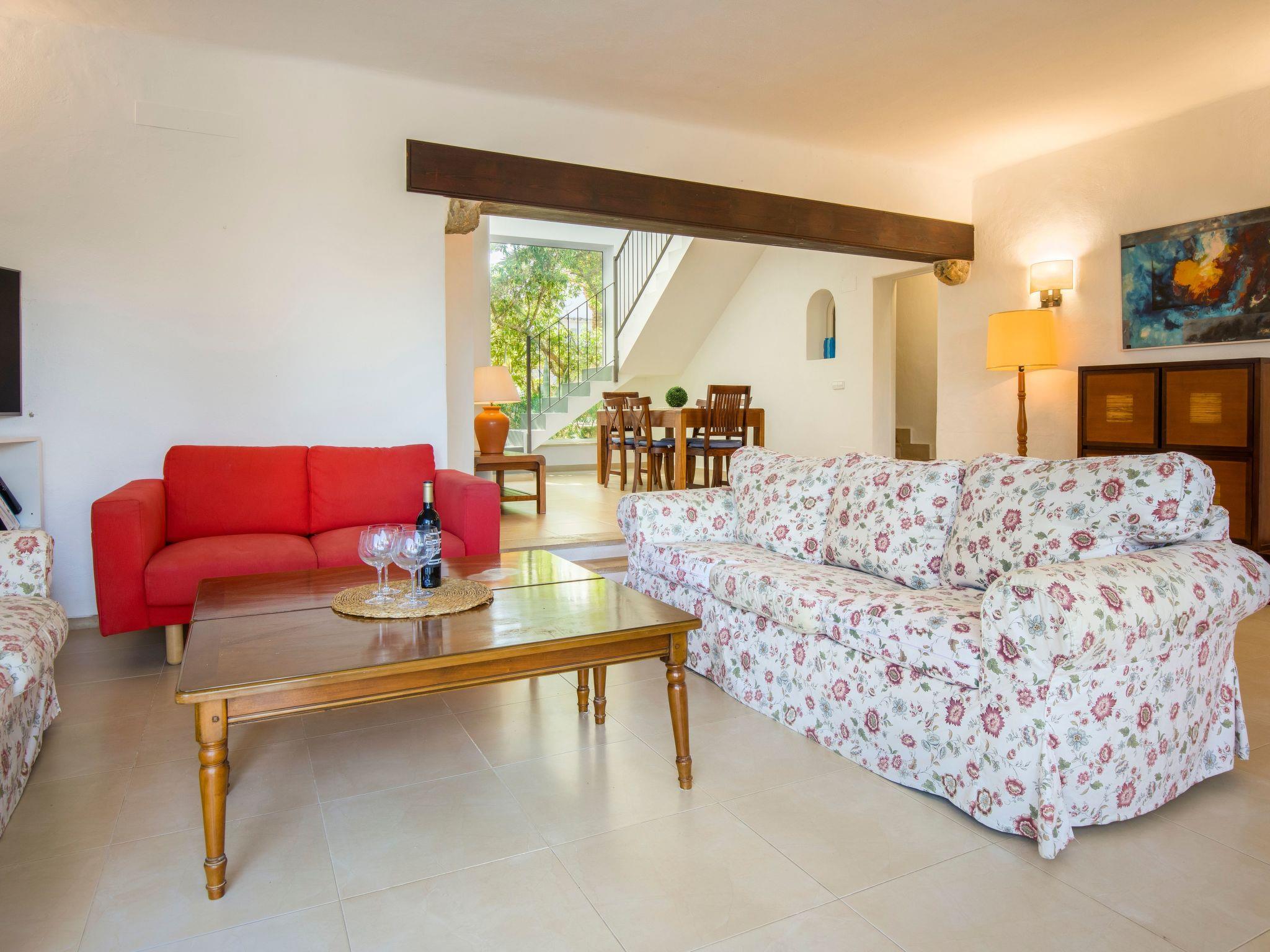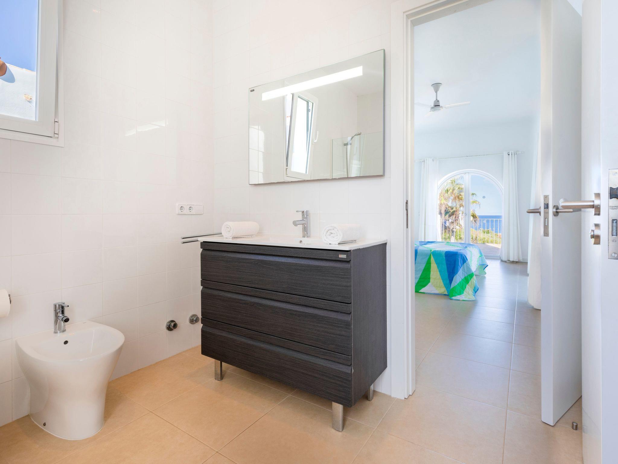 Villa Gran Mar is built in the old Ibizan style. A short path leads to the house through a small garden with a lawn. The entrance area leads into the spacious, bright and cosily furnished living/dining room. Patio doors open out to the pool area and a further private terrace, a perfect place for al fresco dining. You have a well-equipped modern kitchen. From the living room you enter a beautiful double bedroom with an en-suite shower room and access to the terrace and pool area. A further bedroom is located on the opposite side of the living room. Steps lead from the dining area to the first floor. There is a seating area here. Large French windows allow you to enjoy the fantastic sea view and access to the terrace, which is also equipped with a seating area. From this living room there is access to the 3rd bedroom with en-suite shower room, which also has access to the terrace.